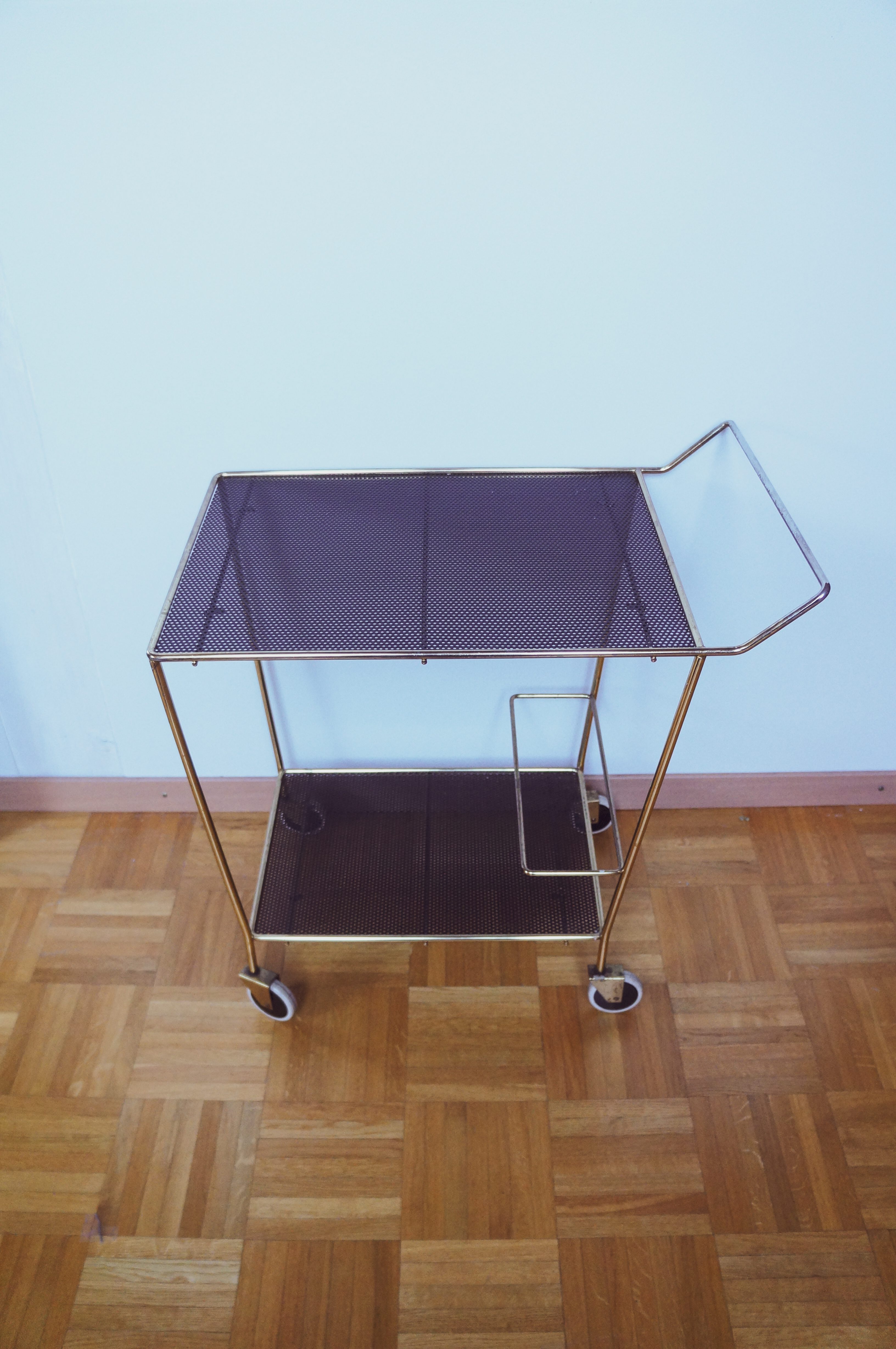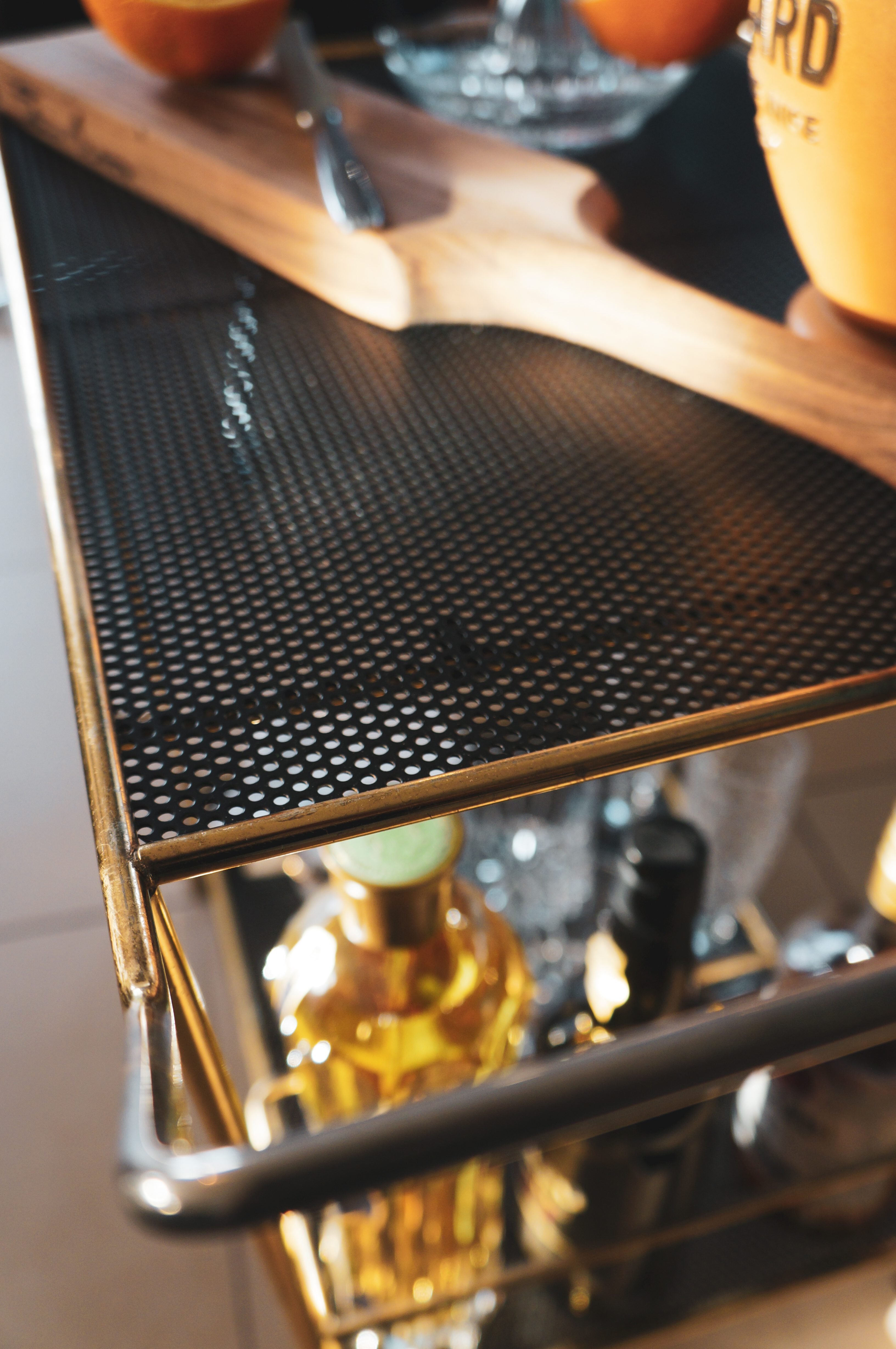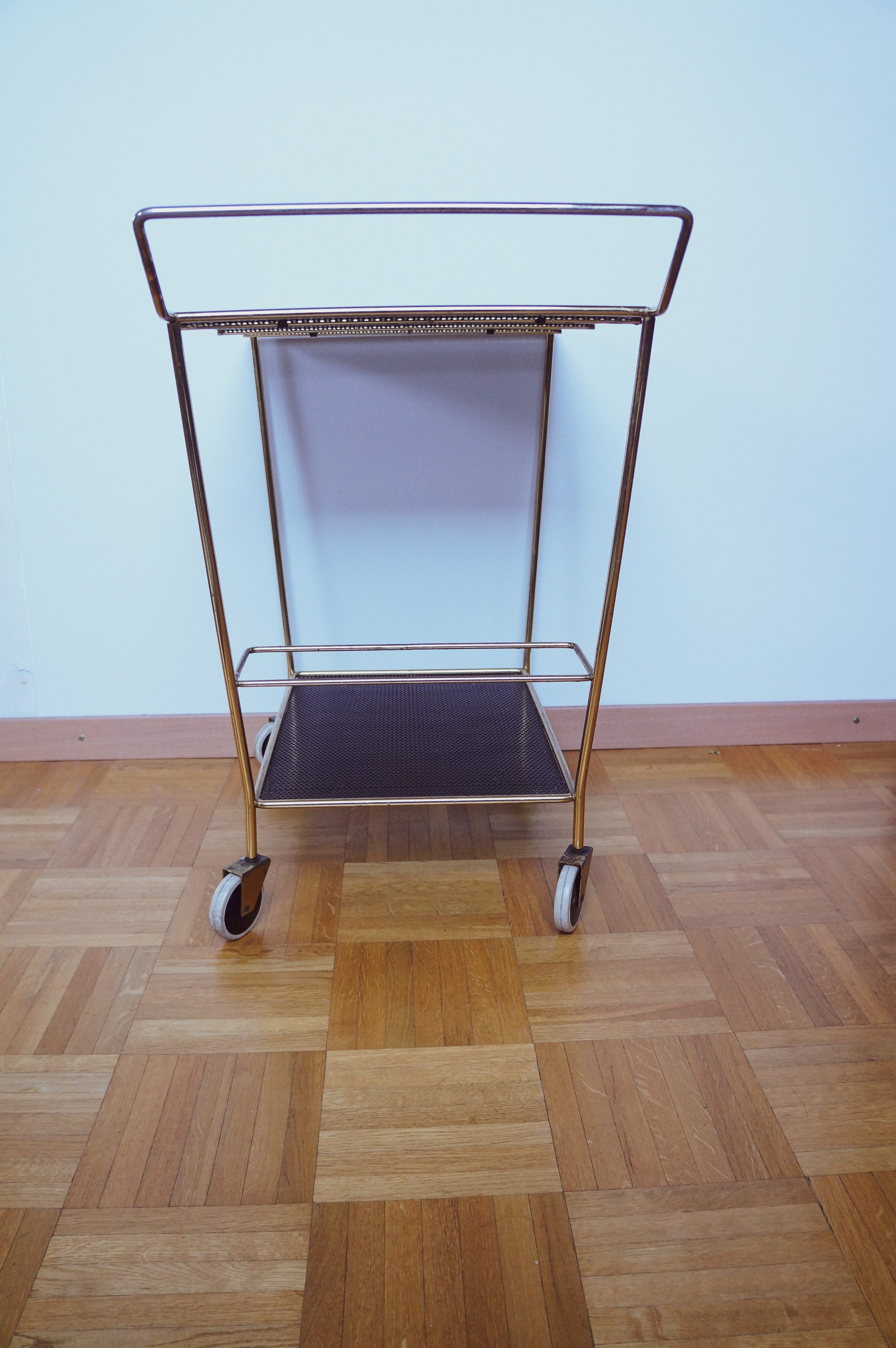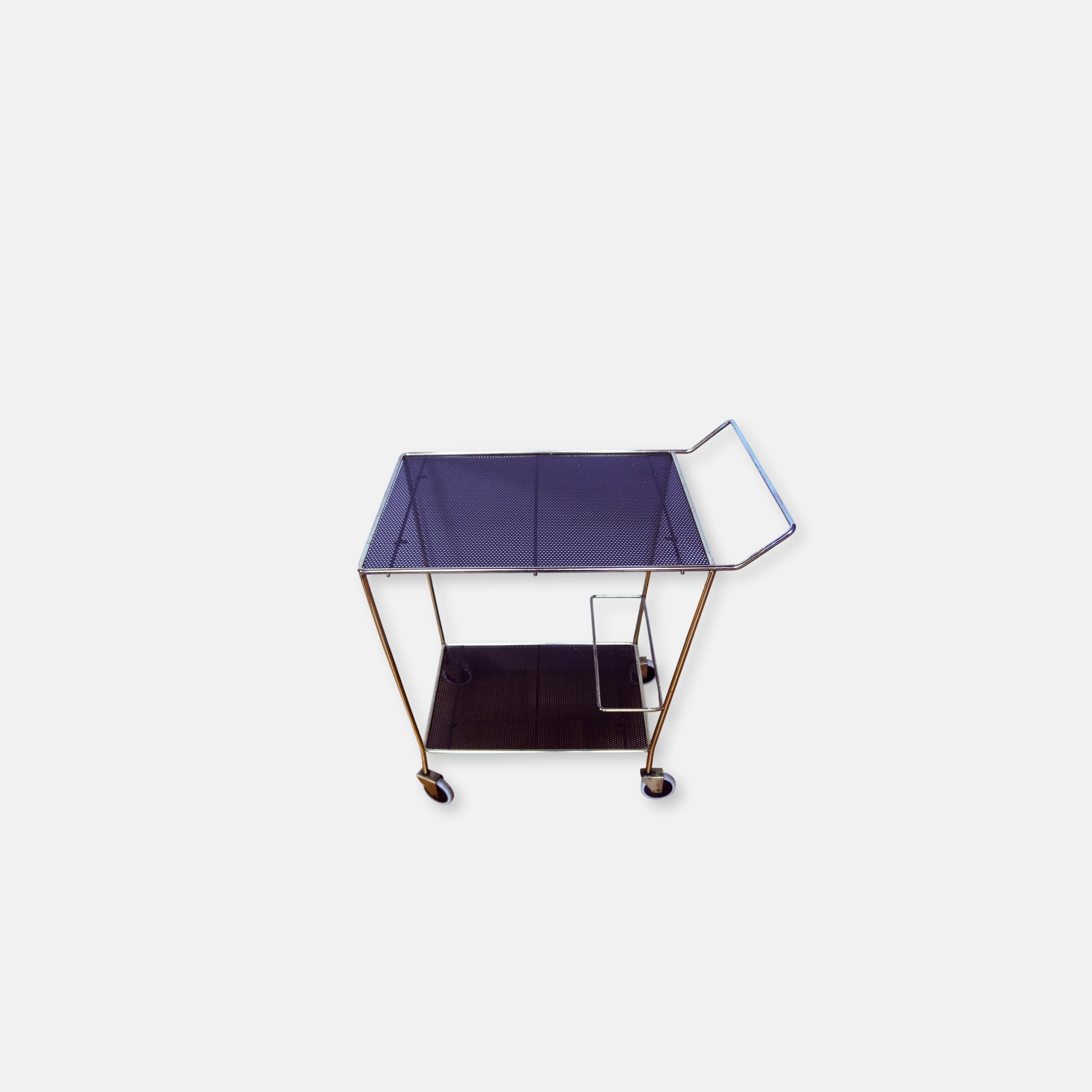 Desserte vintage avec de beaux supports chromés de couleur dorée (certaines zones sont doucement patinées par le temps) et des étagères en métal perforé de couleur noire.
