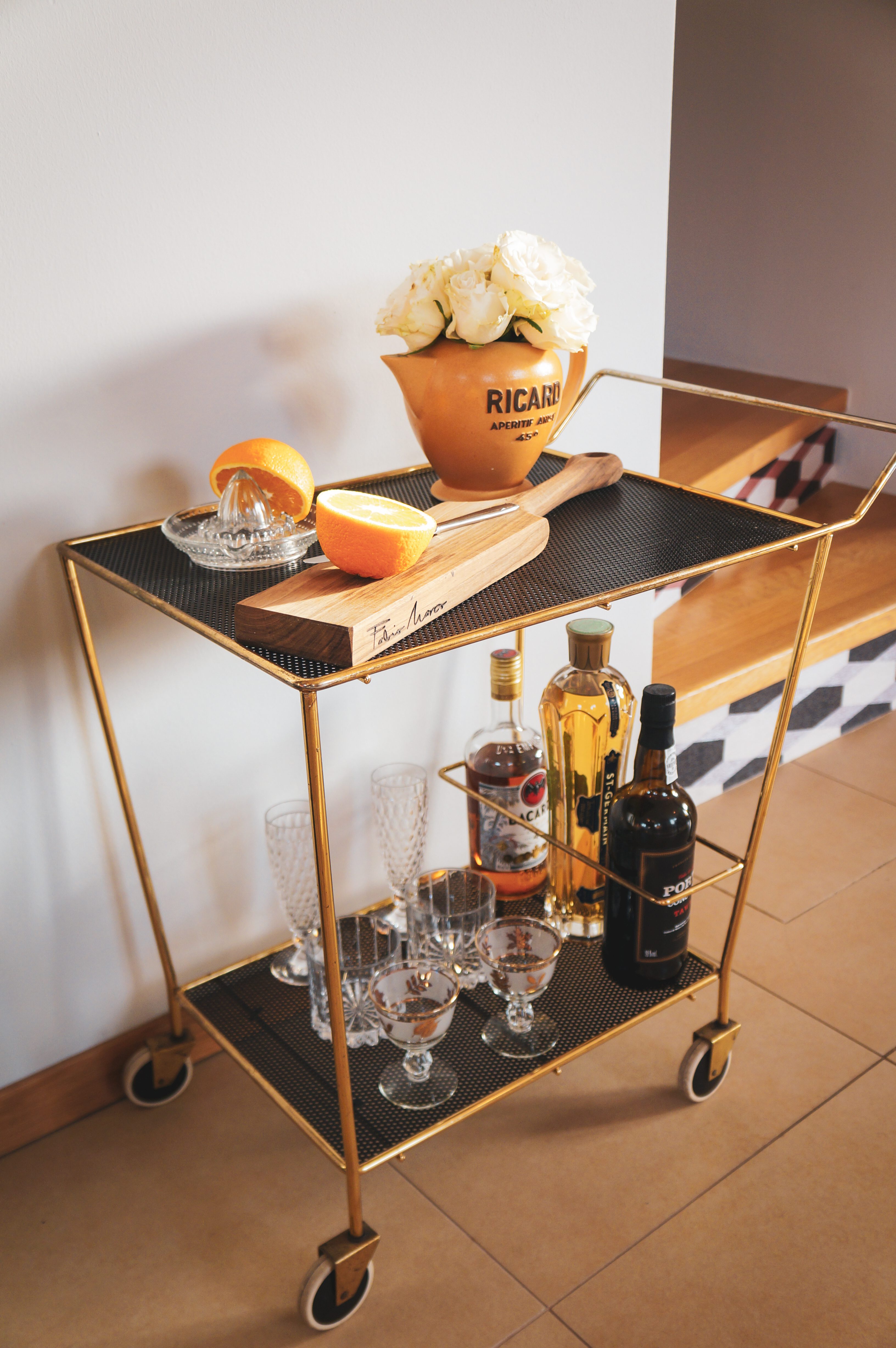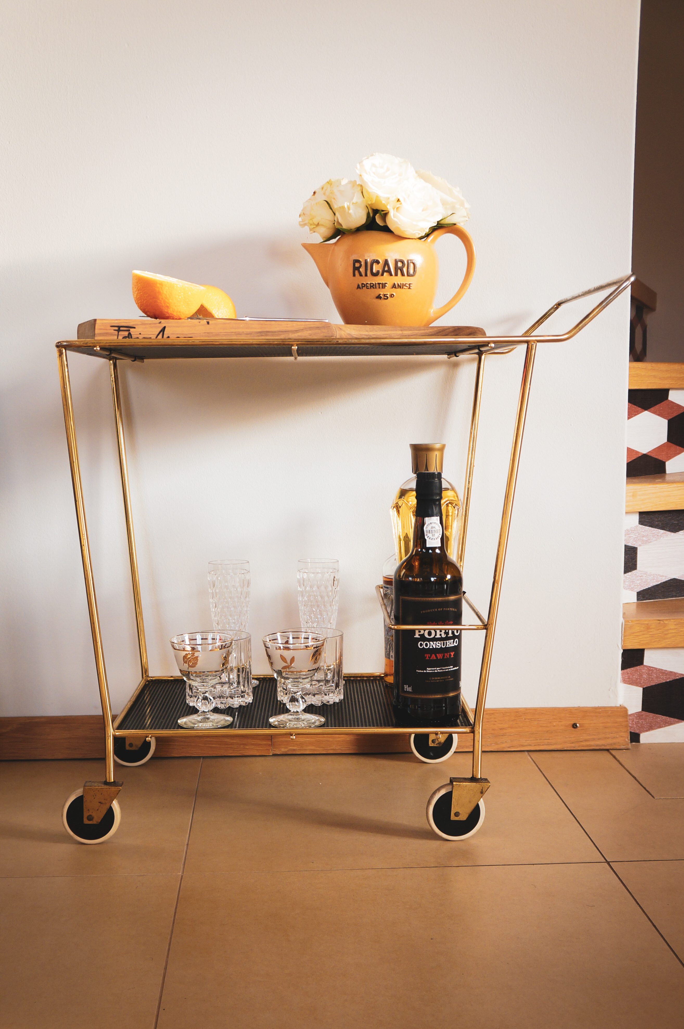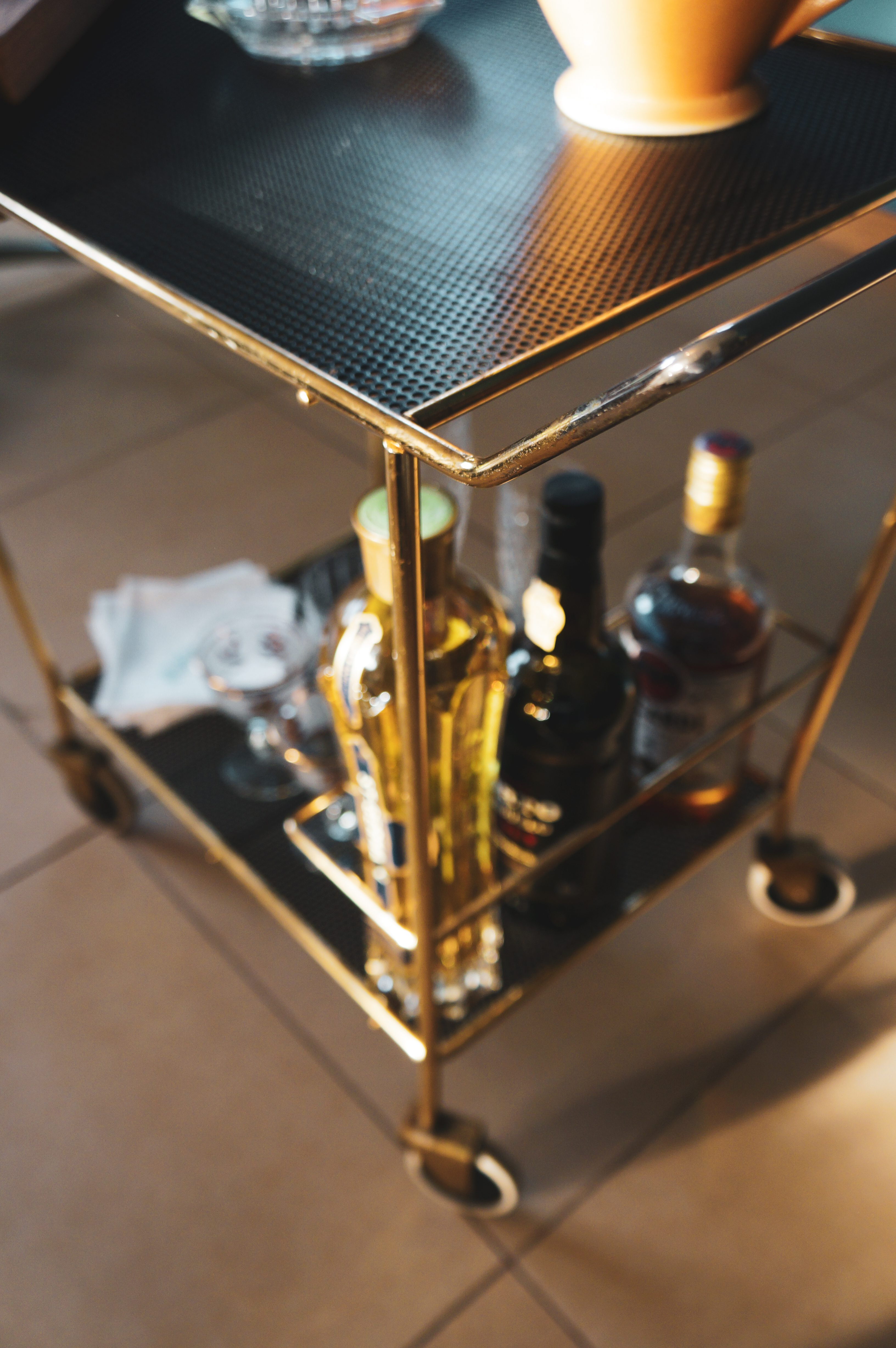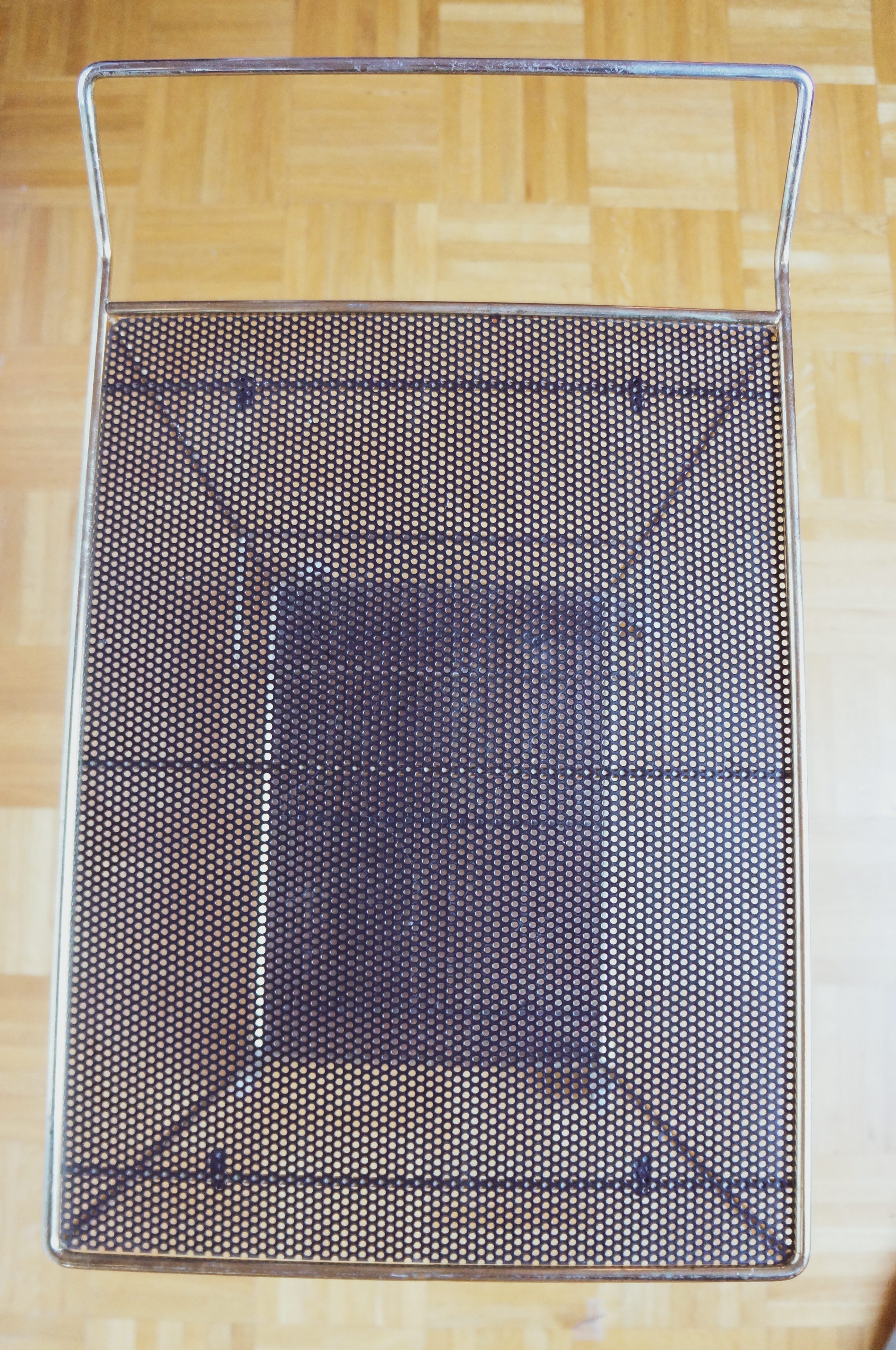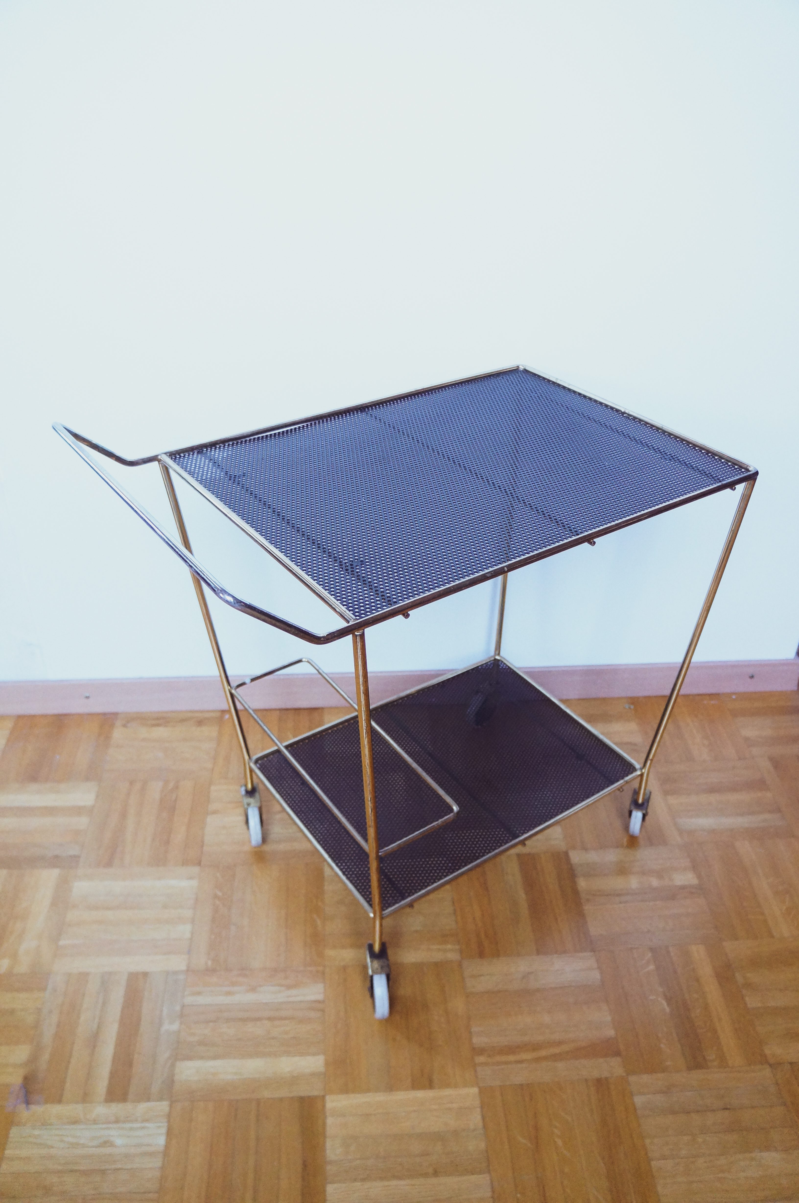 Desserte vintage avec de beaux supports chromés de couleur dorée (certaines zones sont doucement patinées par le temps) et des étagères en métal perforé de couleur noire.