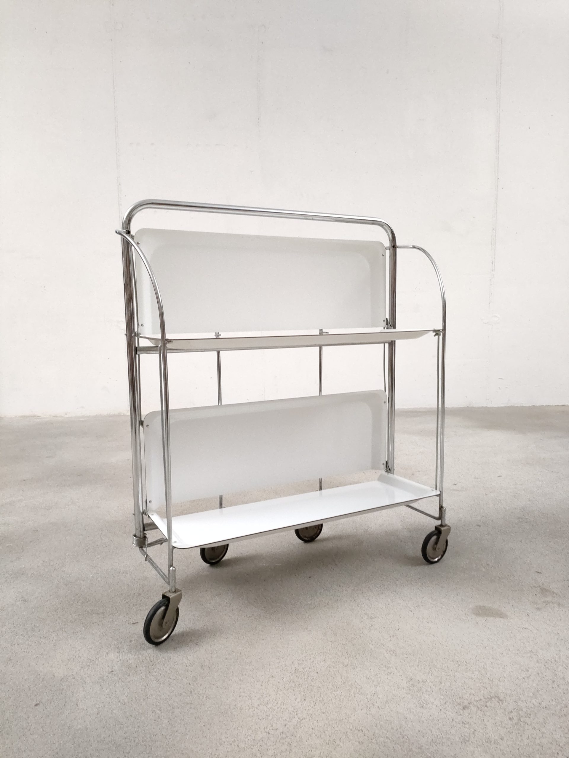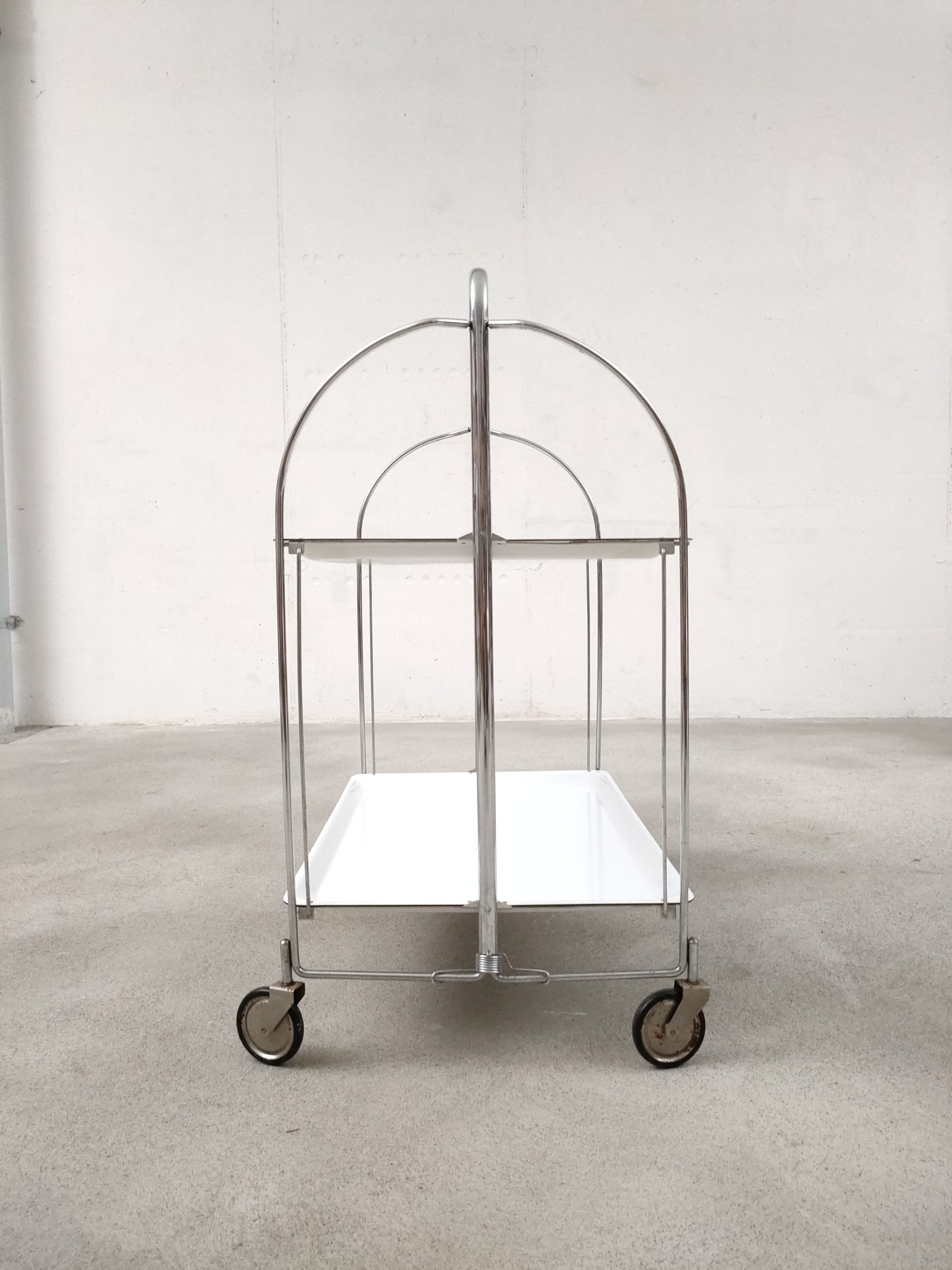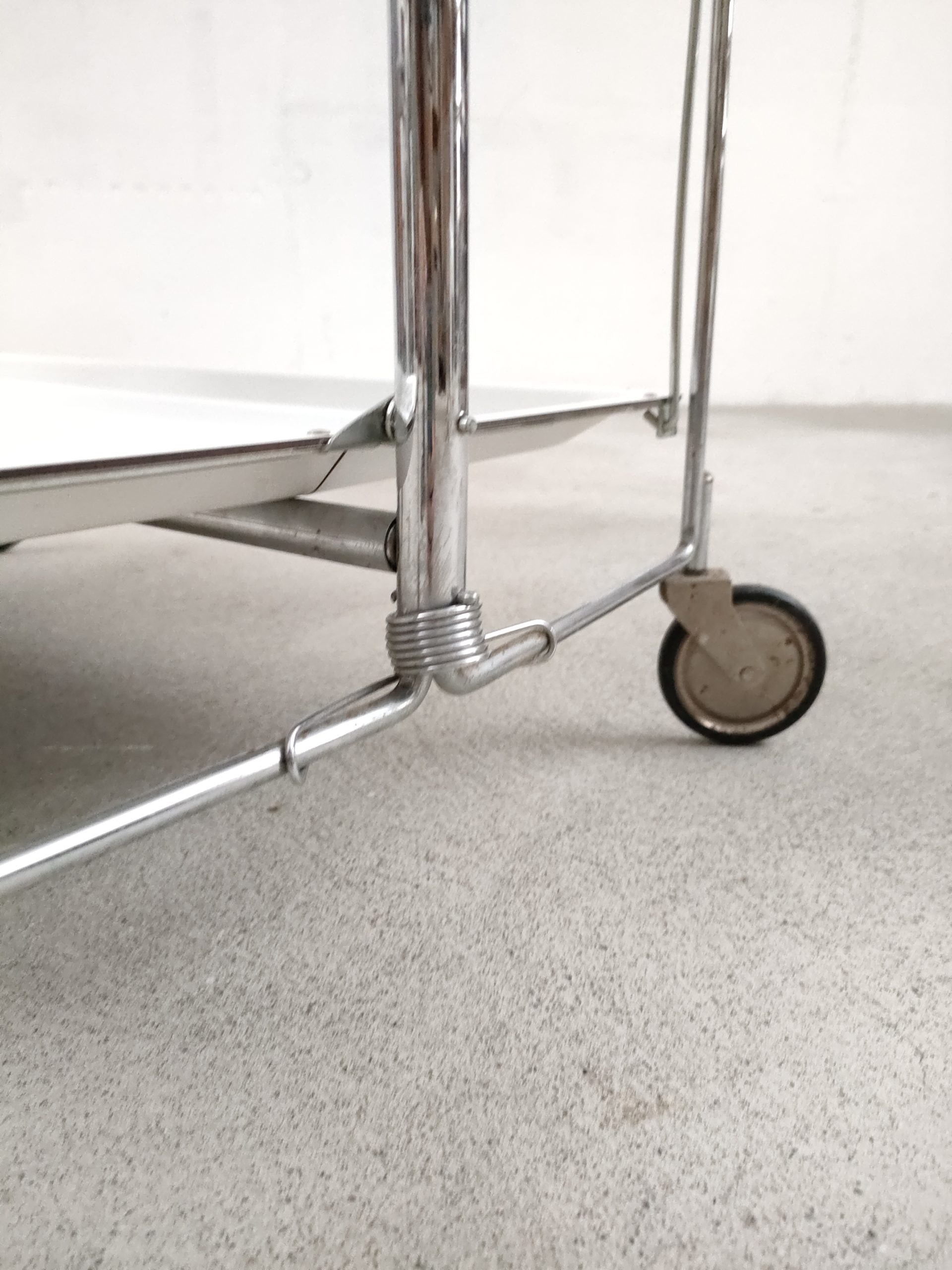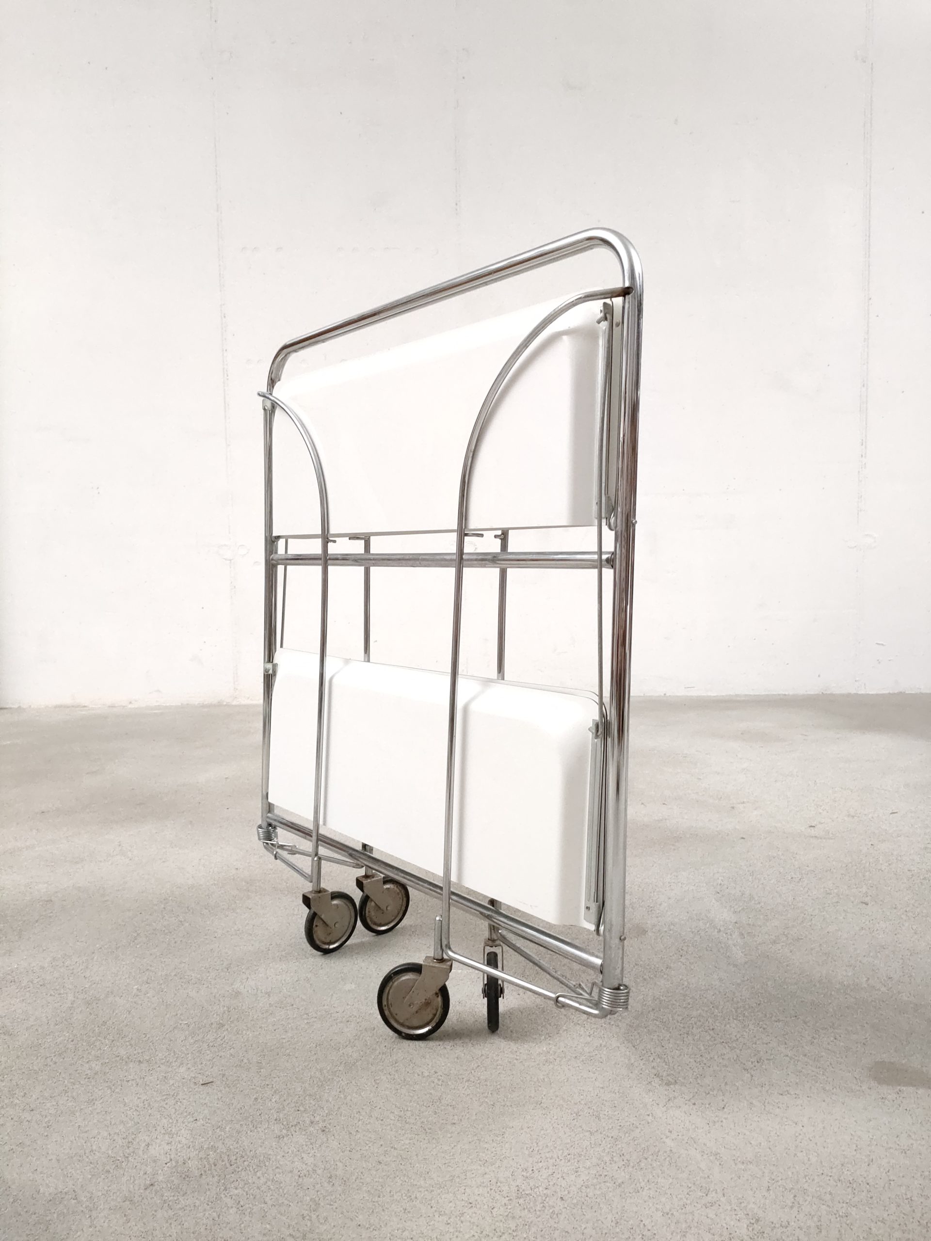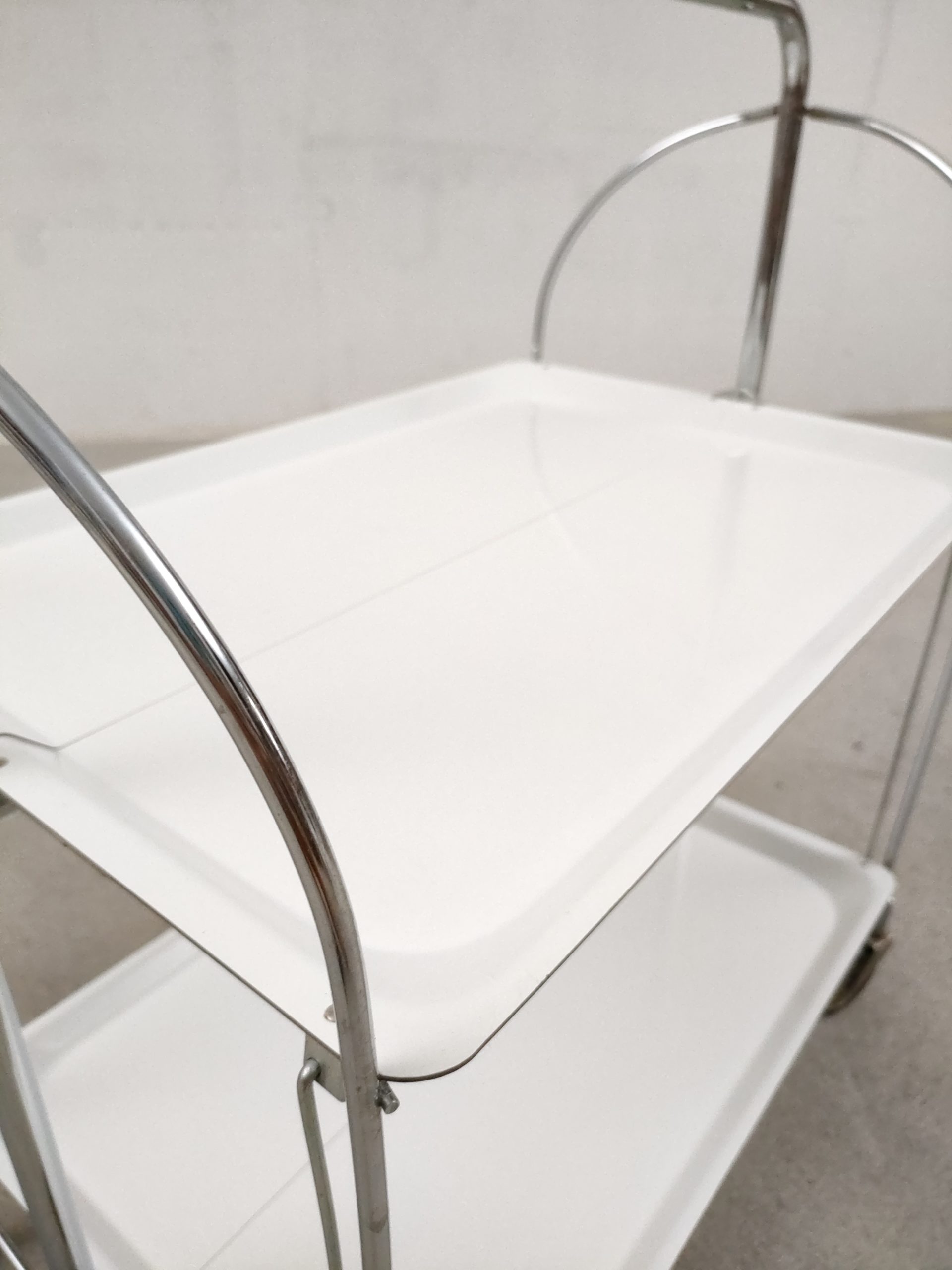 Produit venduDesserte vintage pliante en plastique et métal à roulettes avec plateaux blanc.