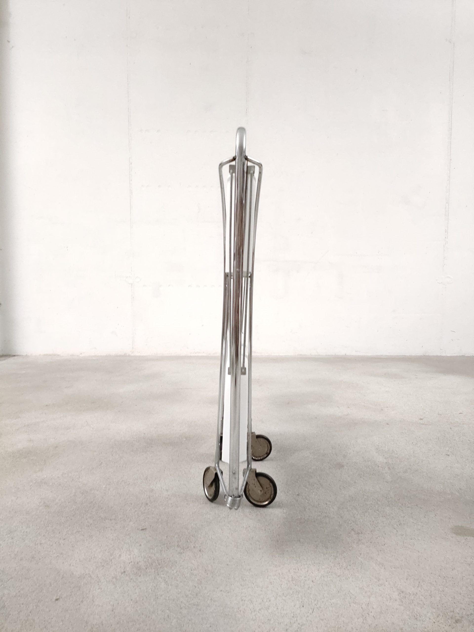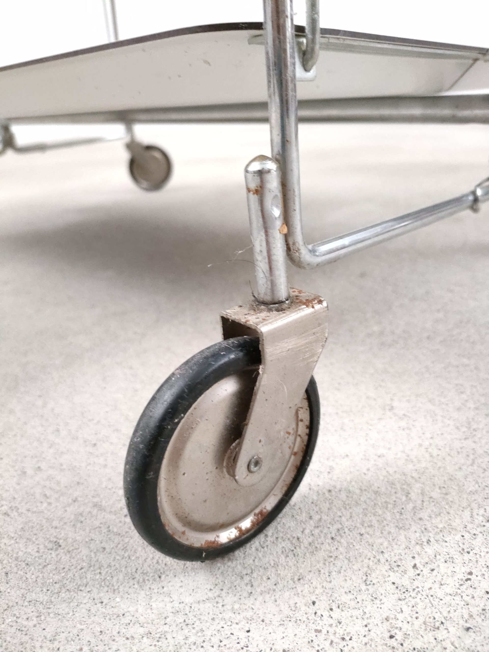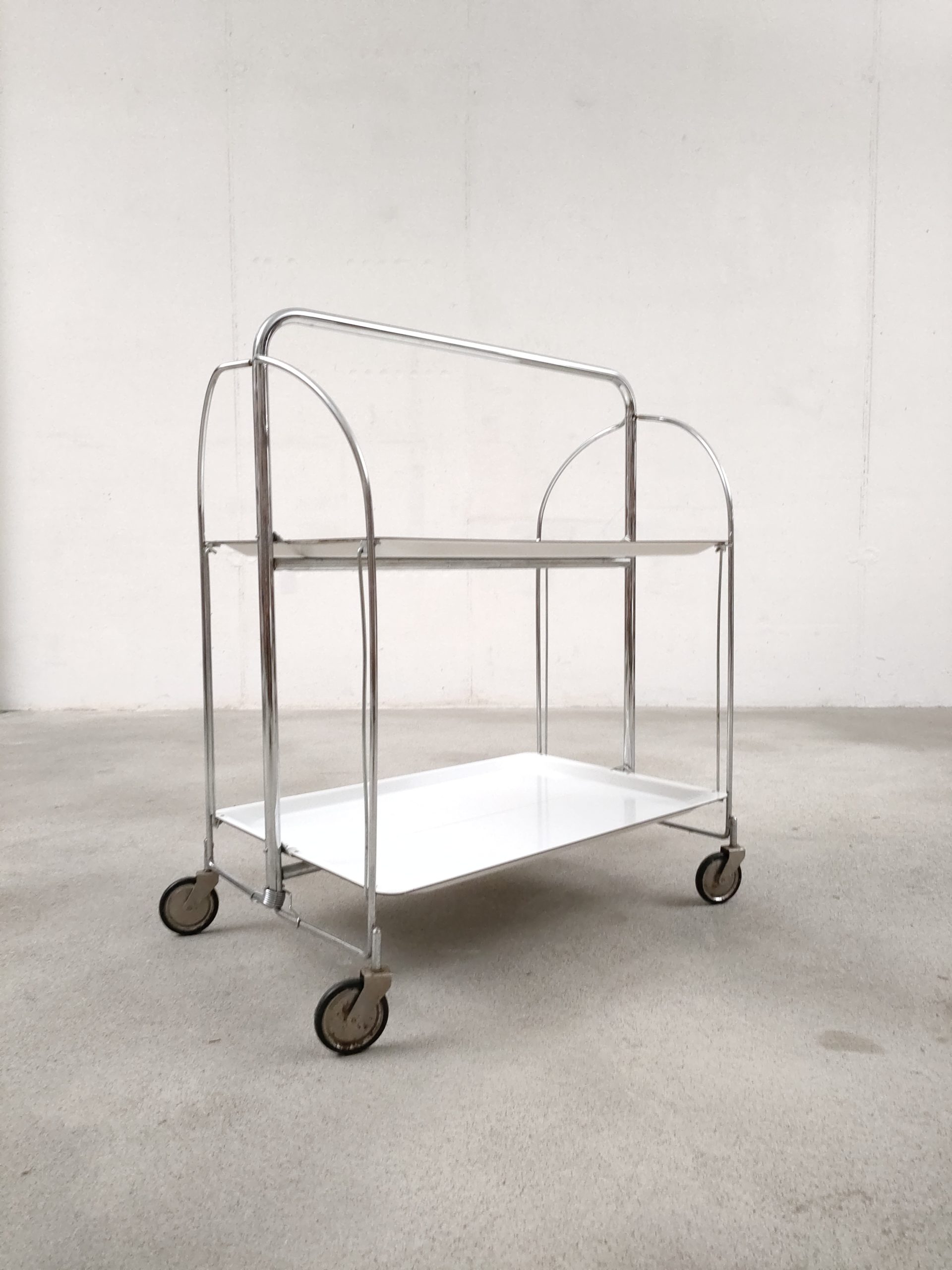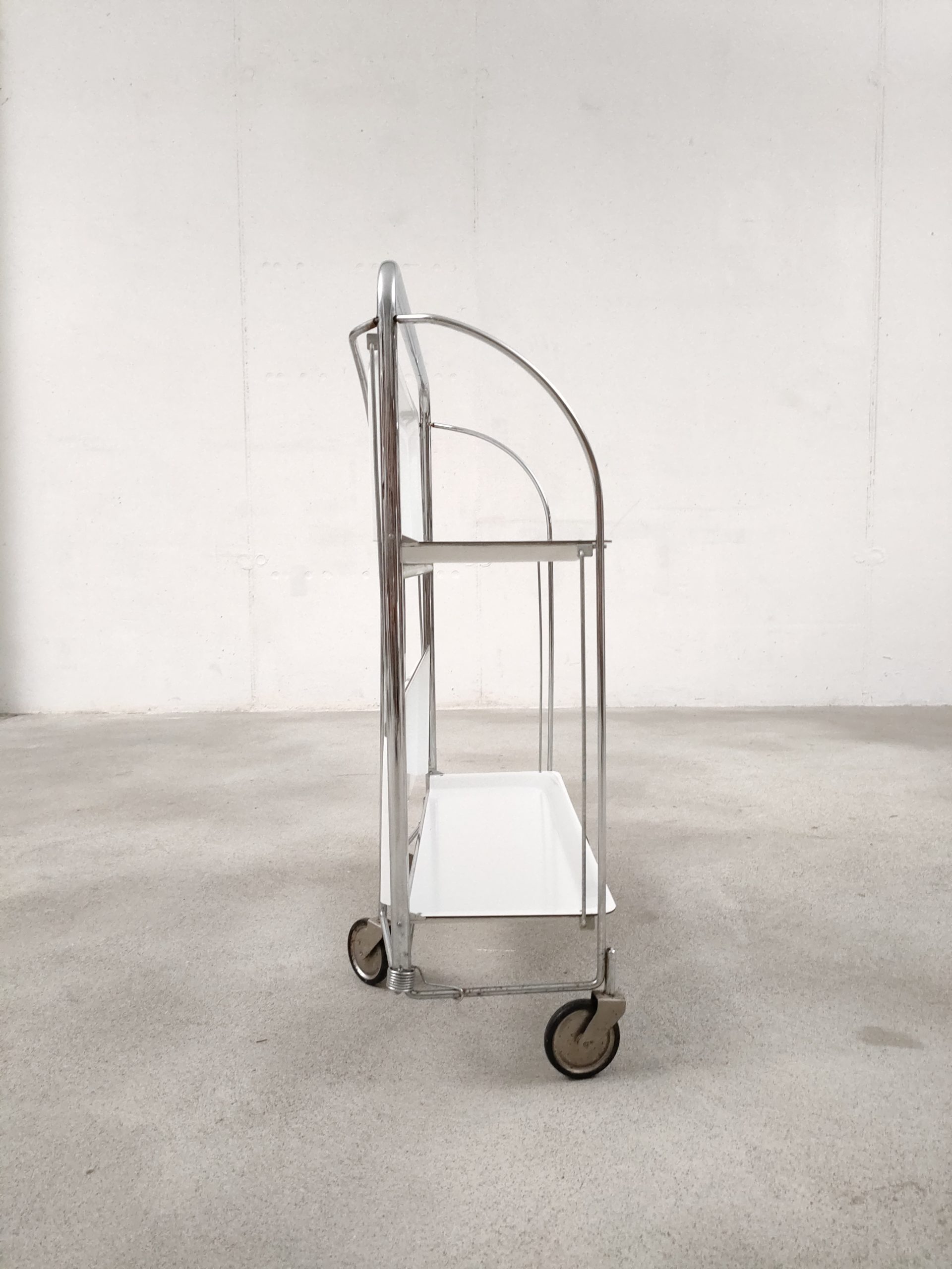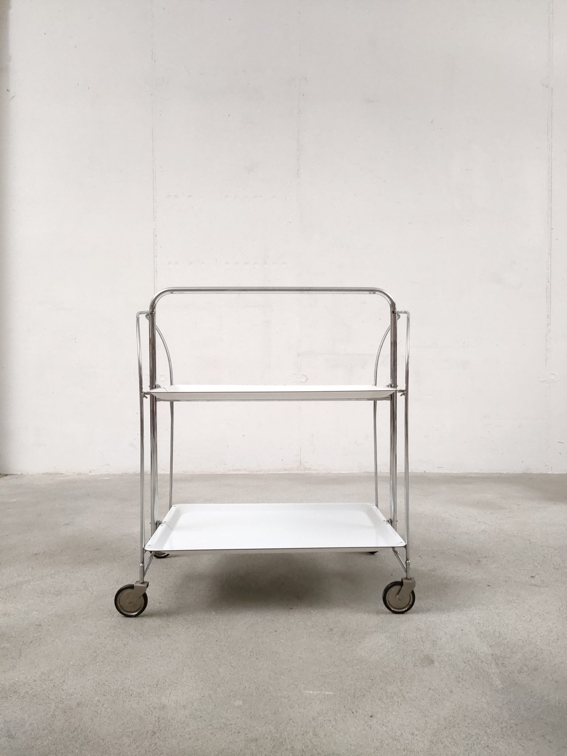 Produit venduDesserte vintage pliante en plastique et métal à roulettes avec plateaux blanc.
