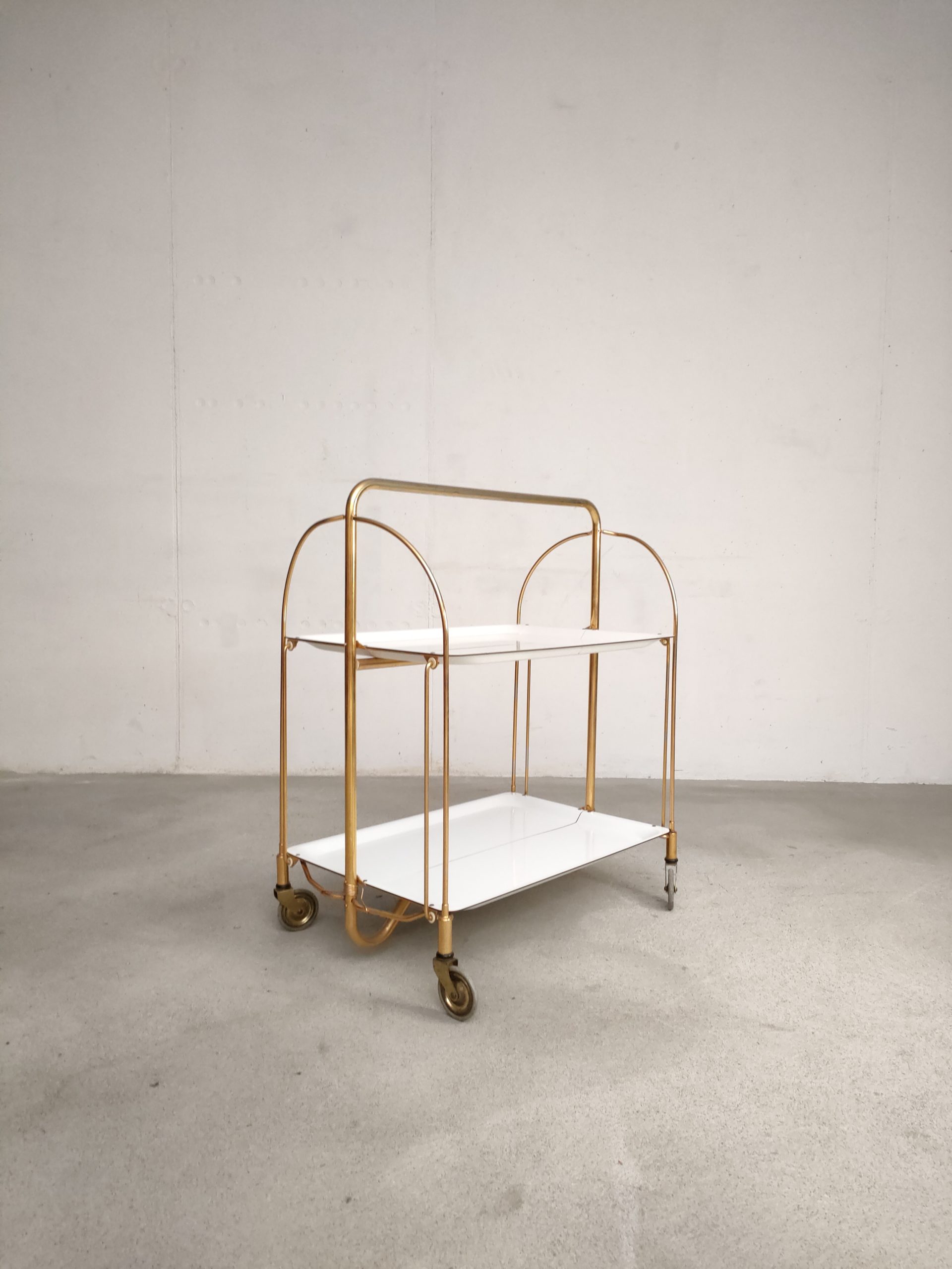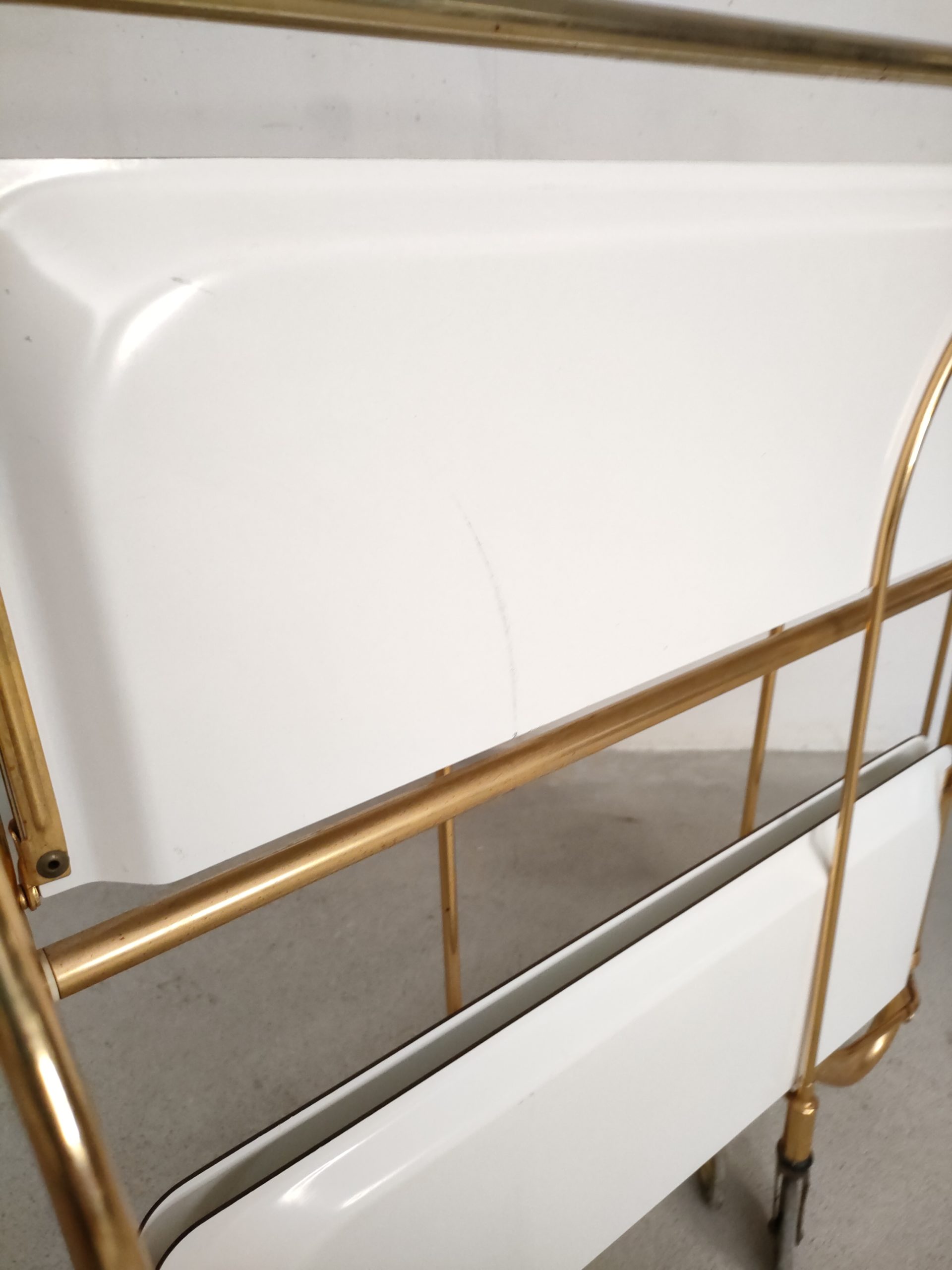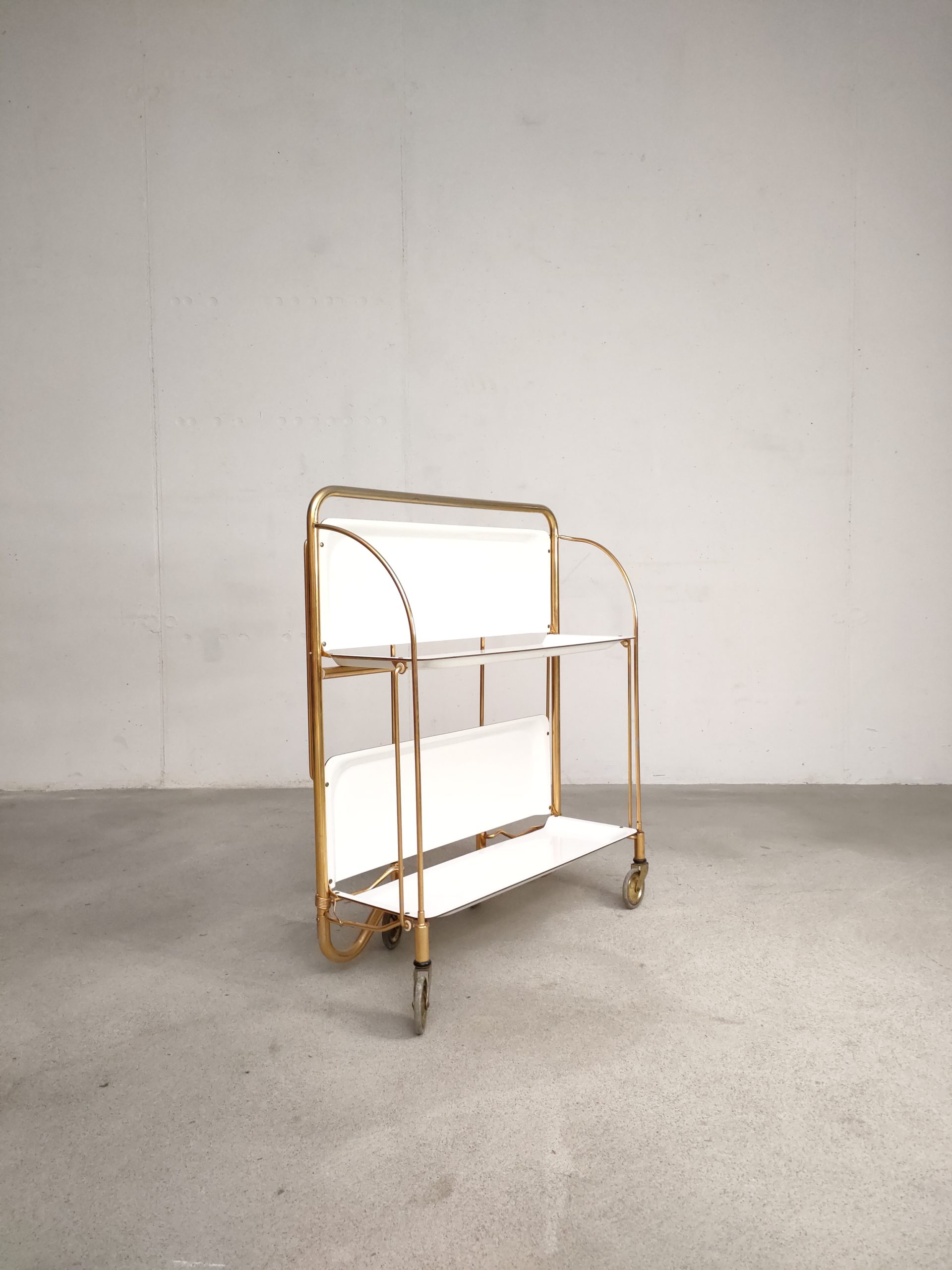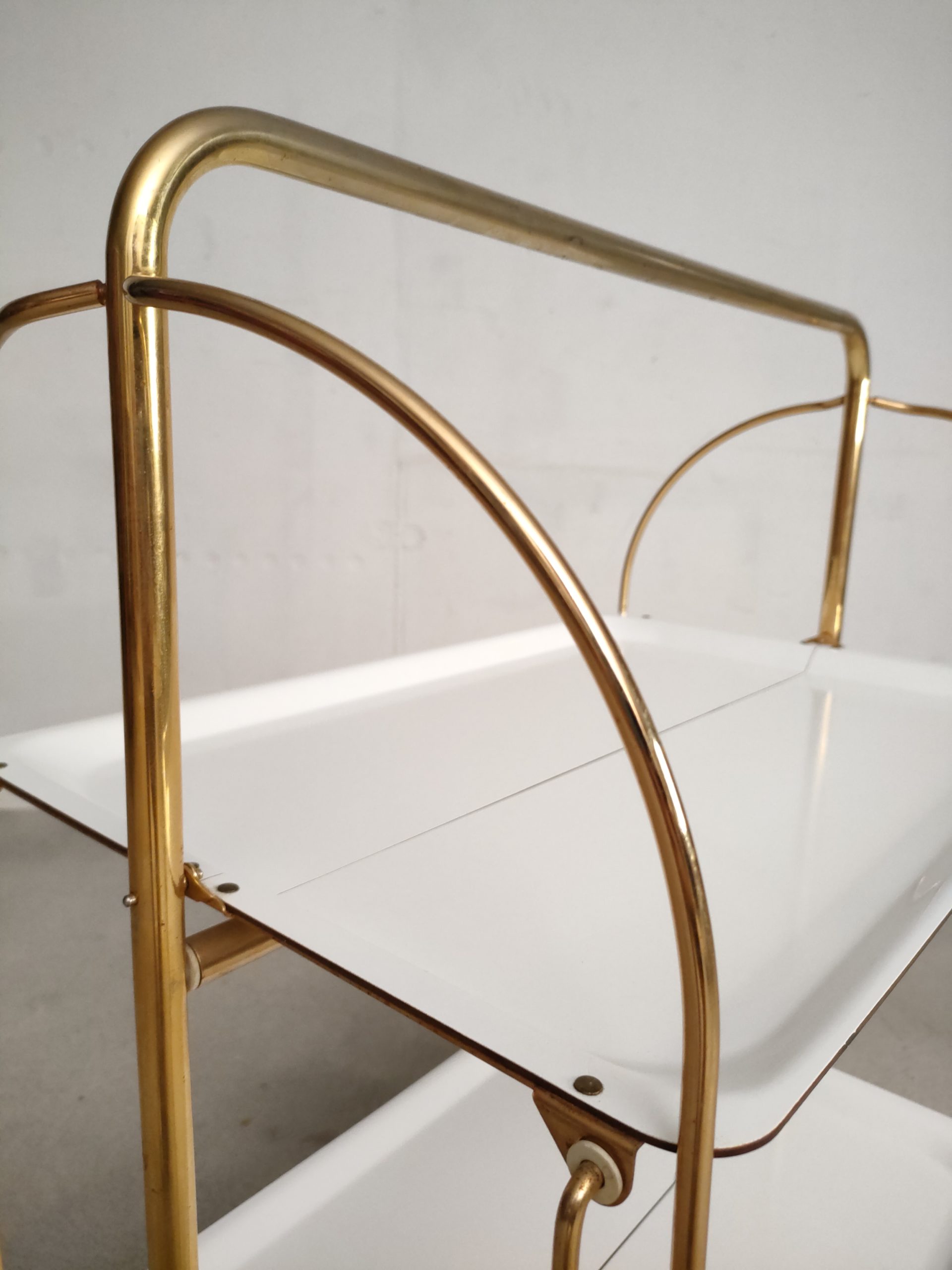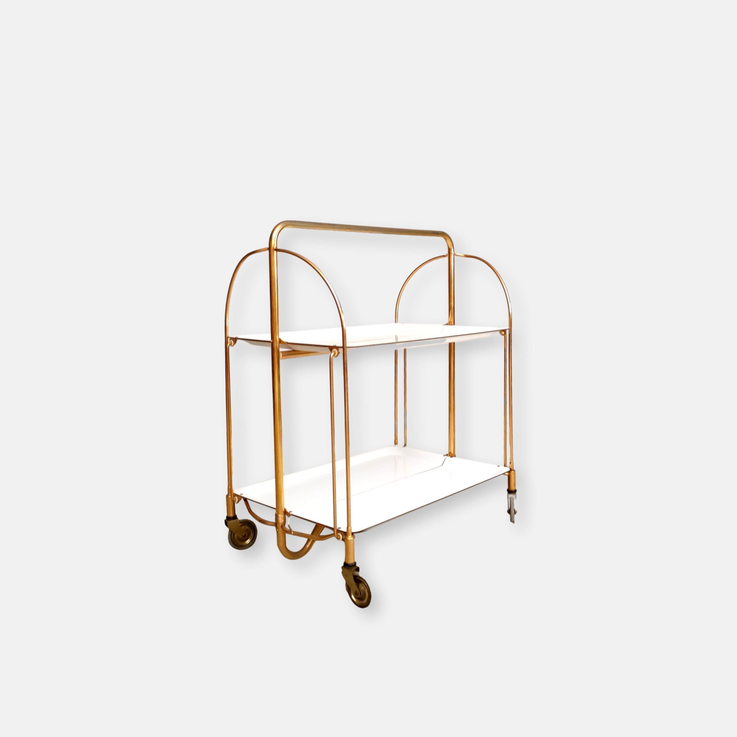 Produit venduDesserte ou service boy vintage sur roulettes avec structure en métal laitonné et deux plateaux en formica blanc qui peuvent être pliés. Quelques traces sur le métal et sur la partie inférieure (pas visible) du plateau supérieur (voir photos).