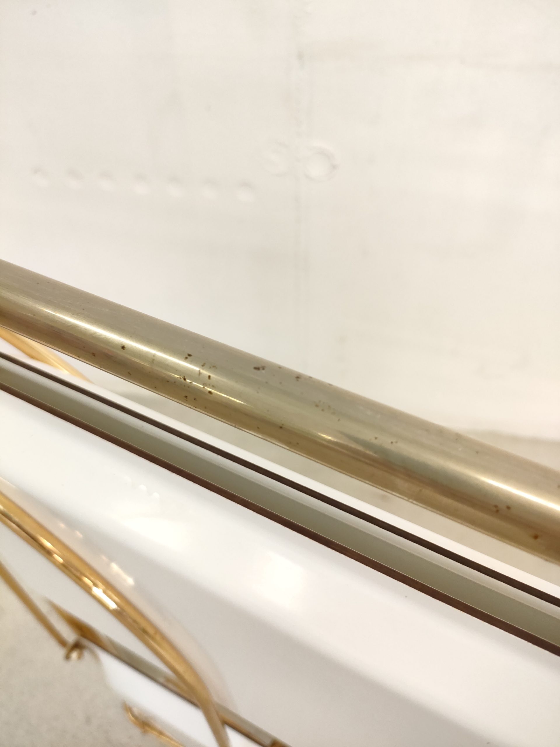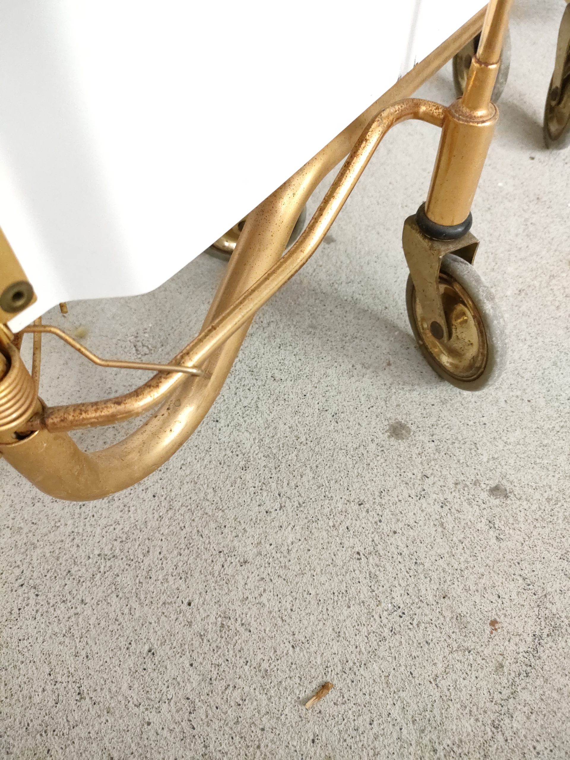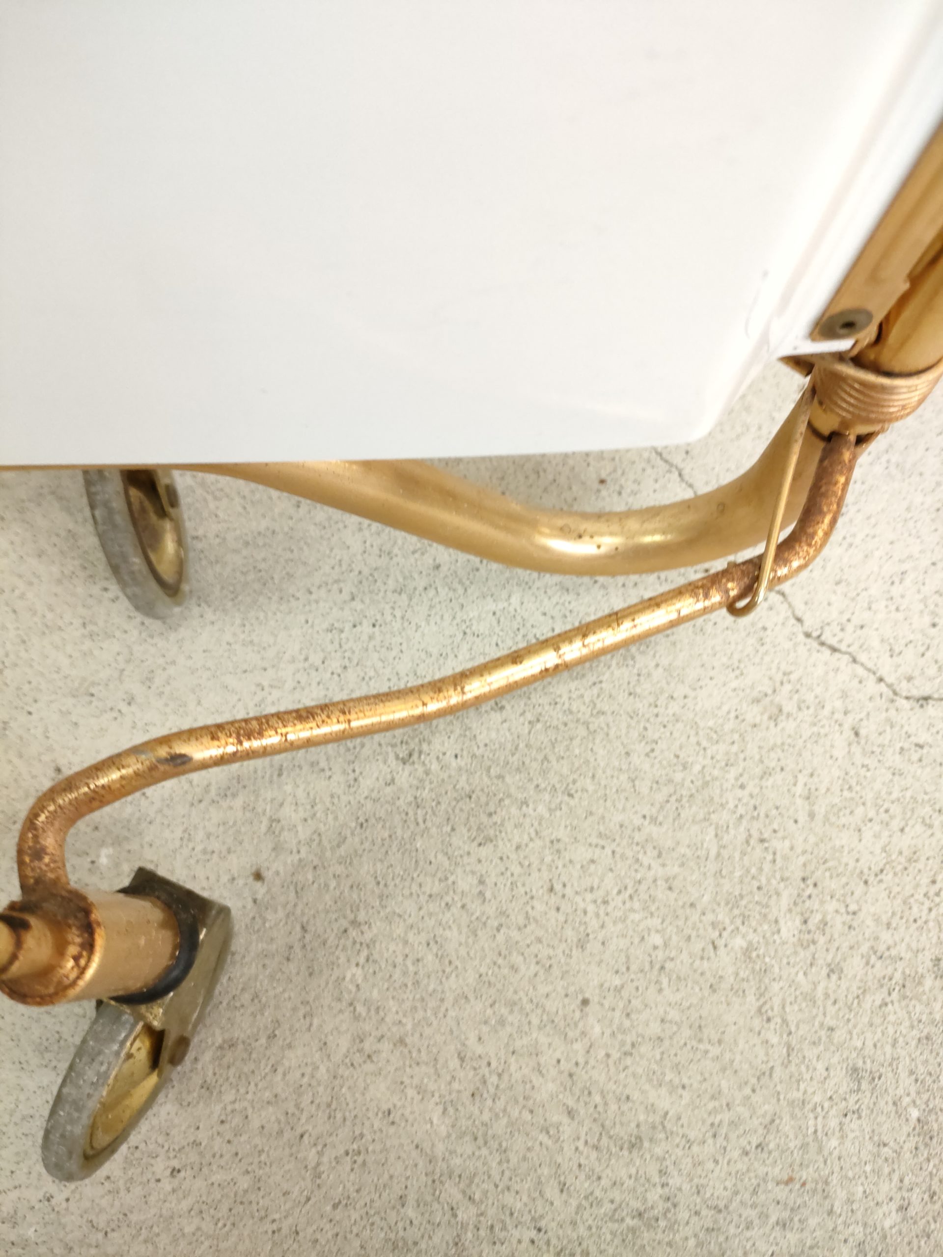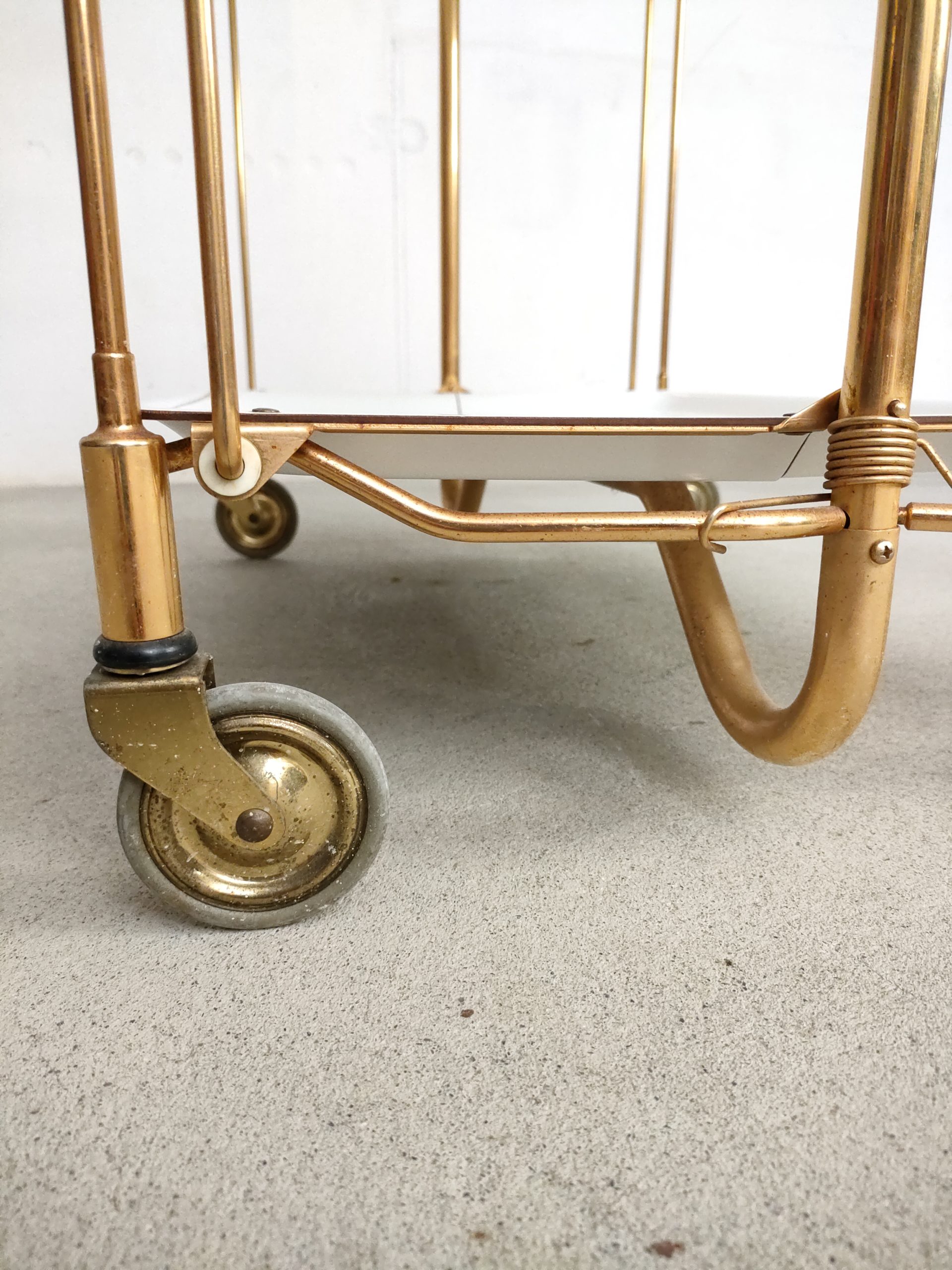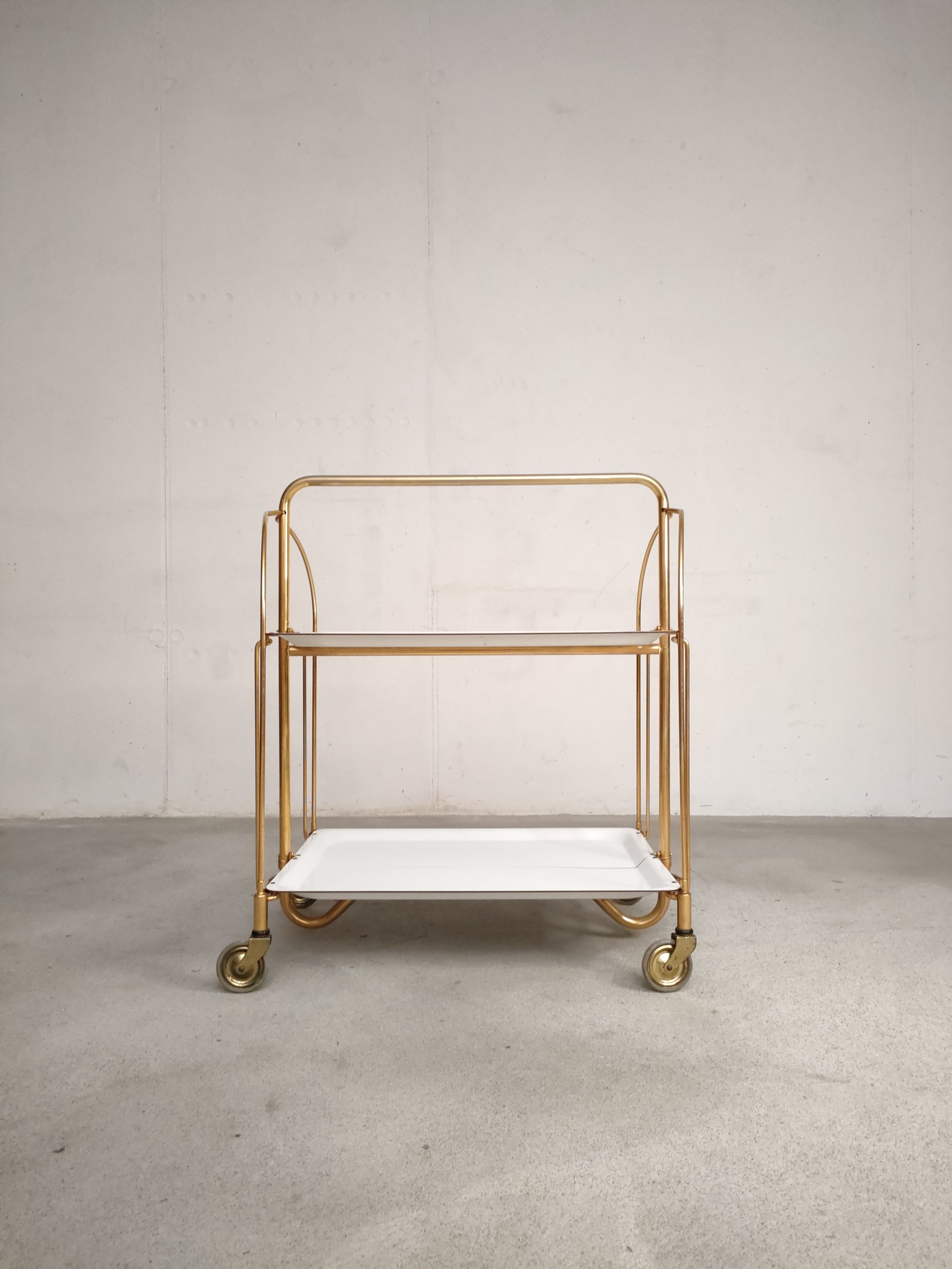 Produit venduDesserte ou service boy vintage sur roulettes avec structure en métal laitonné et deux plateaux en formica blanc qui peuvent être pliés. Quelques traces sur le métal et sur la partie inférieure (pas visible) du plateau supérieur (voir photos).
