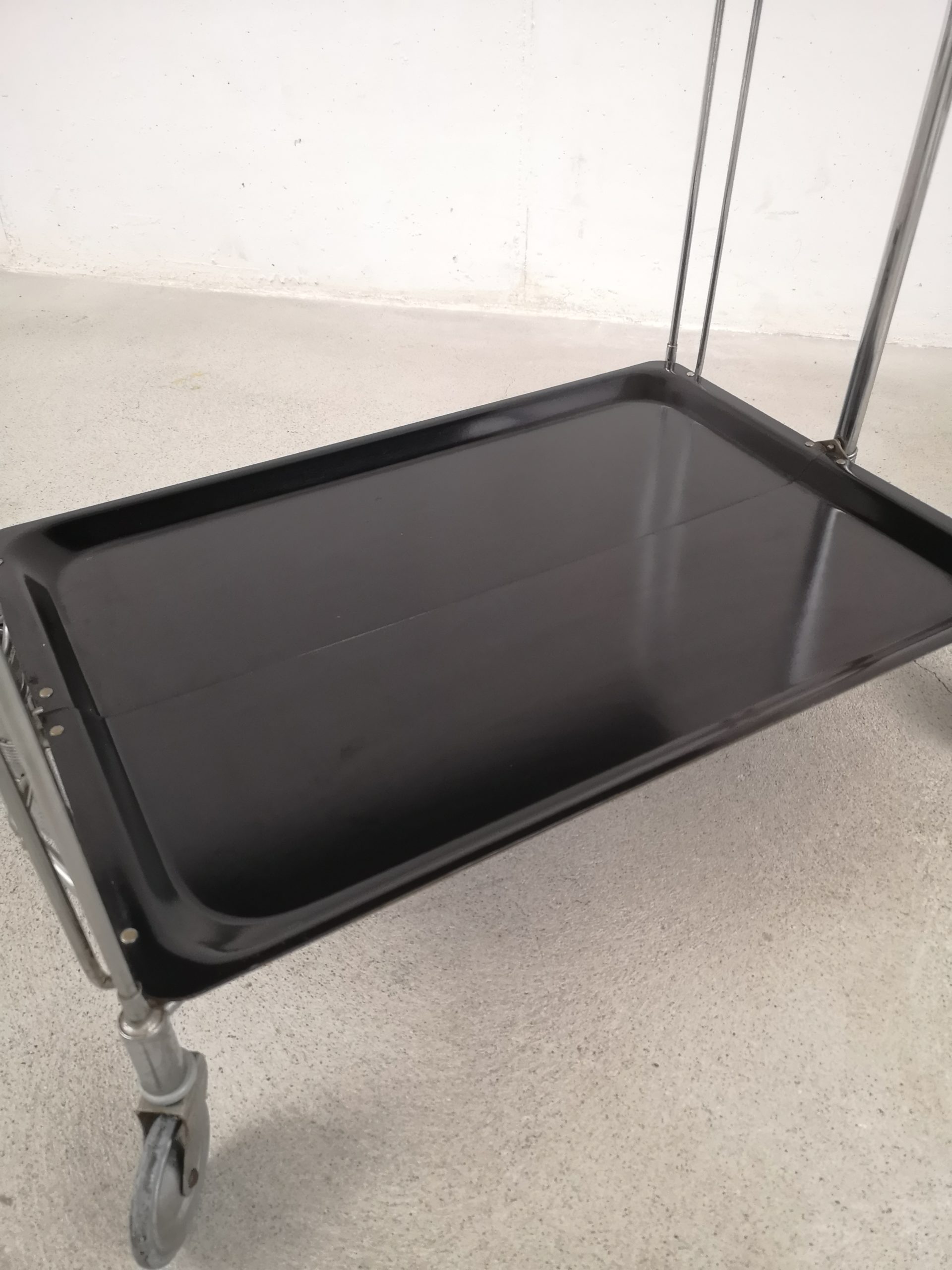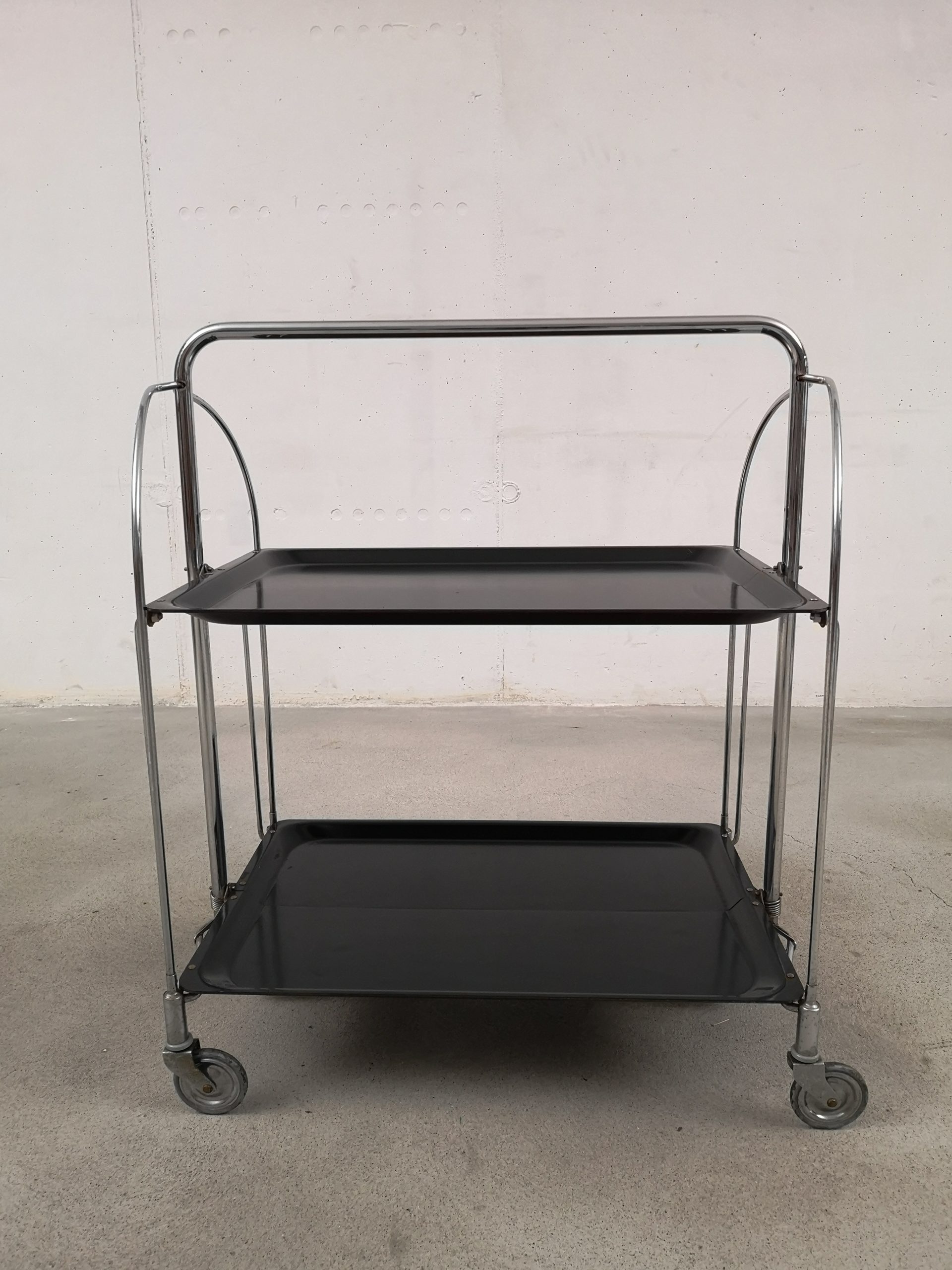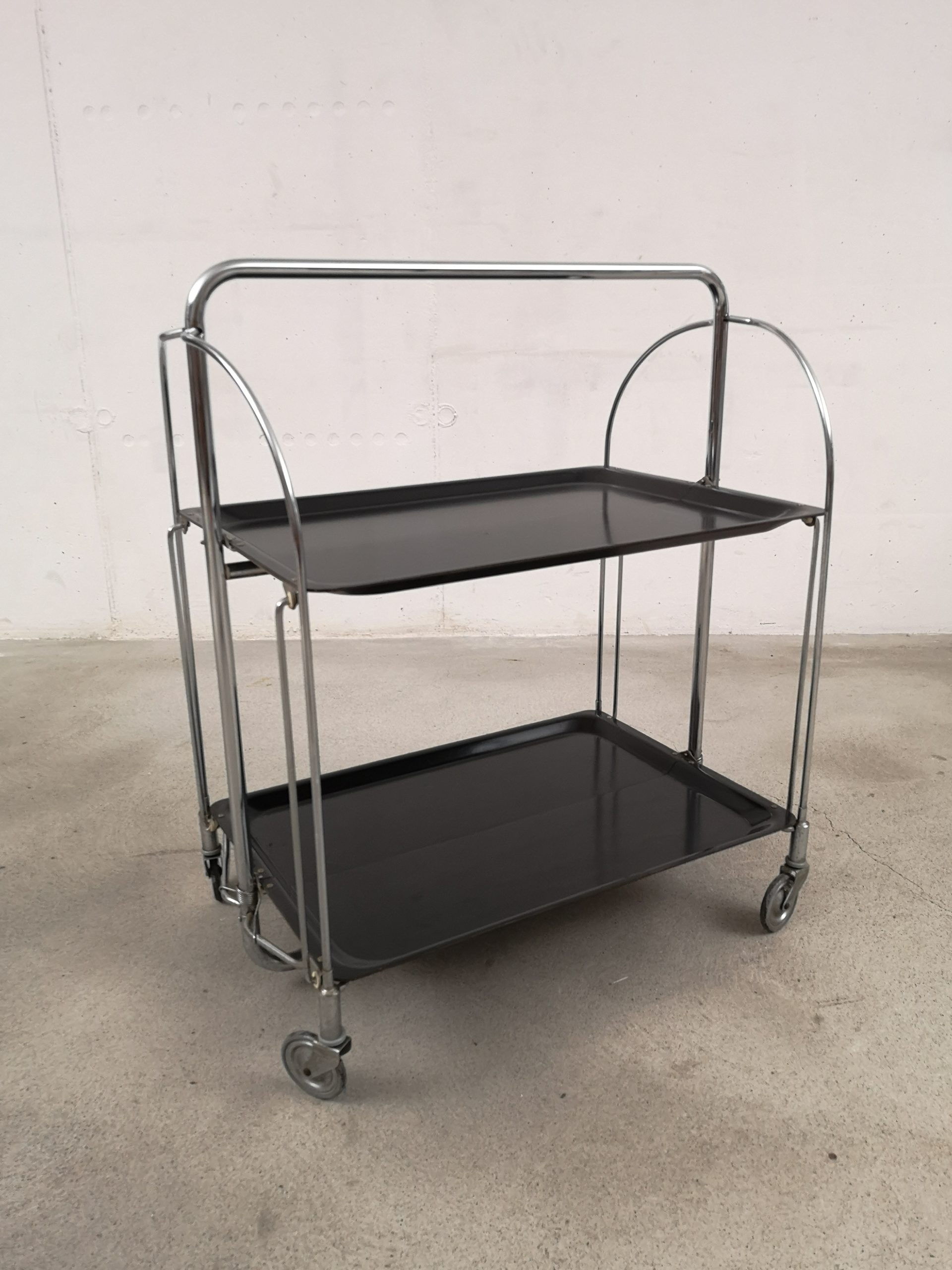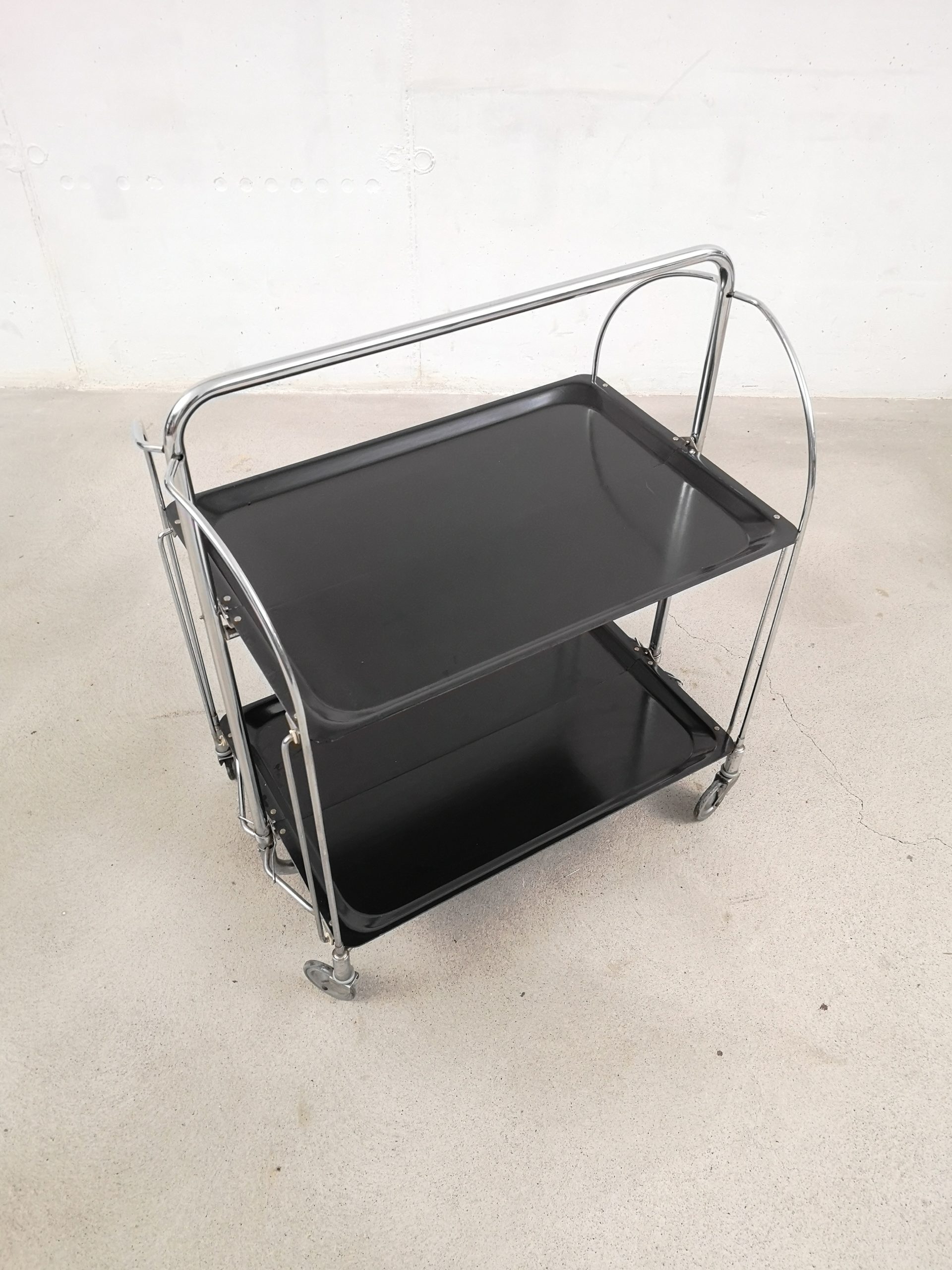 Produit venduDesserte vintage Gerlinol pliante en plastique et métal à roulette avec plateau noir. Légère trace bleu sur le plateau du haut (cf. photo). Il manque un embout en plastique blanc pour une des tiges en métal. De ce fait, selon ce qu’on fait avec la desserte, la tige peut sortir. Néanmoins, ça n’a aucun impact sur la stabilité de la desserte.