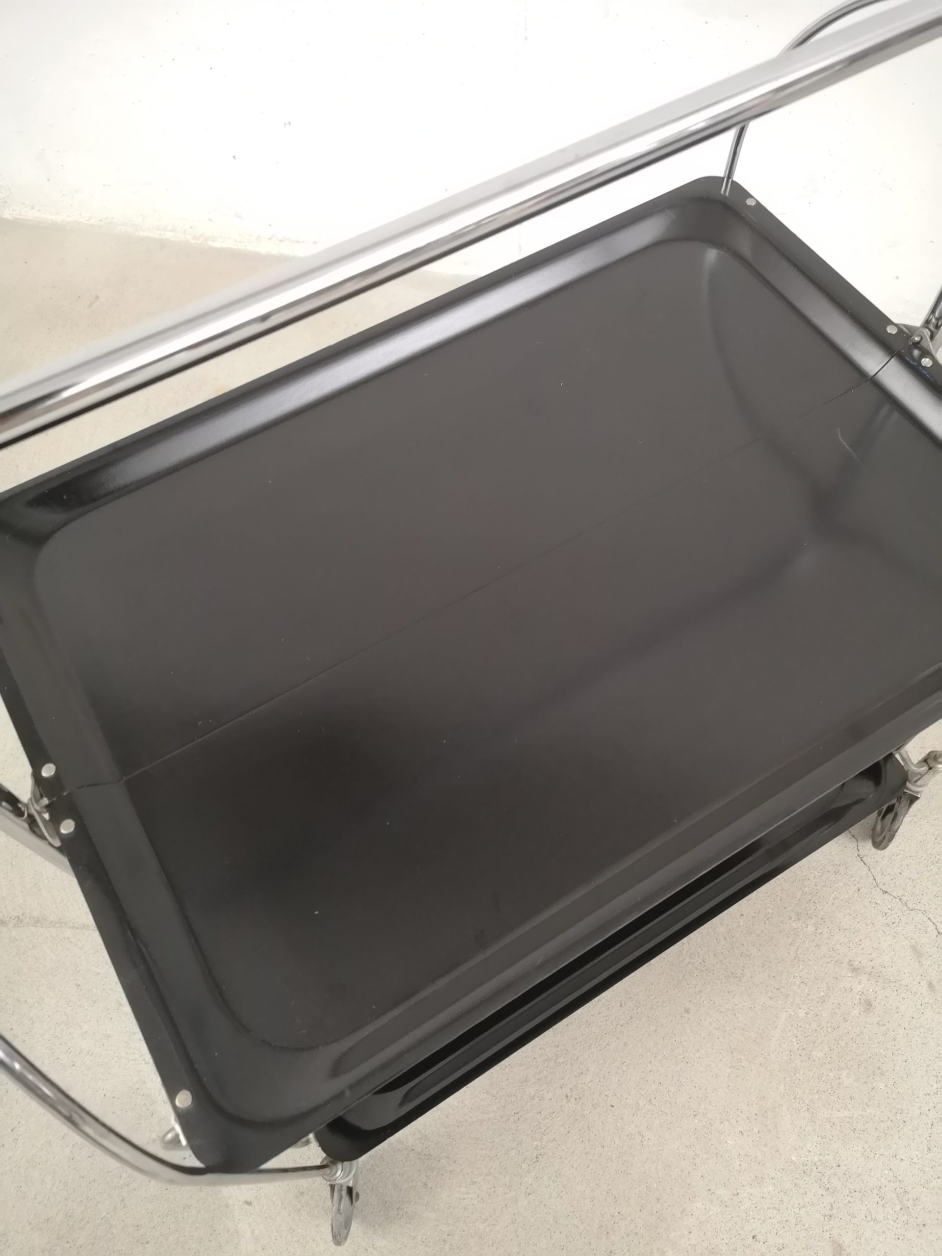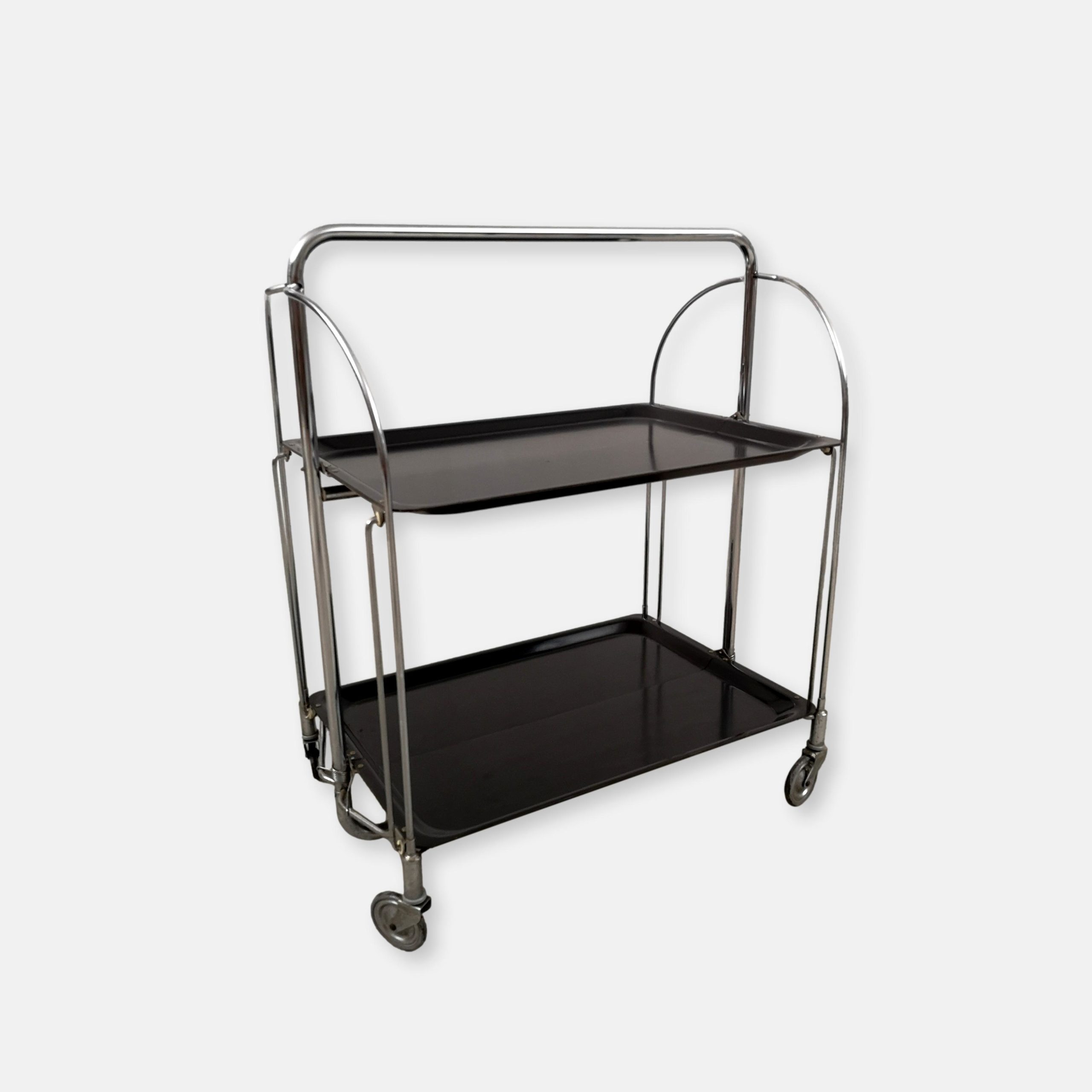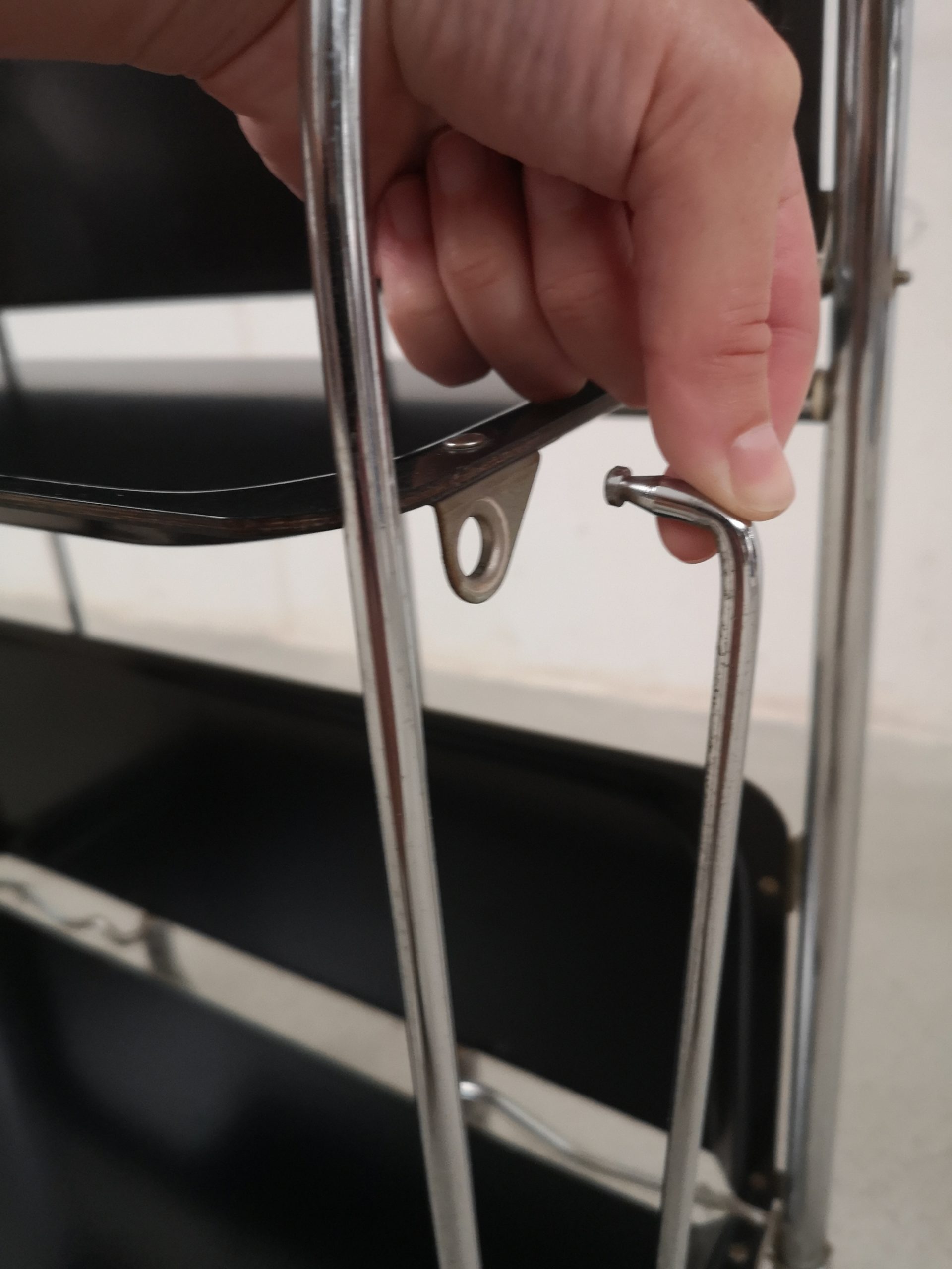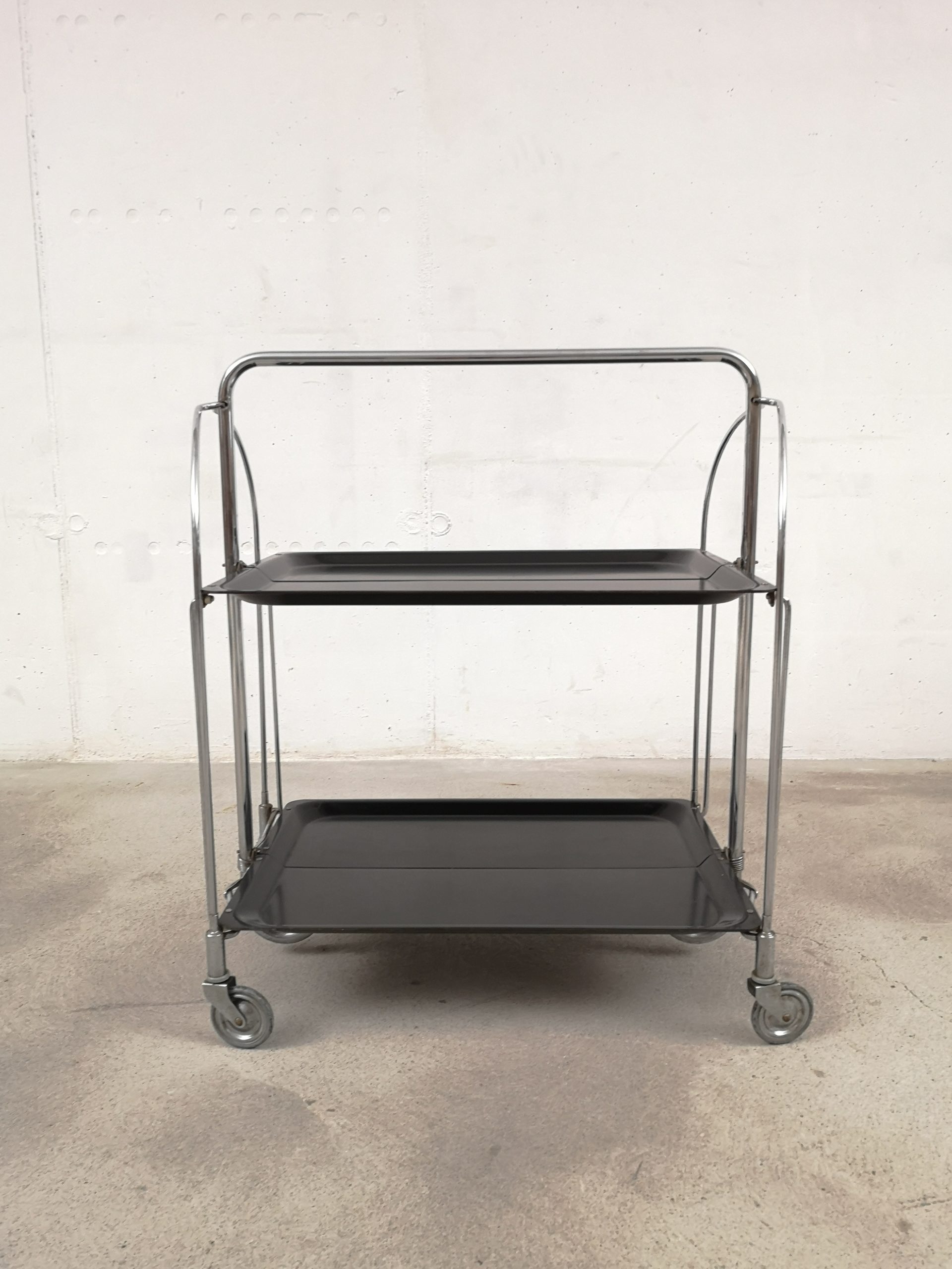 Produit venduDesserte vintage Gerlinol pliante en plastique et métal à roulette avec plateau noir. Légère trace bleu sur le plateau du haut (cf. photo). Il manque un embout en plastique blanc pour une des tiges en métal. De ce fait, selon ce qu’on fait avec la desserte, la tige peut sortir. Néanmoins, ça n’a aucun impact sur la stabilité de la desserte.