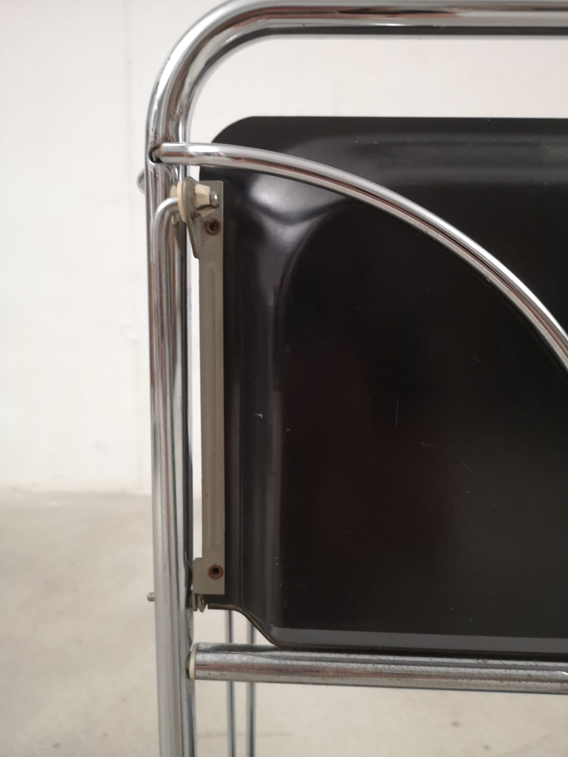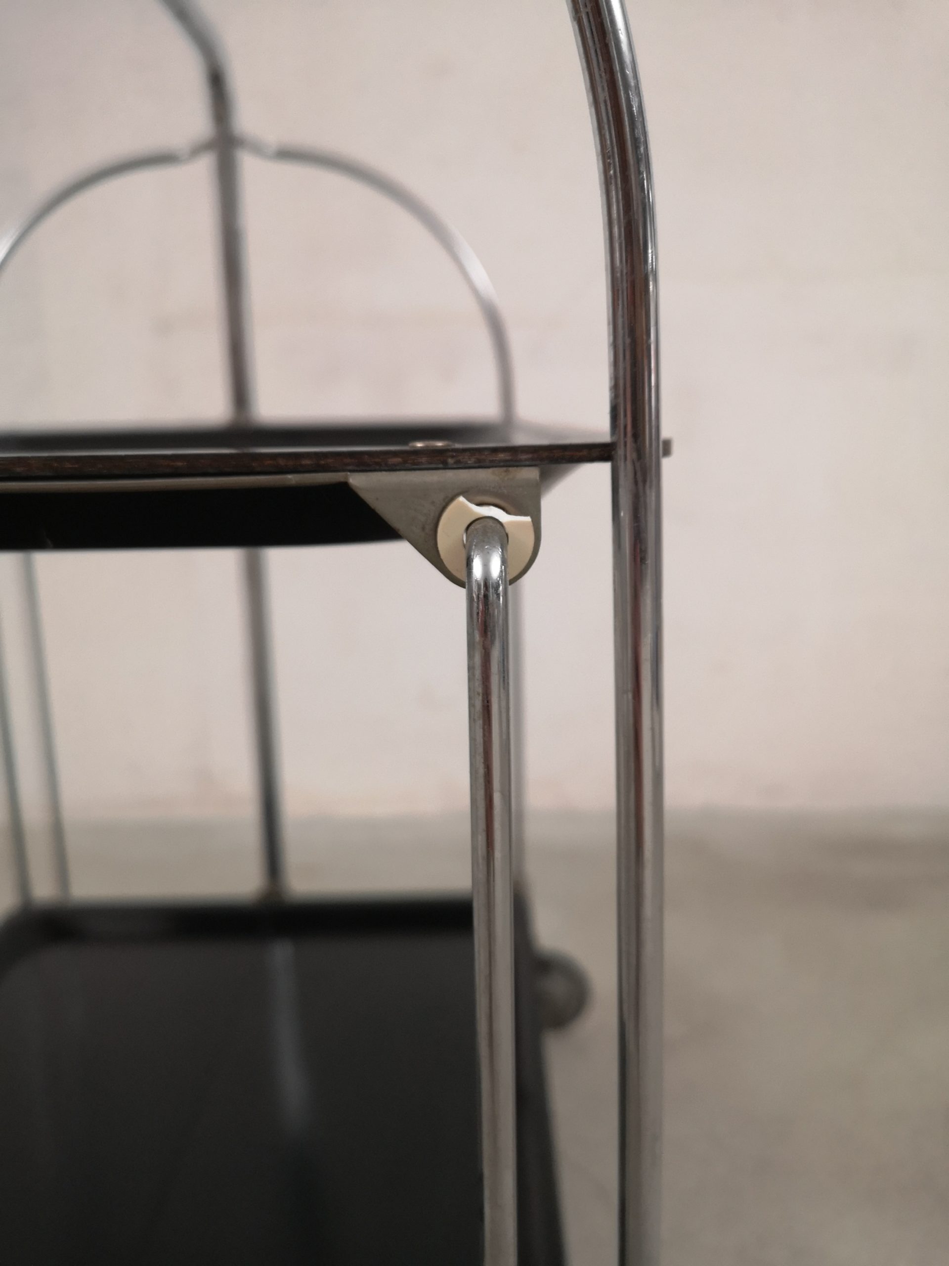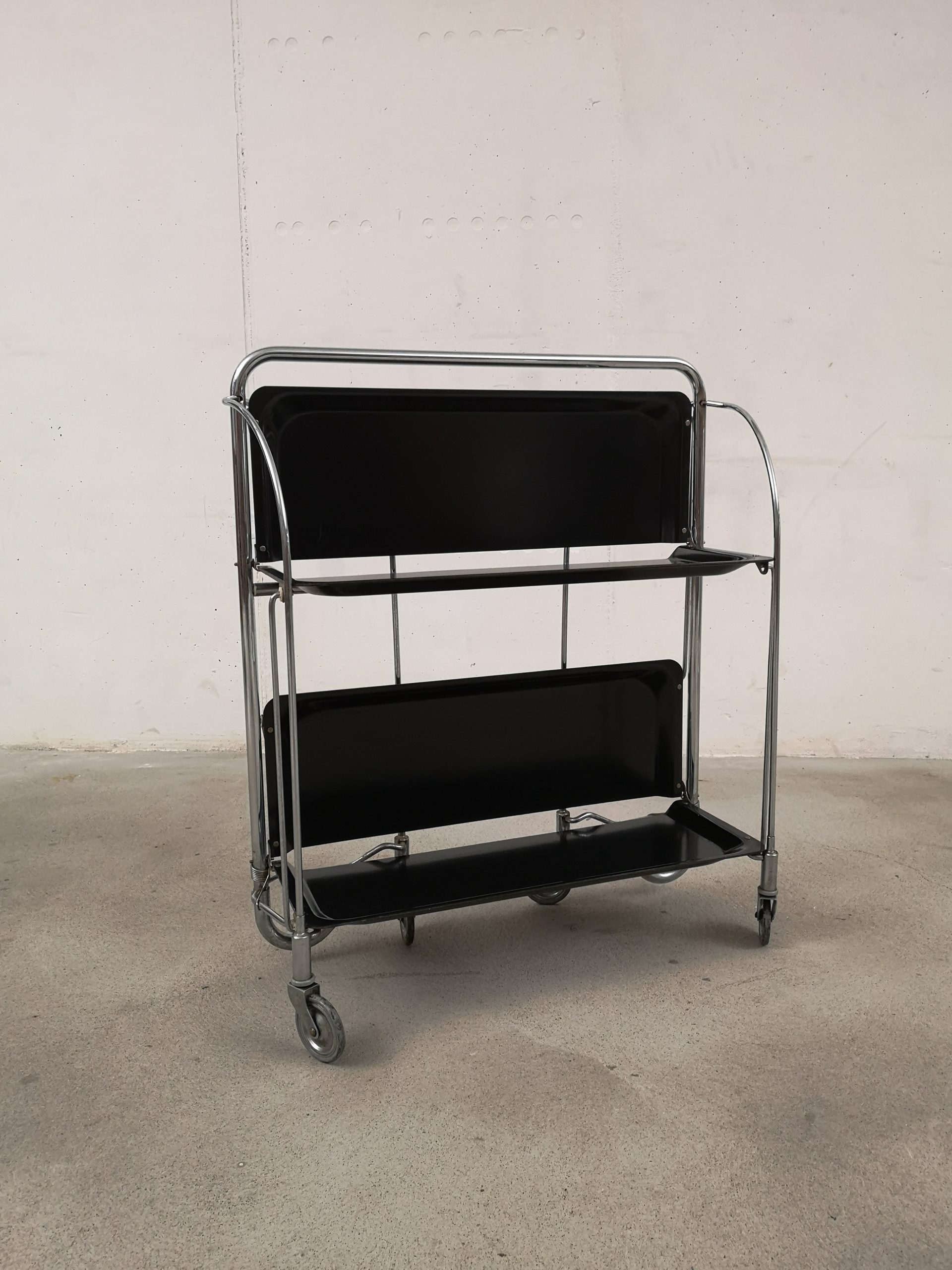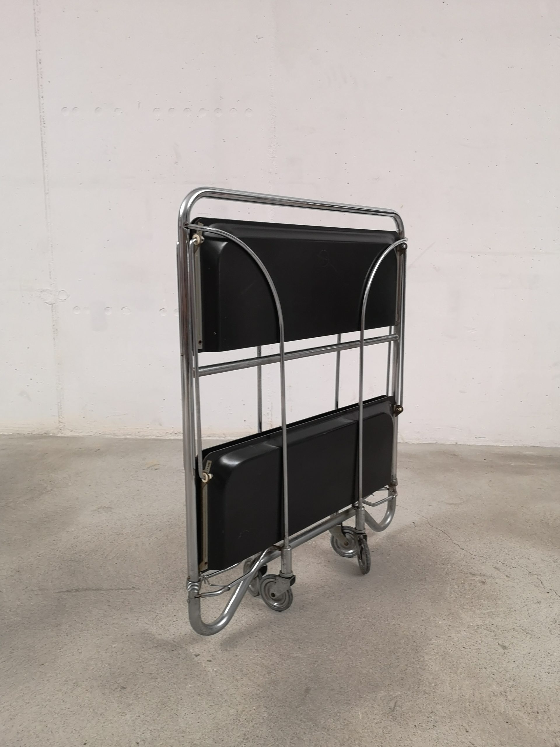 Produit venduDesserte vintage Gerlinol pliante en plastique et métal à roulette avec plateau noir. Légère trace bleu sur le plateau du haut (cf. photo). Il manque un embout en plastique blanc pour une des tiges en métal. De ce fait, selon ce qu’on fait avec la desserte, la tige peut sortir. Néanmoins, ça n’a aucun impact sur la stabilité de la desserte.