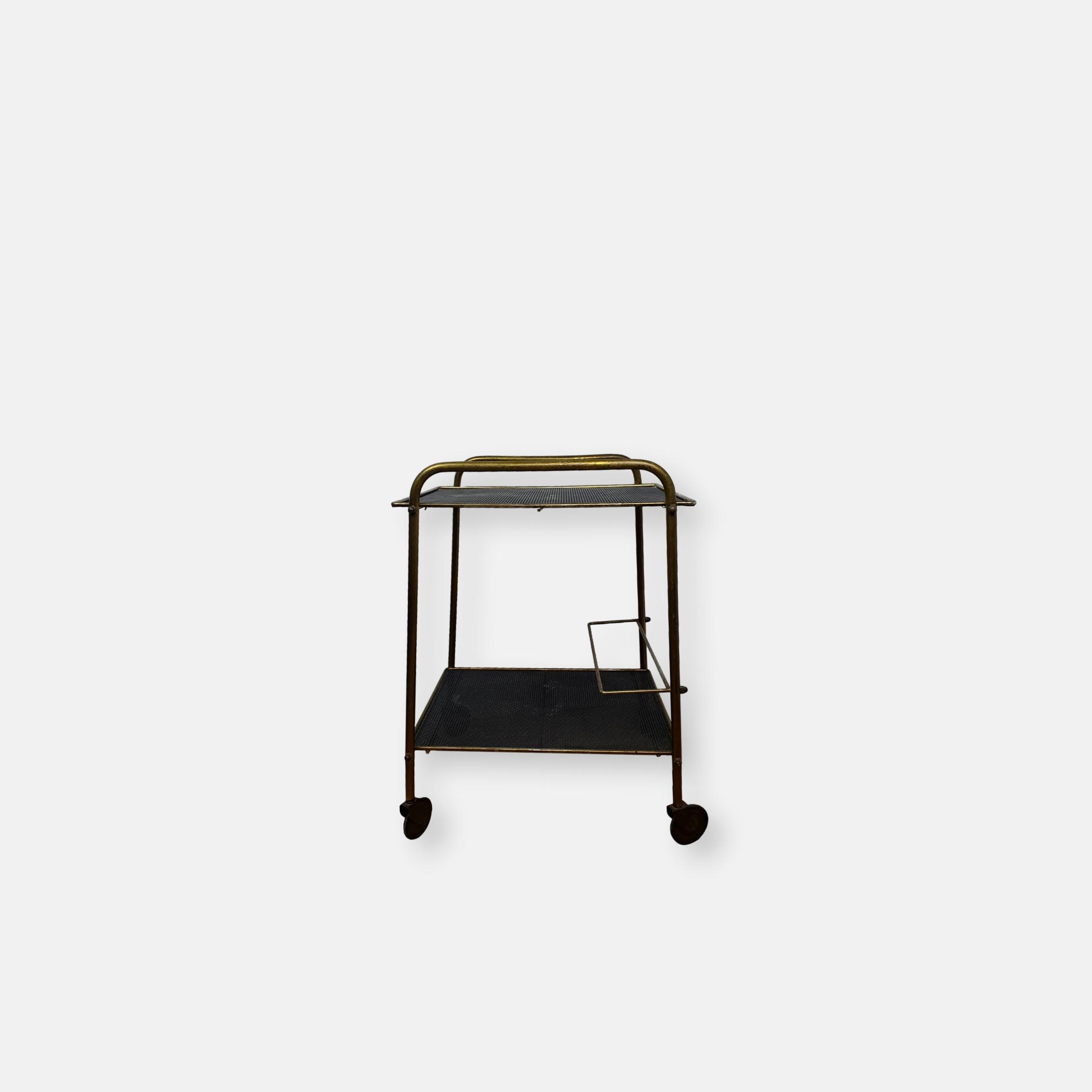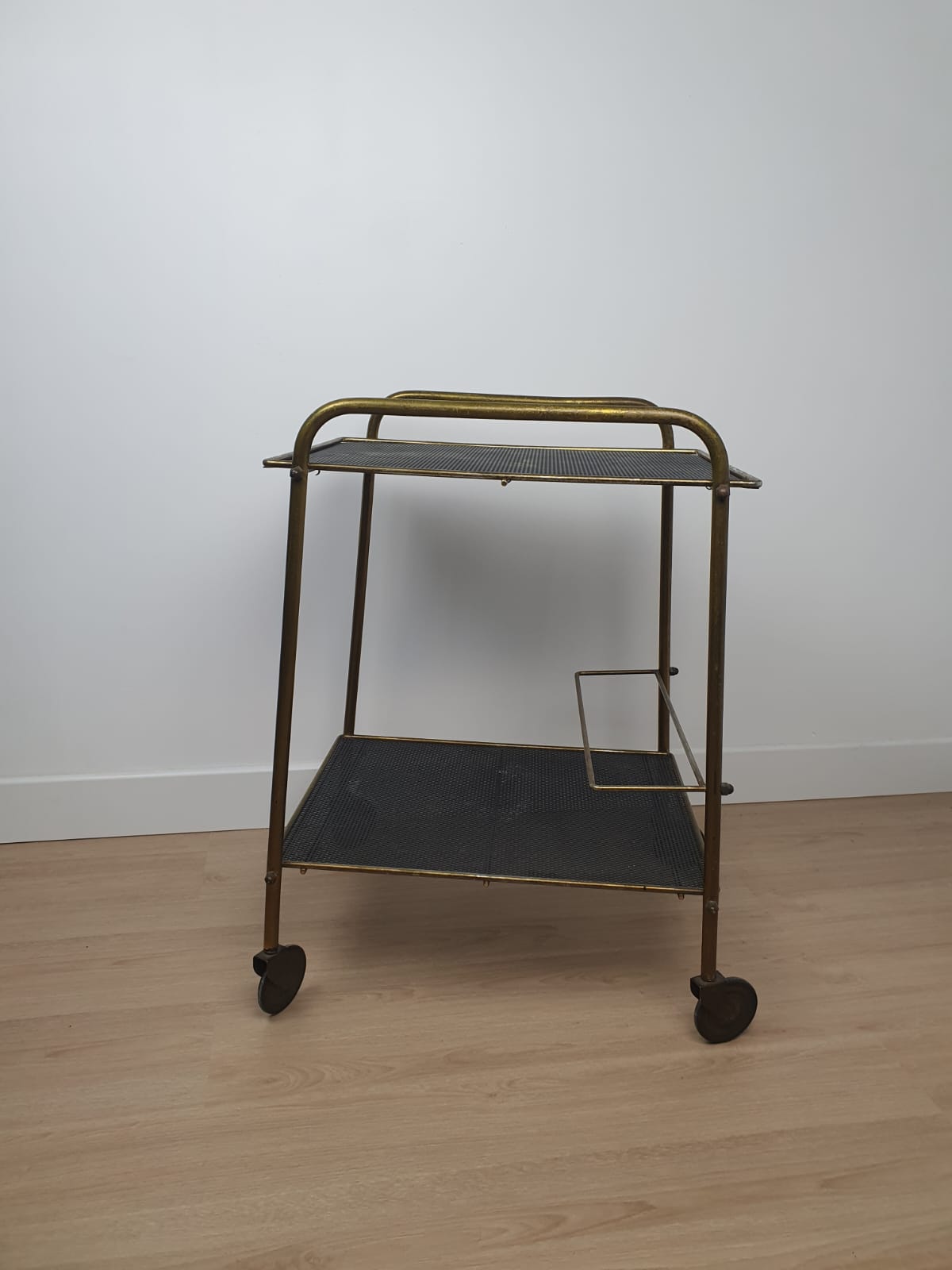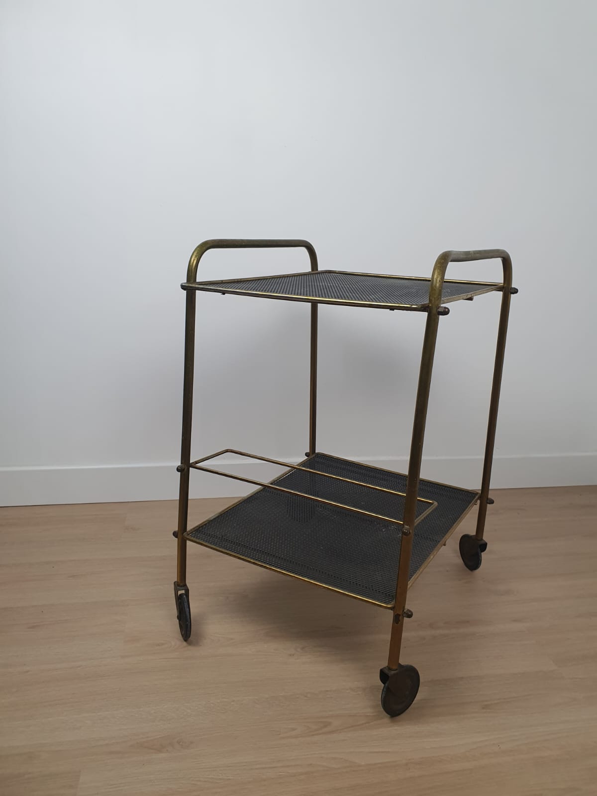 Produit venduService boy vintage sur roulettes en laiton avec plateaux en métal noir perforé et espace de rangement pour les bouteilles.