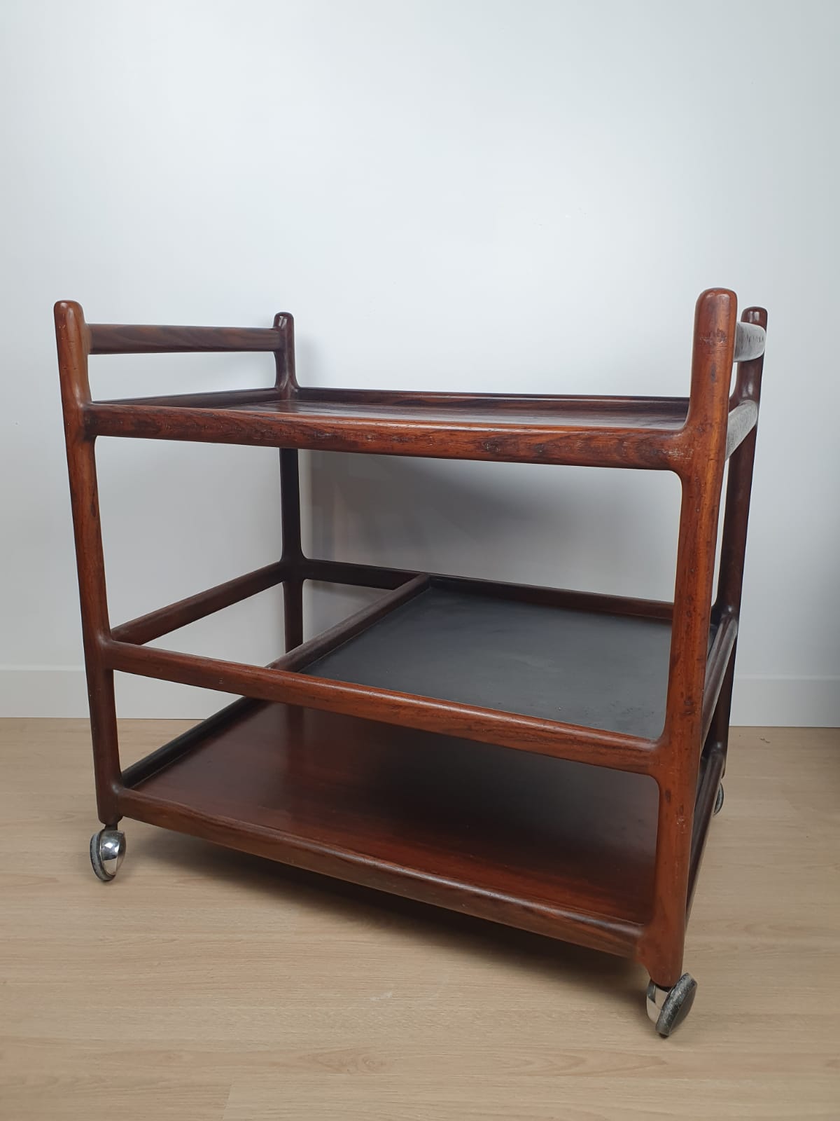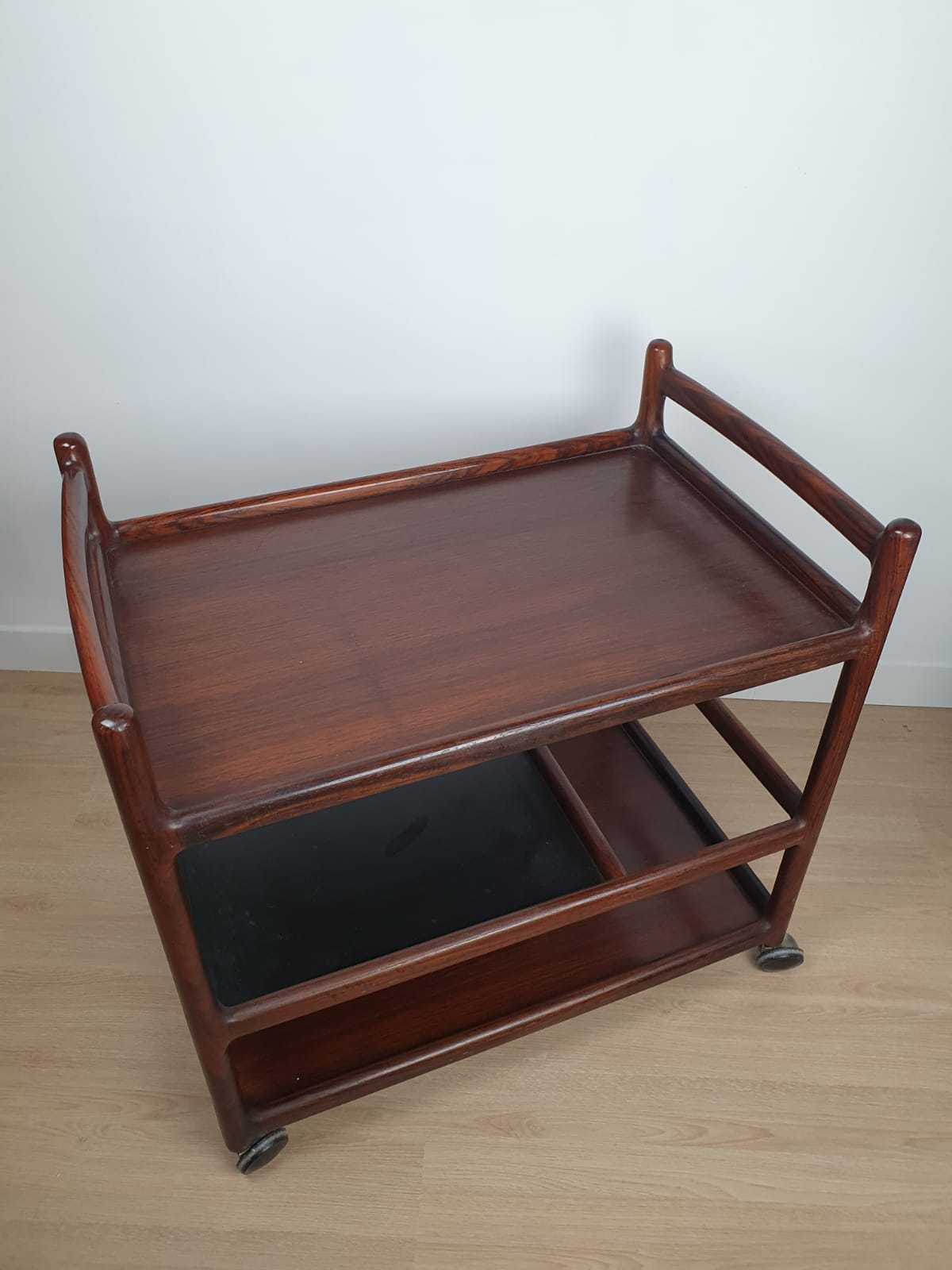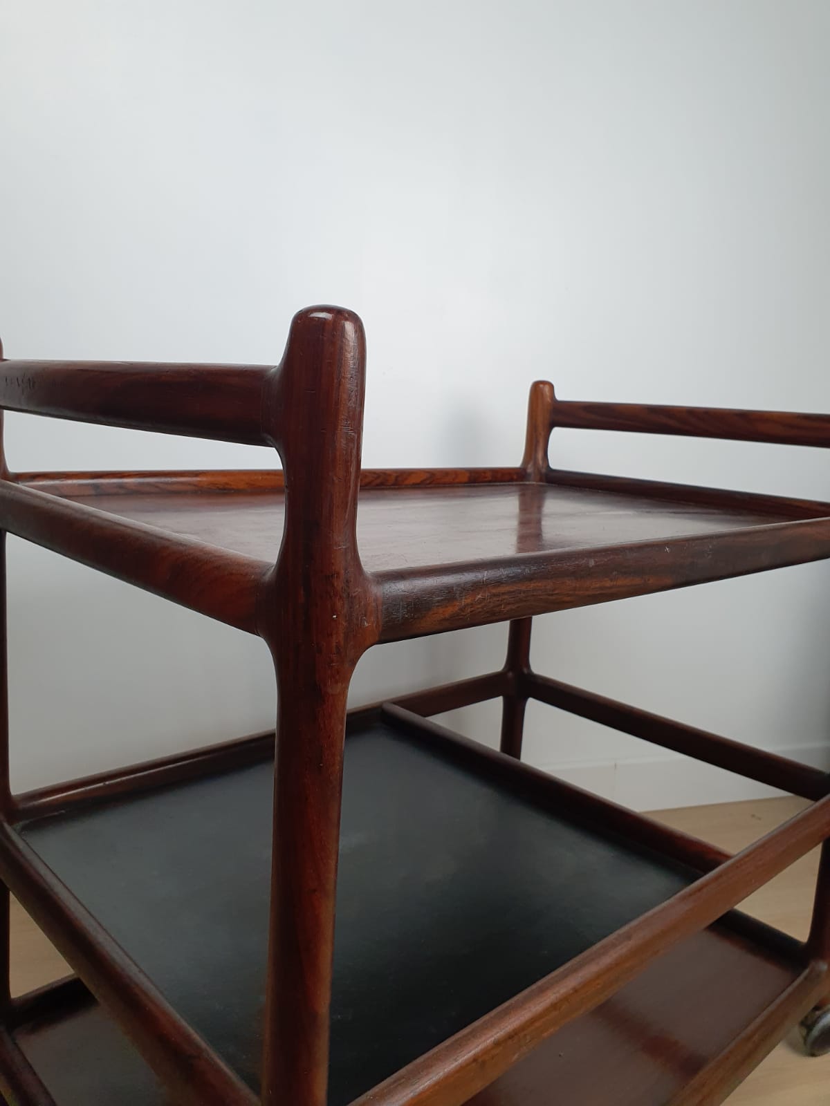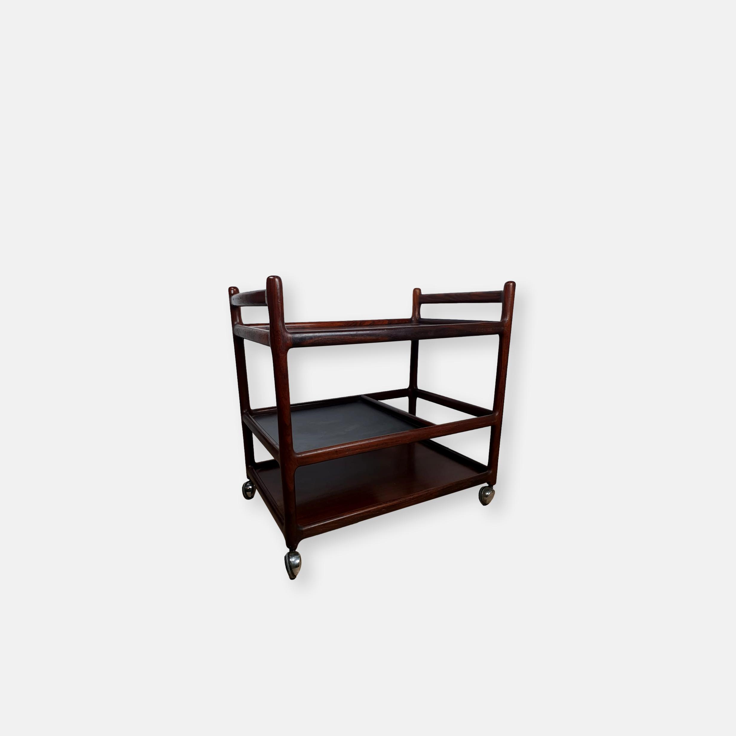 Produit venduService boy/Rosewood Drinks Trolley de Johannes Andersen en bois massif et avec plateau en cuir pour l’étagère du milieu.