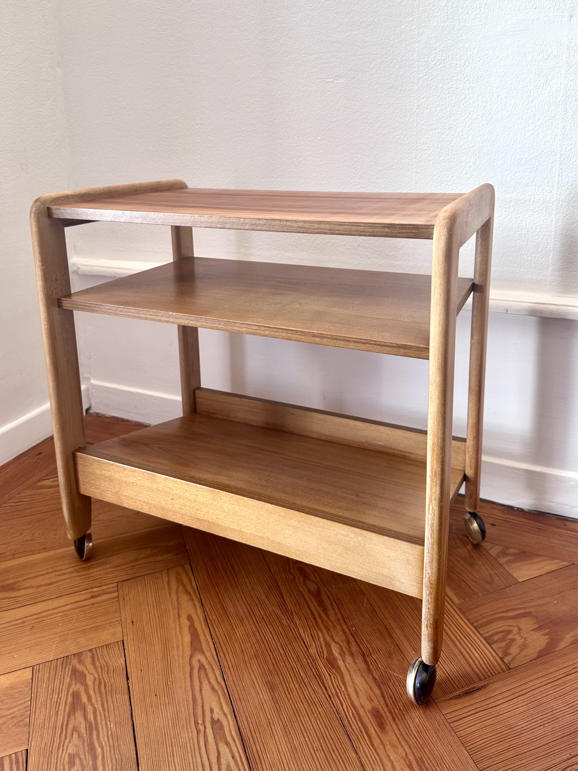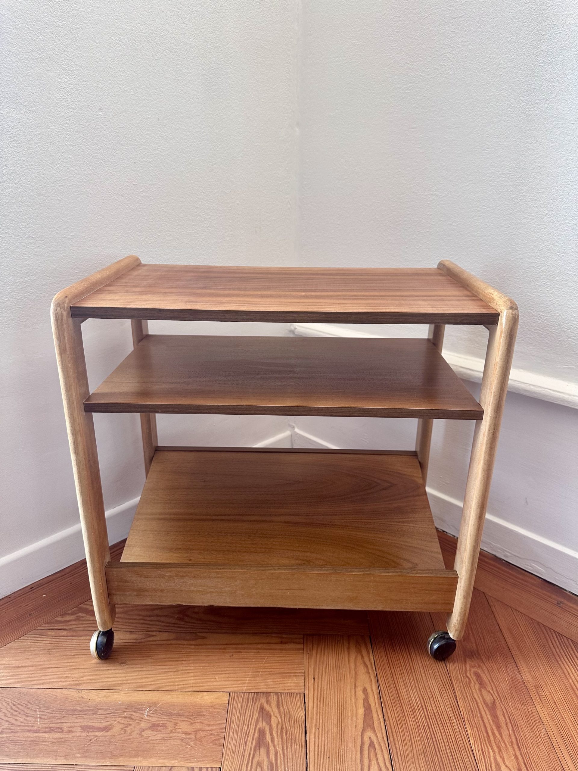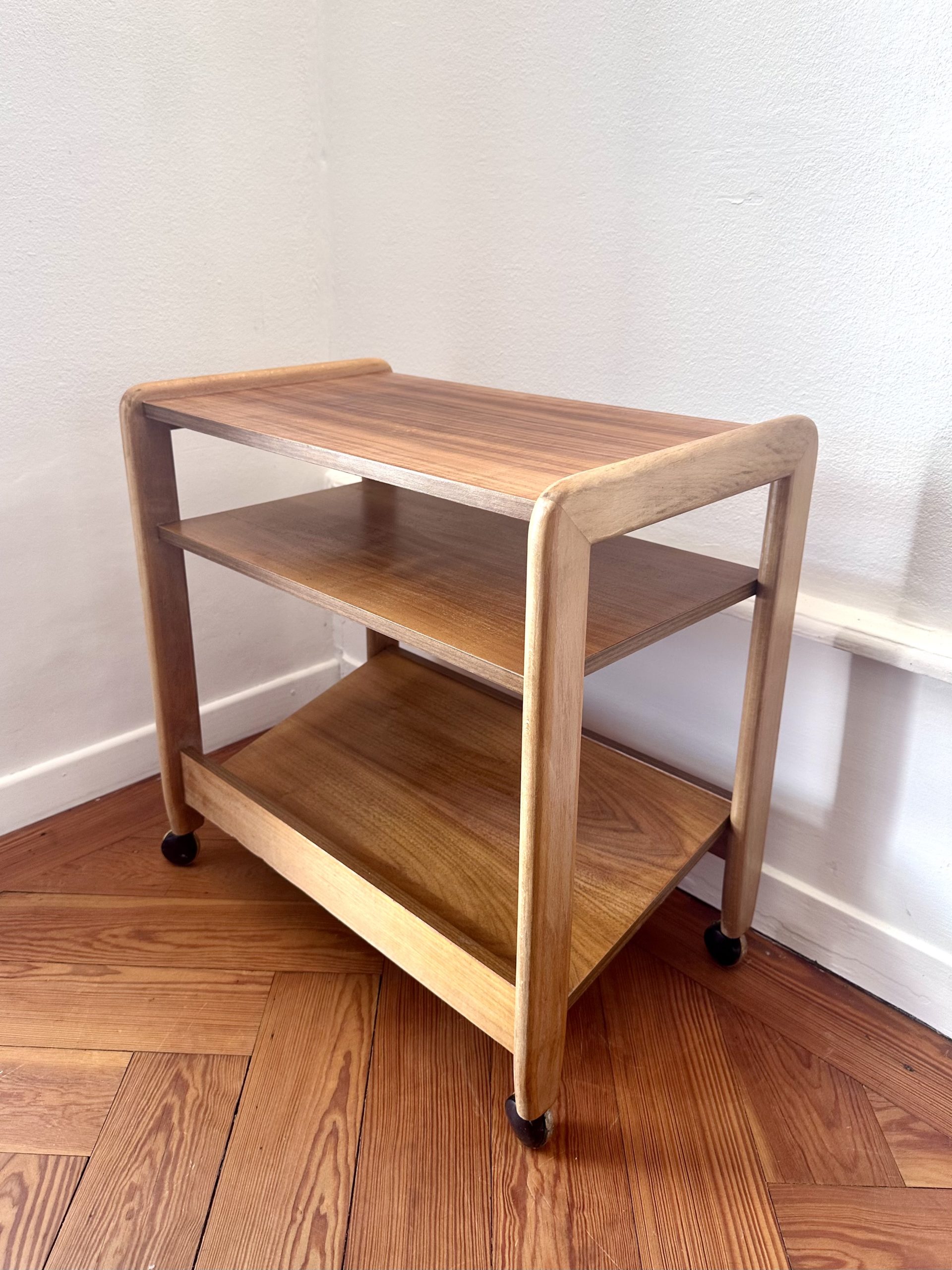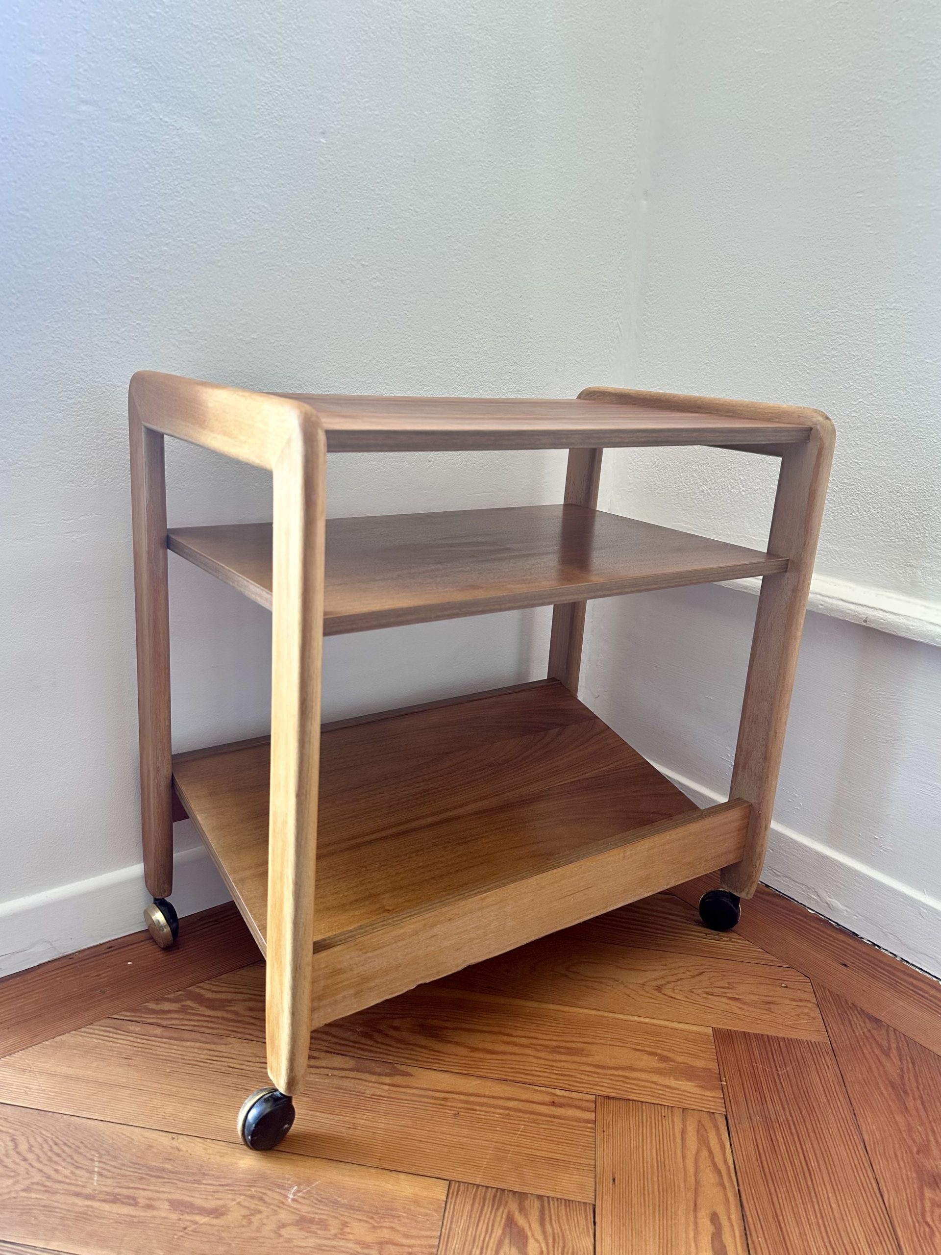Table d’appoint danoise à roulettes des années 1960, en teck et bois clair. Sa ligne simple, ses montants arrondis et ses trois niveaux ouverts lui donnent une très belle présence scandinave, à la fois graphique, chaleureuse et très pratique.