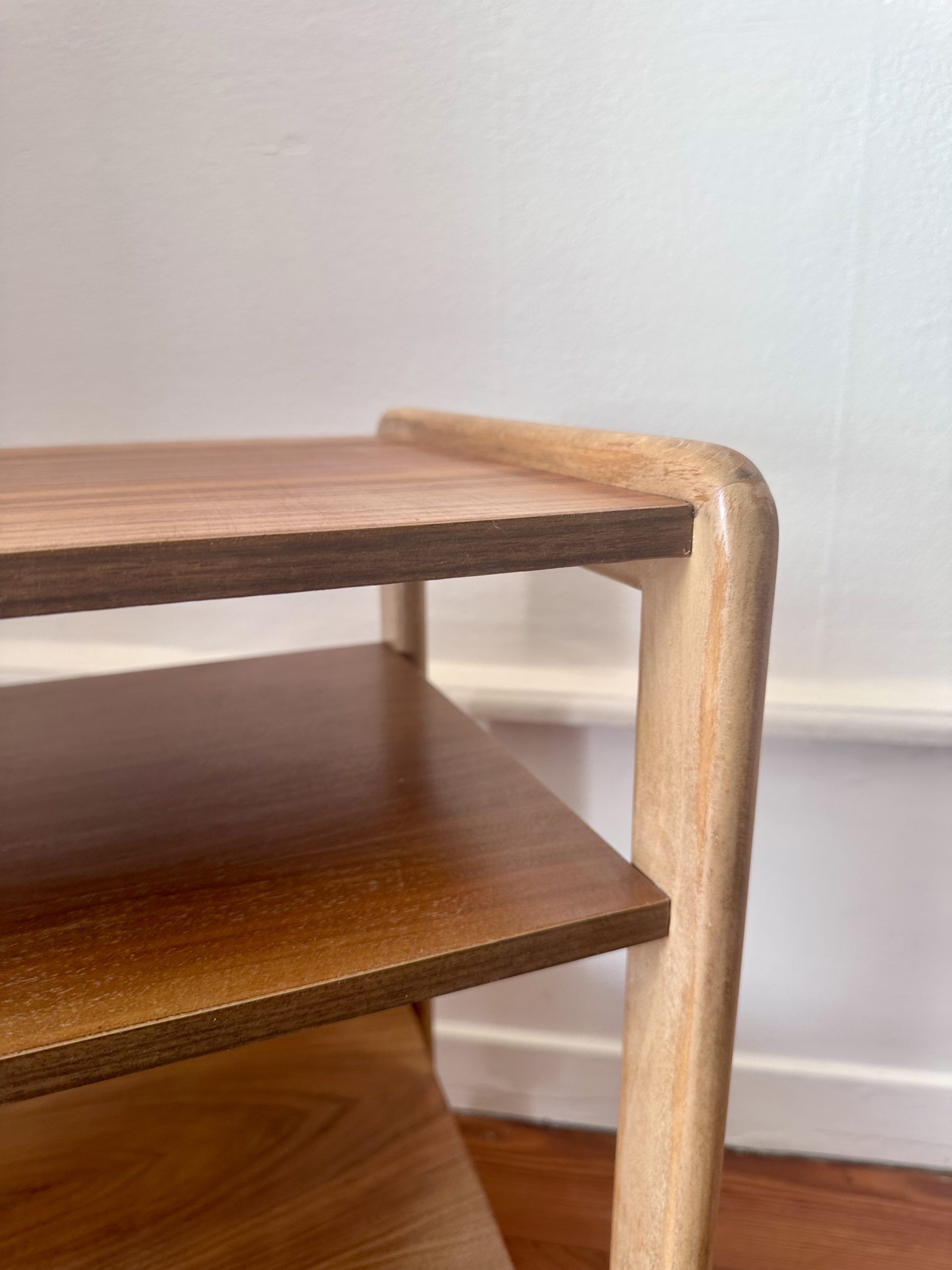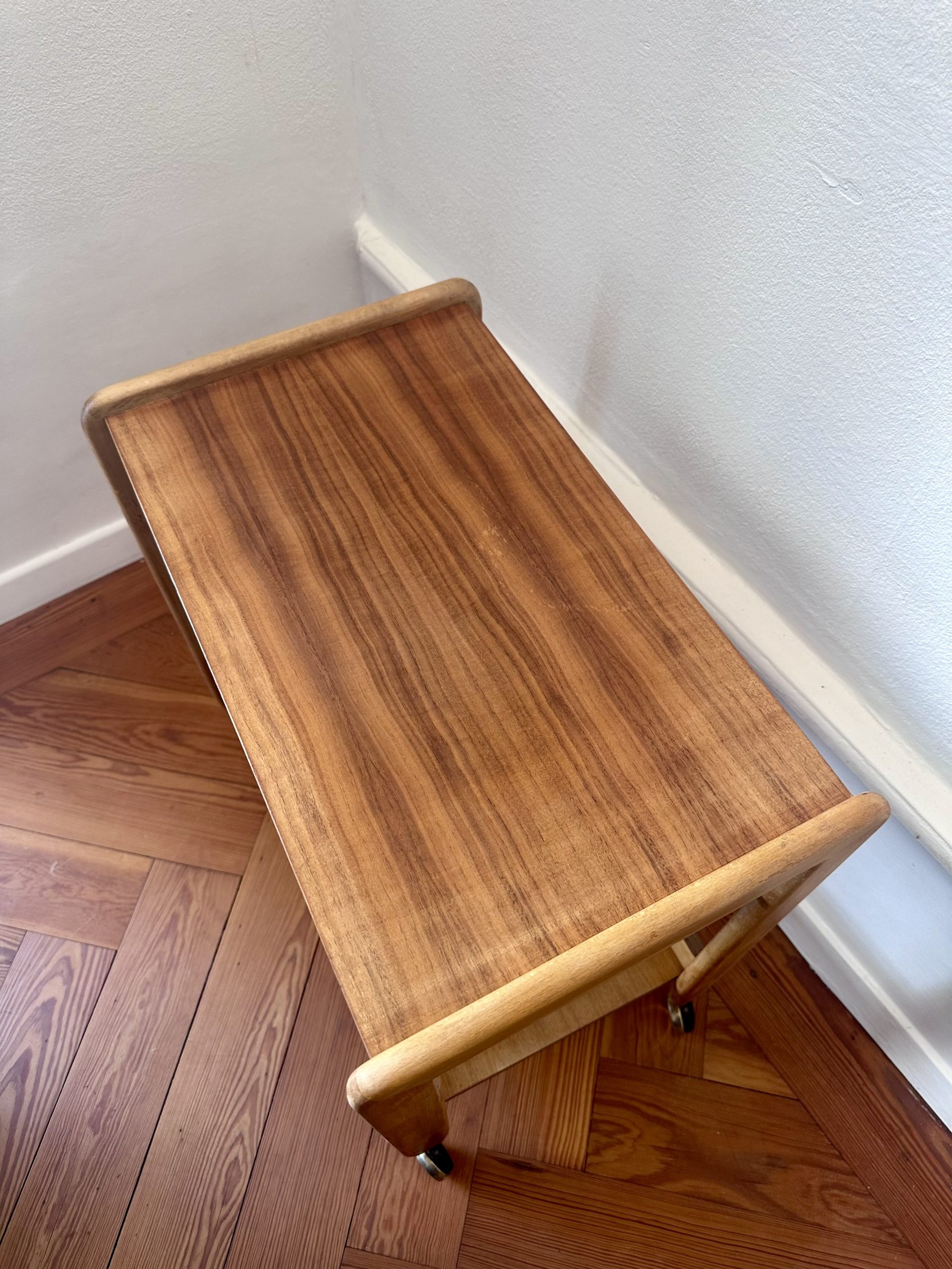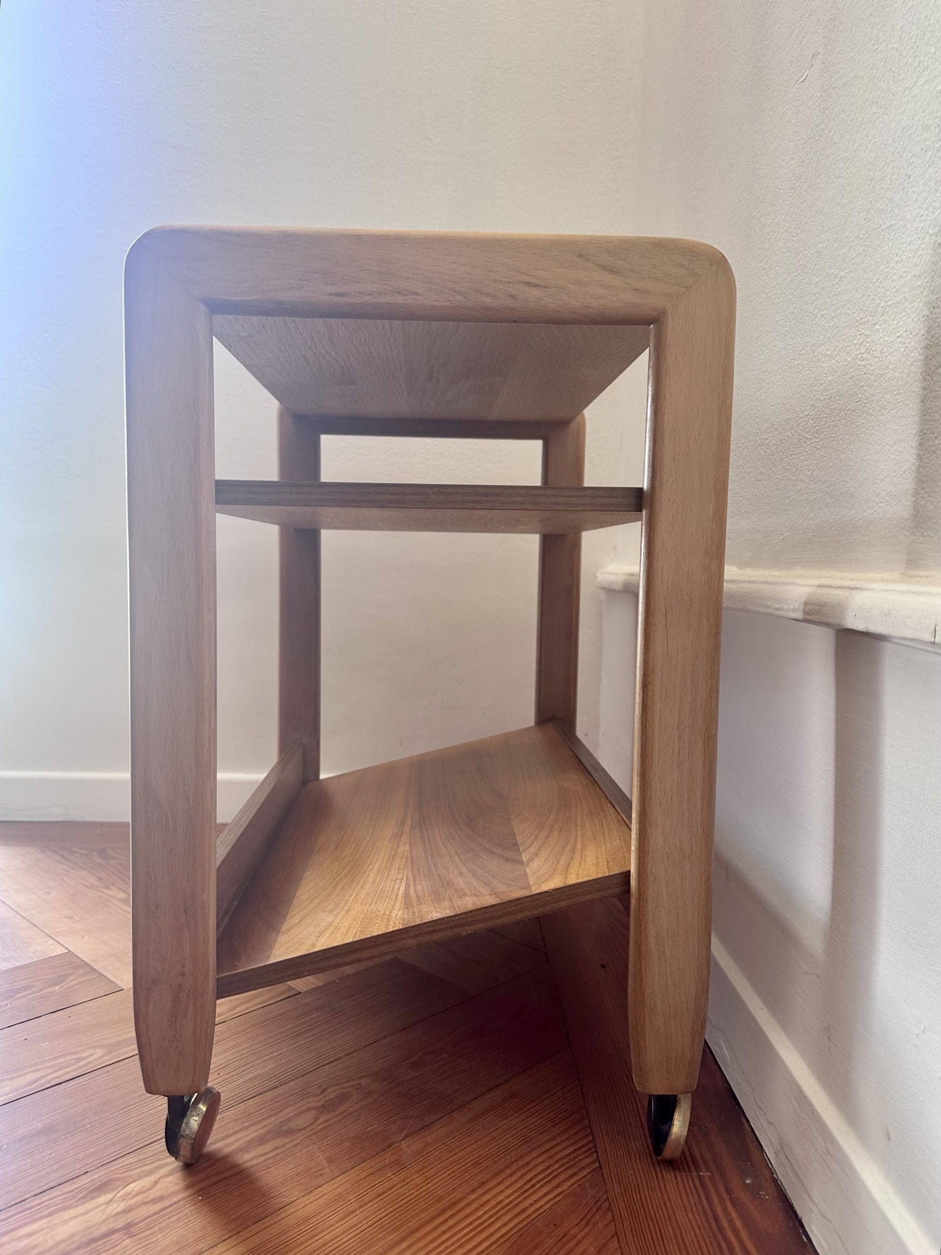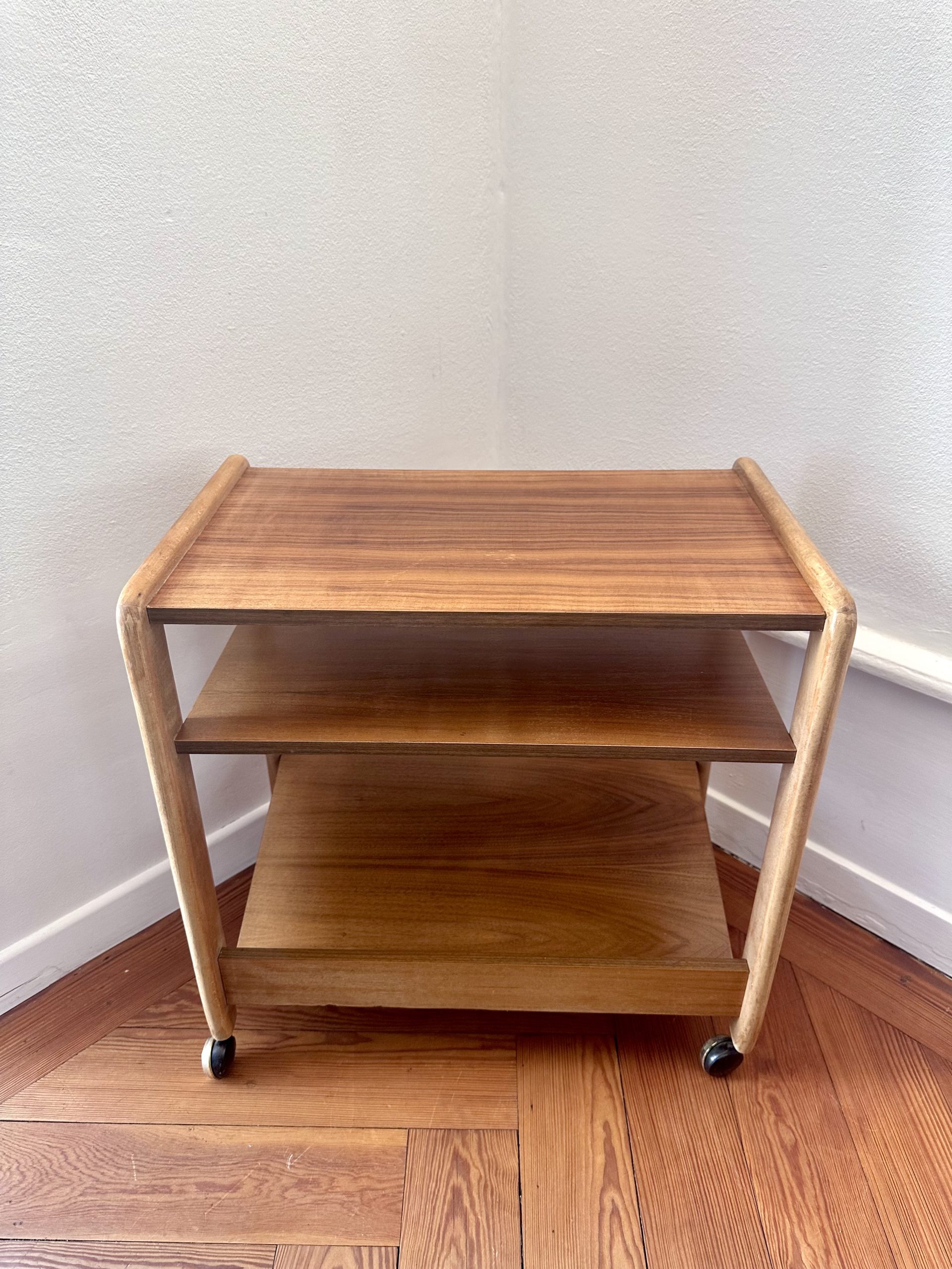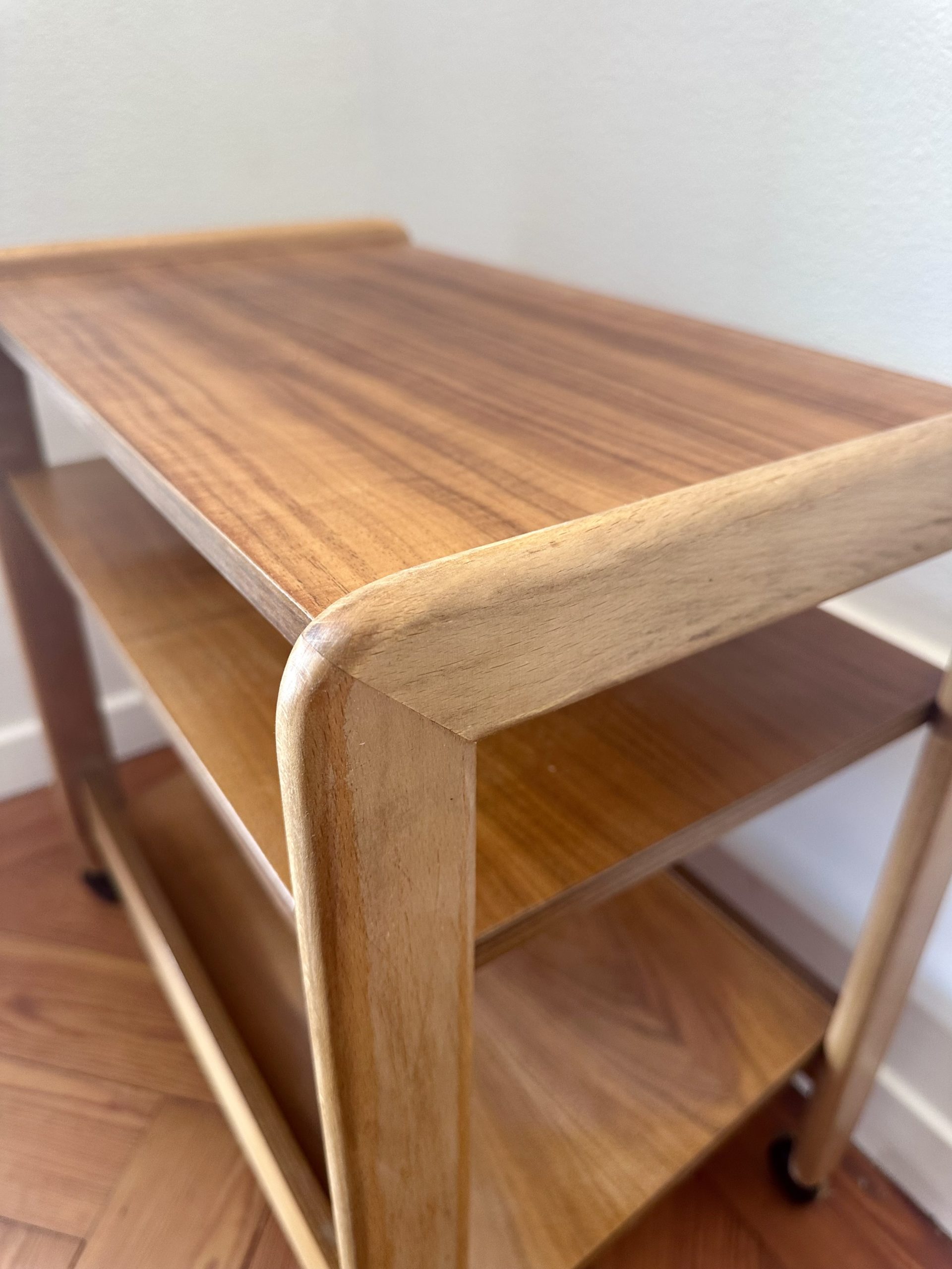 Table d’appoint danoise à roulettes des années 1960, en teck et bois clair. Sa ligne simple, ses montants arrondis et ses trois niveaux ouverts lui donnent une très belle présence scandinave, à la fois graphique, chaleureuse et très pratique.