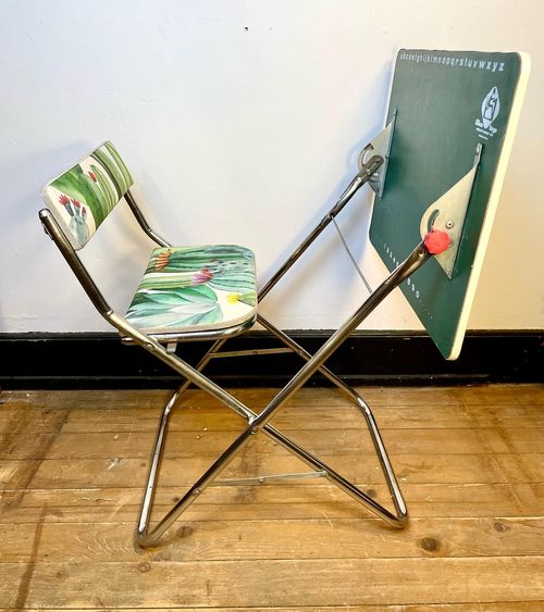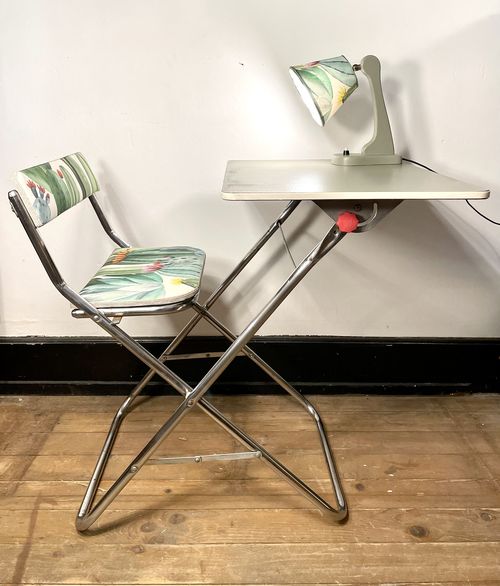 Produit venduBureau vintage pliable revisité. Ardoise à l’intérieur. Le plateau a été repeint en vert puis vernis. Le siège et le dossier ont étés refait avec un tissu aux motif cactus. Vendu avec la lampe revisitée avec le même tissu et de même couleur.
