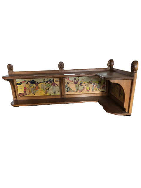 Etagère à fixer au mur. Très originale avec une frise de papier avec des scènes champêtres. Parfaite pour une chambre d’enfant.