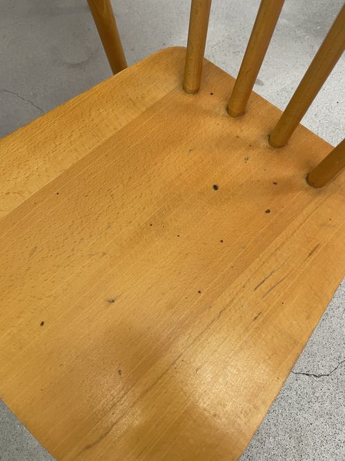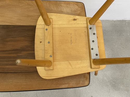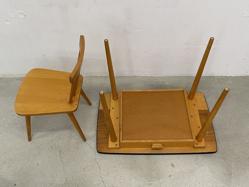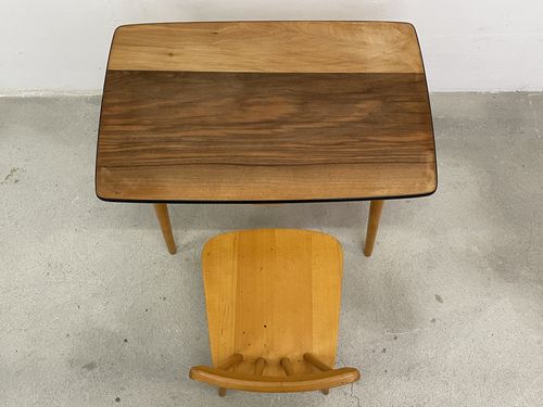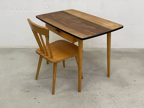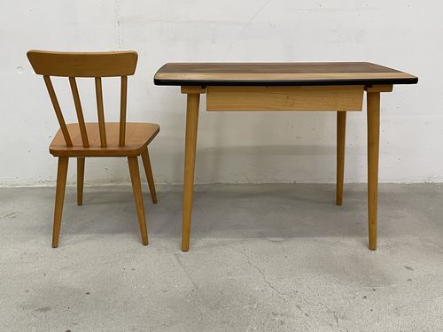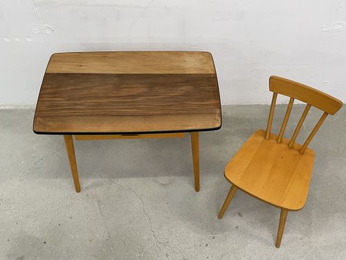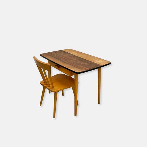 Produit venduSet datant des années 60 comprenant une table et une chaise pour enfants. La table a un tiroir. La chaise a une hauteur d’assise d’environ 30 cm. L’état général des 2 objets est assez bon. La table comporte de légères taches dans les angles, et la chaise des petites marques noires sur l’assise. Le dessous de celle-ci a été renforcé, mais on ne distingue pas de dommage et elle reste parfaitement stable.