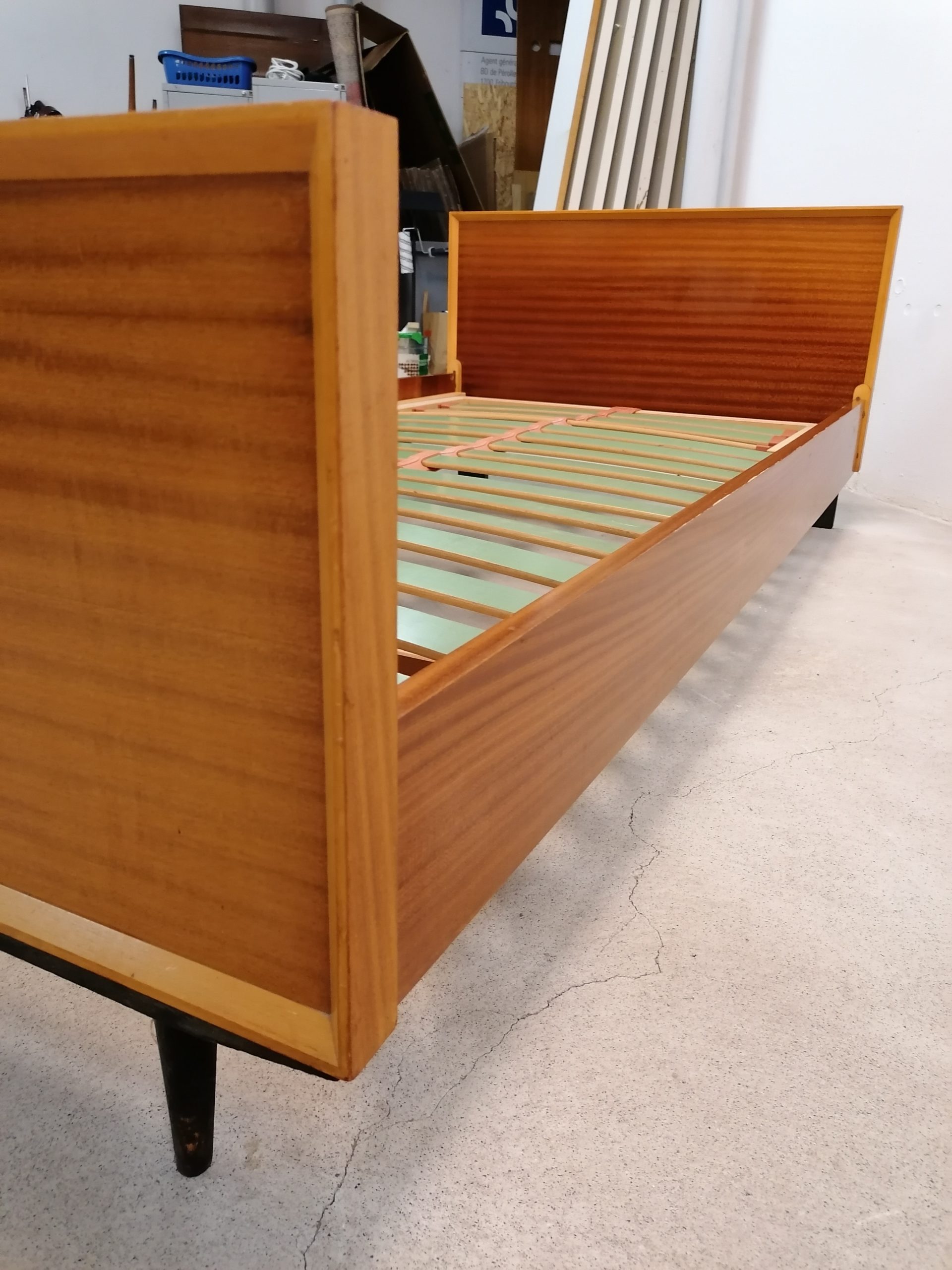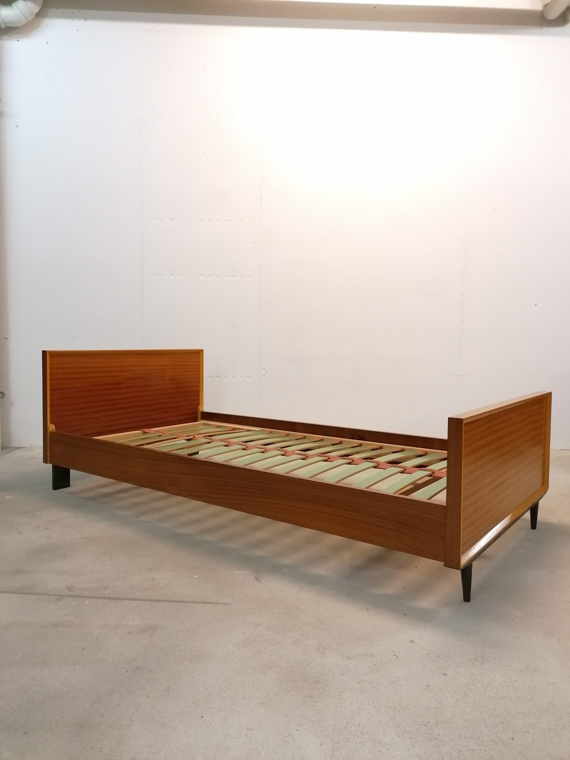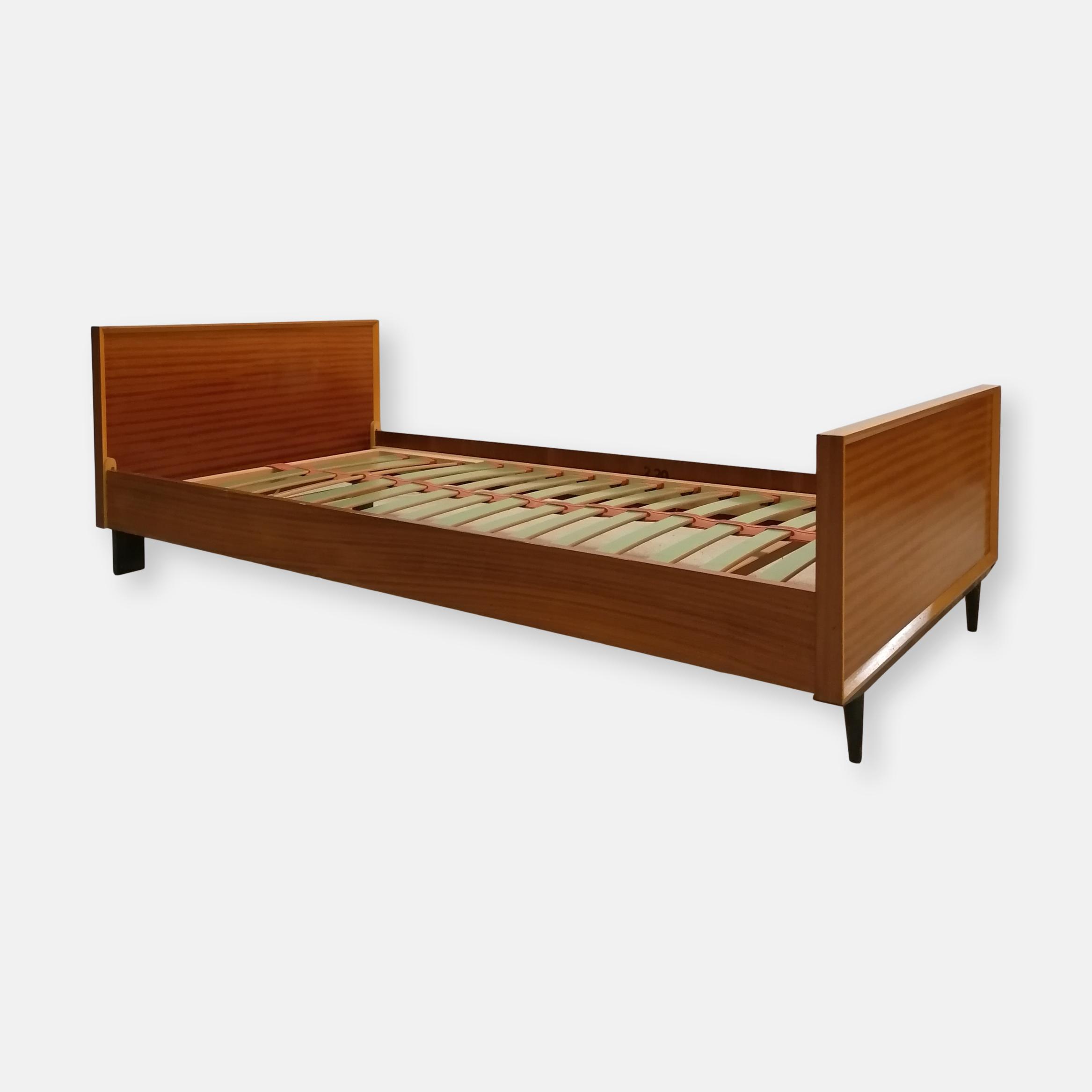 Produit venduLit vintage en bois avec pieds compas sur la partie antérieure. Quelques traces et marques d’usure mais le lit est parfaitement fonctionnel. Stable et solide. Design simple et élégante. Le lit peut être utilisé comme daybed, c’est à dire comme canapé quand il n’est pas utilisé comme lit. Vendu avec son sommier d’origine. Convient pour un matelas de 190 x 90 cm.