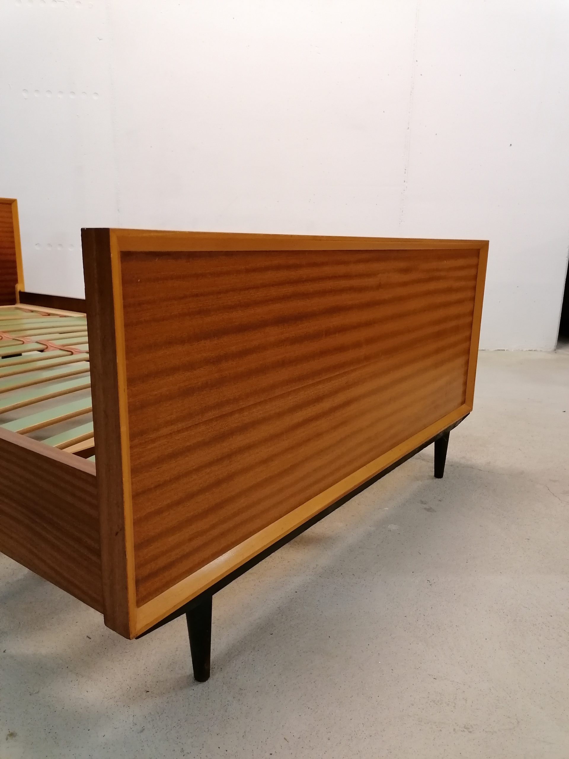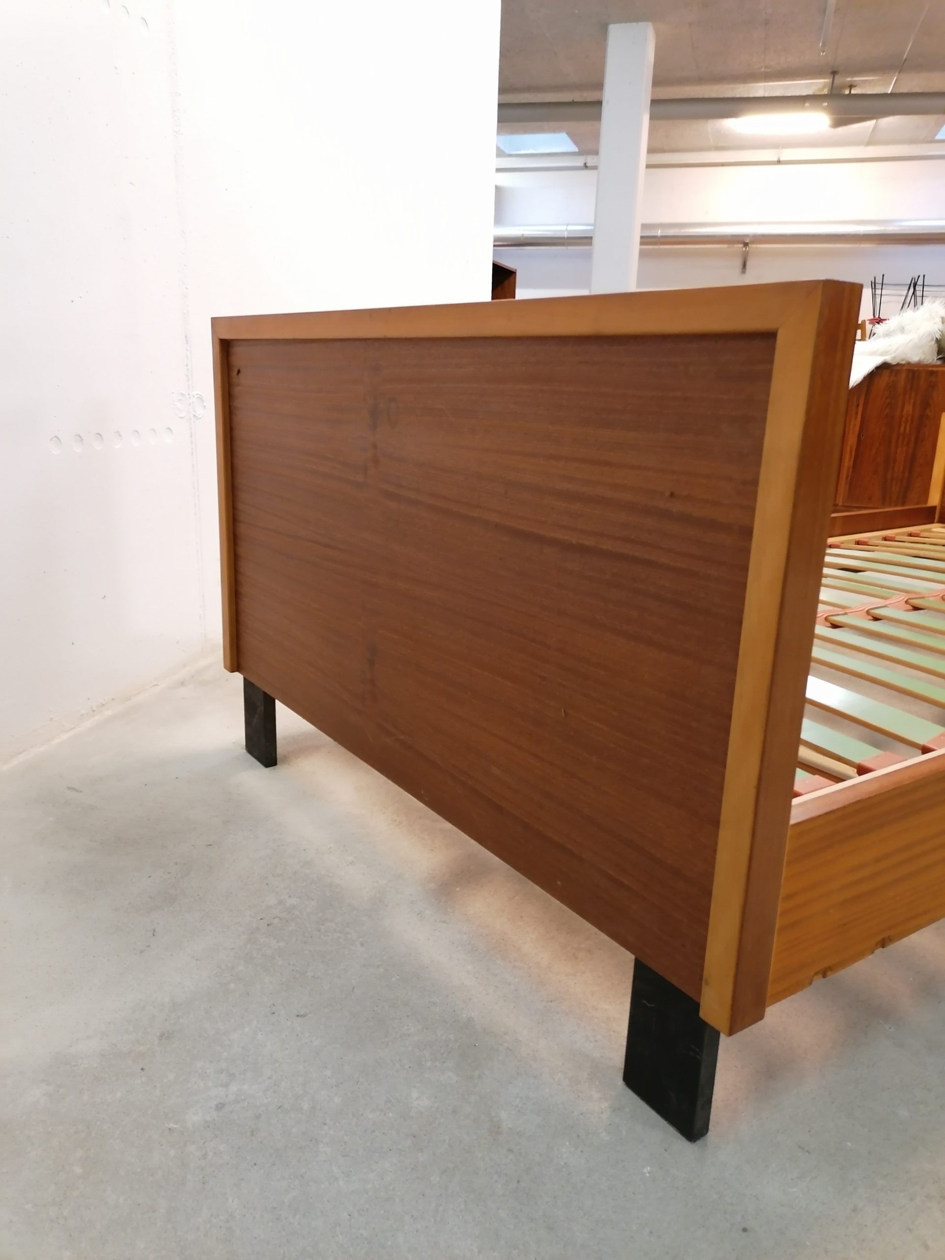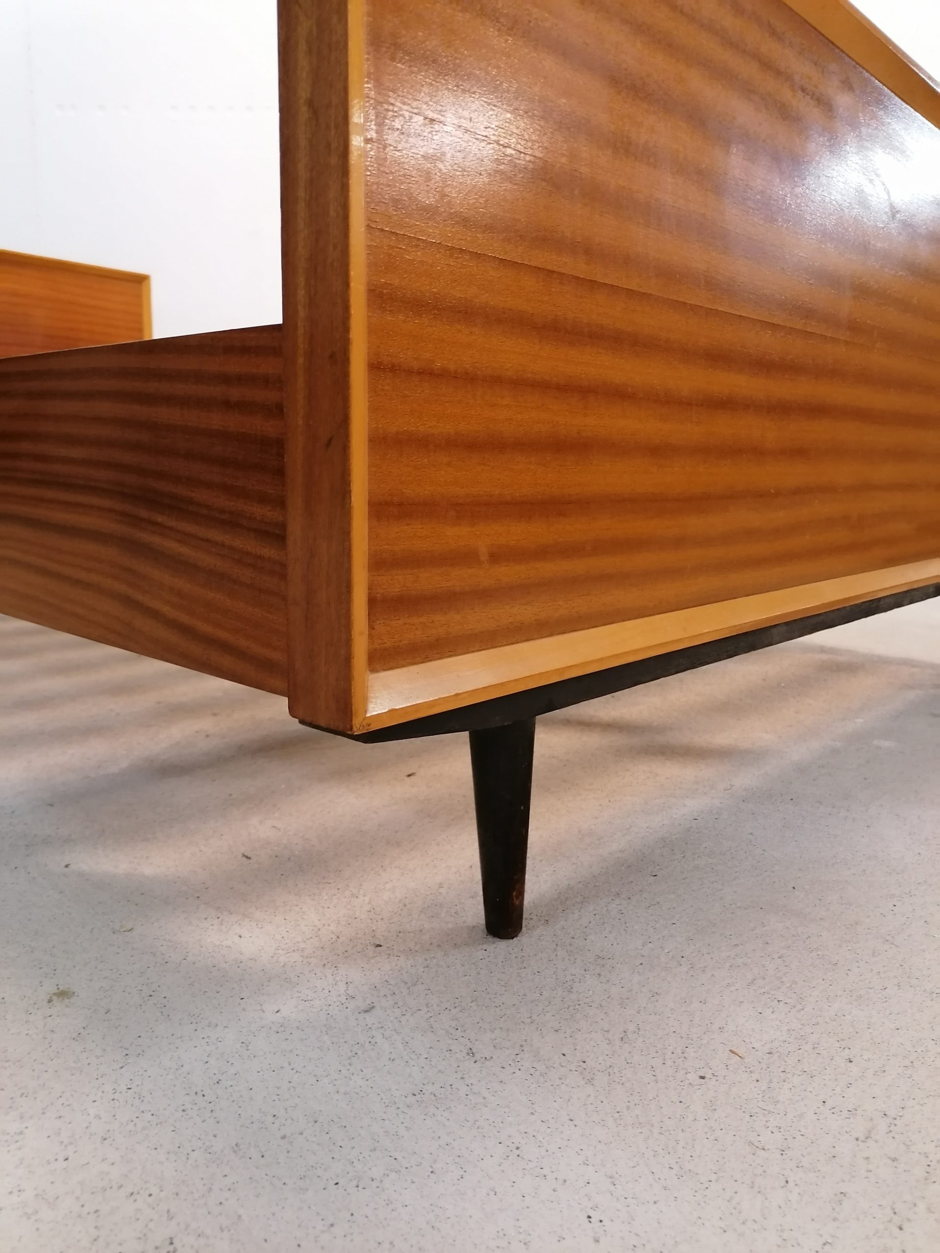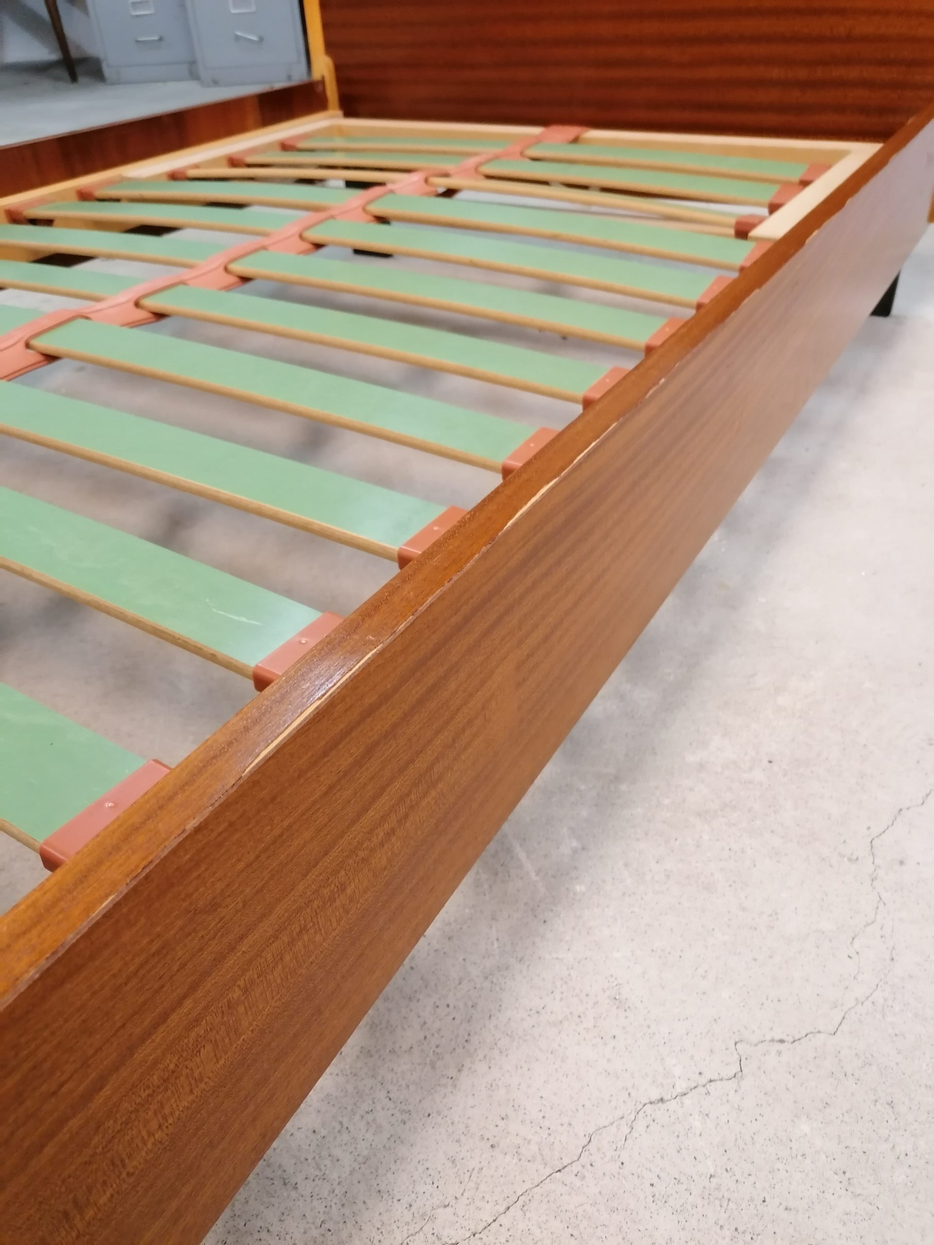 Produit venduLit vintage en bois avec pieds compas sur la partie antérieure. Quelques traces et marques d’usure mais le lit est parfaitement fonctionnel. Stable et solide. Design simple et élégante. Le lit peut être utilisé comme daybed, c’est à dire comme canapé quand il n’est pas utilisé comme lit. Vendu avec son sommier d’origine. Convient pour un matelas de 190 x 90 cm.