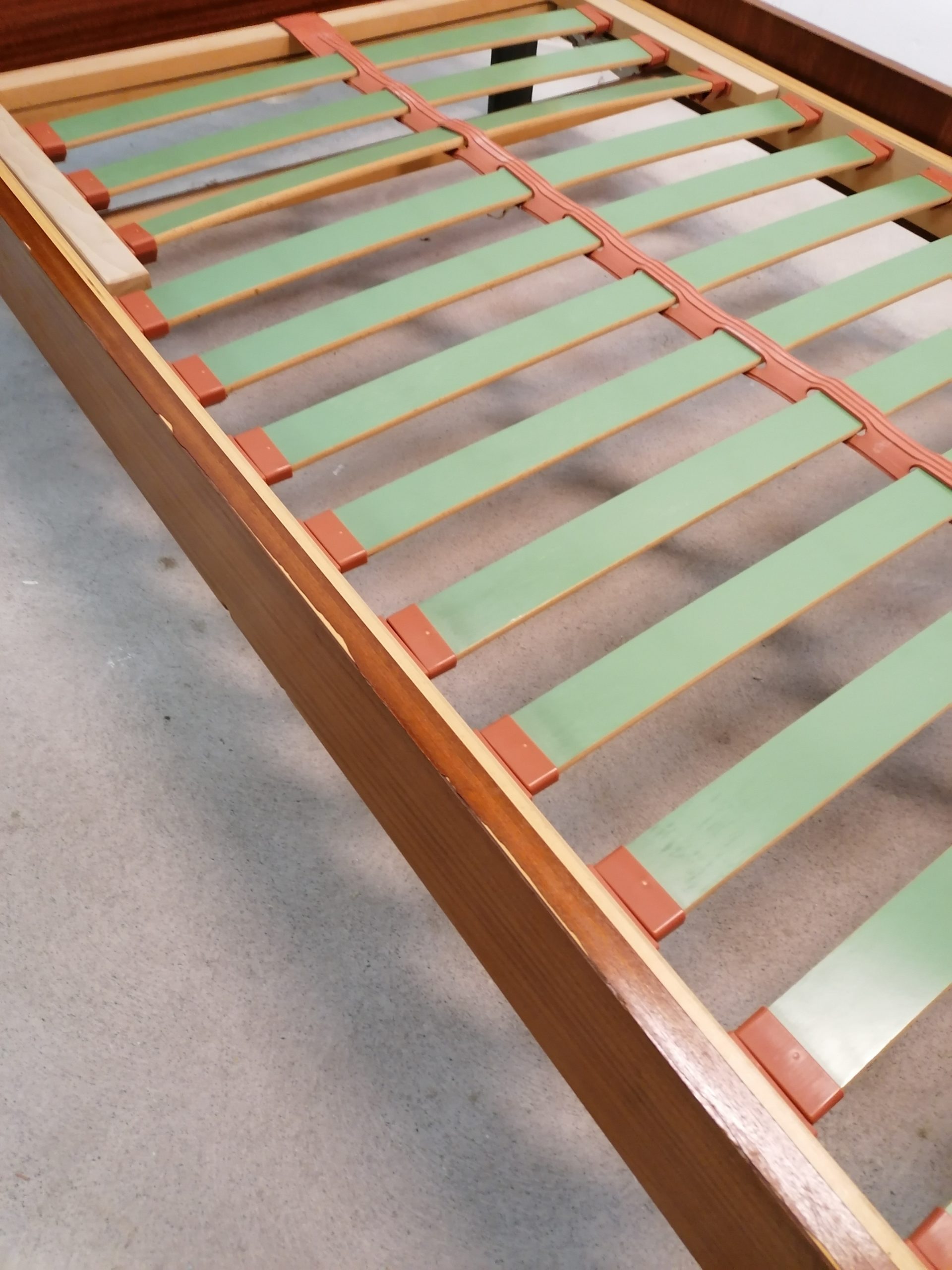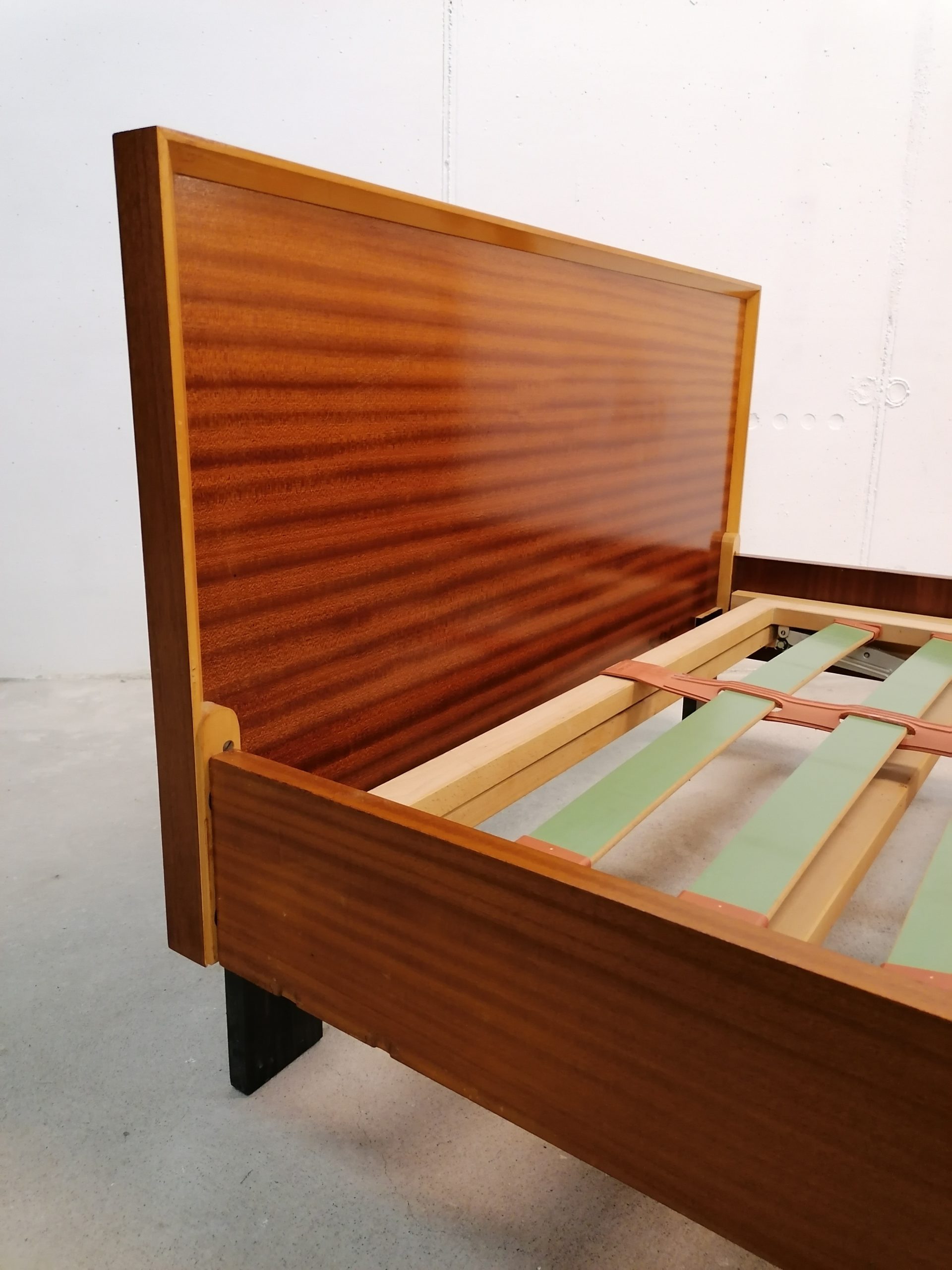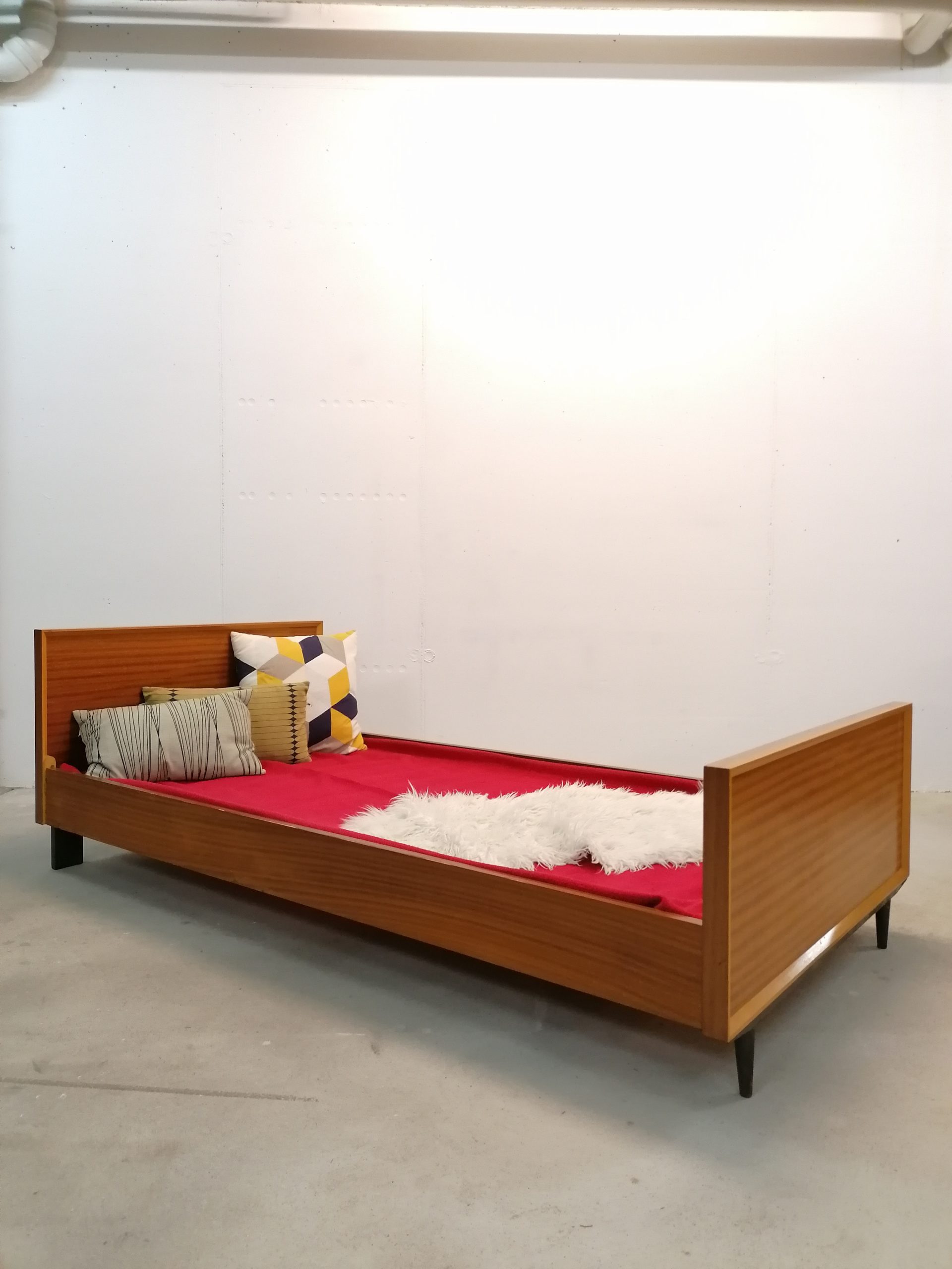 Lit vintage en bois avec pieds compas sur la partie antérieure. Quelques traces et marques d’usure mais le lit est parfaitement fonctionnel. Stable et solide. Design simple et élégante. Le lit peut être utilisé comme daybed, c’est à dire comme canapé quand il n’est pas utilisé comme lit. Vendu avec son sommier d’origine. Convient pour un matelas de 190 x 90 cm.