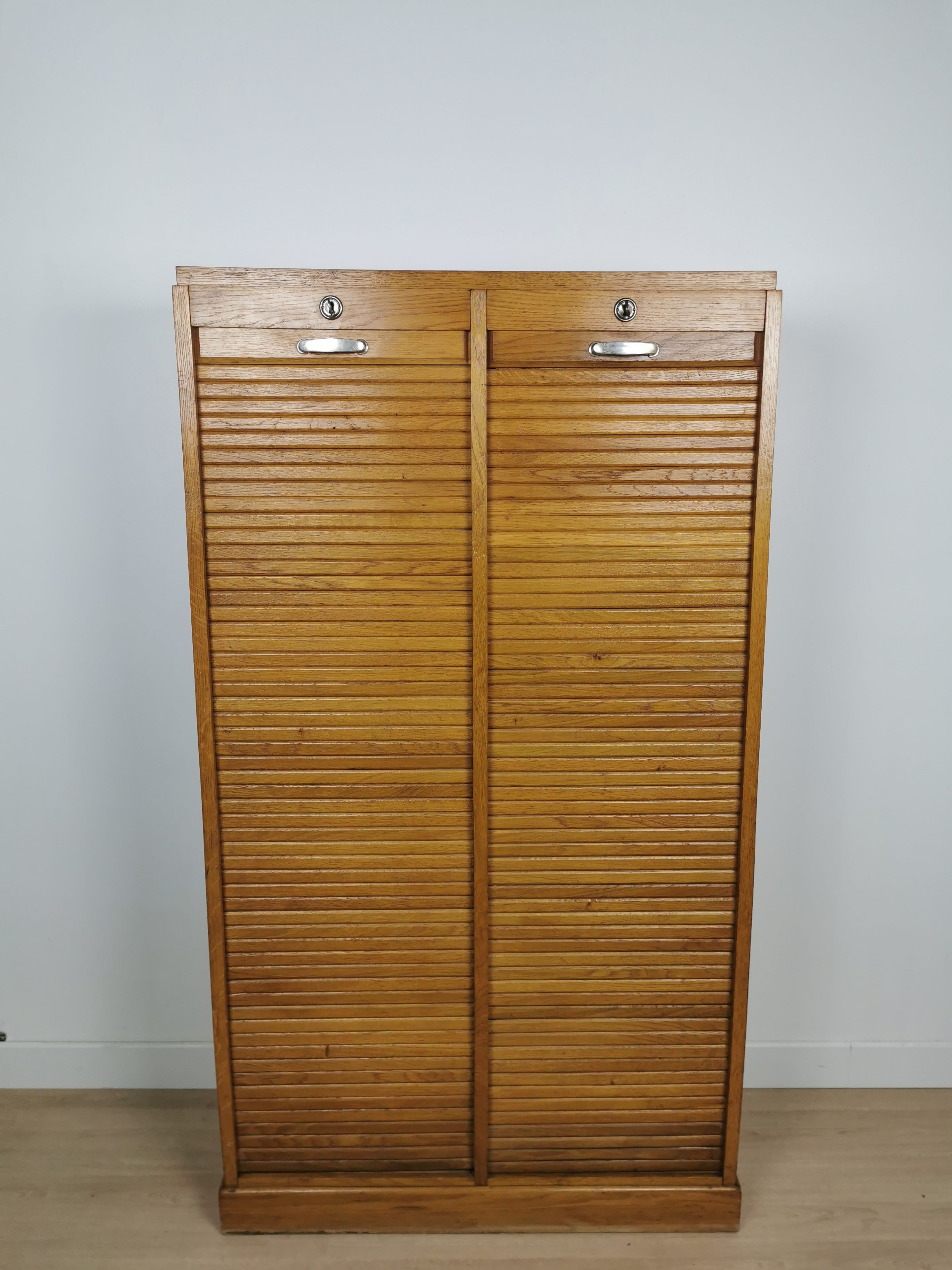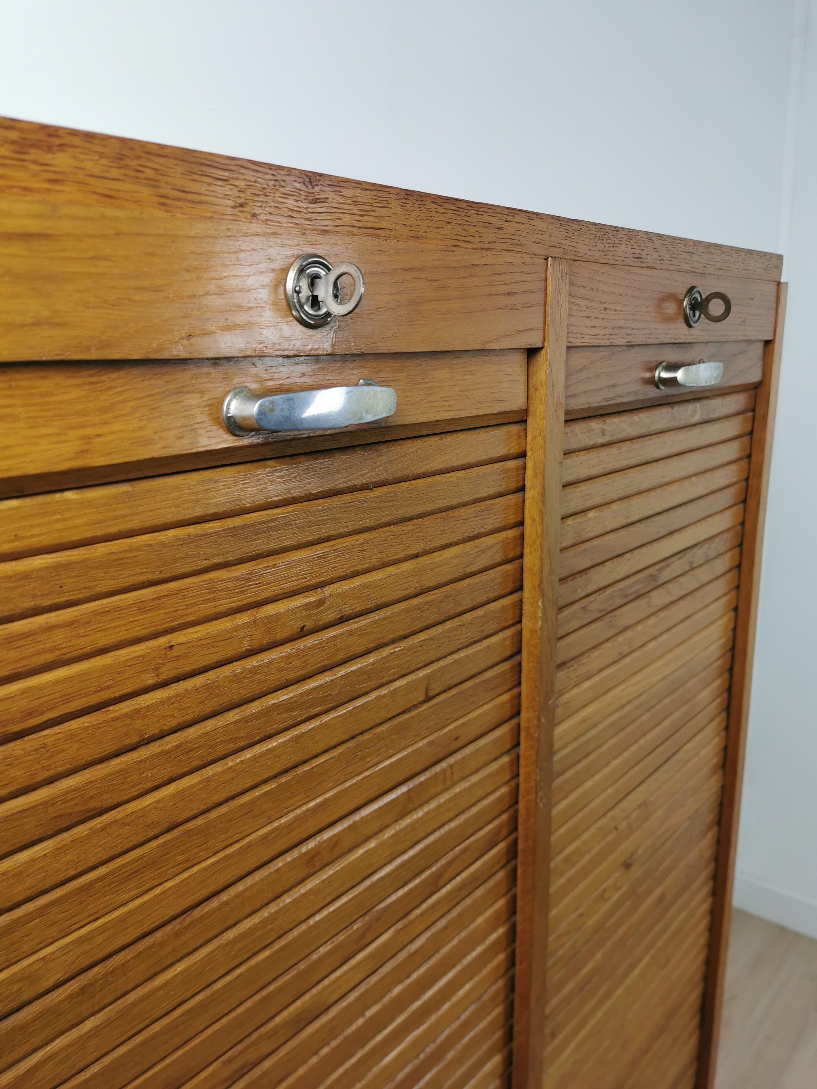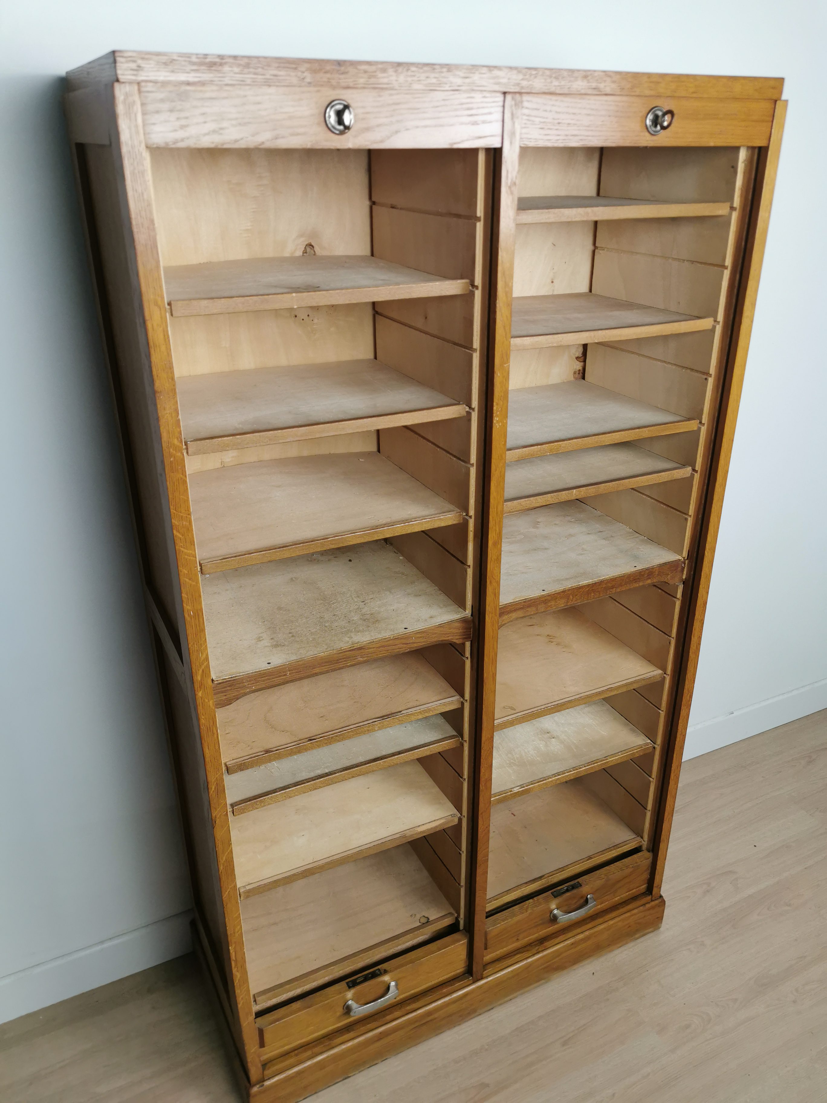Produit venduAncien meuble a rideau en bois des années 60. Poignées en métal et plusieurs étagères à l’intérieur qui peuvent être placées à la hauteur souhaitée.