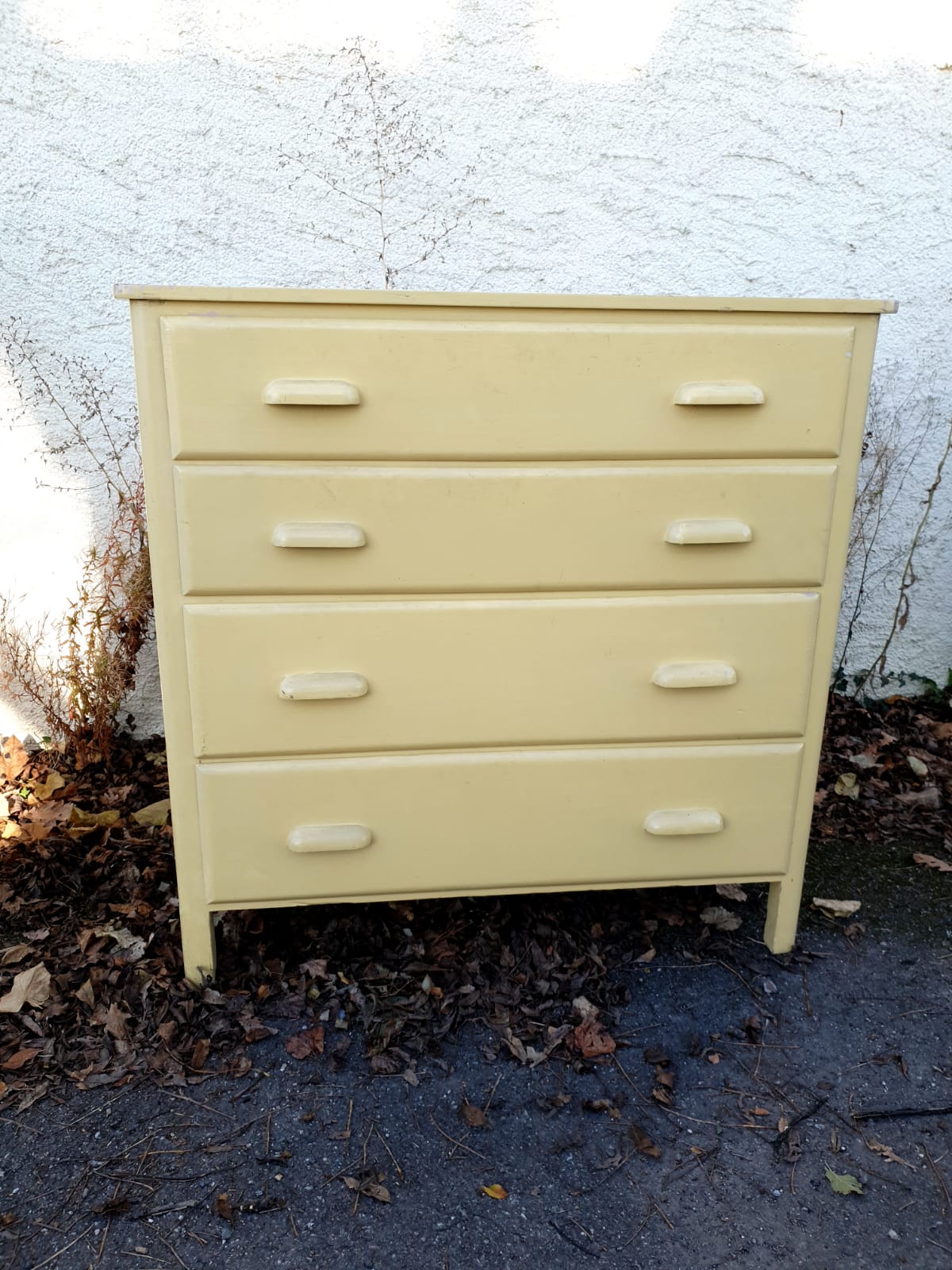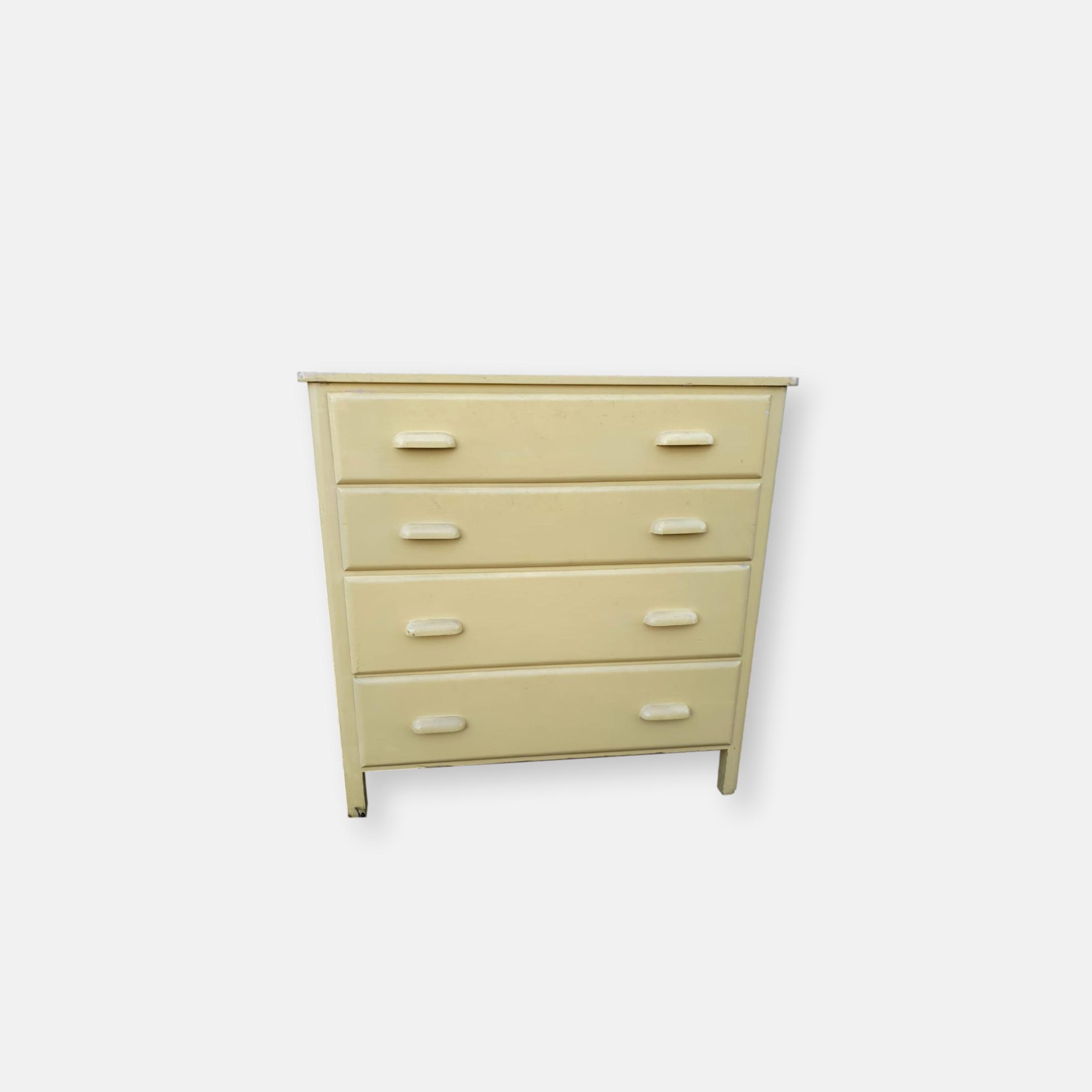Produit venduAncienne commode en bois des années 40 de couleur beige tirant sur le jaune avec 4 tiroirs.