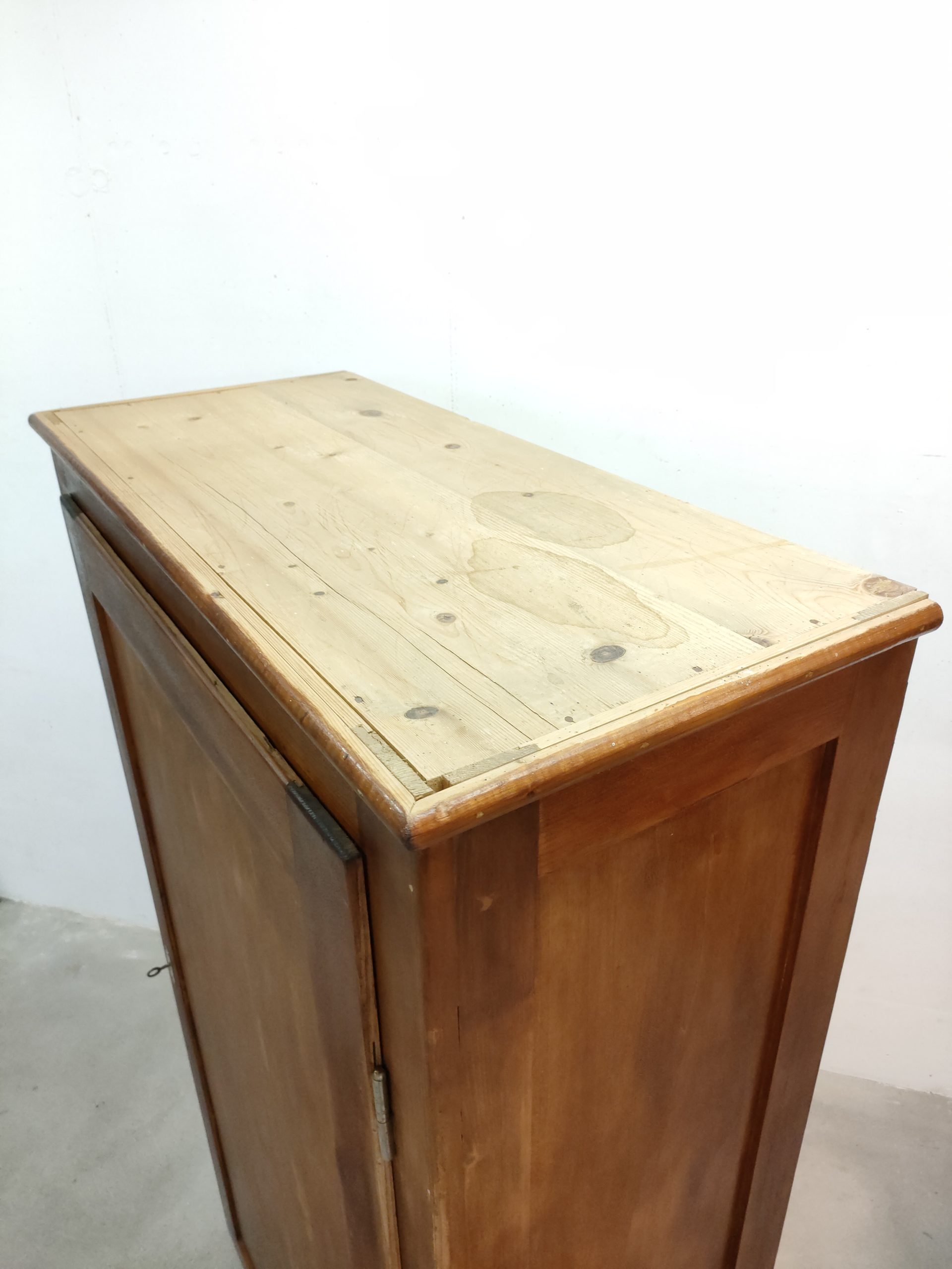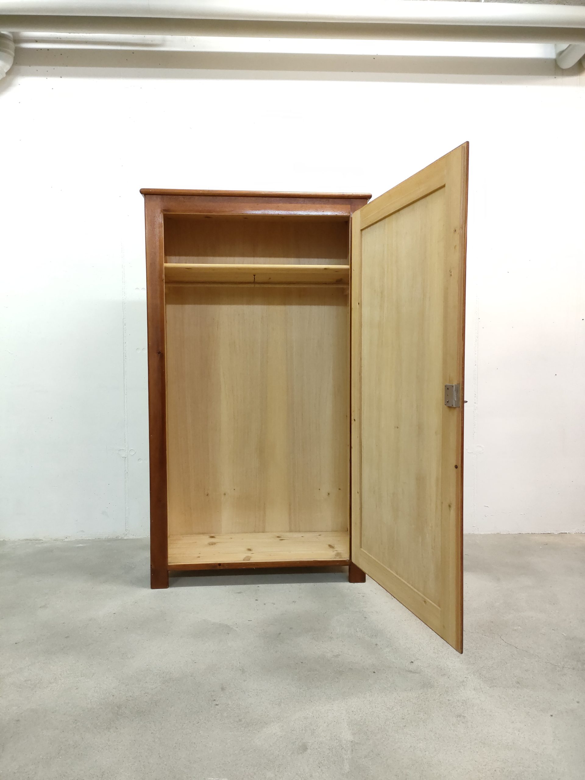 Produit venduArmoire en bois avec espace penderie et étagère à l’intérieur. Quelques traces sur le bois et des décolorations à certains endroits (voir photos). L’armoire et stable et solide et parfaitement fonctionnelle.