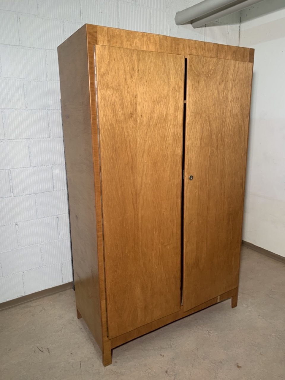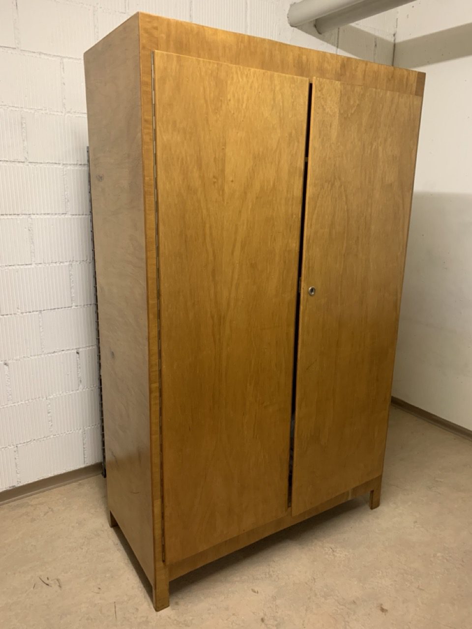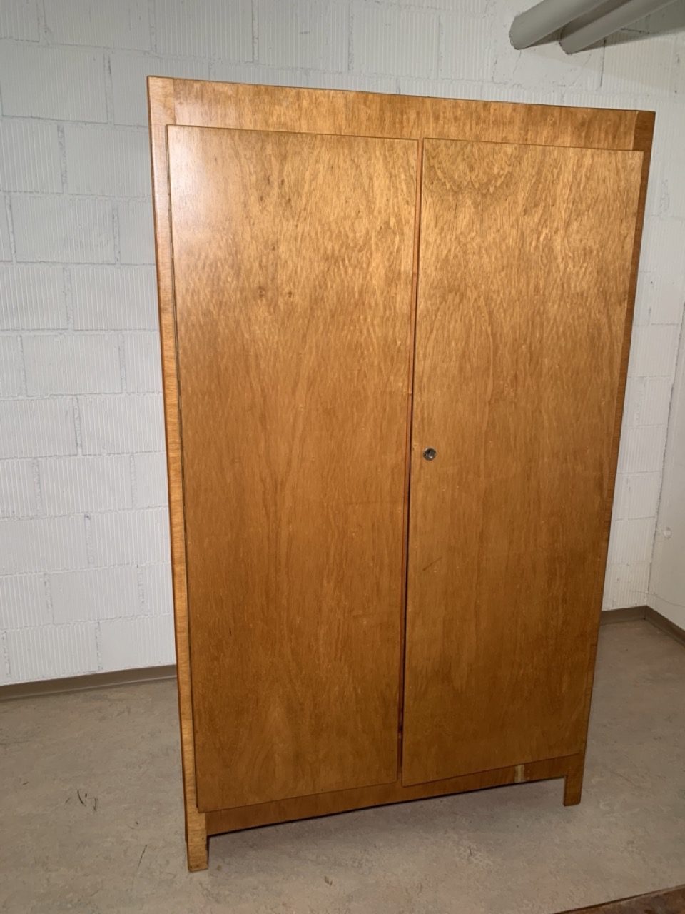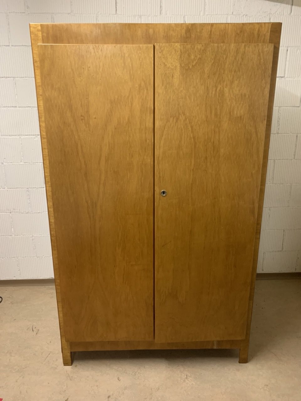 Großer Holzschrank mit drei Regalen und einer Garderobe.