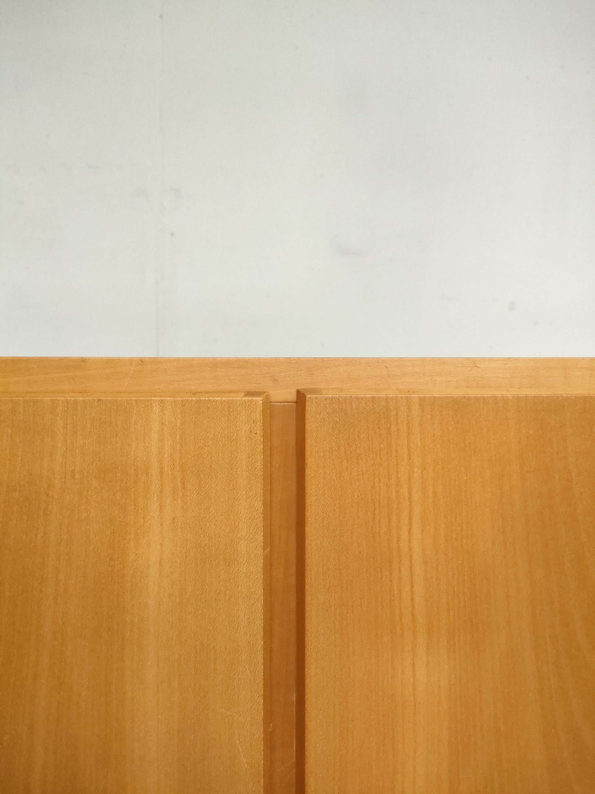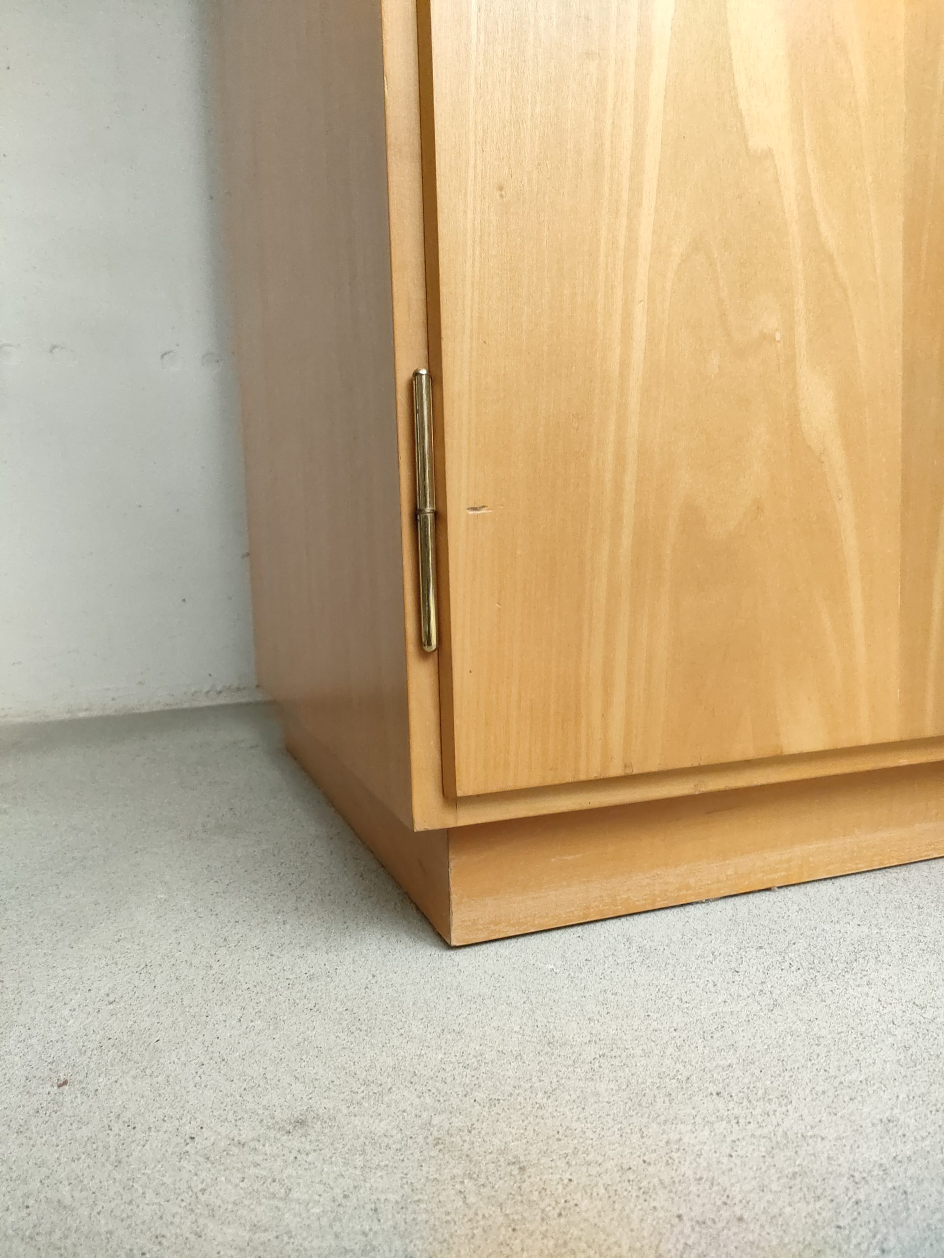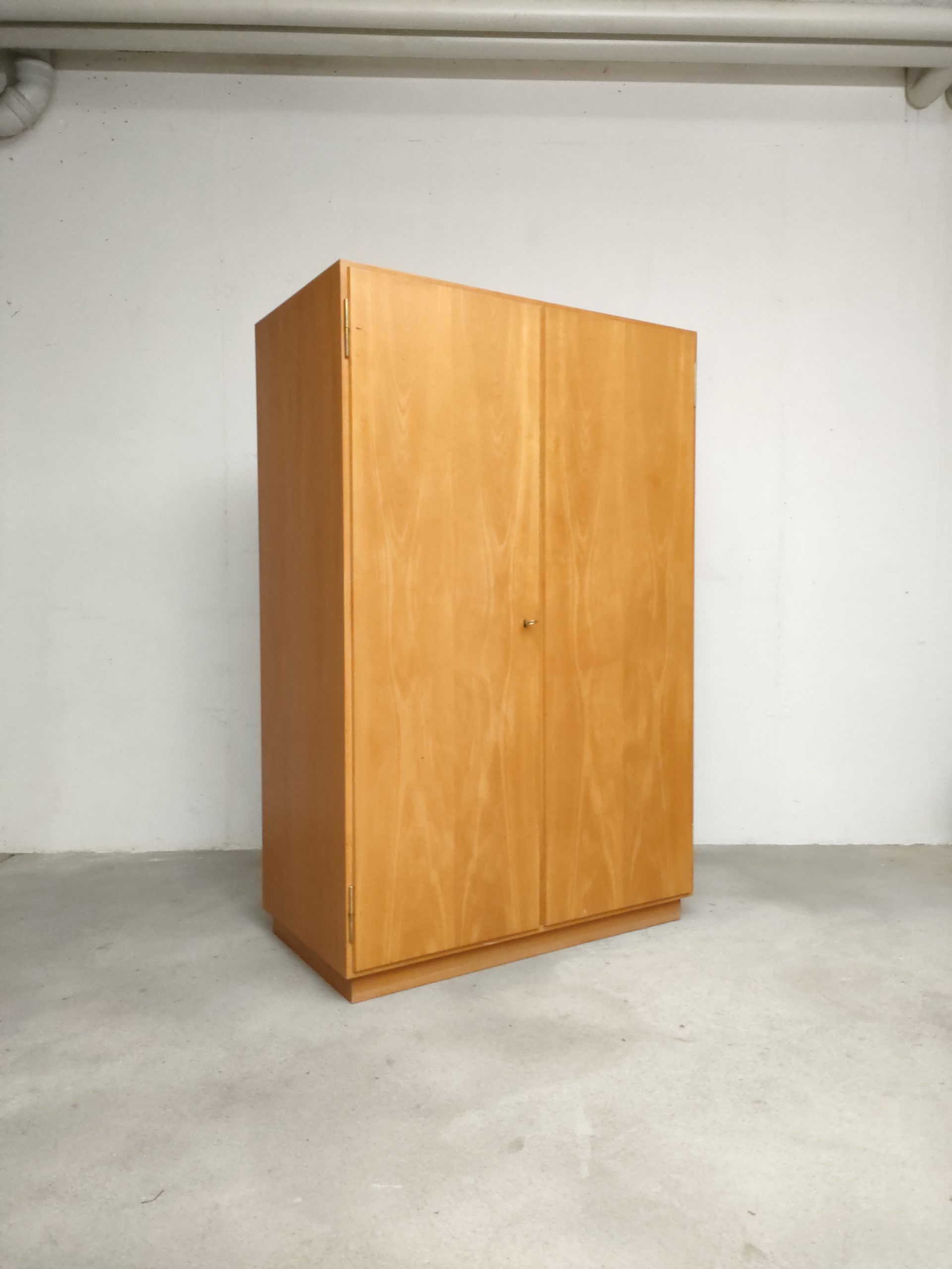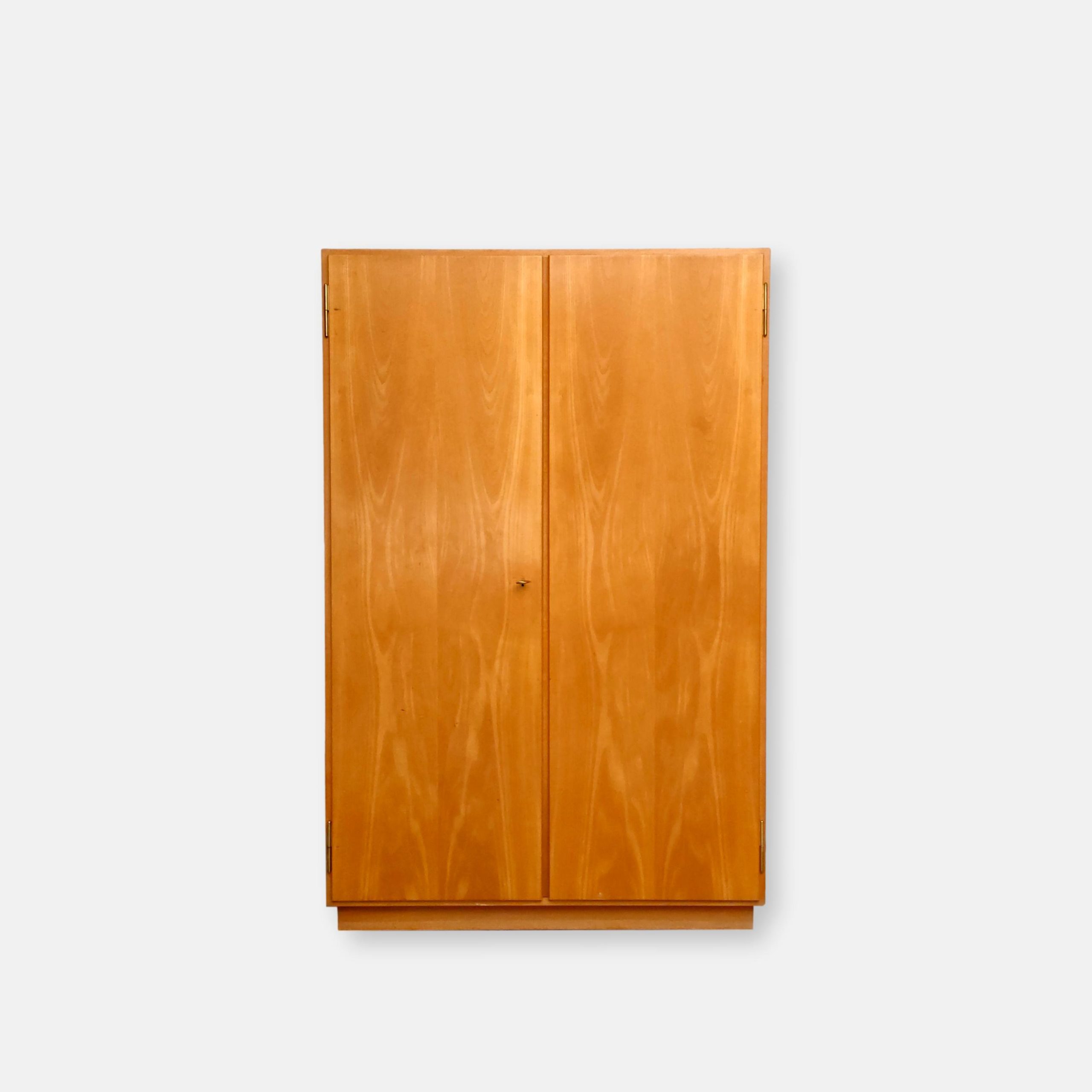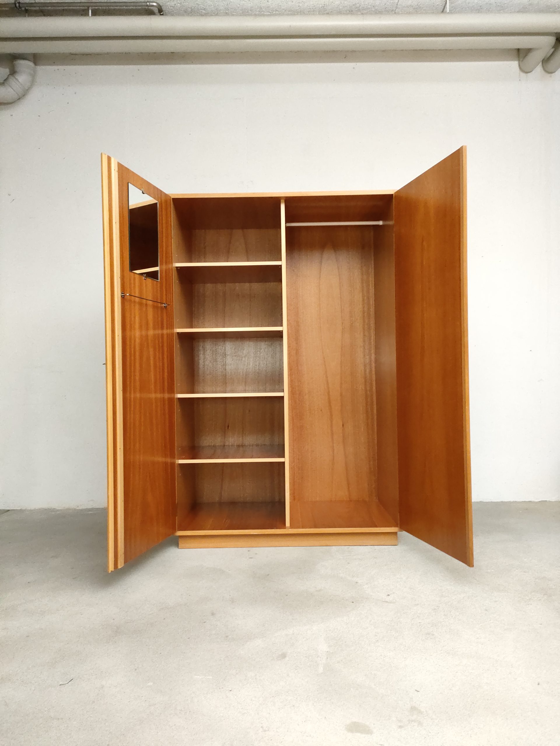 Armoire vintage en bois avec penderie d’un côté et 4 étagères de l’autre. Elle est dotée d’un miroir et d’un petite barre extensible qui permets d’accrocher quelques vêtements à l’extérieur de l’armoire. Des légères traces d’usure sur le bois sont présentes à certains endroits (voir photos). L’armoire est stable et solide et élégant. Elle ne peut pas être complètement démontée pour le transport, uniquement les portes peuvent être enlevées.