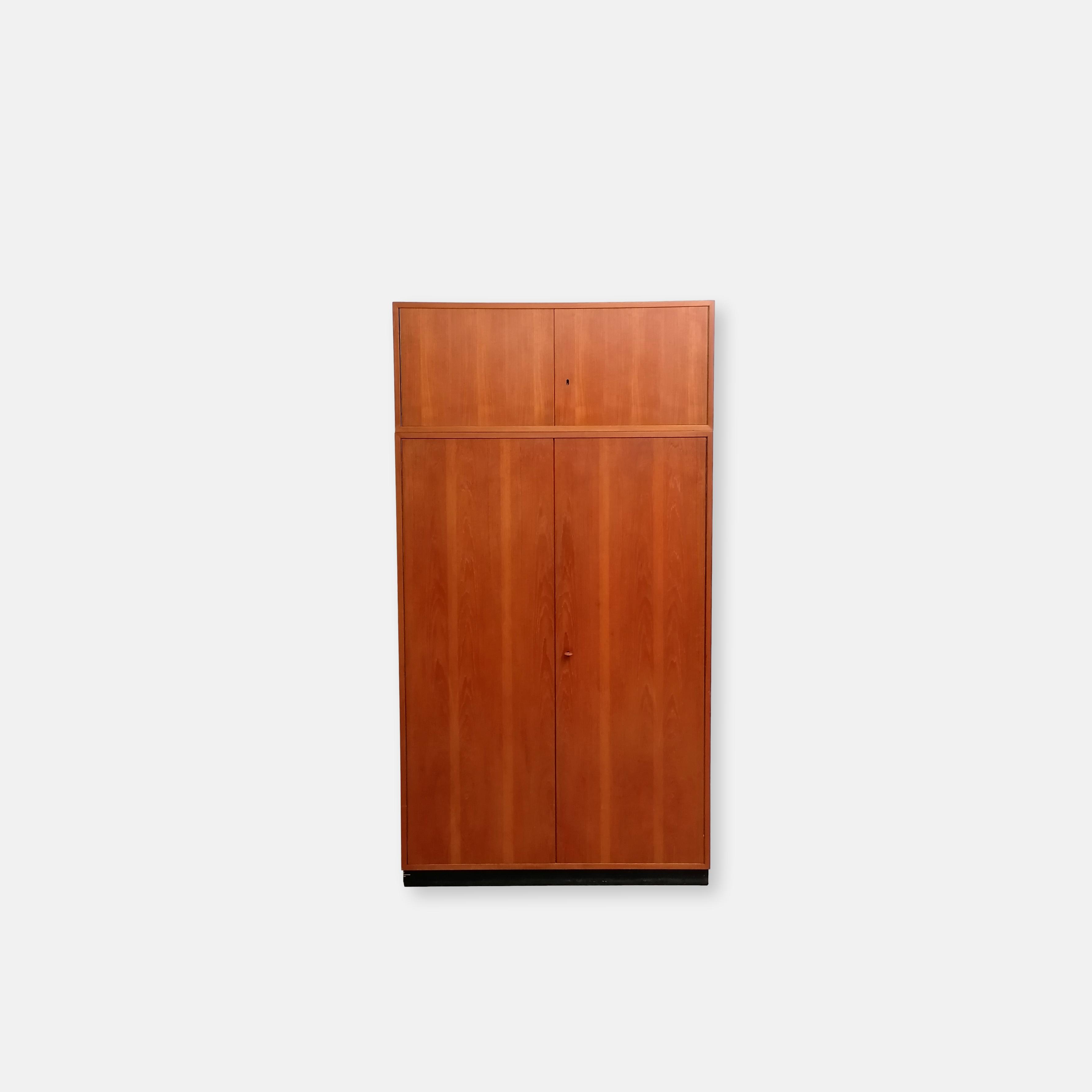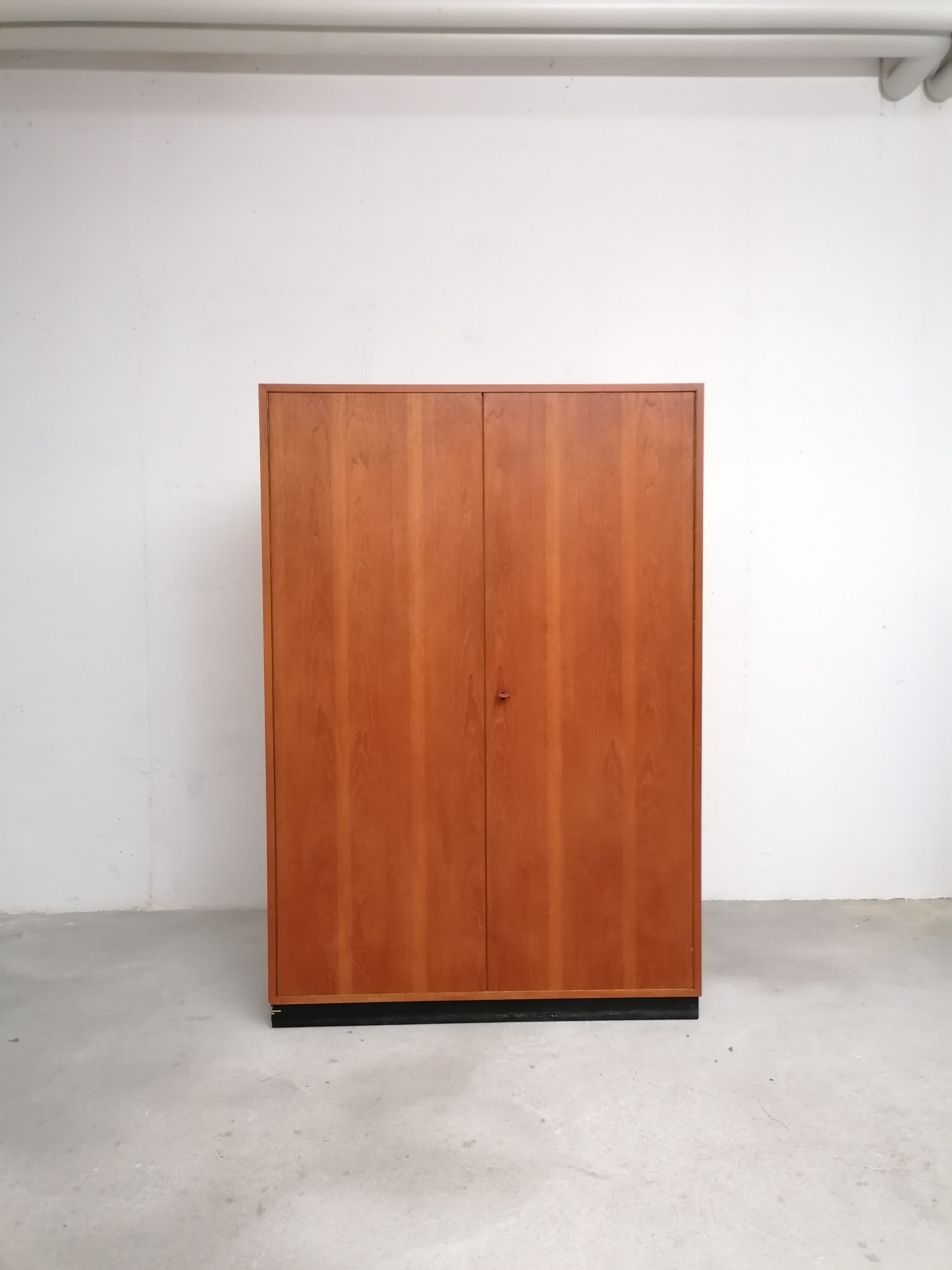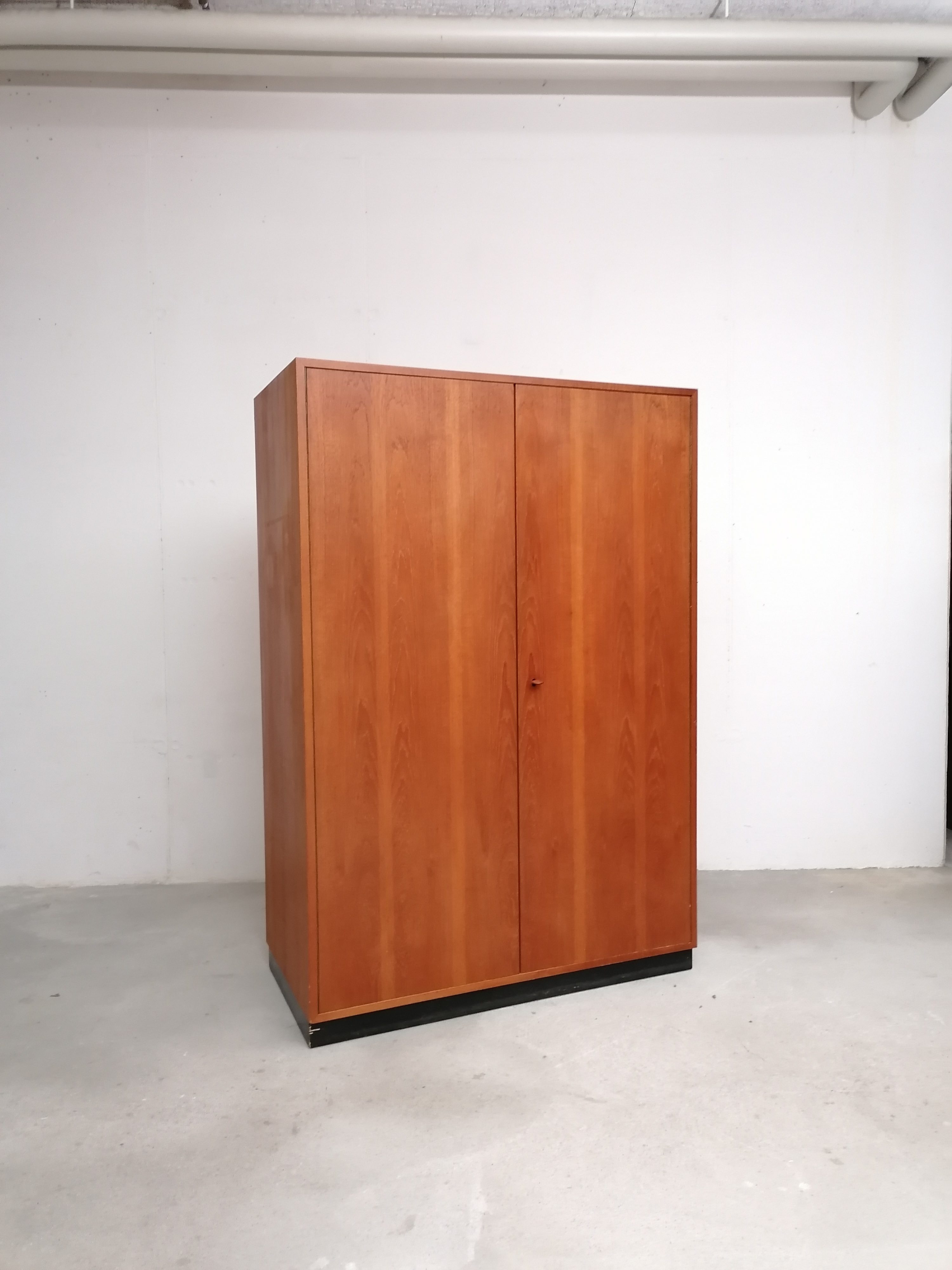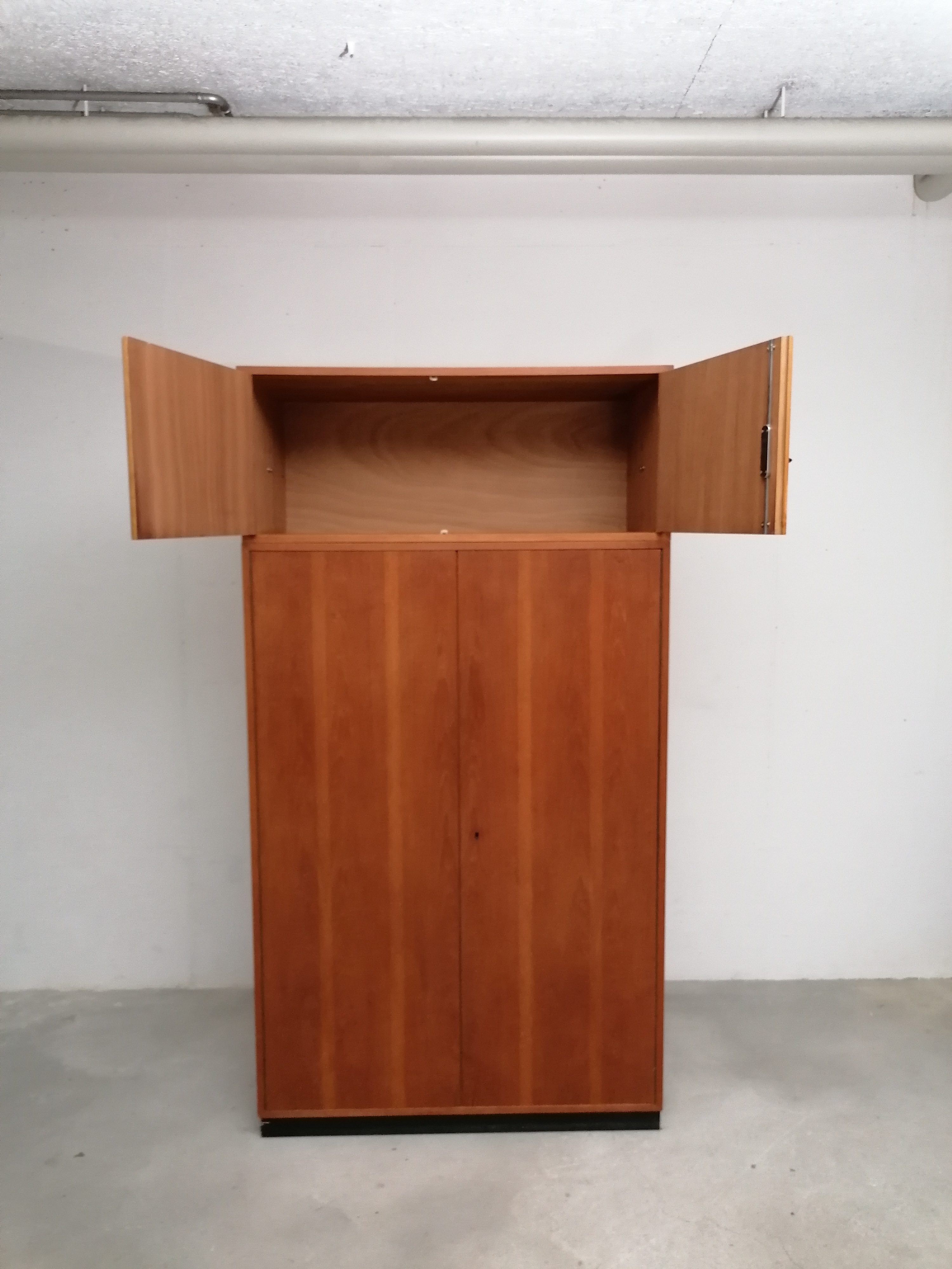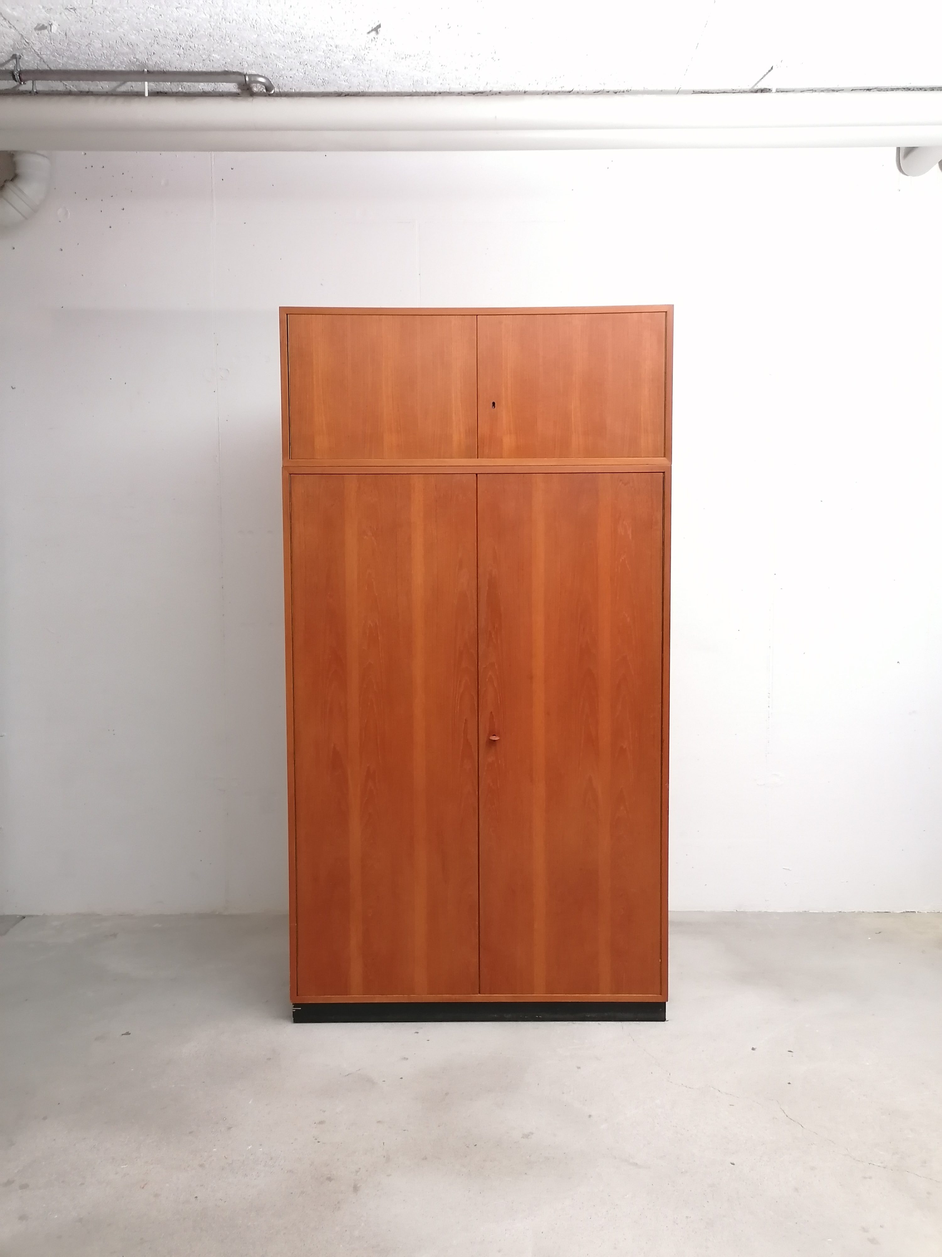 Produit venduArmoire modulable vintage composée de deux parties séparables. Dans la partie supérieure un caisson de rangement et dans la partie inférieure un espace penderie. Une seule clé ouvre les deux modules. Les portes de la penderie se ferment avec une légère résistance mais elle se ferment correctement. Quelques traces d’usure (voir photos) mais stable et solide. Très élégante avec ses lignes minimalistes et son socle de couleur noire. Le caisson supérieure peut être aussi utilisé séparément de la penderie comme meuble de rangement ou meuble tv.