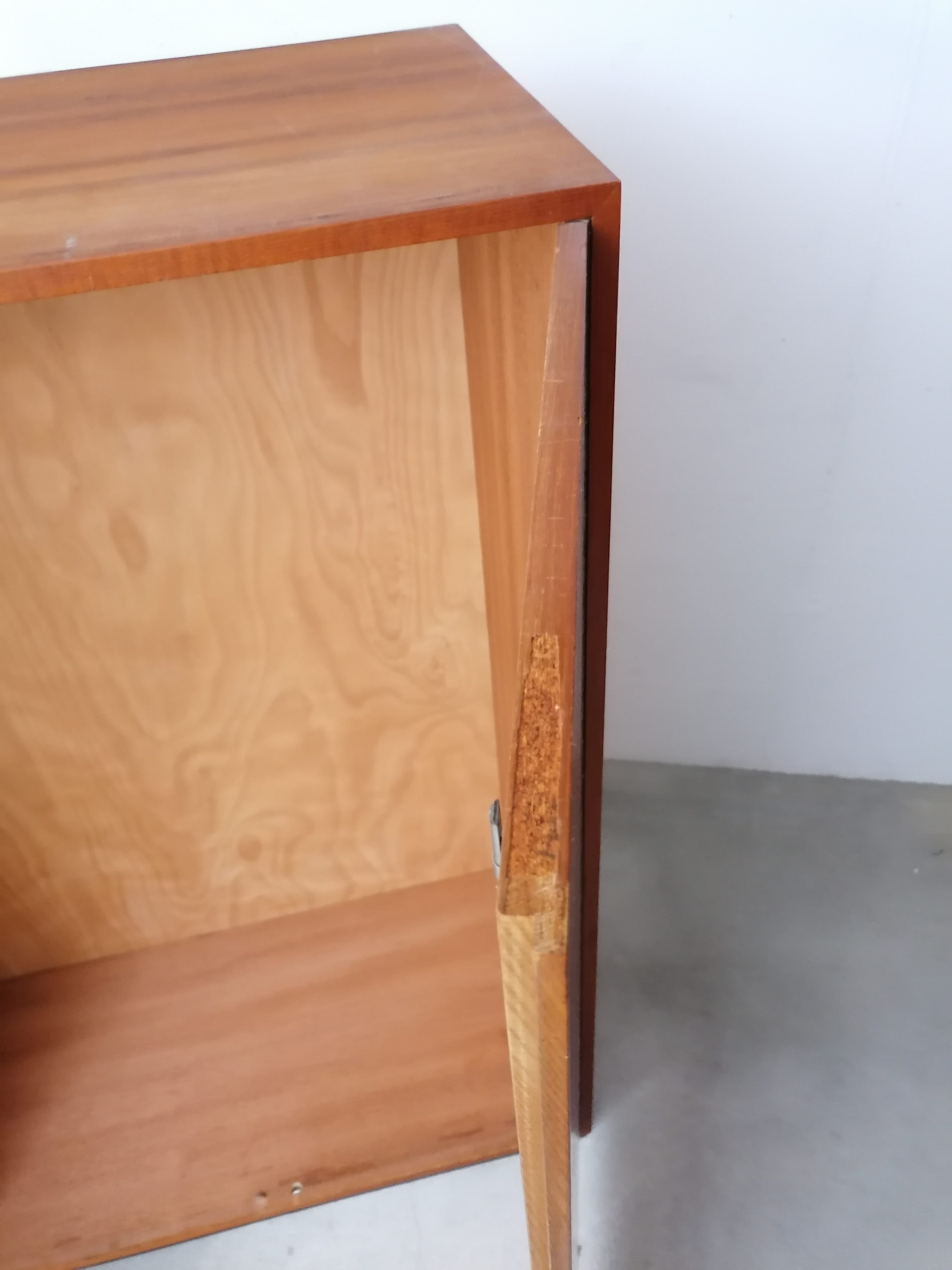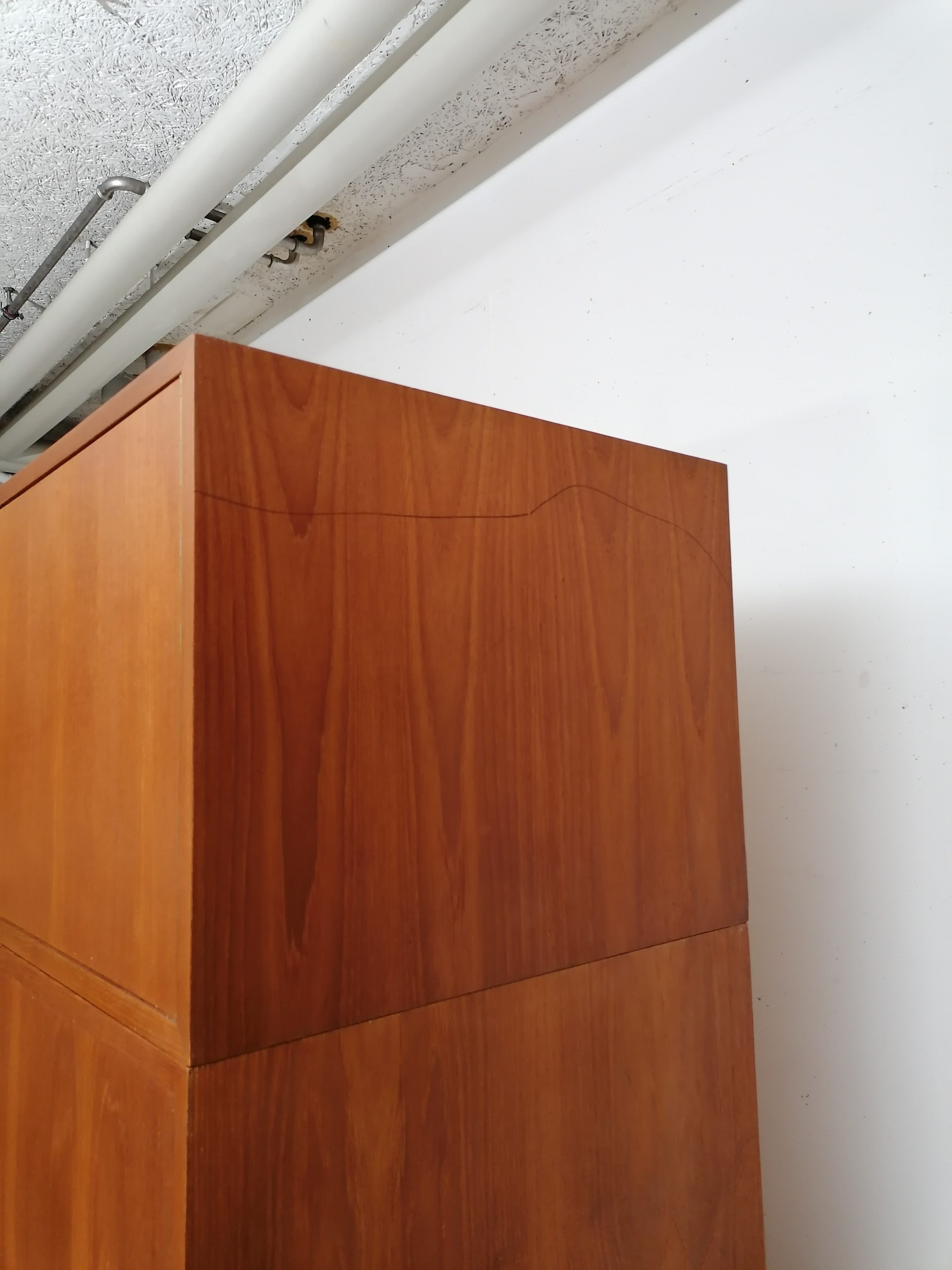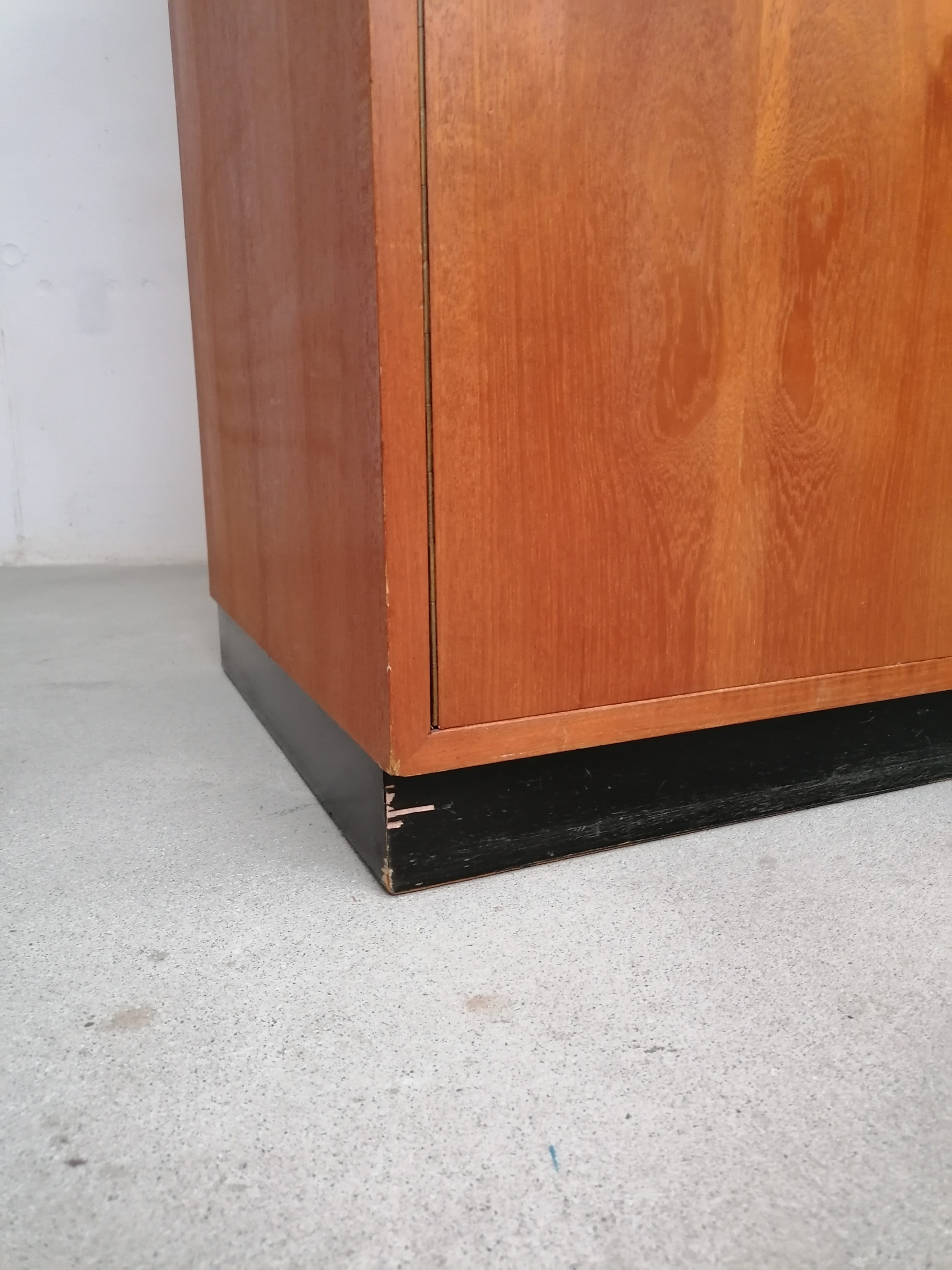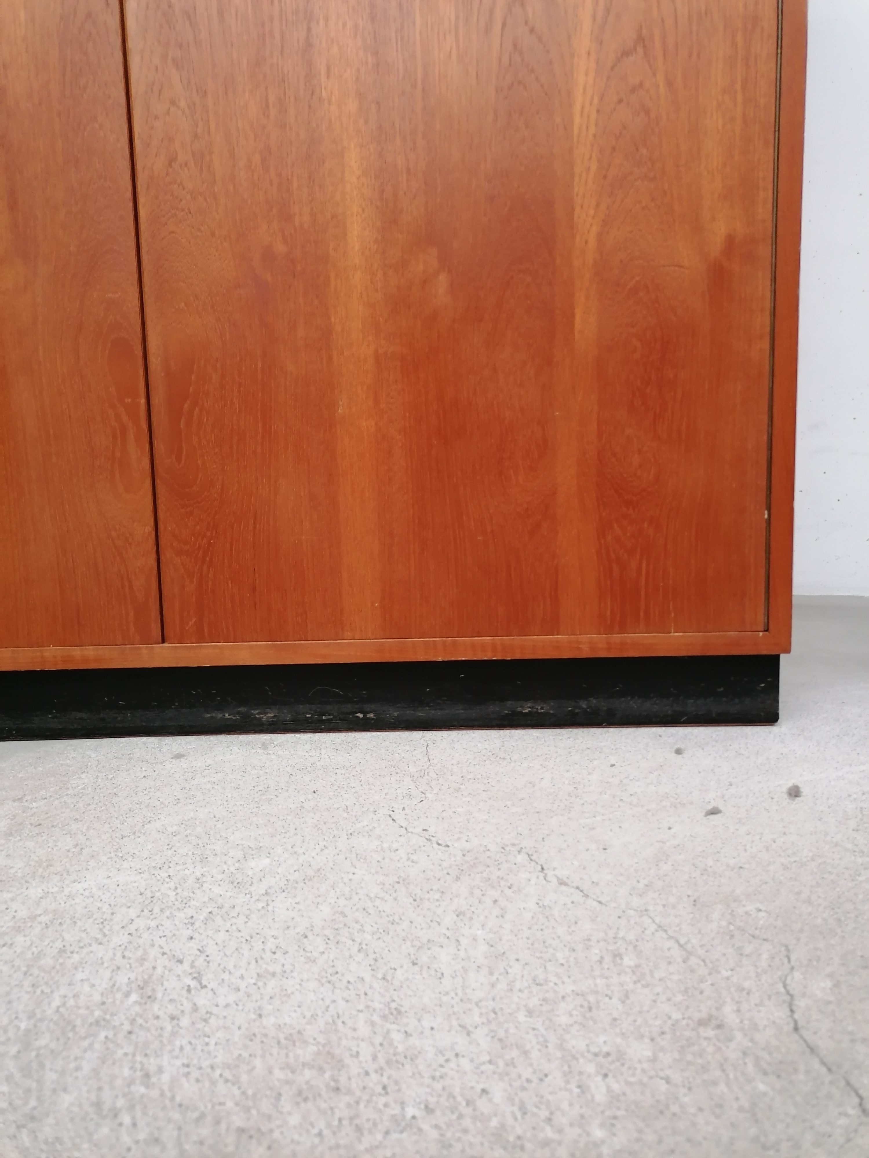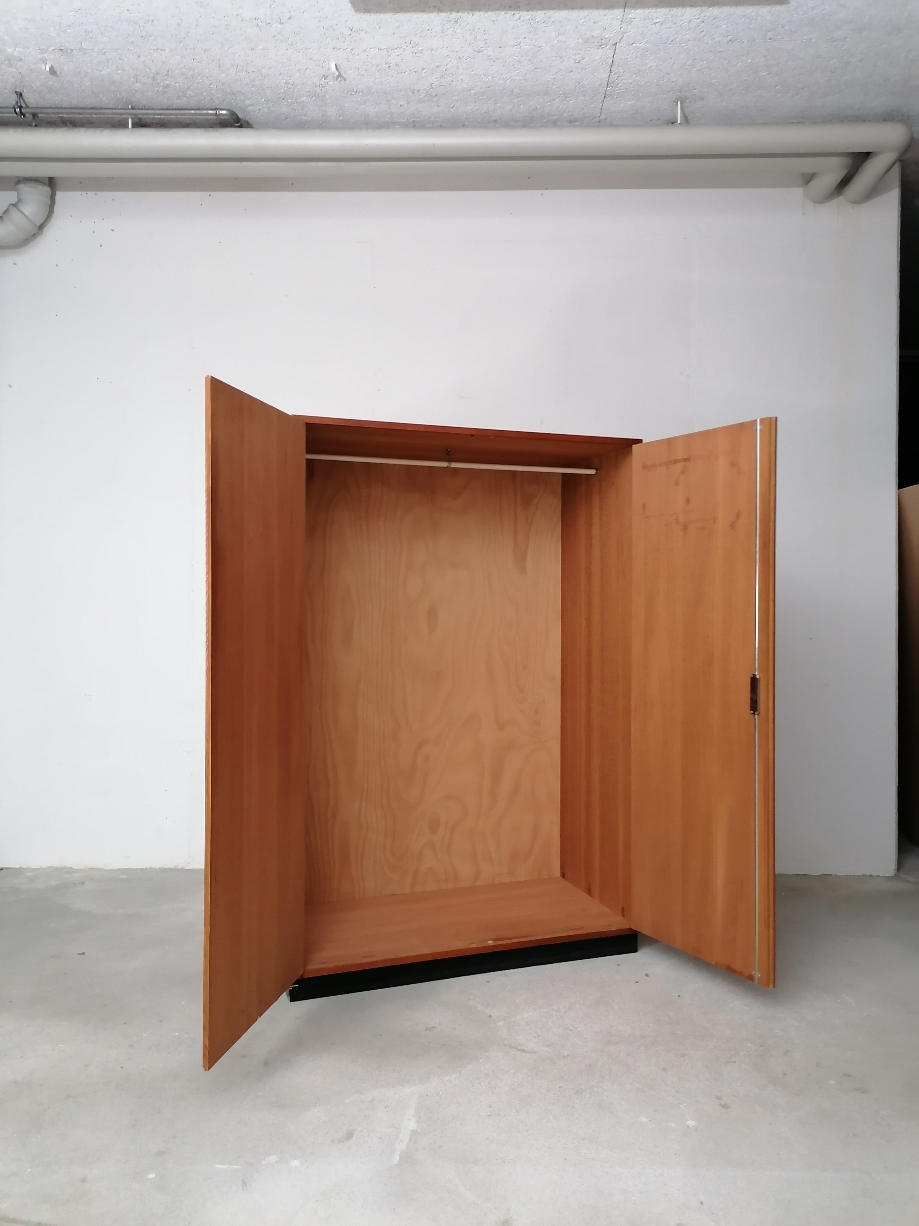 Produit venduArmoire modulable vintage composée de deux parties séparables. Dans la partie supérieure un caisson de rangement et dans la partie inférieure un espace penderie. Une seule clé ouvre les deux modules. Les portes de la penderie se ferment avec une légère résistance mais elle se ferment correctement. Quelques traces d’usure (voir photos) mais stable et solide. Très élégante avec ses lignes minimalistes et son socle de couleur noire. Le caisson supérieure peut être aussi utilisé séparément de la penderie comme meuble de rangement ou meuble tv.
