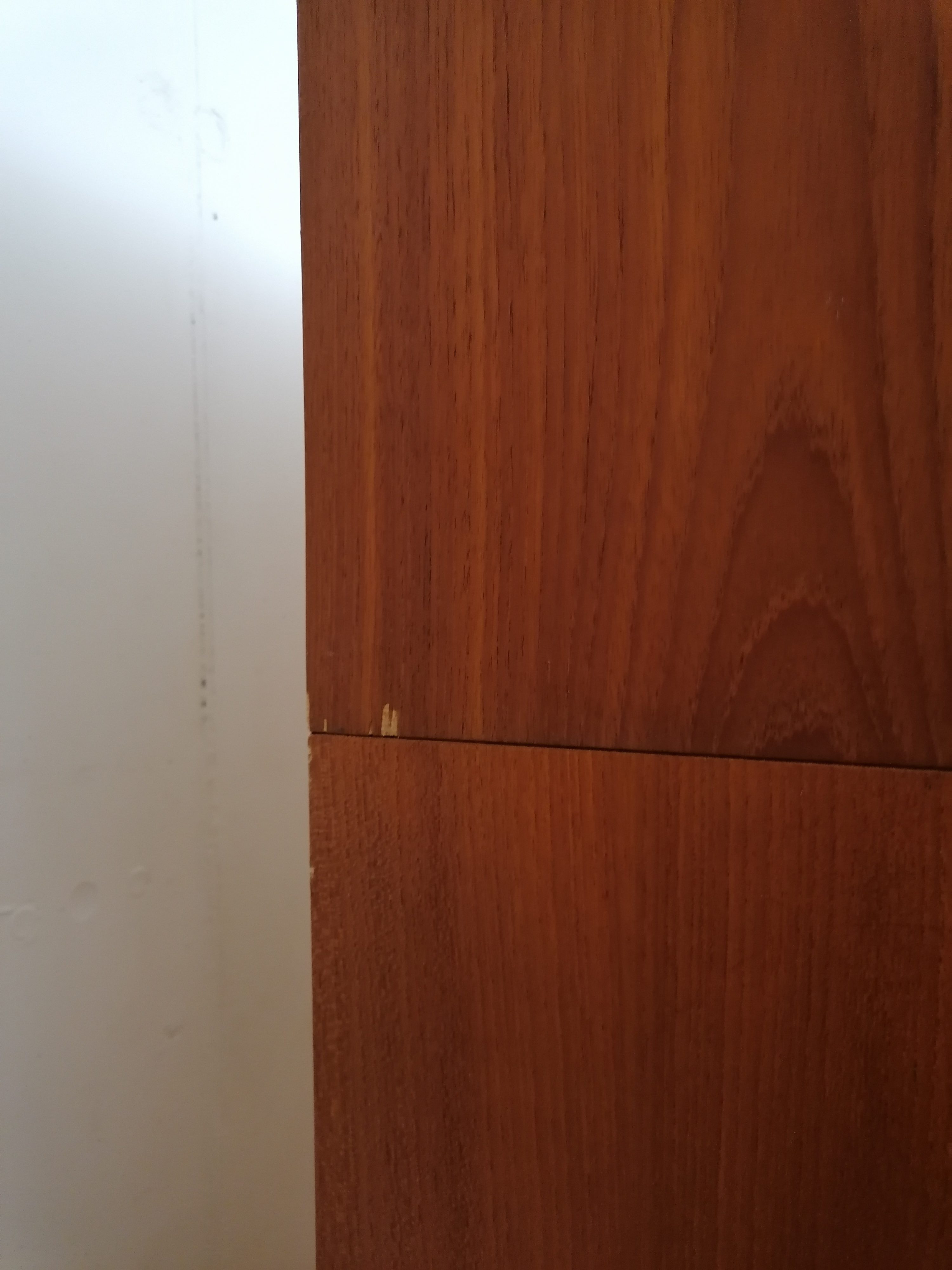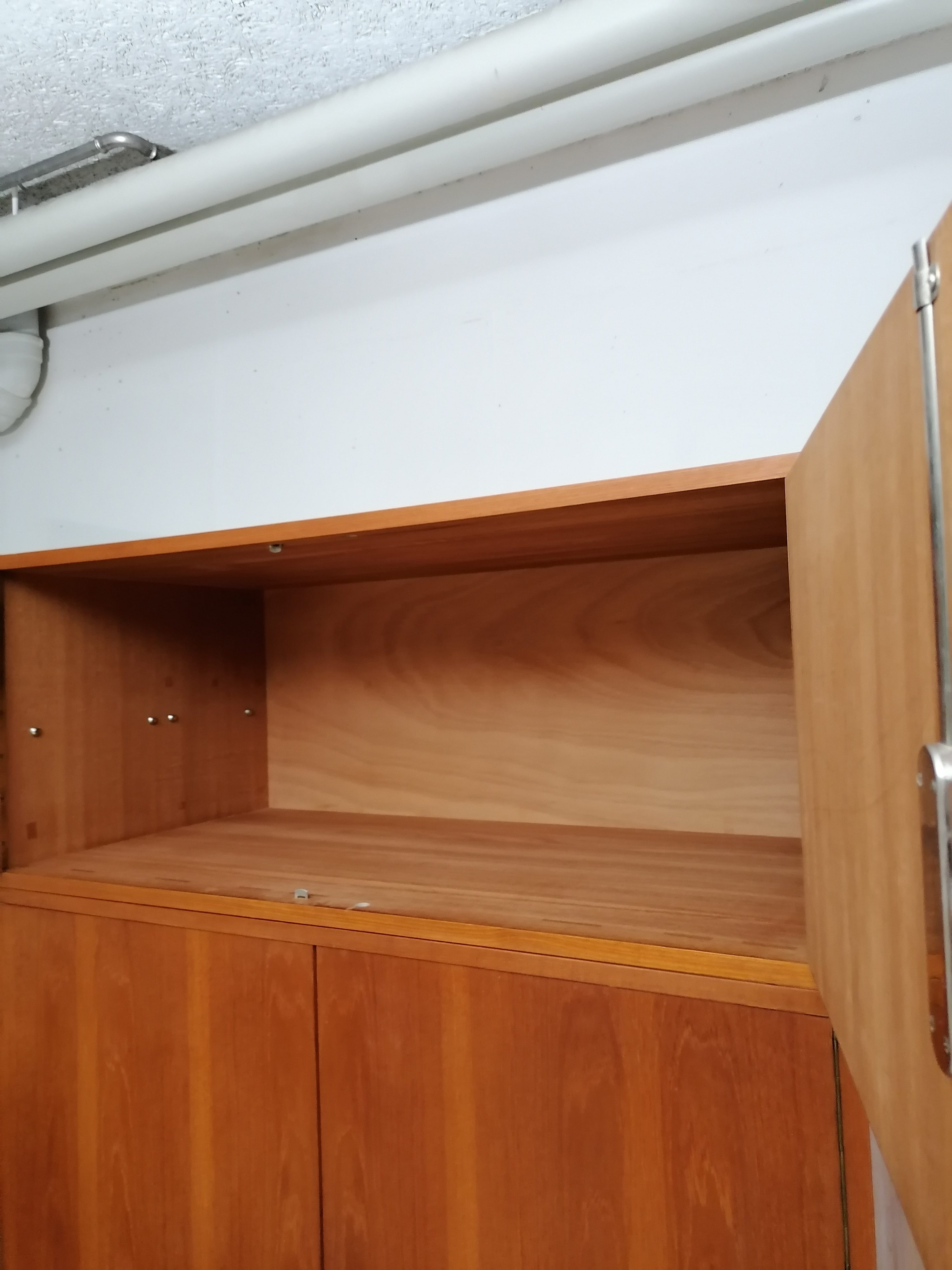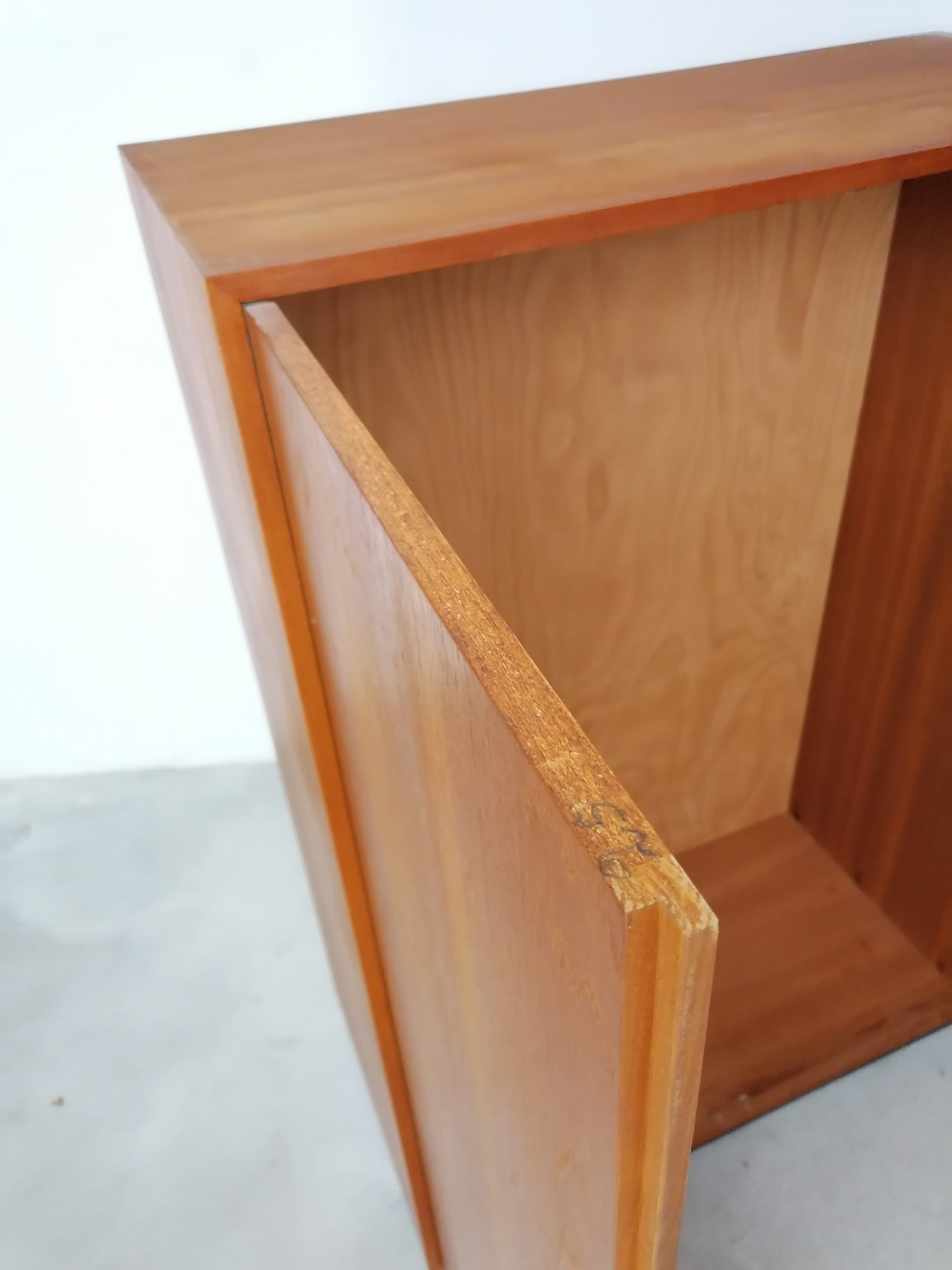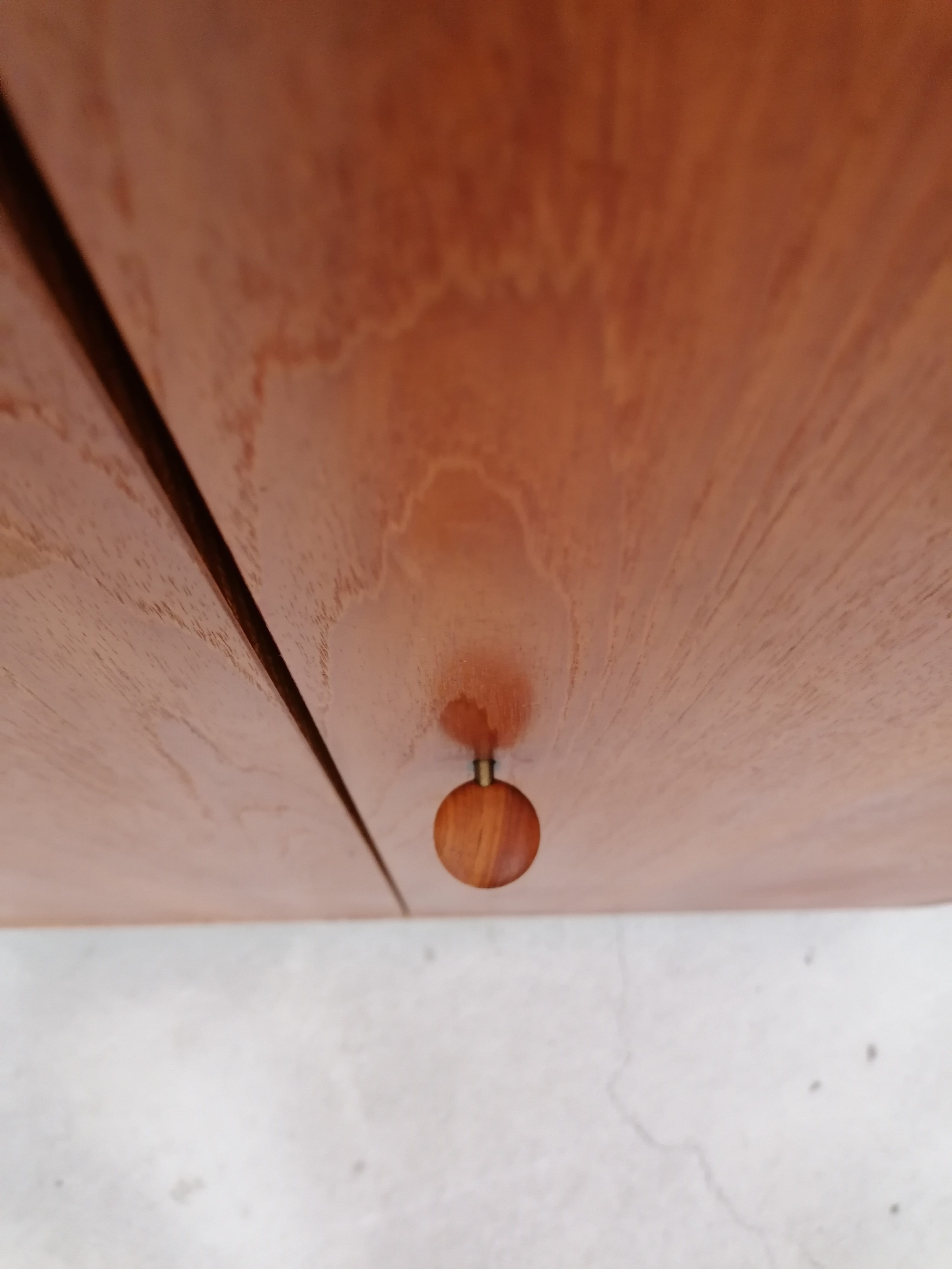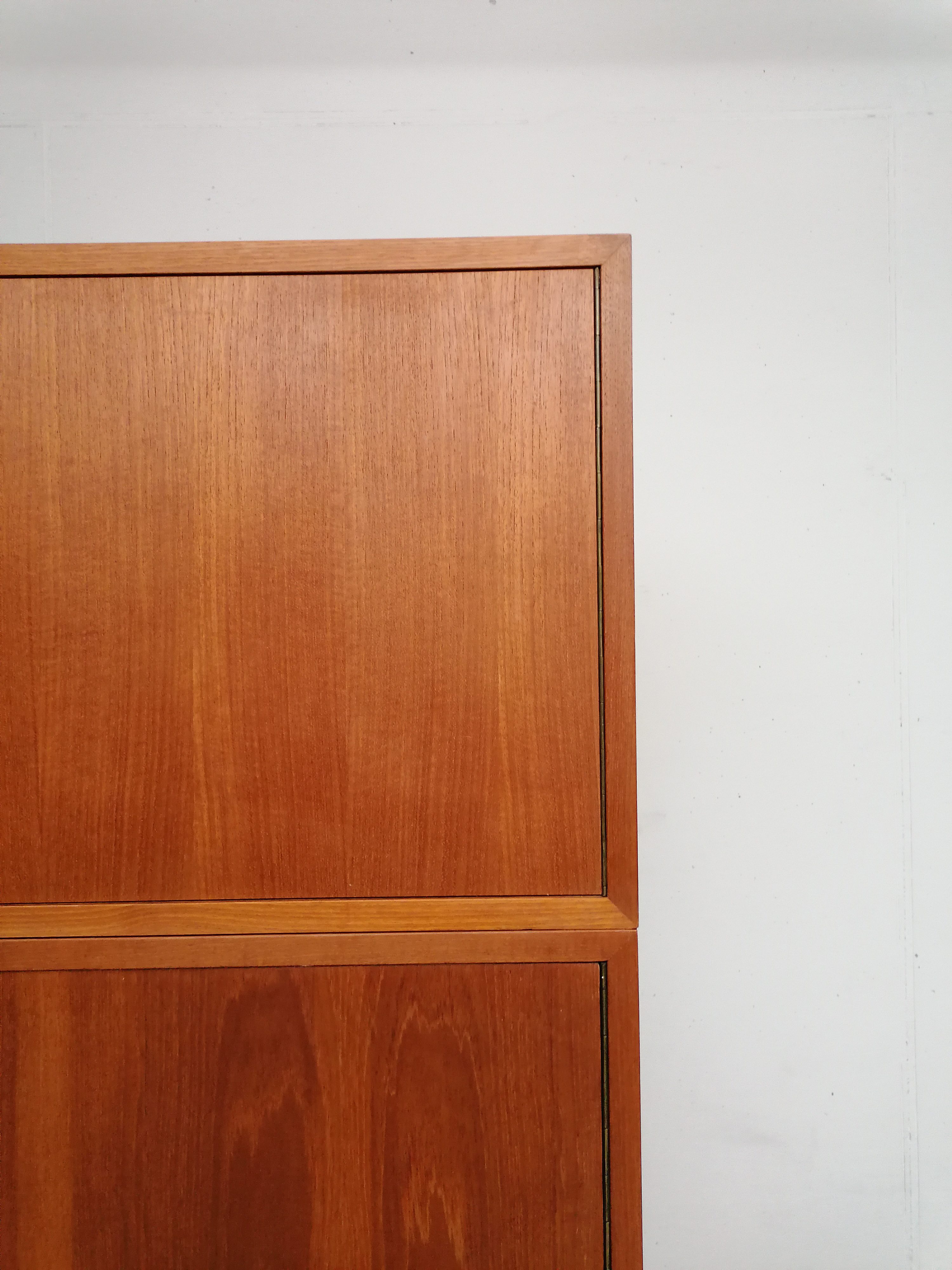 Produit venduArmoire modulable vintage composée de deux parties séparables. Dans la partie supérieure un caisson de rangement et dans la partie inférieure un espace penderie. Une seule clé ouvre les deux modules. Les portes de la penderie se ferment avec une légère résistance mais elle se ferment correctement. Quelques traces d’usure (voir photos) mais stable et solide. Très élégante avec ses lignes minimalistes et son socle de couleur noire. Le caisson supérieure peut être aussi utilisé séparément de la penderie comme meuble de rangement ou meuble tv.