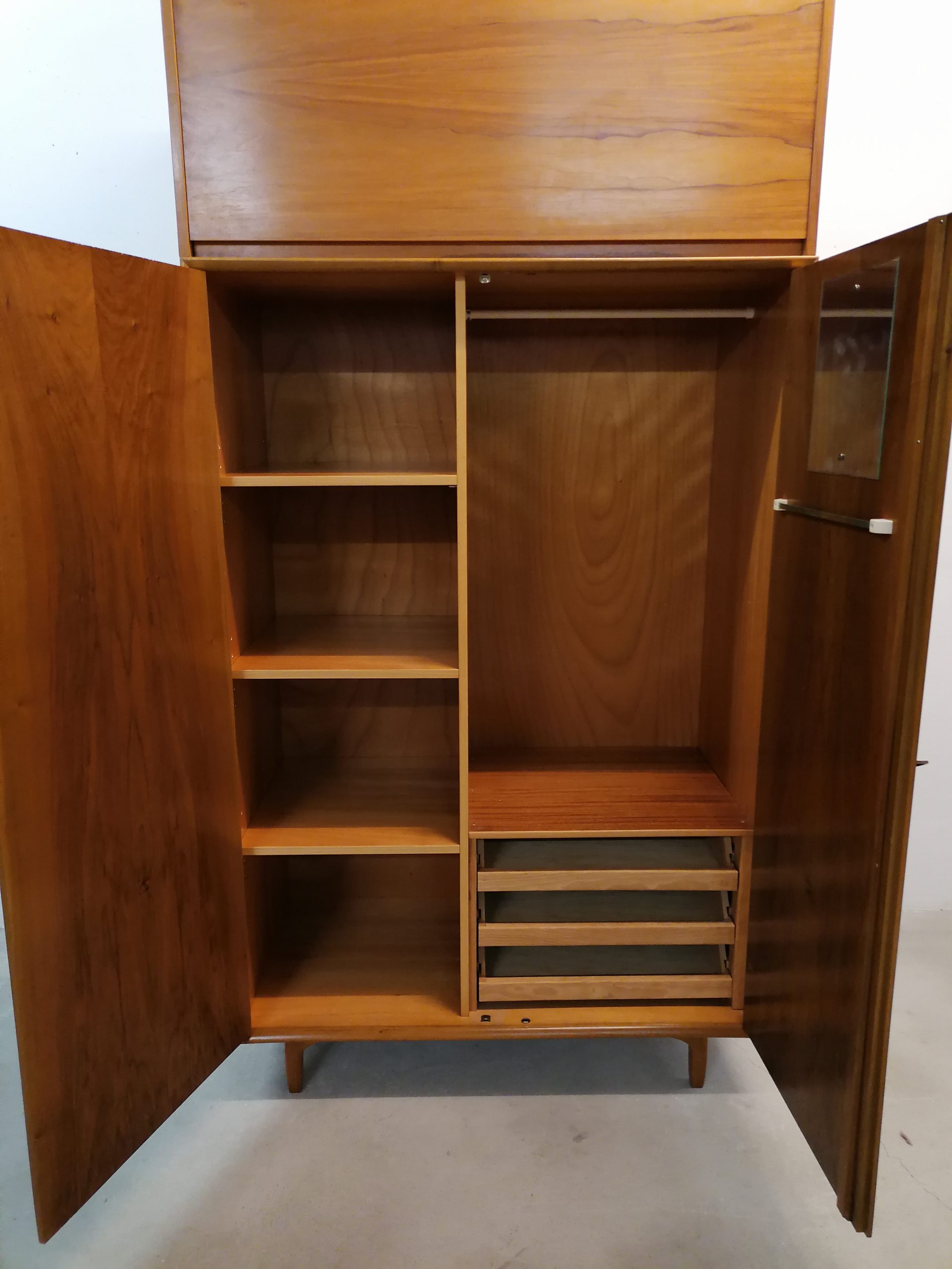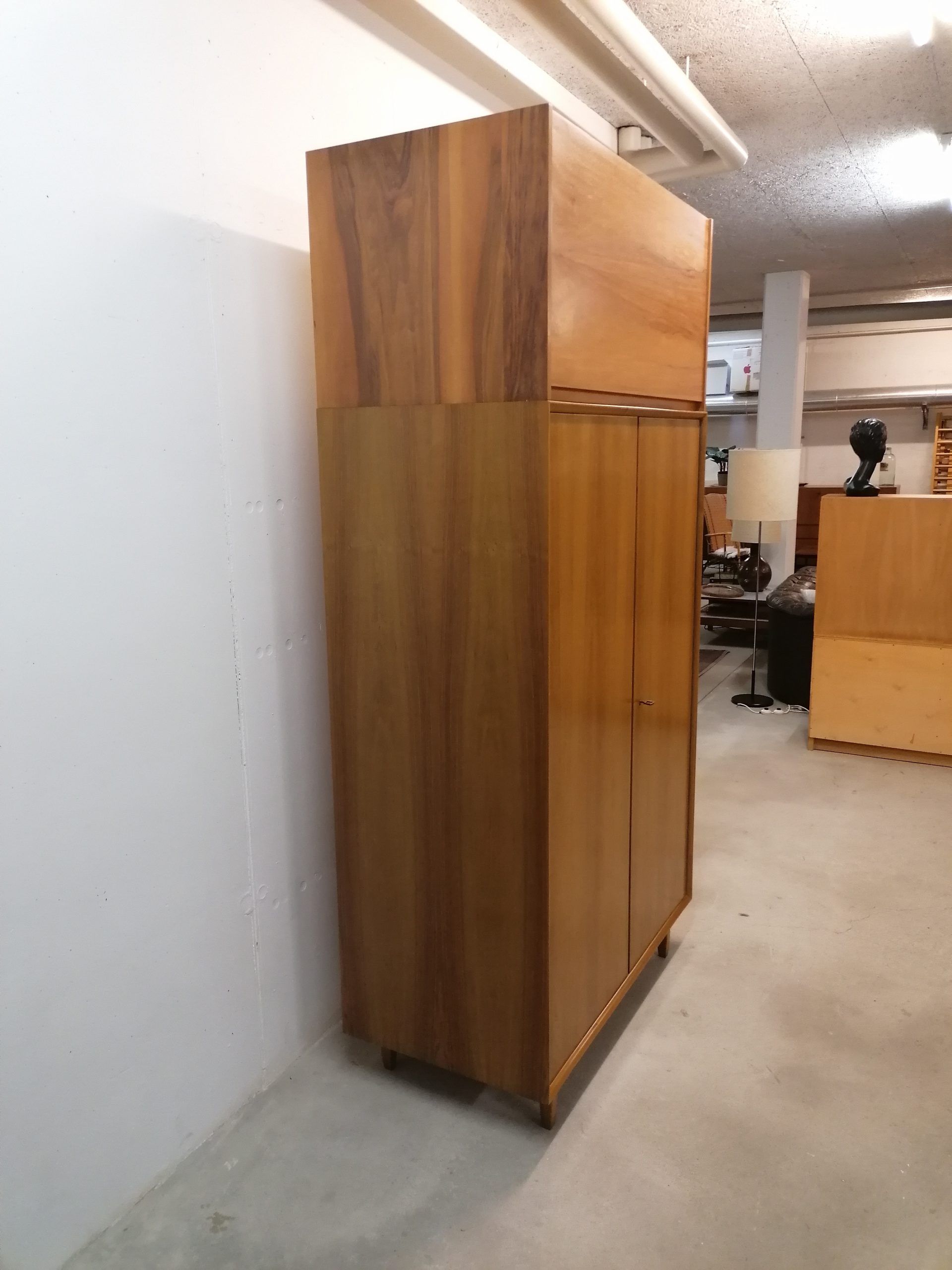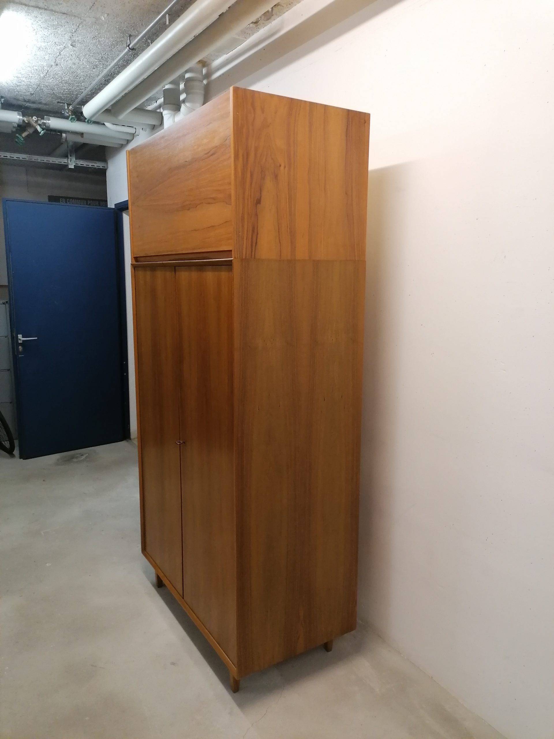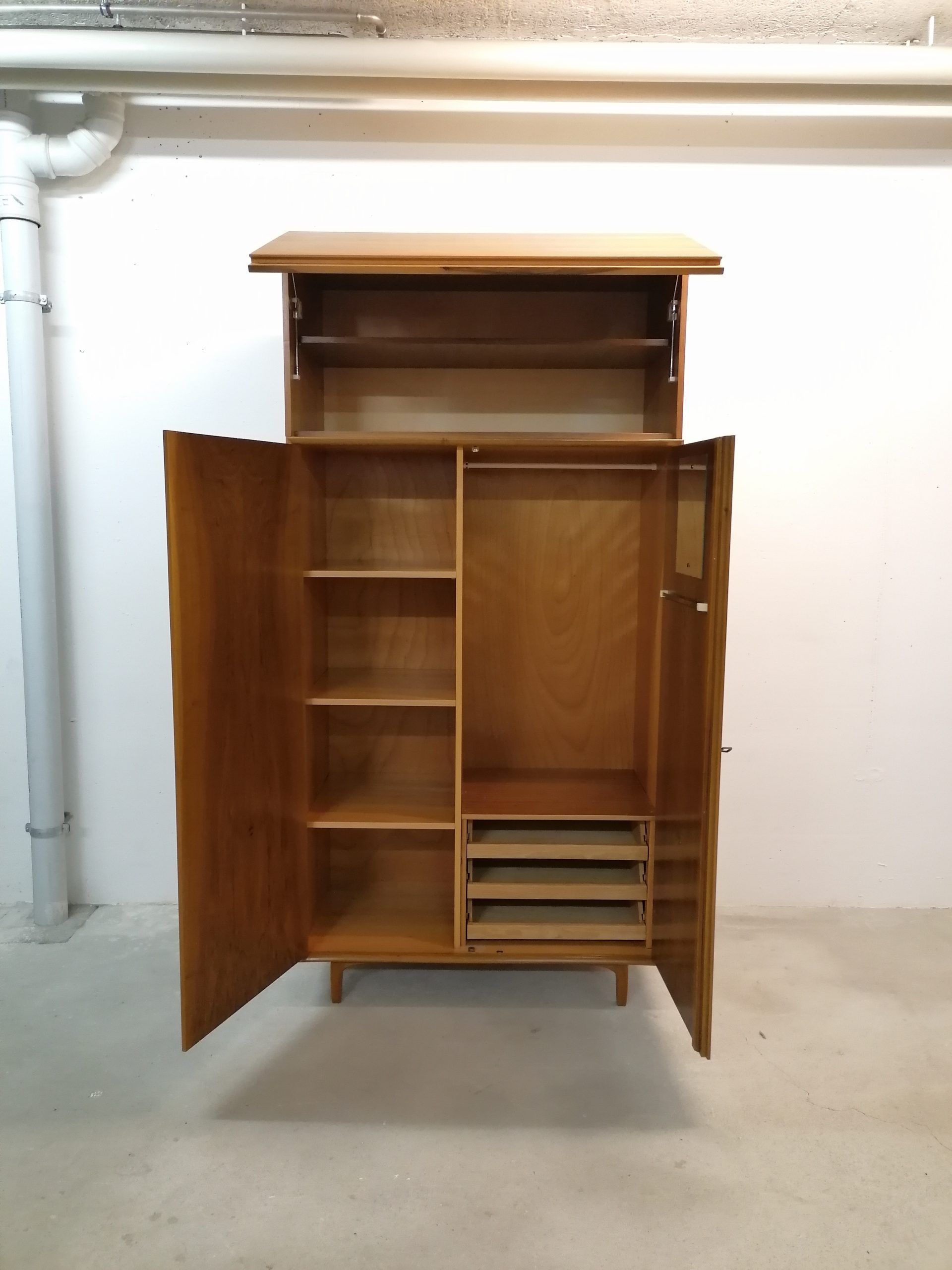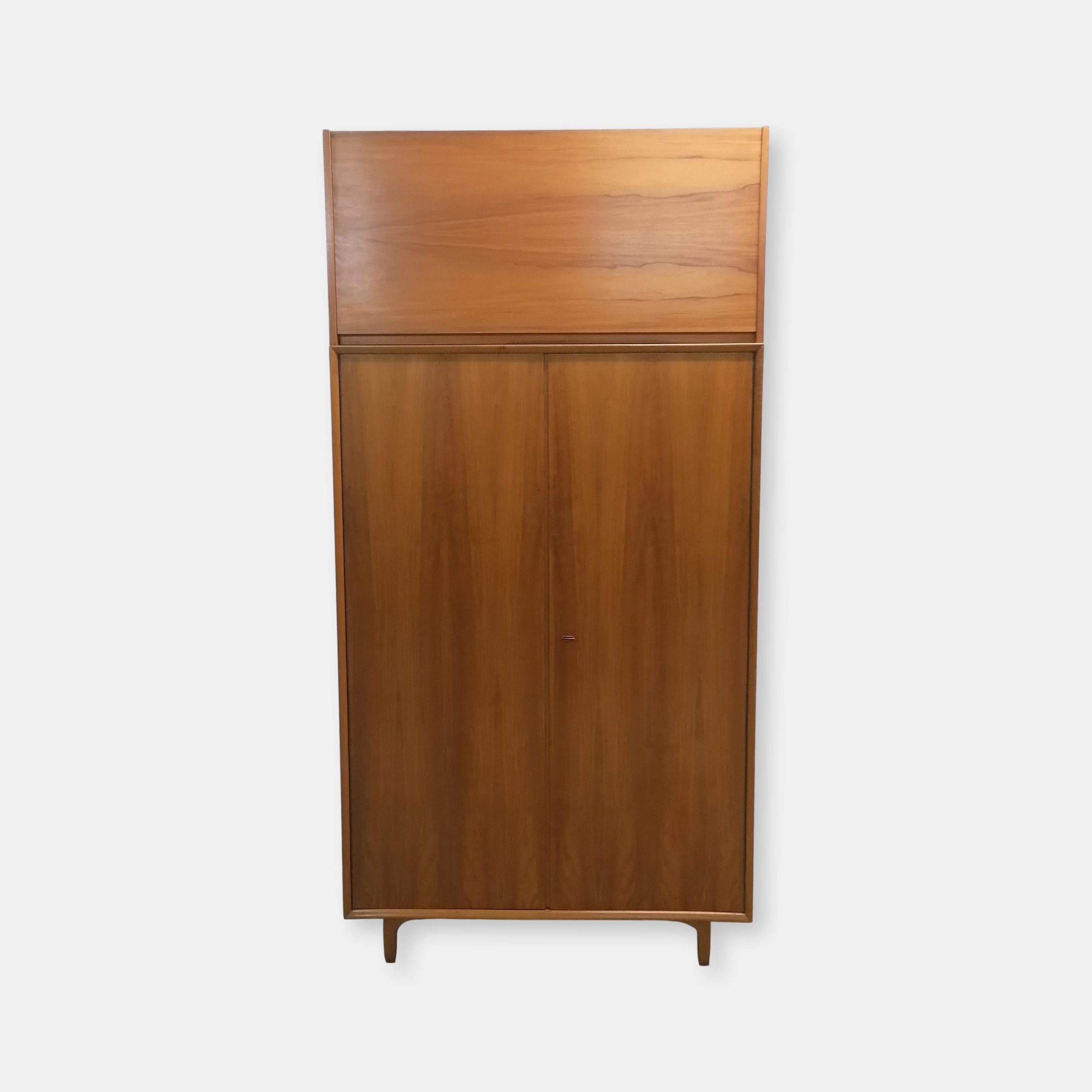 Produit venduArmoire modulable composée de deux parties séparables. La partie supérieure est doté d’une porte rabattable et d’une étagère à l’intérieur. Dans la partie inférieure on trouve 3 tablars à gauche et trois tiroirs à droite avec un espace penderie. Quelques petites traces d’usure (voir photos) mais stable et solide. Très élégant avec sont piètement en bois et ses lignes minimalistes. La partie inférieure mesure 168 cm, la partie supérieure 52 cm.