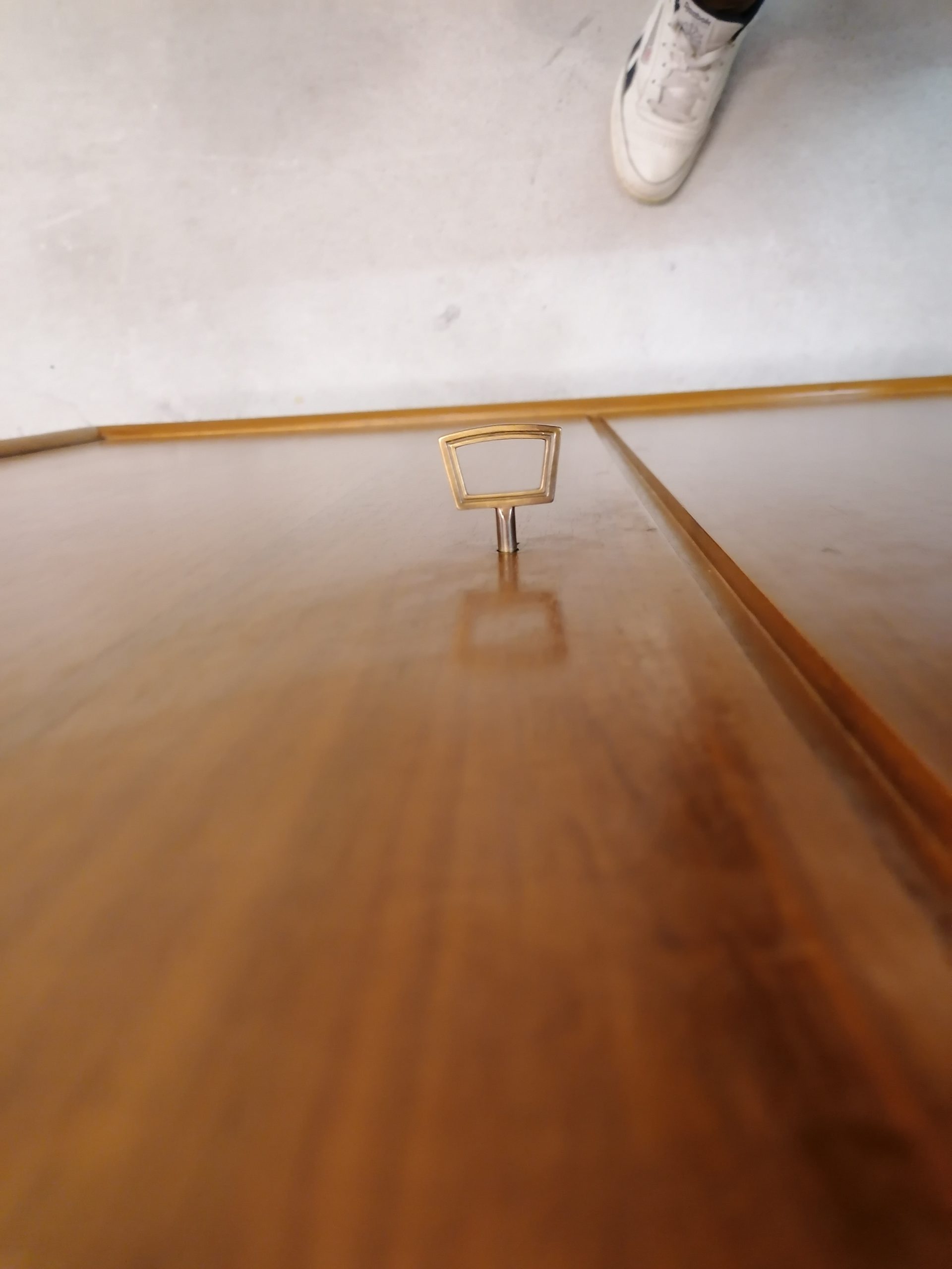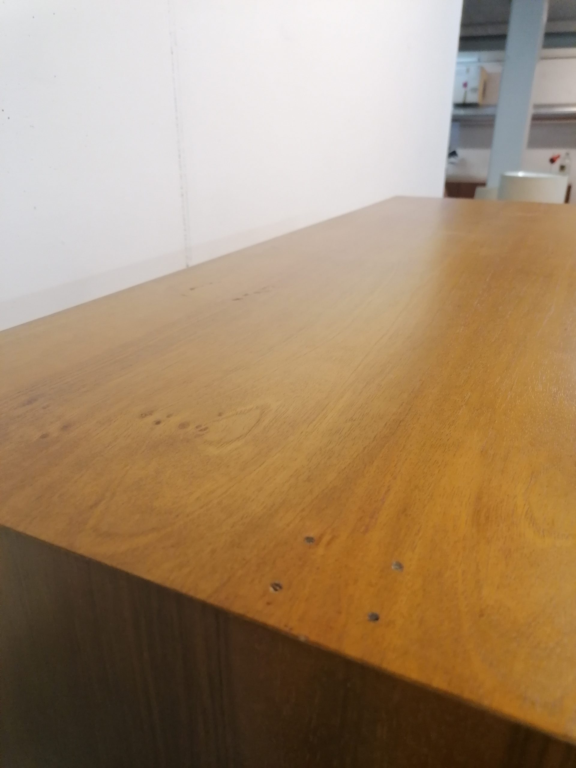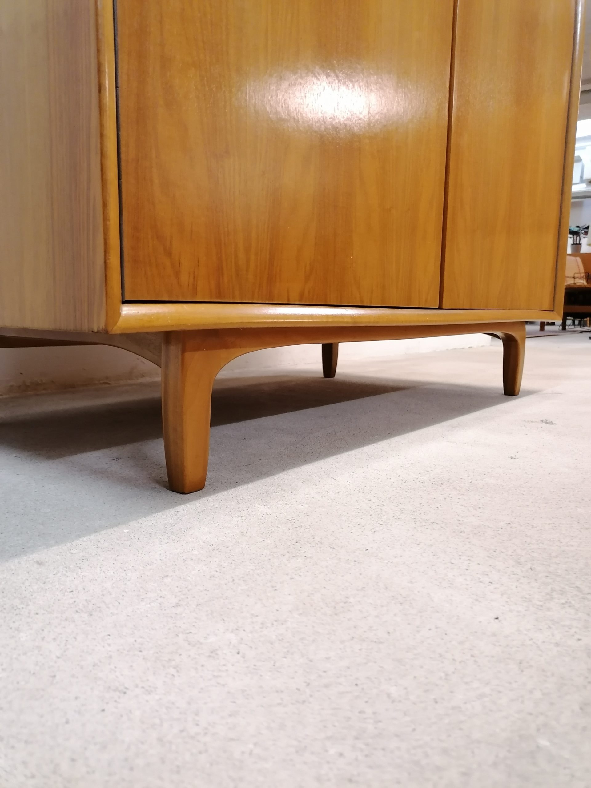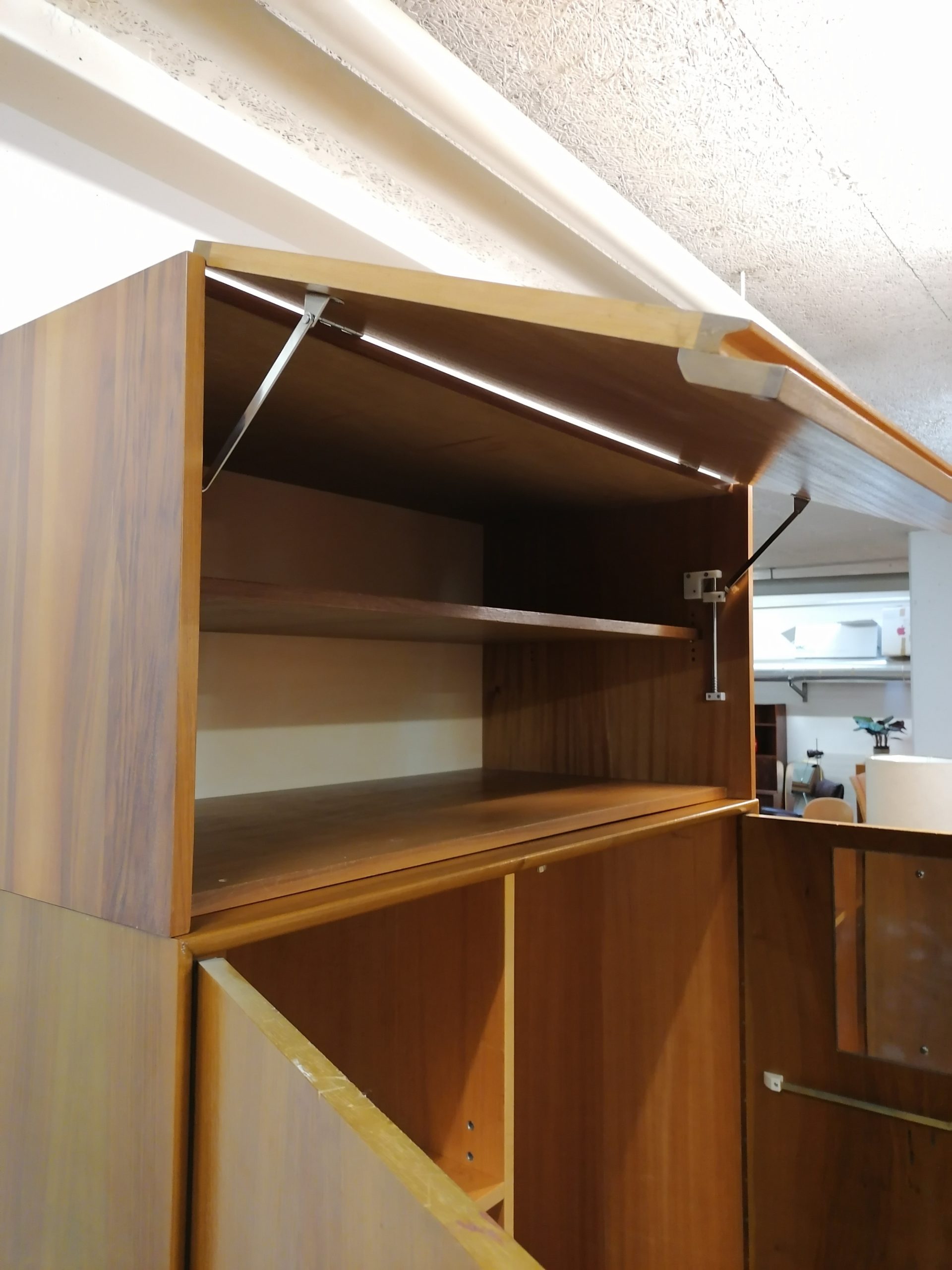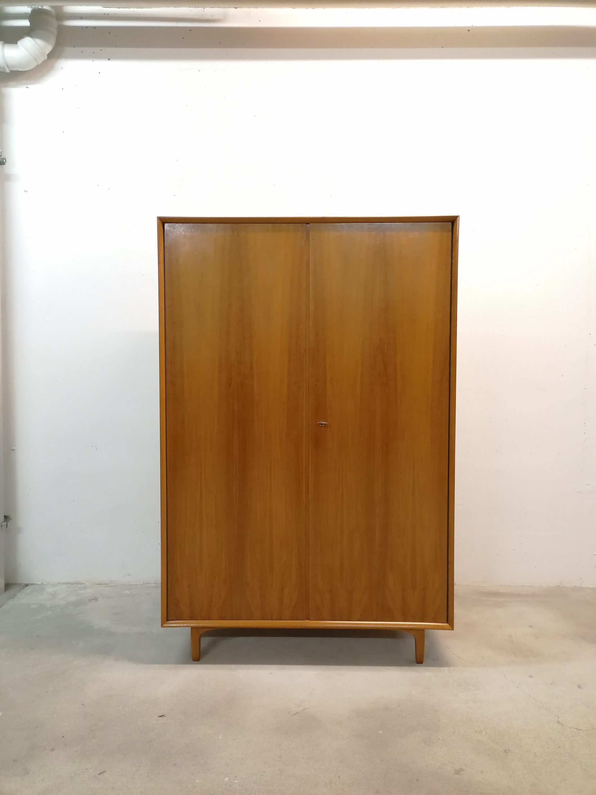 Produit venduArmoire modulable composée de deux parties séparables. La partie supérieure est doté d’une porte rabattable et d’une étagère à l’intérieur. Dans la partie inférieure on trouve 3 tablars à gauche et trois tiroirs à droite avec un espace penderie. Quelques petites traces d’usure (voir photos) mais stable et solide. Très élégant avec sont piètement en bois et ses lignes minimalistes. La partie inférieure mesure 168 cm, la partie supérieure 52 cm.