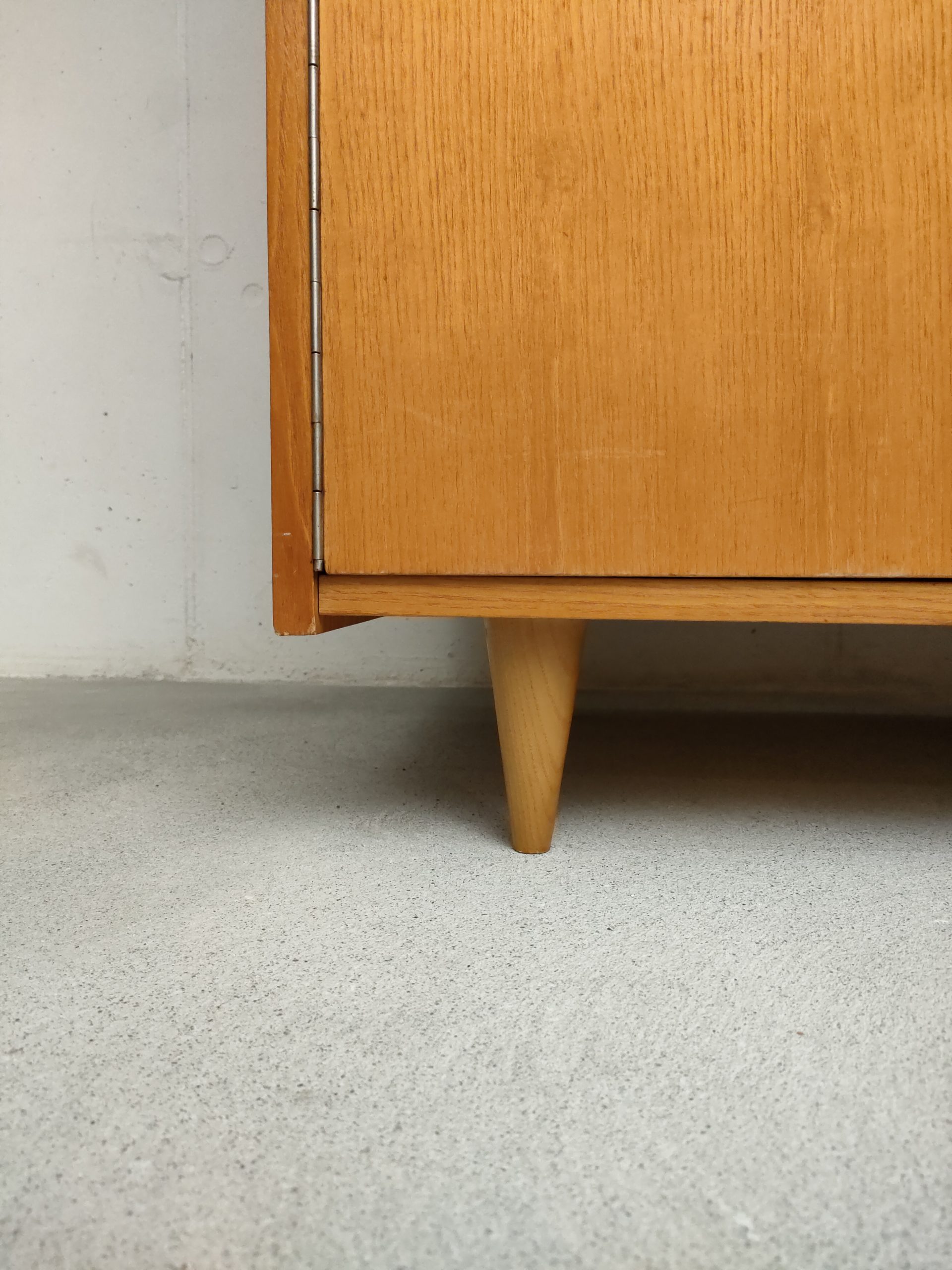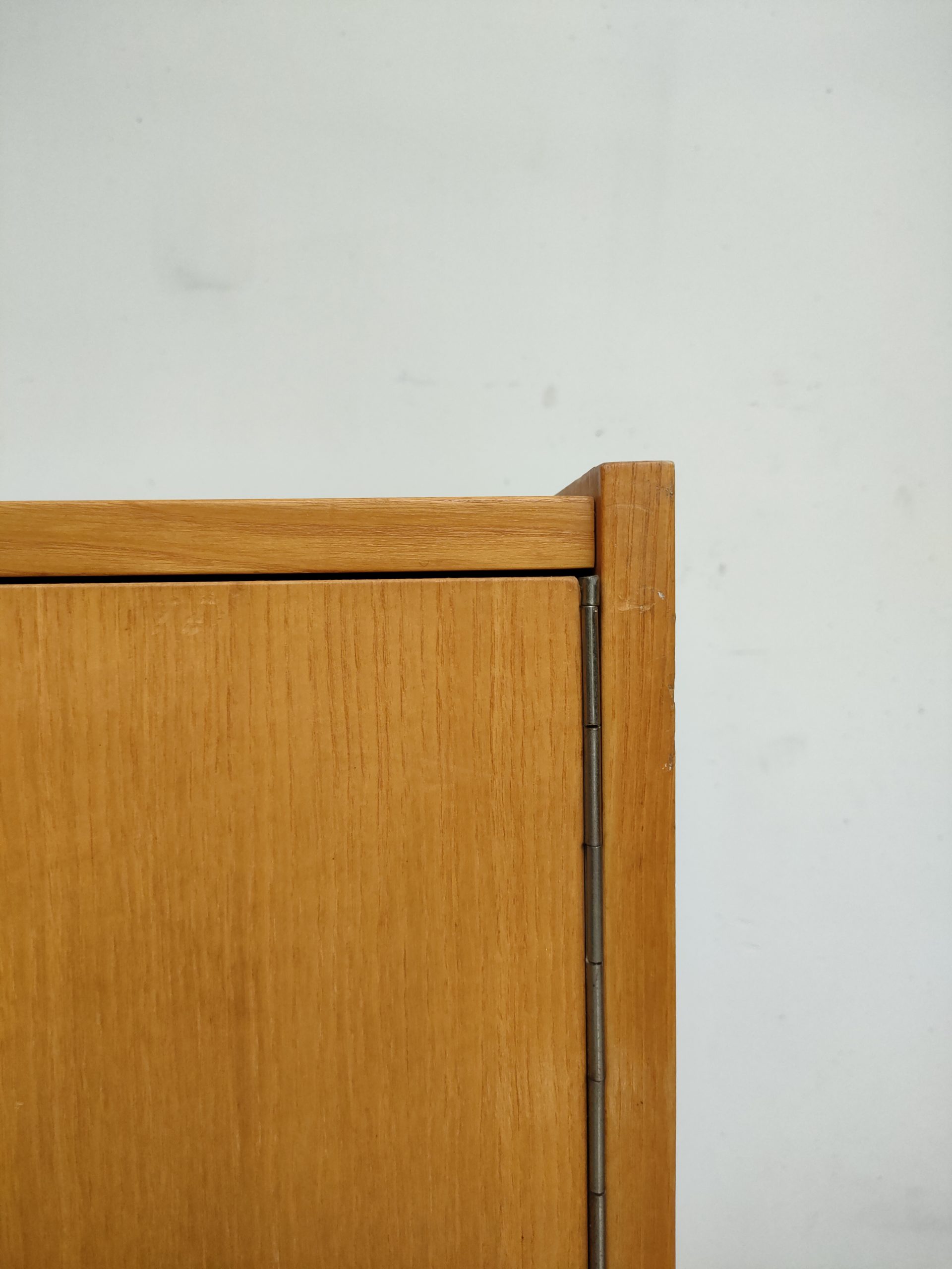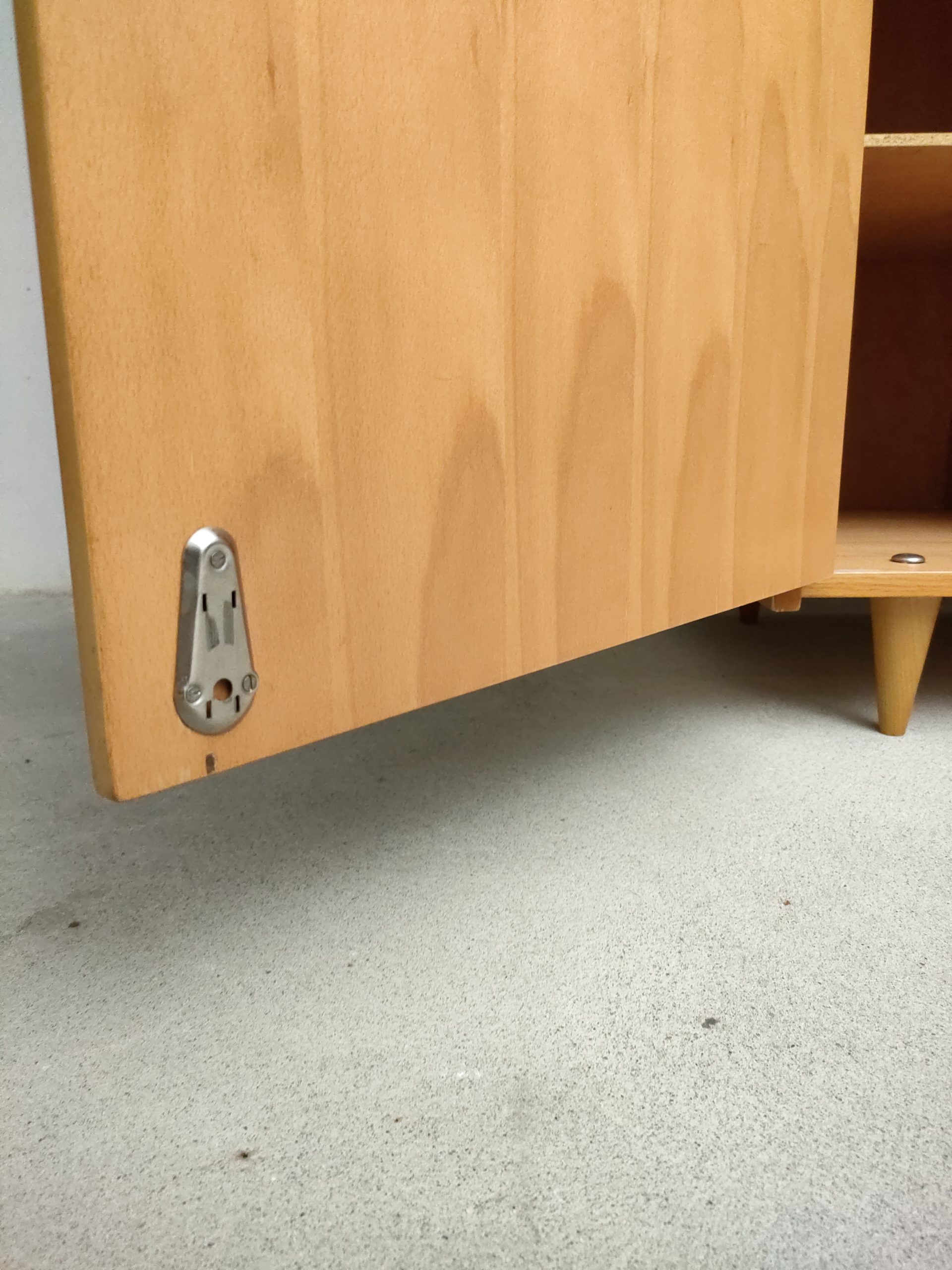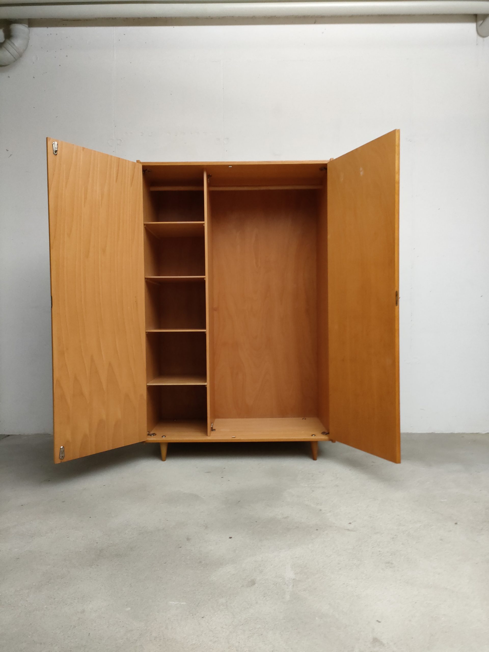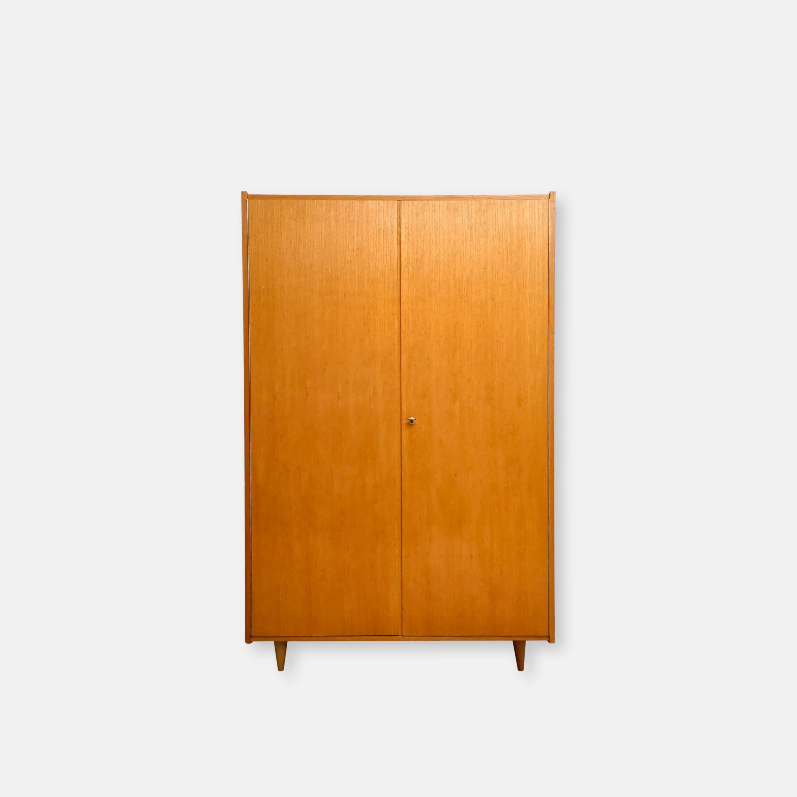 Produit venduArmoire vintage avec pieds fuseaux avec penderie d’un côté et 4 étagères de l’autre. Des traces d’usure sur le bois, avec des manques du placage à certains endroits (voir photos) et des décolorations de chaque côté. Le mécanisme inferieur pour fermer la porte de gauche est incomplet (celui supérieur est complet est les portes peuvent se fermer correctement). L’armoire est stable et solide et élégant, malgré ses défauts. Il peut être démonté pour le transport.
