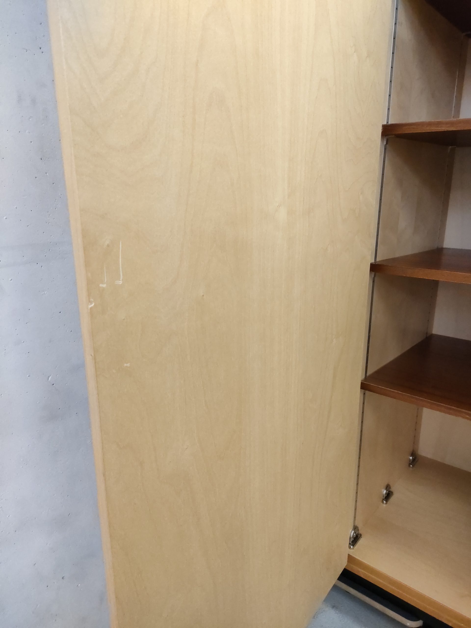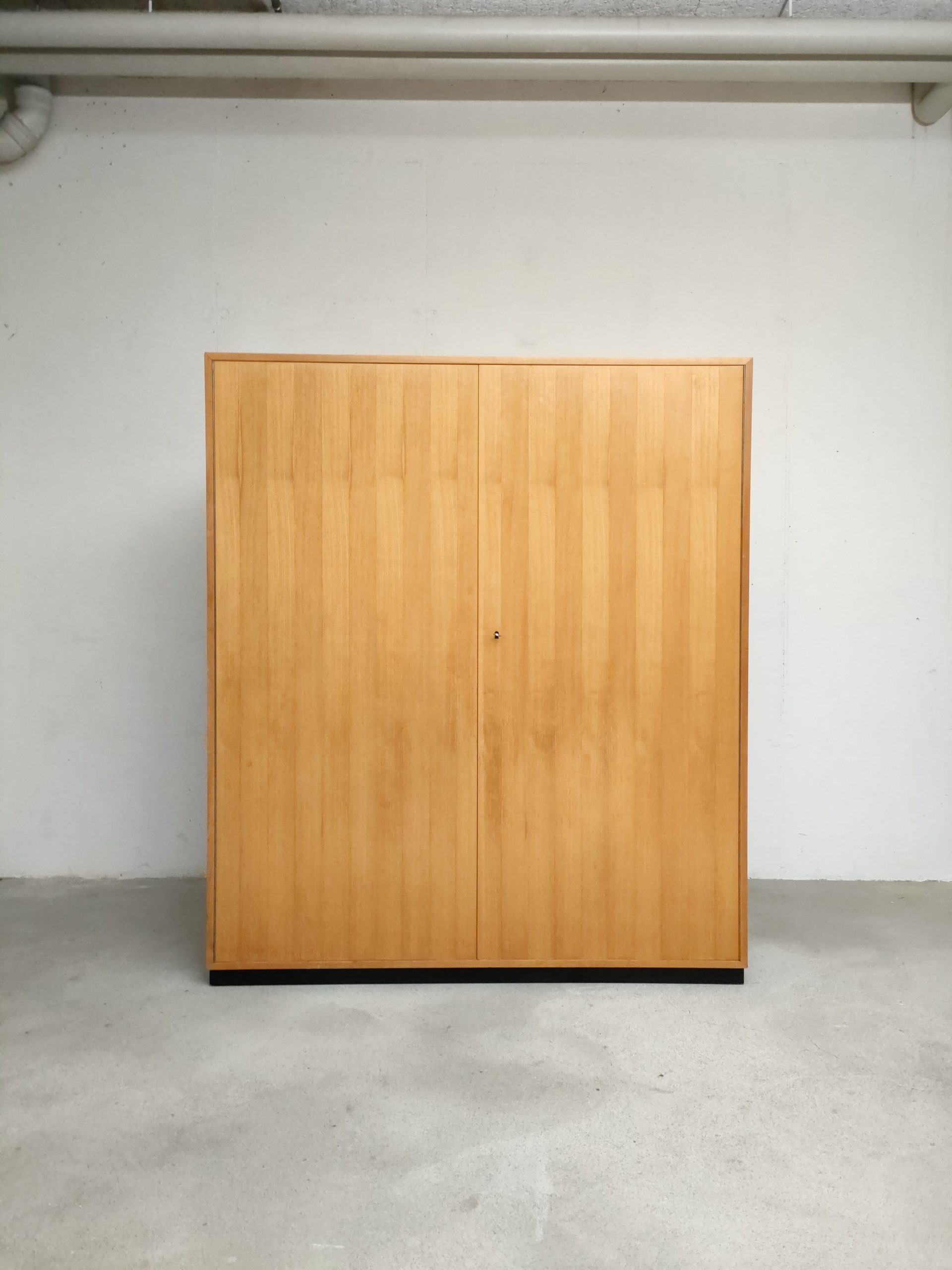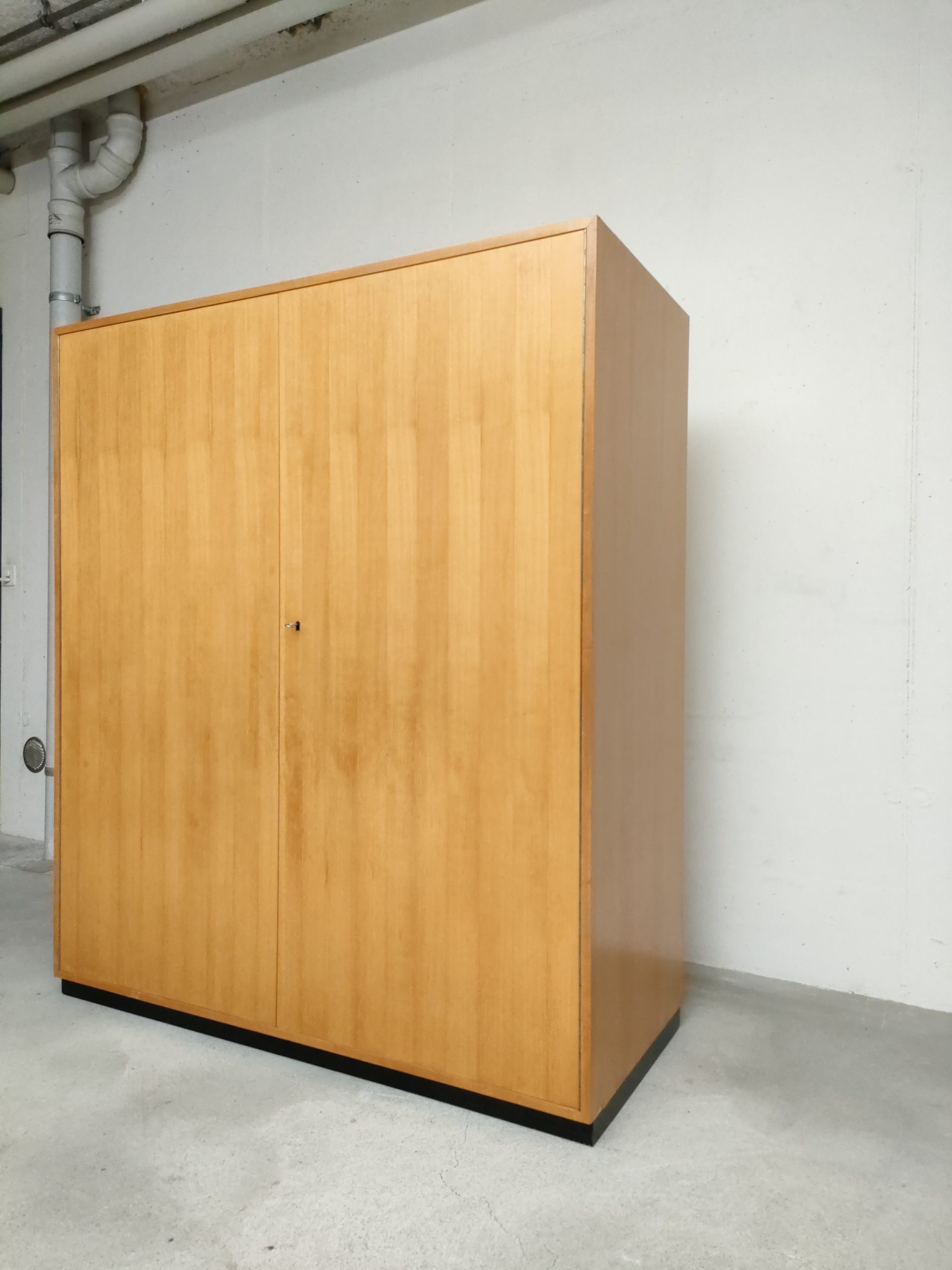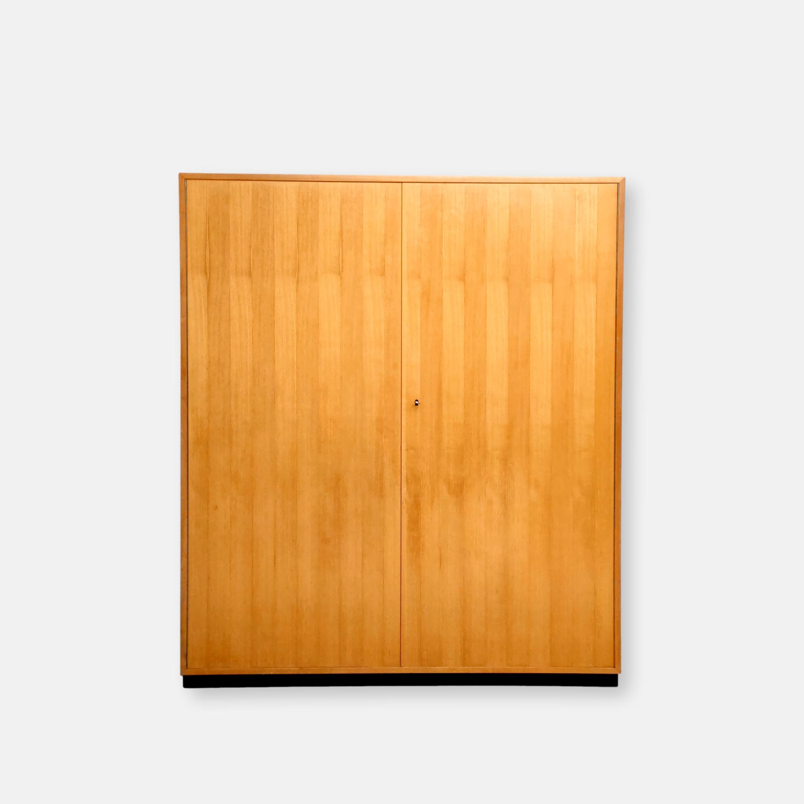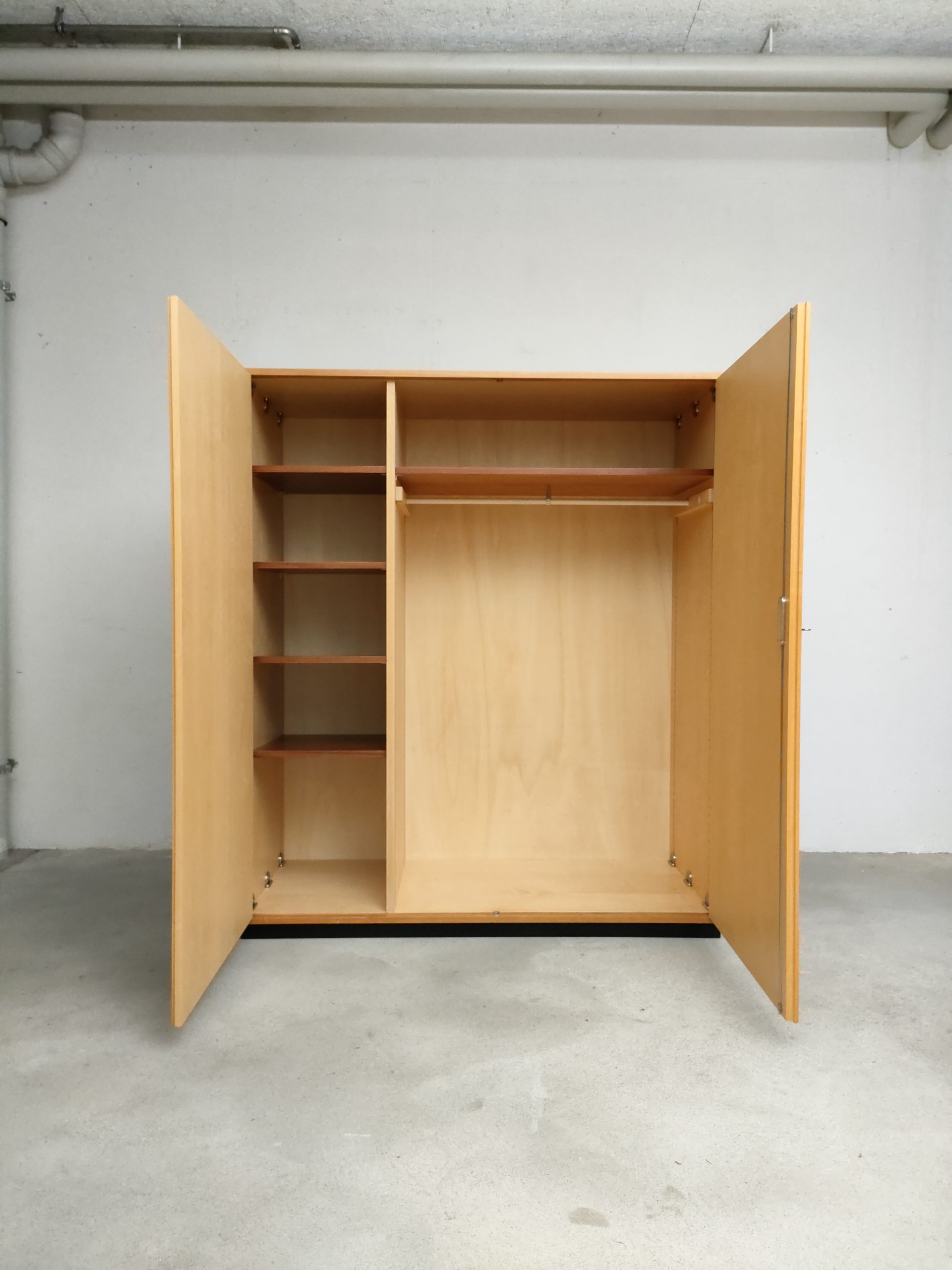 Produit venduArmoire Zingg Lamprecht vintage en bois avec socle noir, penderie et étagère d’un côté et 4 étagères de l’autre. Des légères traces d’usure sur le bois aont présentes ainsi que des légers manques de placage à certains endroits (voir photos). L’armoire est stable et solide et élégante. Elle peut être démontée pour le transport.