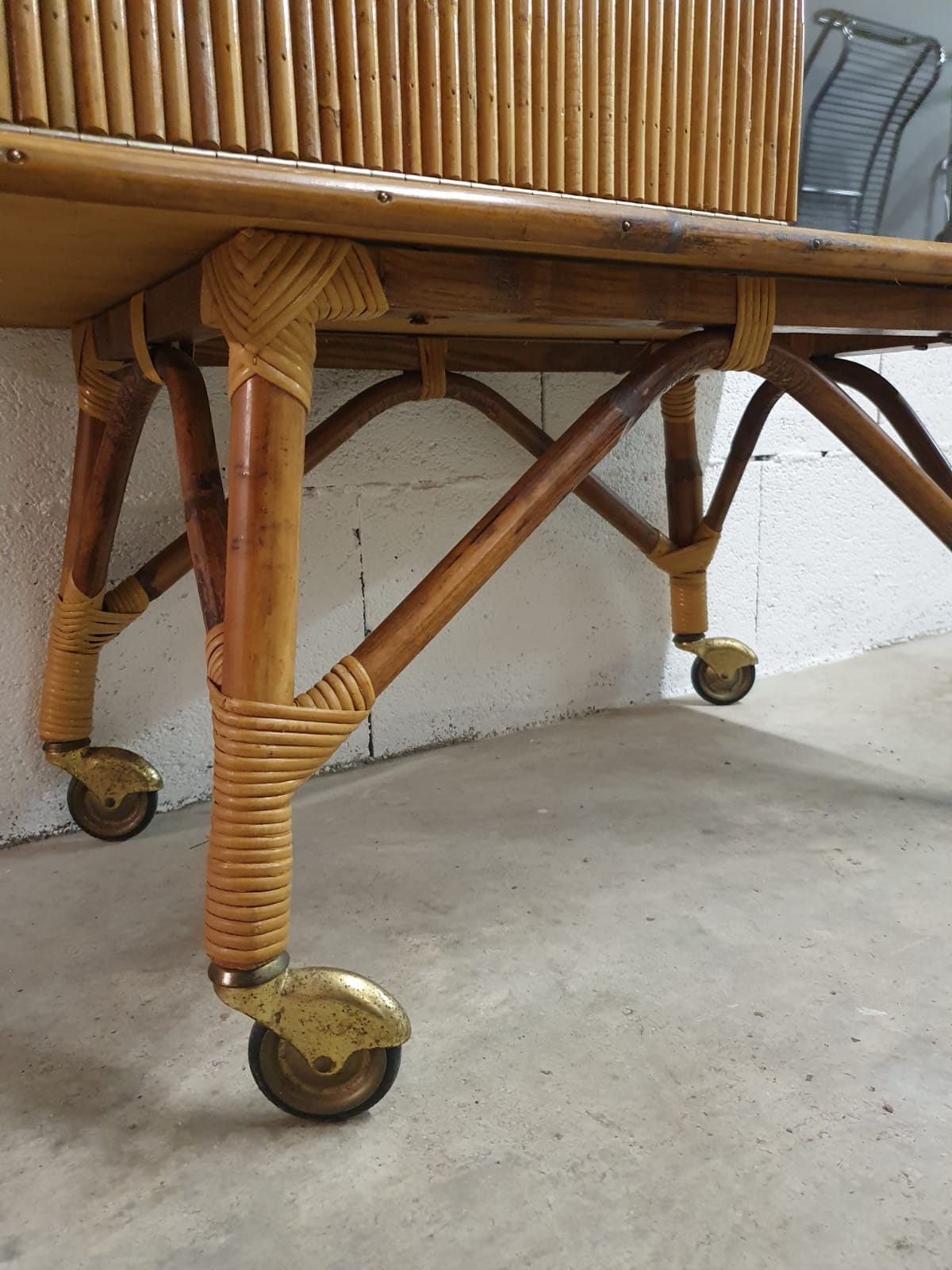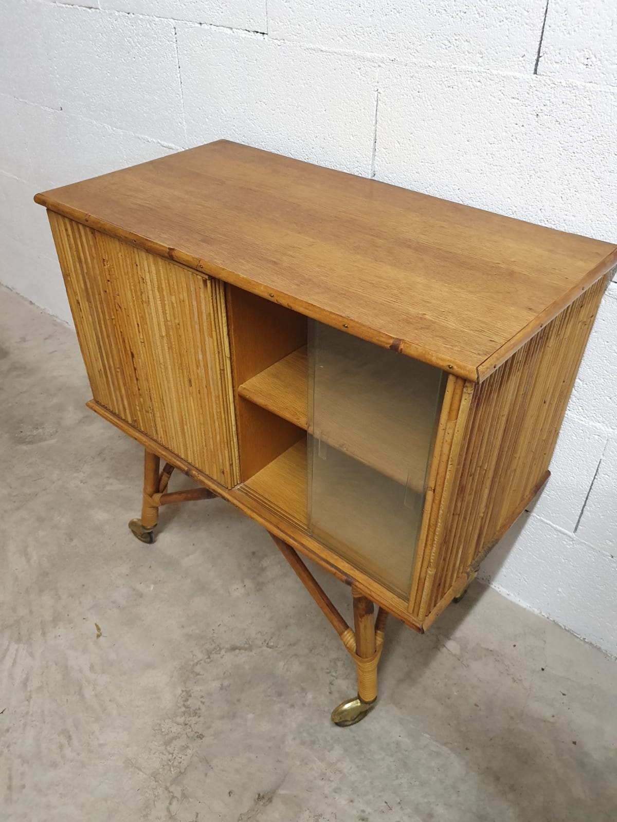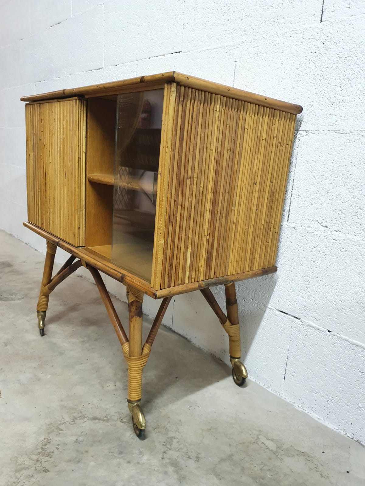 Produit venduBar en rotin des années 60 sur roulettes avec vitrine et porte rabattable.