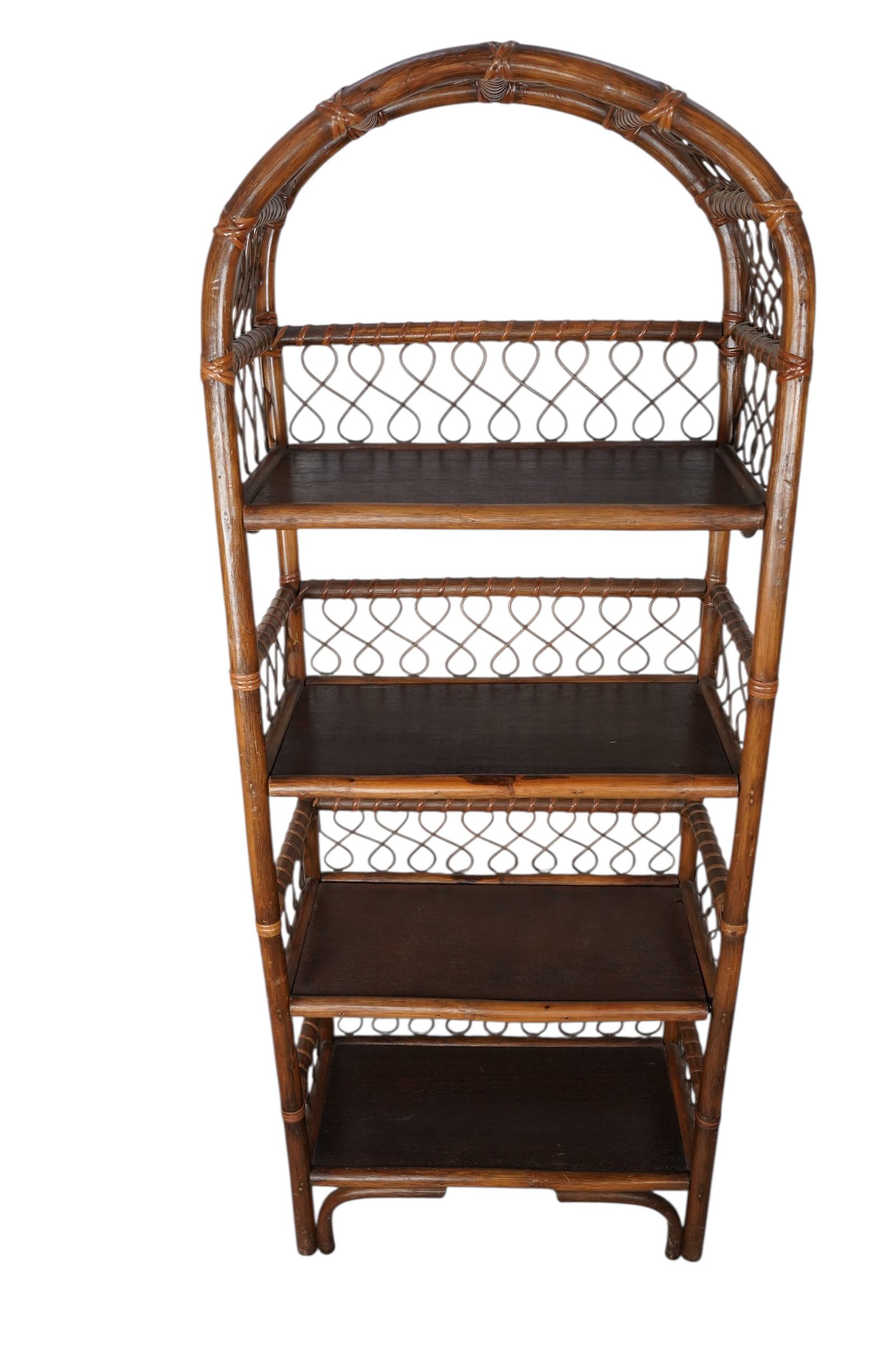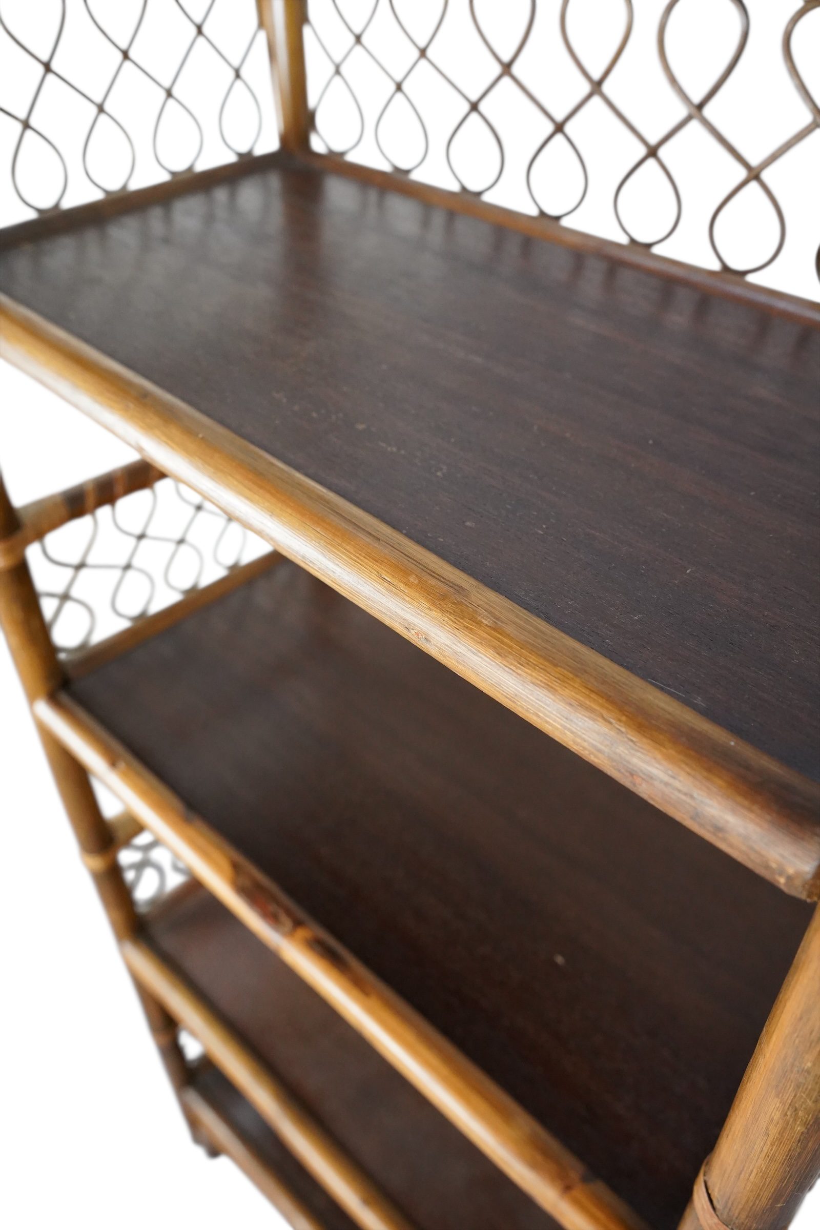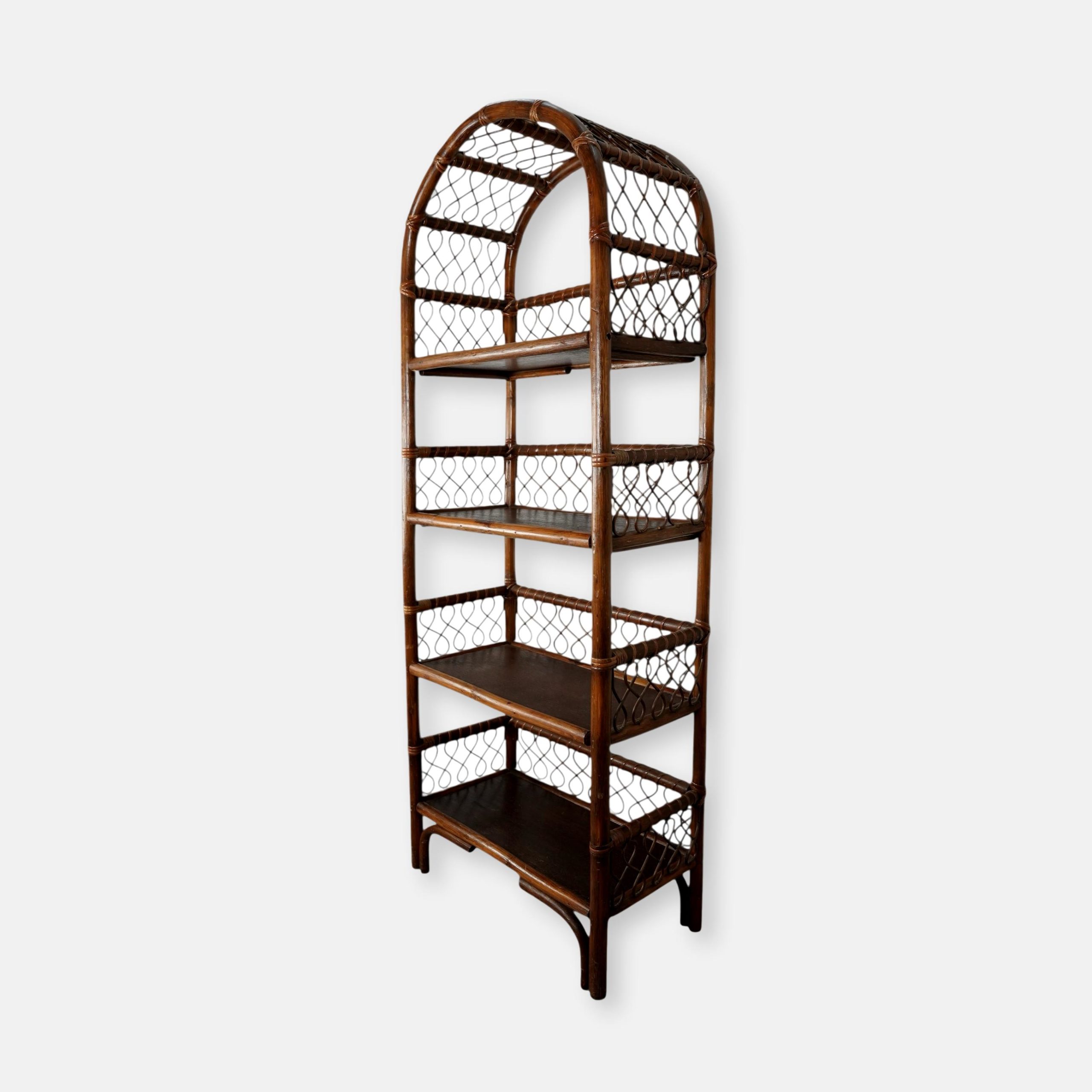 Bibliothèque en bamboo courbé et osier tréssé de forme cintré, de teinte foncé des années 1950’s. Ce meuble présente un plateau arqué distinctif et de 4 étagères fixes, ce qui lui permet de servir aussi bien de bibliothèque, de support pour plantes ou de présentoir.