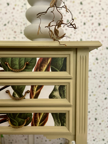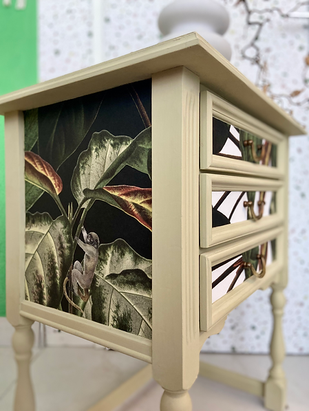 Petite commode 3 tiroirs peinte en Versailles de Annie Sloan, face des tiroirs et côté tapissés avec papier peint Rebel Walls motif jungle avec feuilles et une petite singe sur le coté droit.