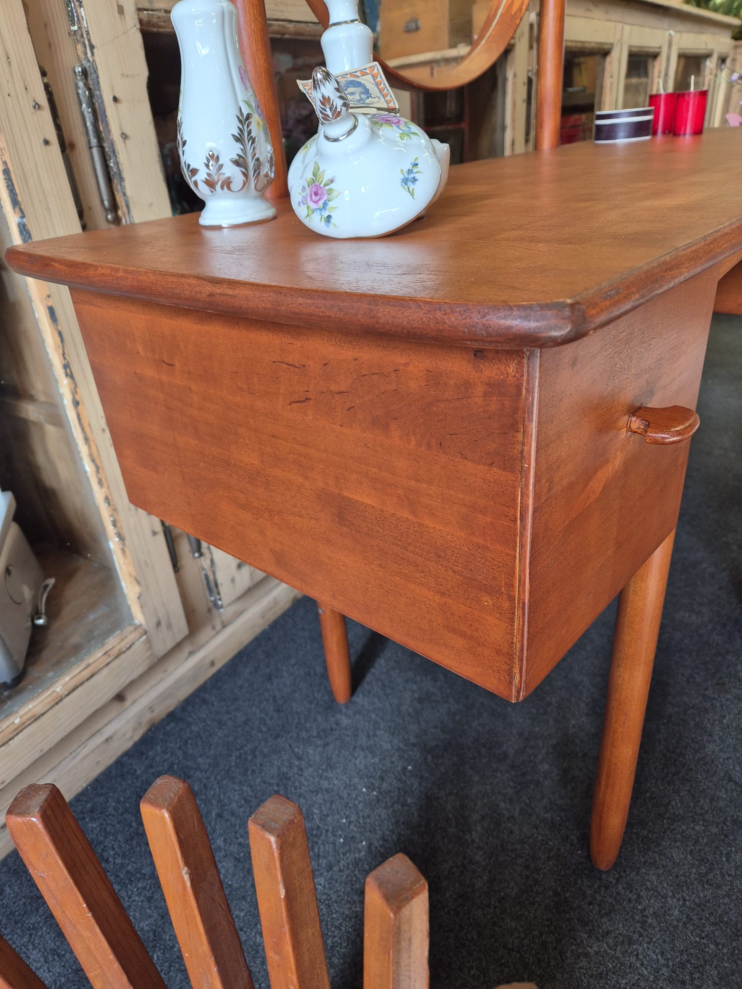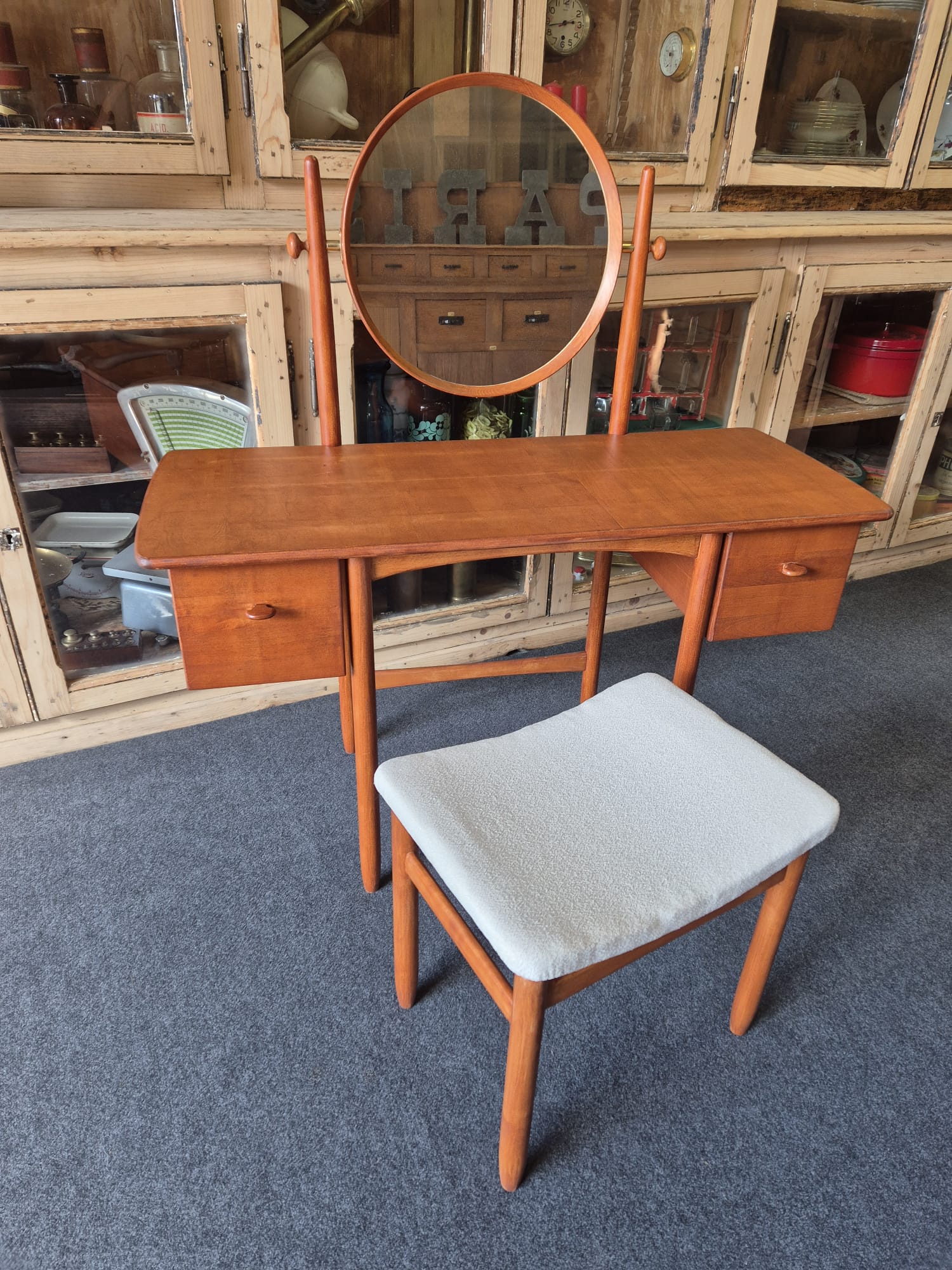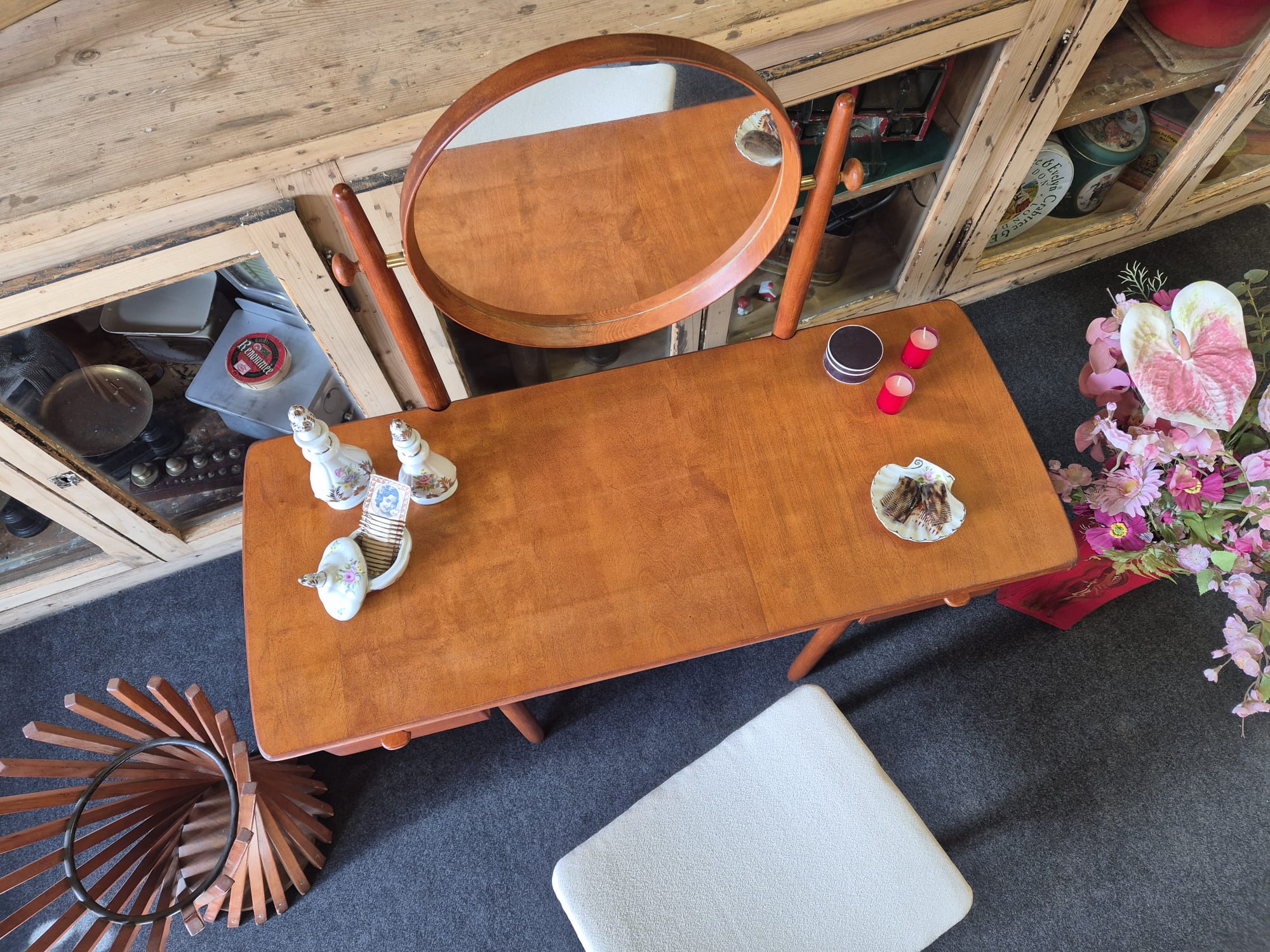 Rare dans cette configuration complète avec son assise, elle a été entièrement restaurée dans nos ateliers. Elle dispose de deux tiroirs et d’un joli miroir au mercure. Couleur teck et vernis sur l’ensemble.