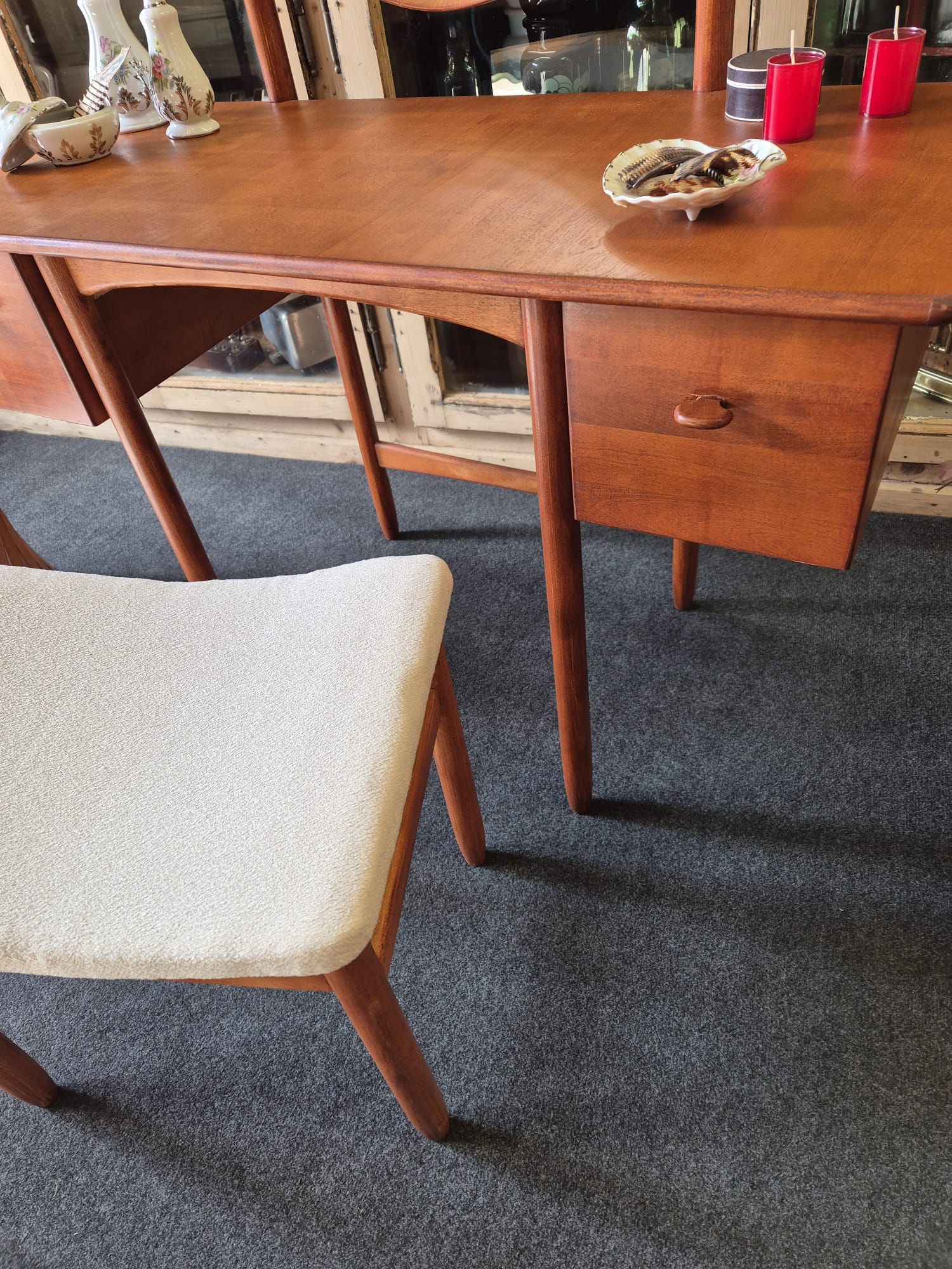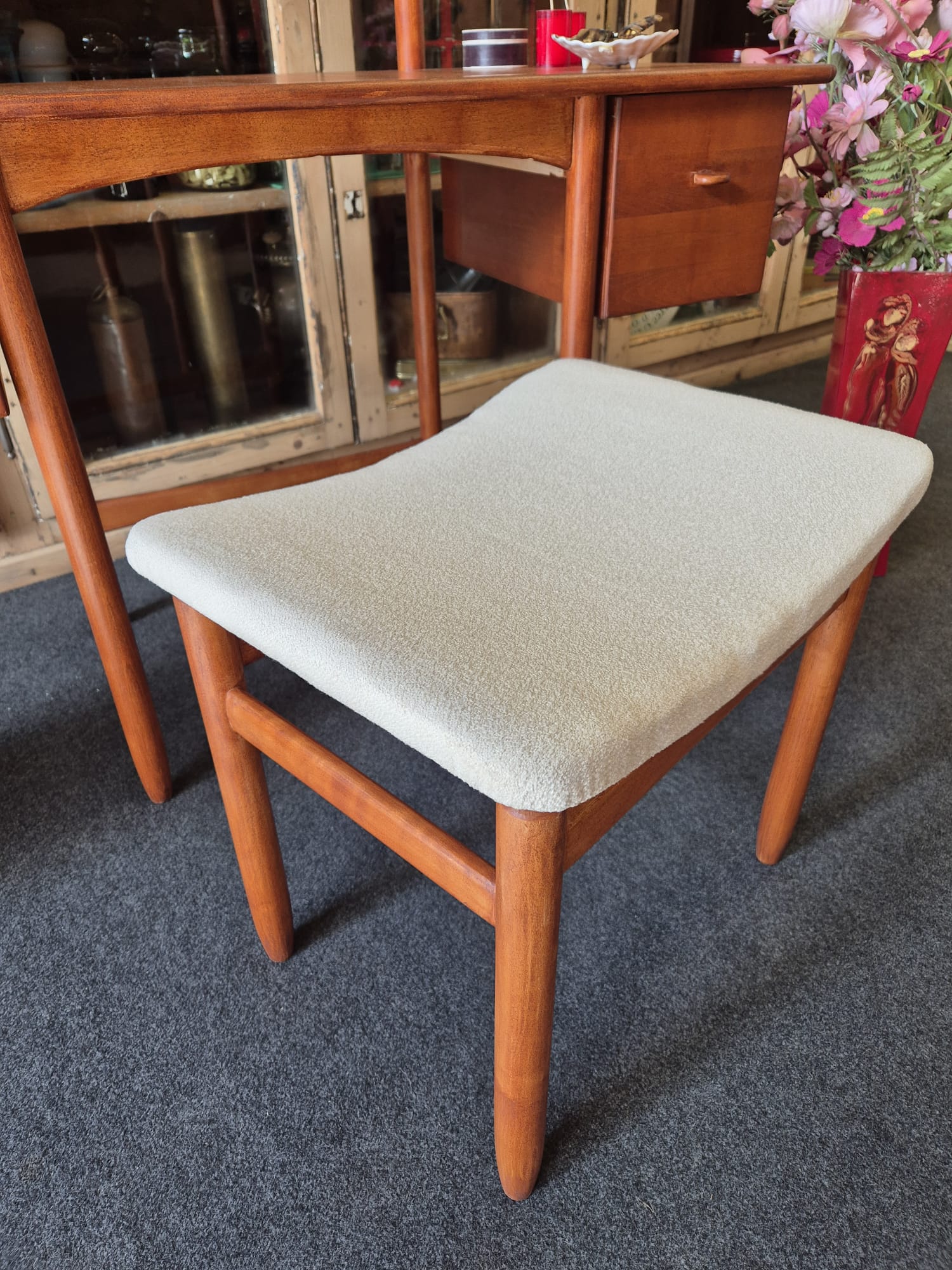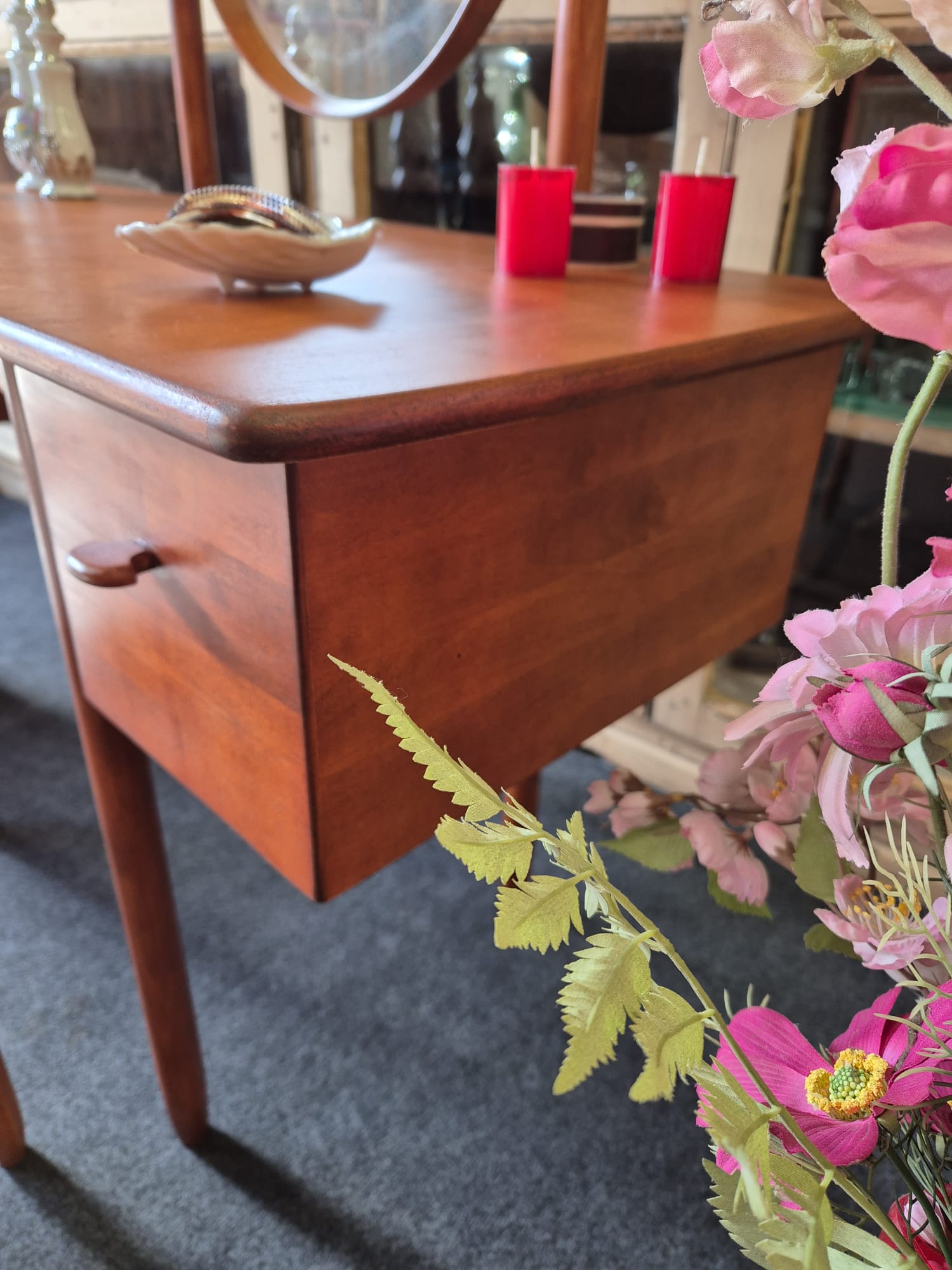 Rare dans cette configuration complète avec son assise, elle a été entièrement restaurée dans nos ateliers. Elle dispose de deux tiroirs et d’un joli miroir au mercure. Couleur teck et vernis sur l’ensemble.