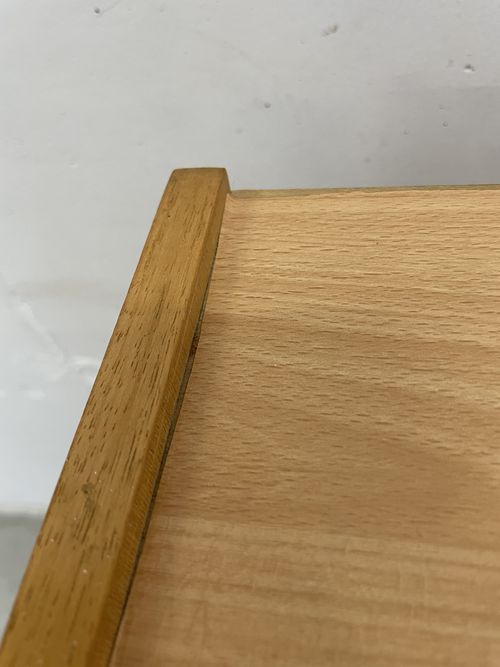 Le meuble comporte de nombreuses traces d’utilisation. Le dessus est recouvert d’un film plastique autocollant imitation bois.