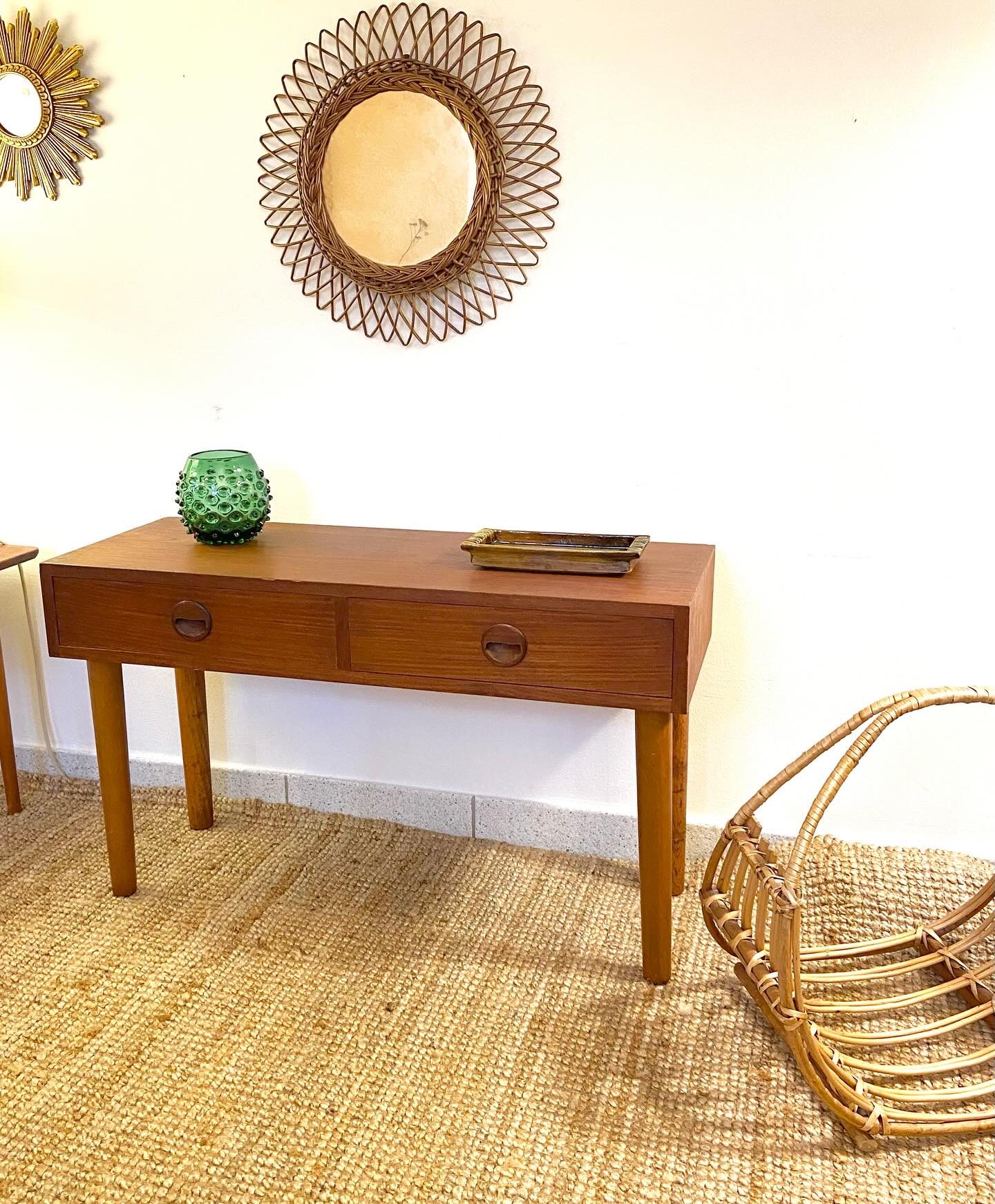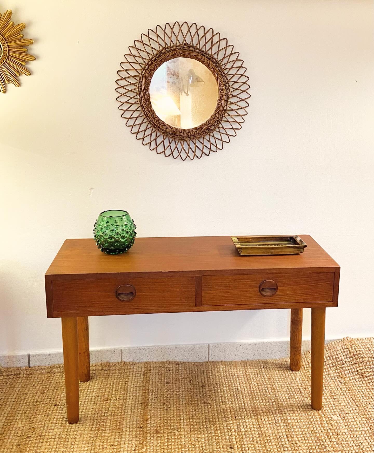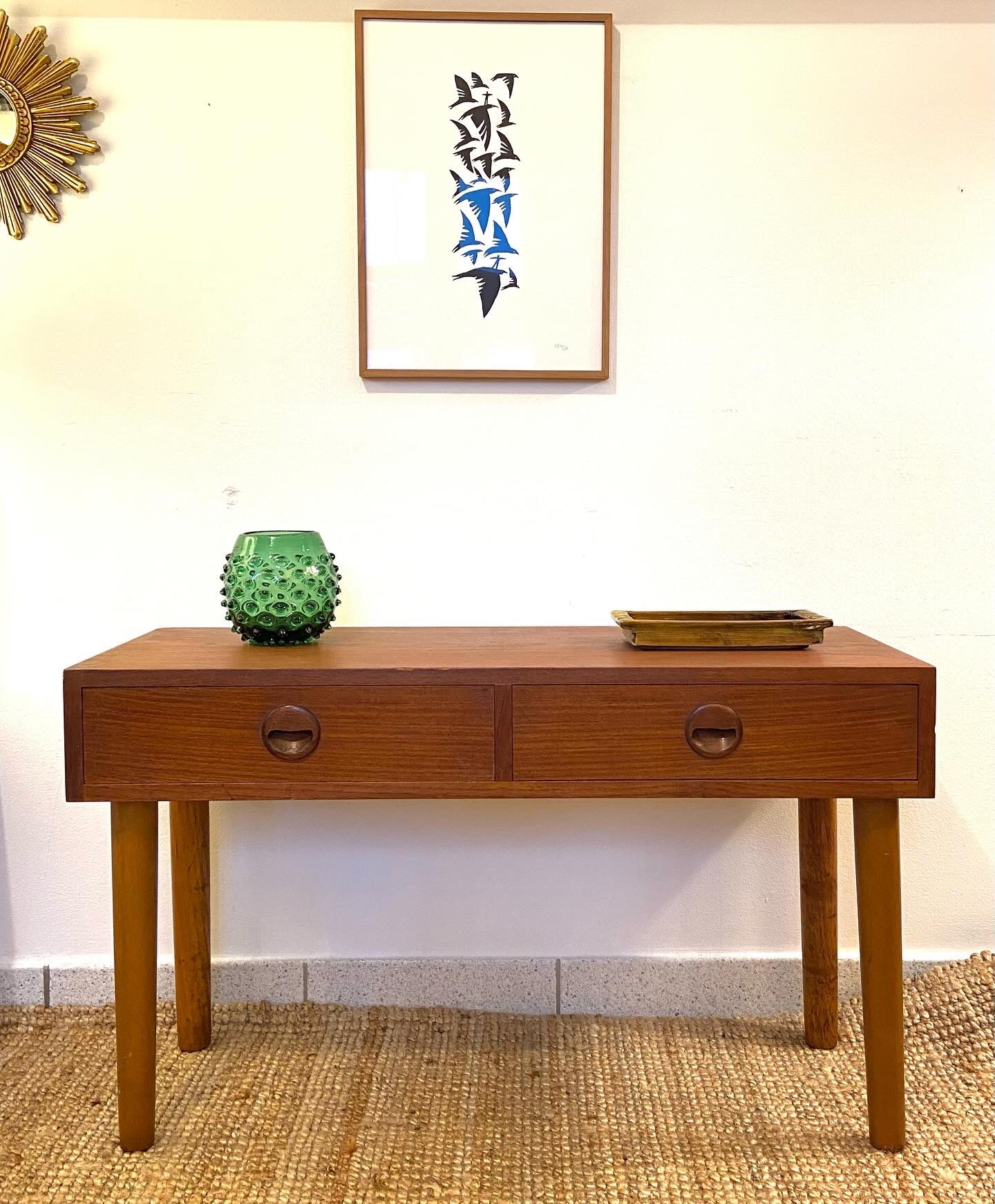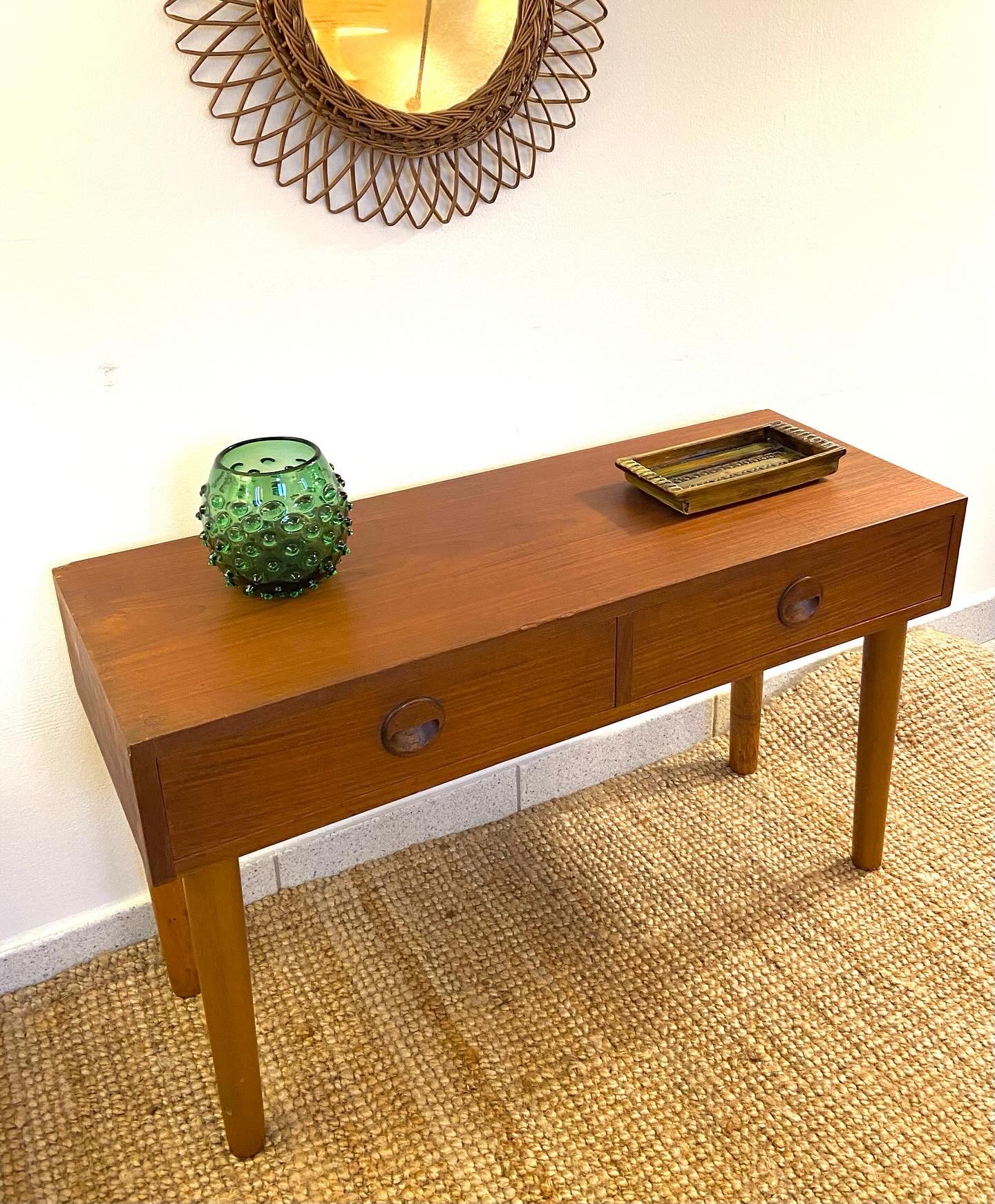 Produit venduJolie petite commode vintage en teck, composée de deux tiroirs.