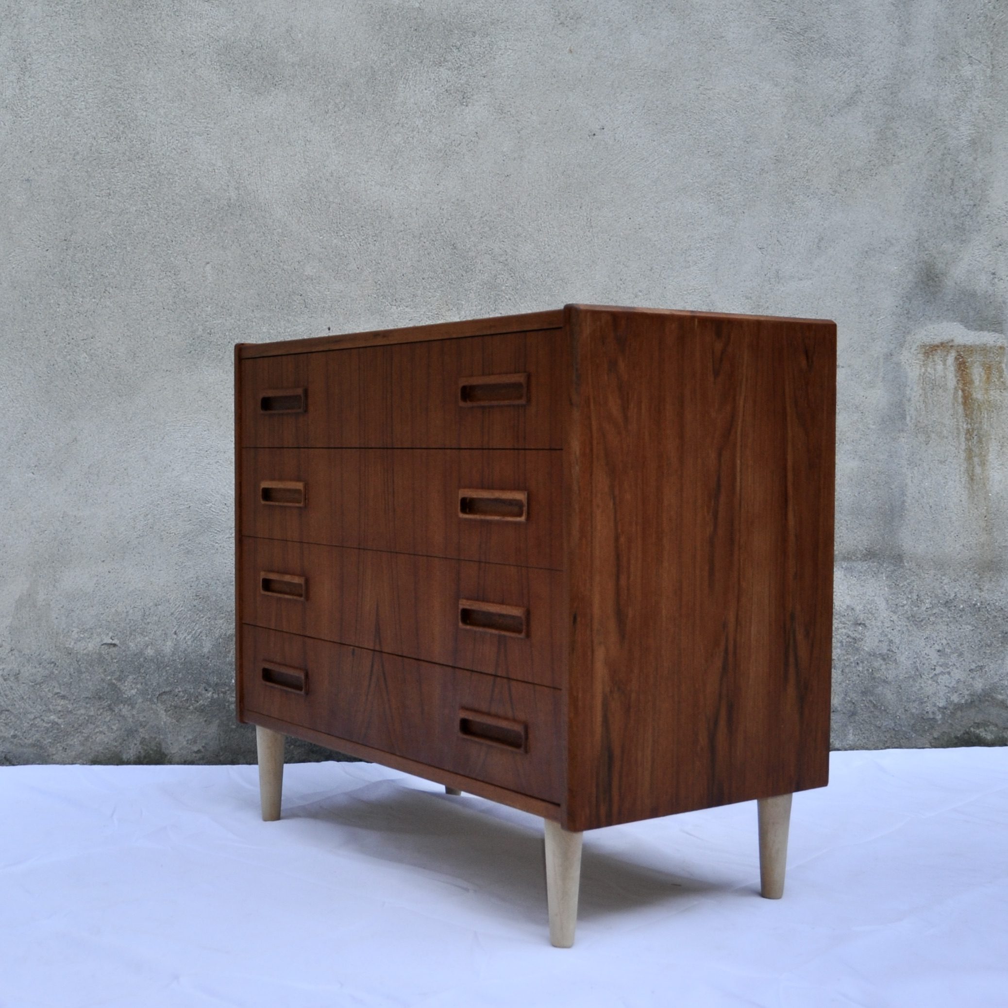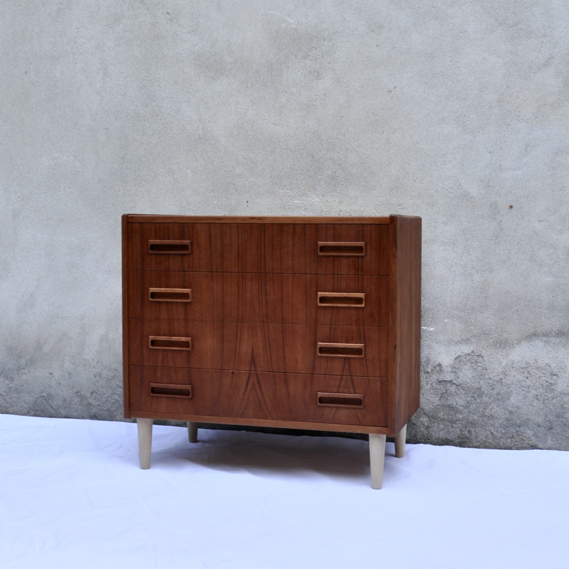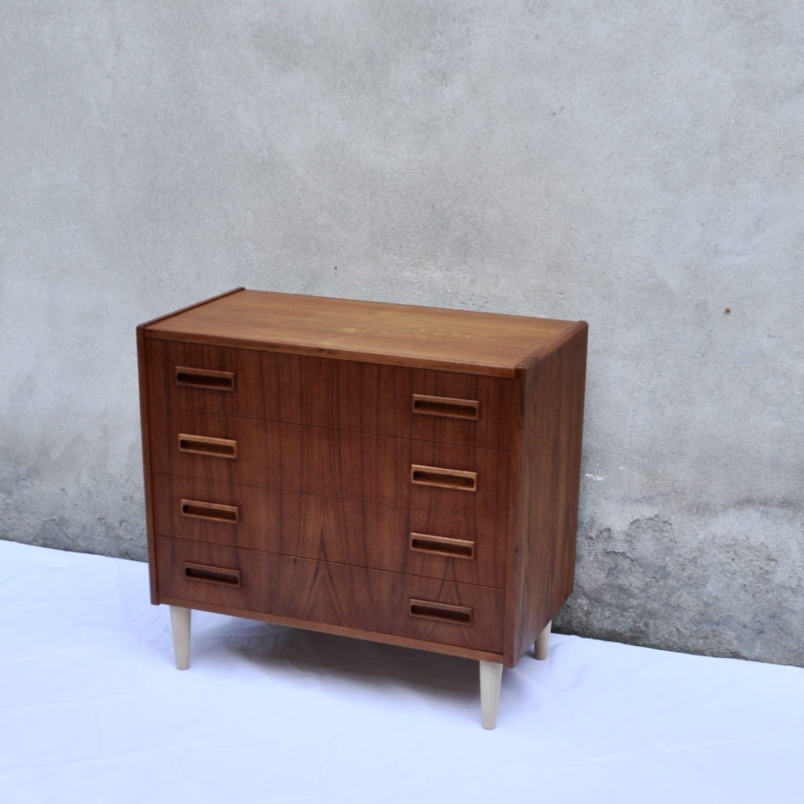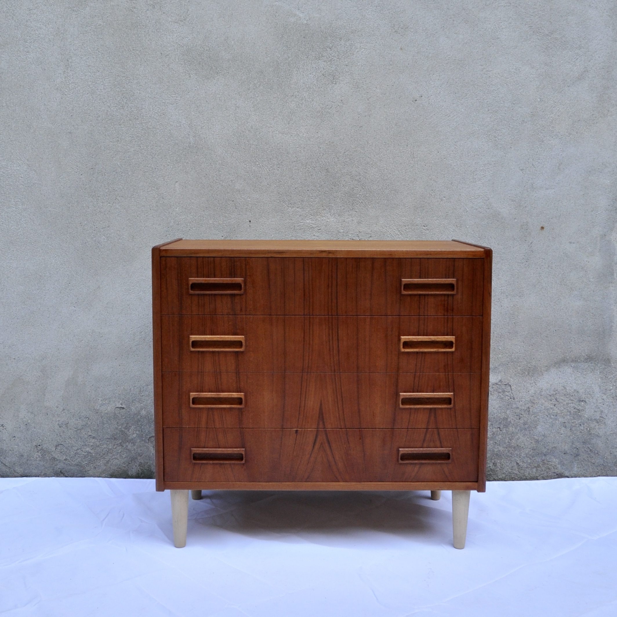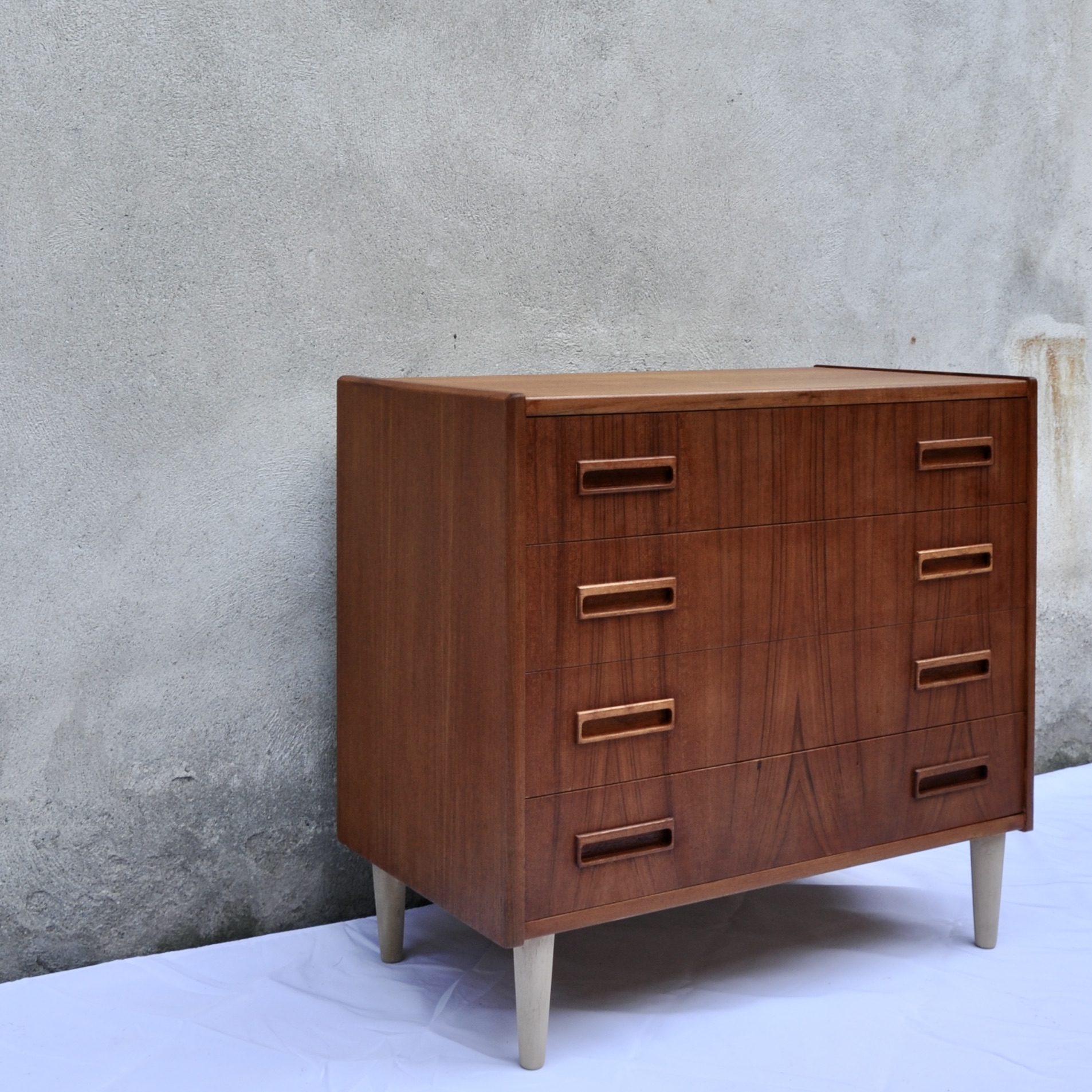 Produit venduTrès belle commode en teck scandinave datant des années 60. Elle possède quatre tiroirs identiques avec des poignées au travail soigné et des pieds en bois de chêne massif.