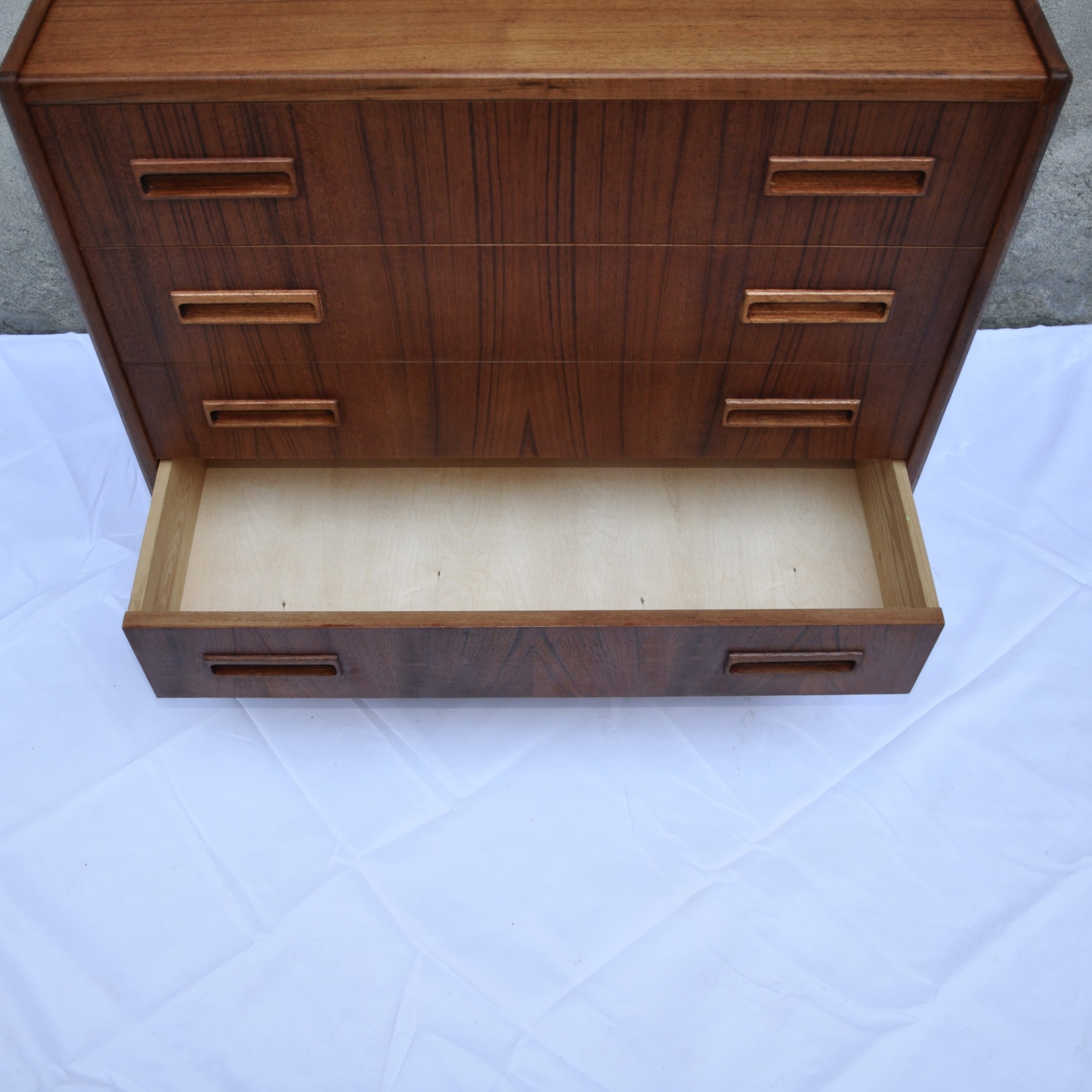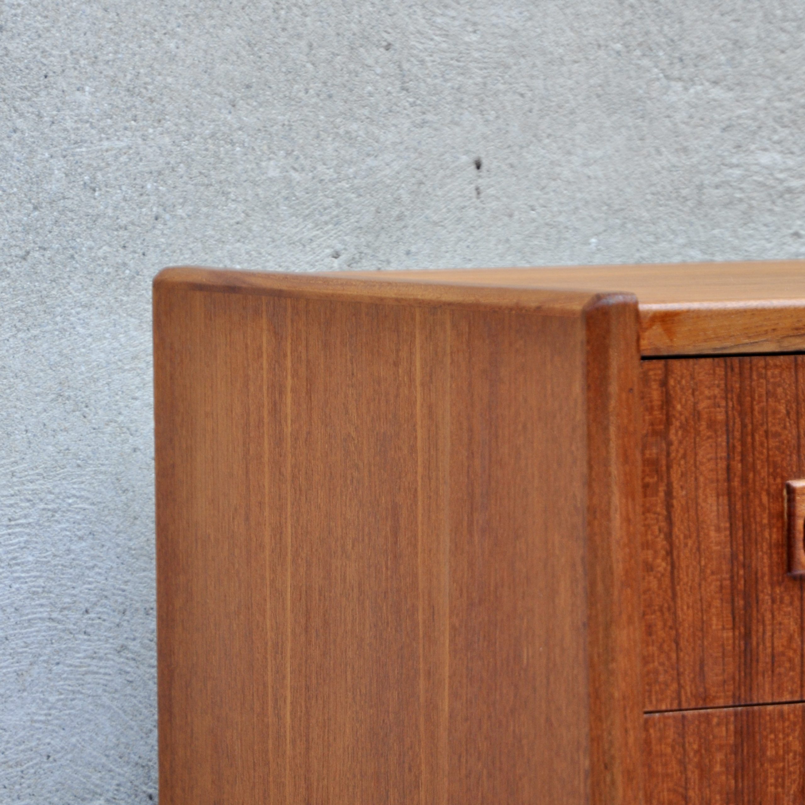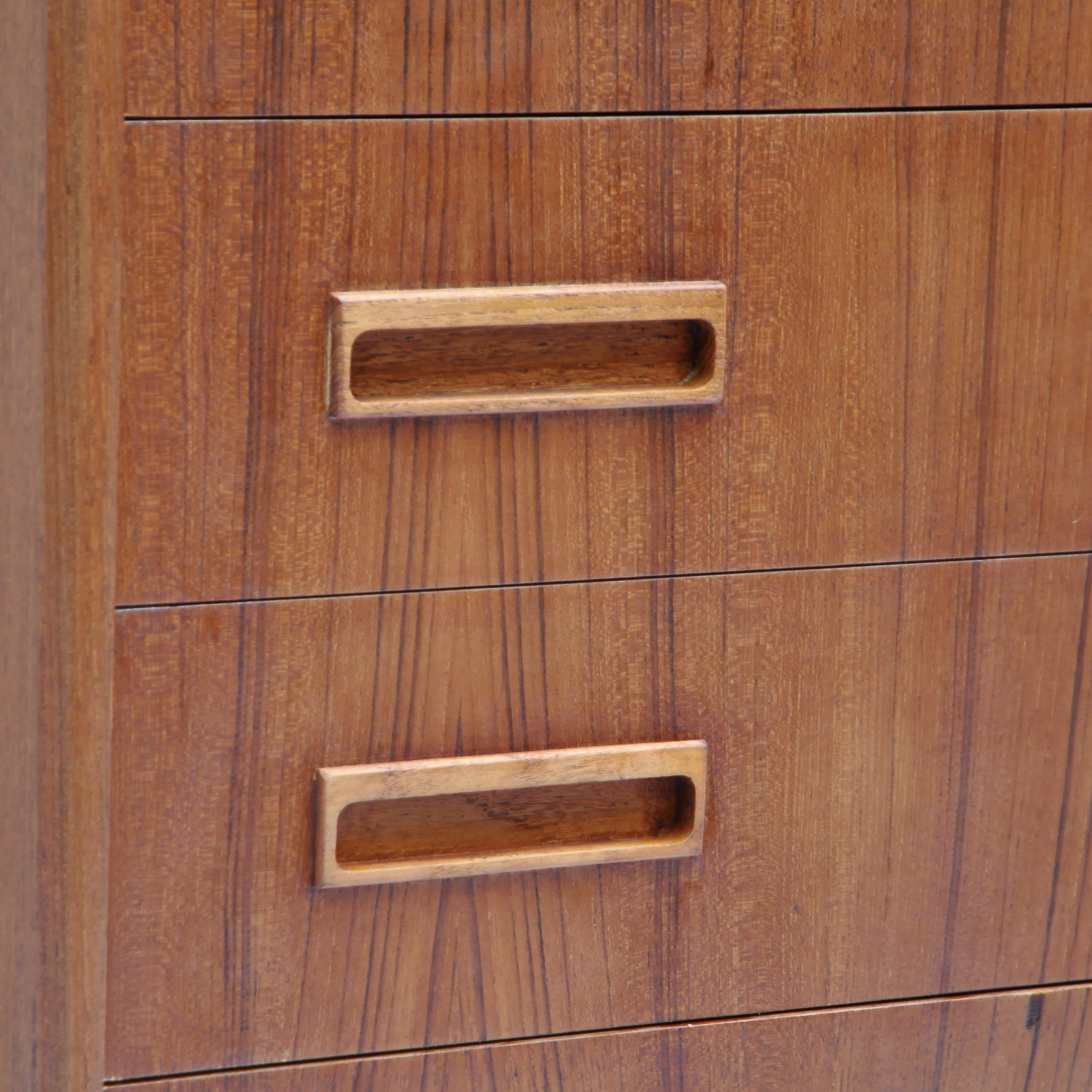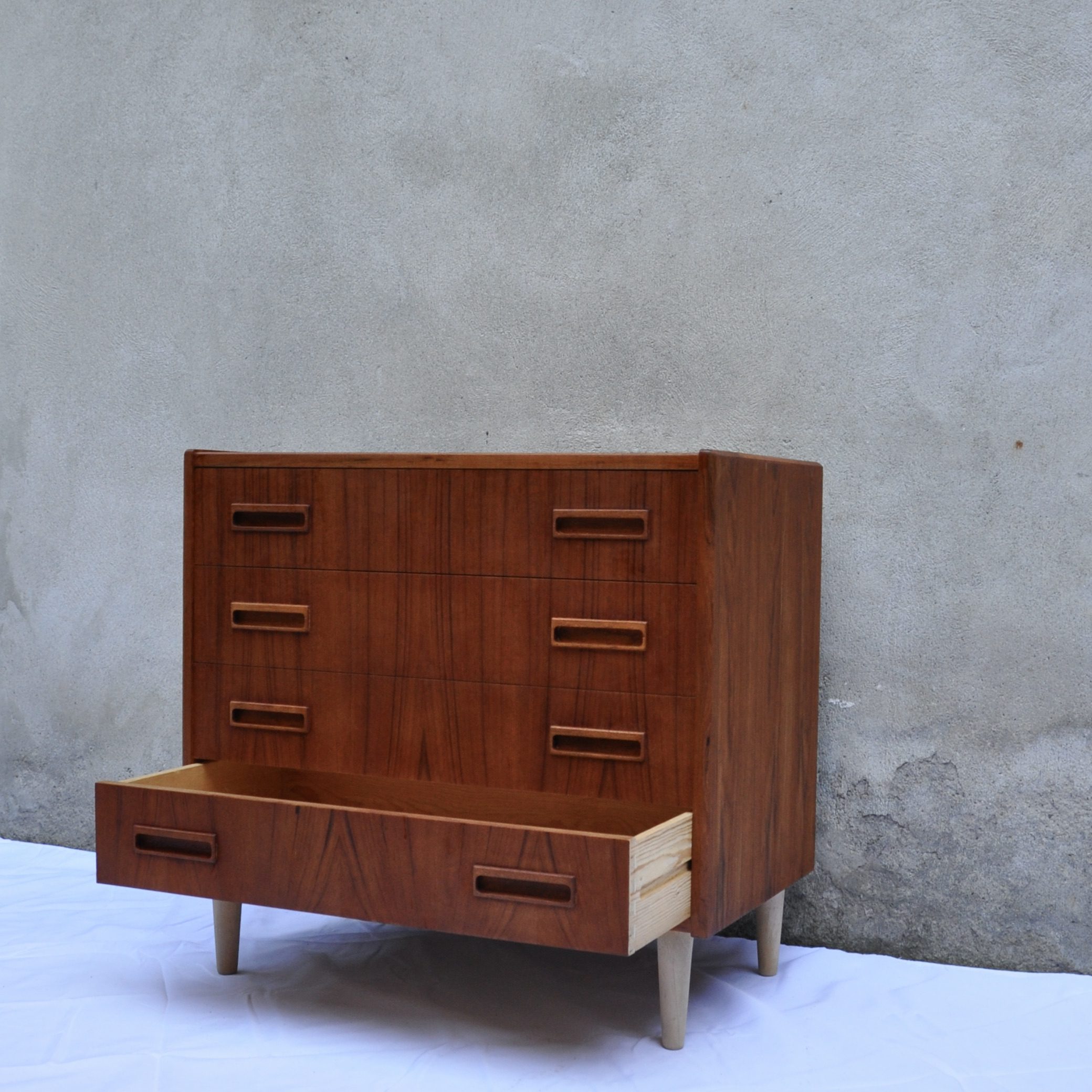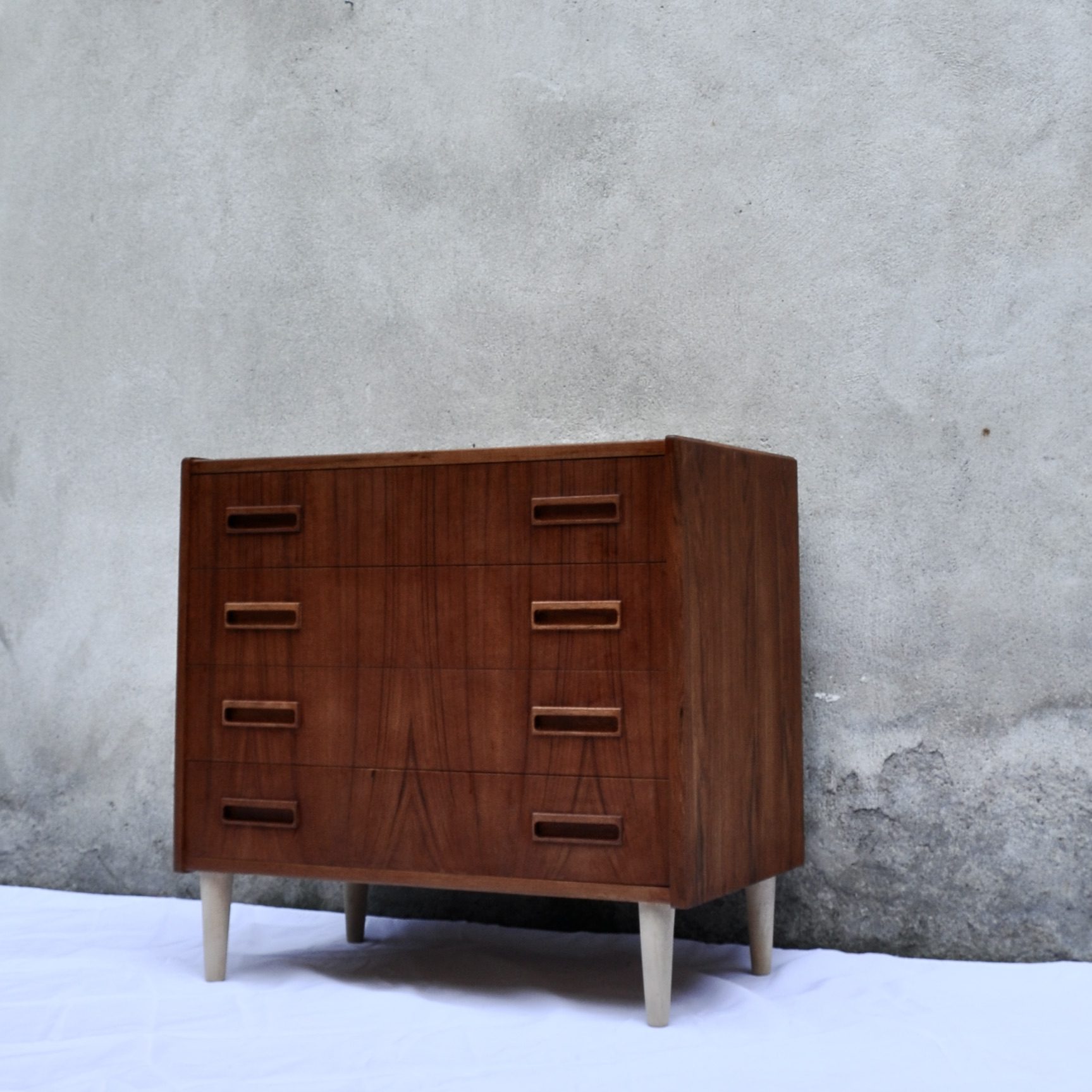 Produit venduTrès belle commode en teck scandinave datant des années 60. Elle possède quatre tiroirs identiques avec des poignées au travail soigné et des pieds en bois de chêne massif.