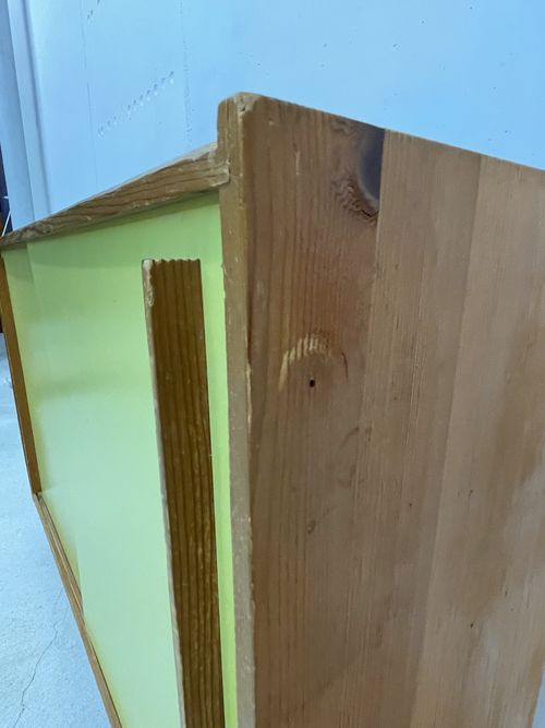 Meuble dans son jus, avec de nombreux petits défauts. Le bois comporte de nombreuses traces d’utilisation. Le dessus du meuble est recouvert d’un film plastique autocollant imitation bois. Un des deux tablars intérieurs est fendu sur toute sa longueur, mais reste stable et fonctionnel.