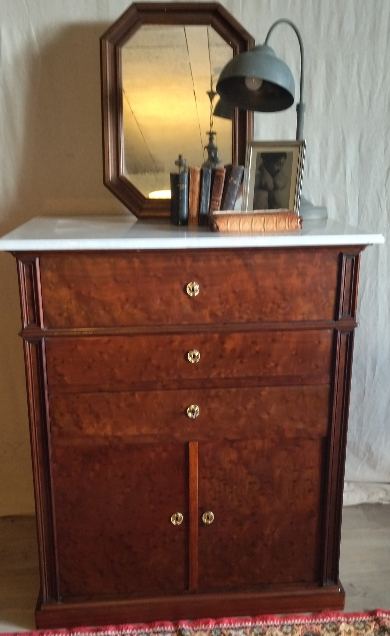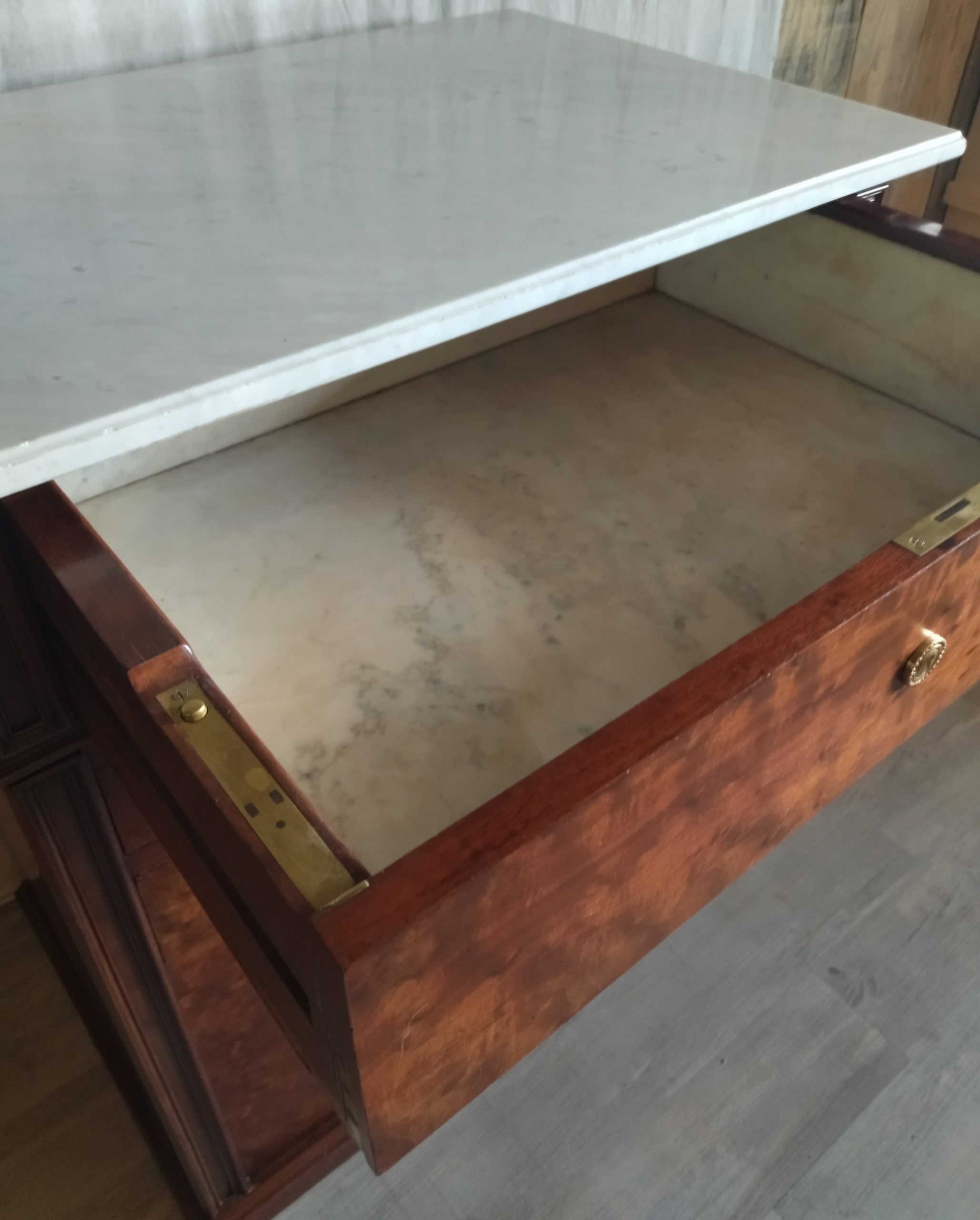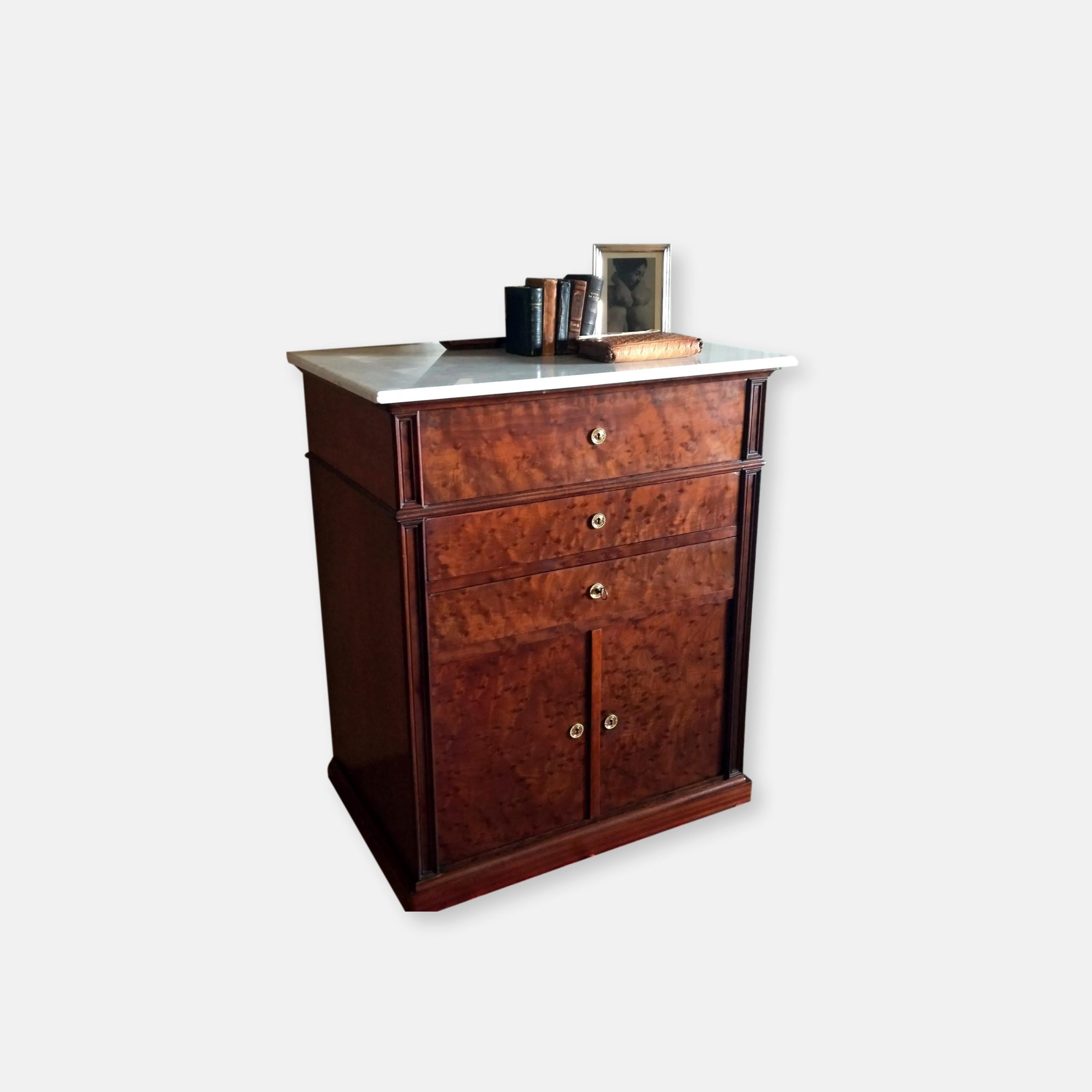 Produit venduCommode ou secrétaire ou meuble de toilette plateau et intérieur premier tiroir marbre blanc, bois massif placage acajou. Joseph Roll, fabricant de meubles, exerça 42, faubourg Saint-Antoine à partir de 1844. Il participa à toutes les expositions de 1844 à 1867. Il mourut en 1877 sa veuve lui succéda pendant quelques années puis céda l’entreprise qui devint la maison Roll, Muller, Audoinaud et cie.