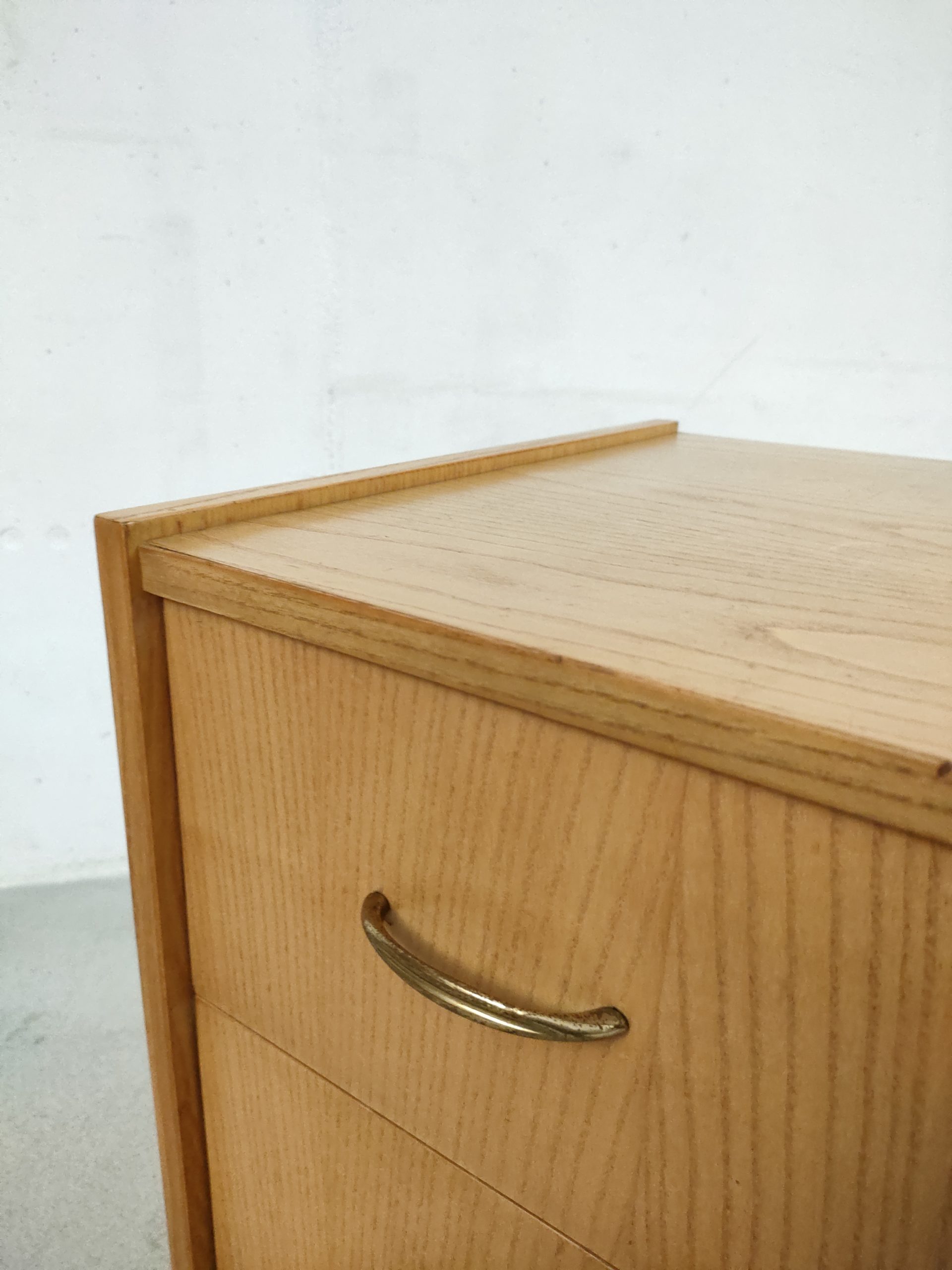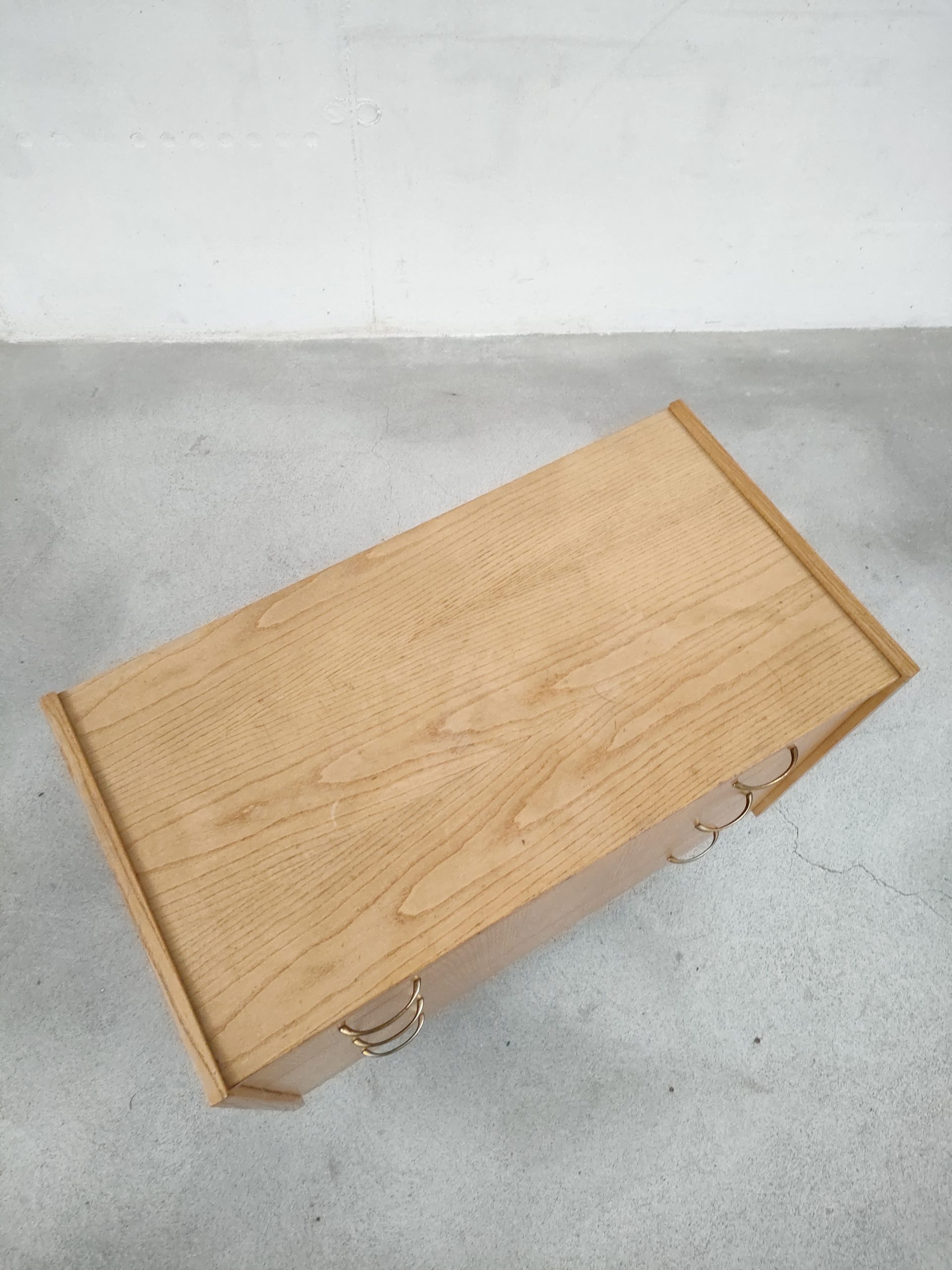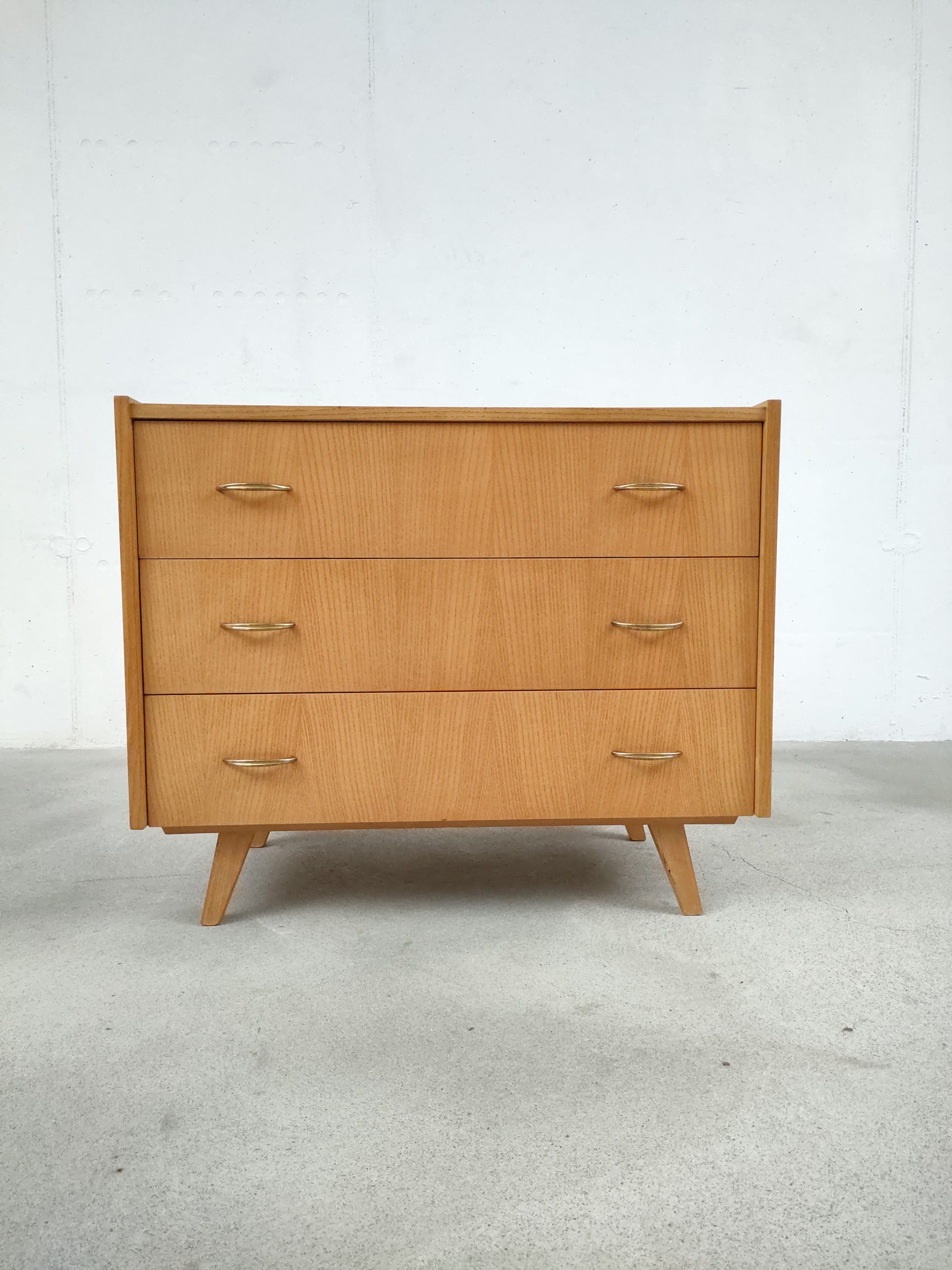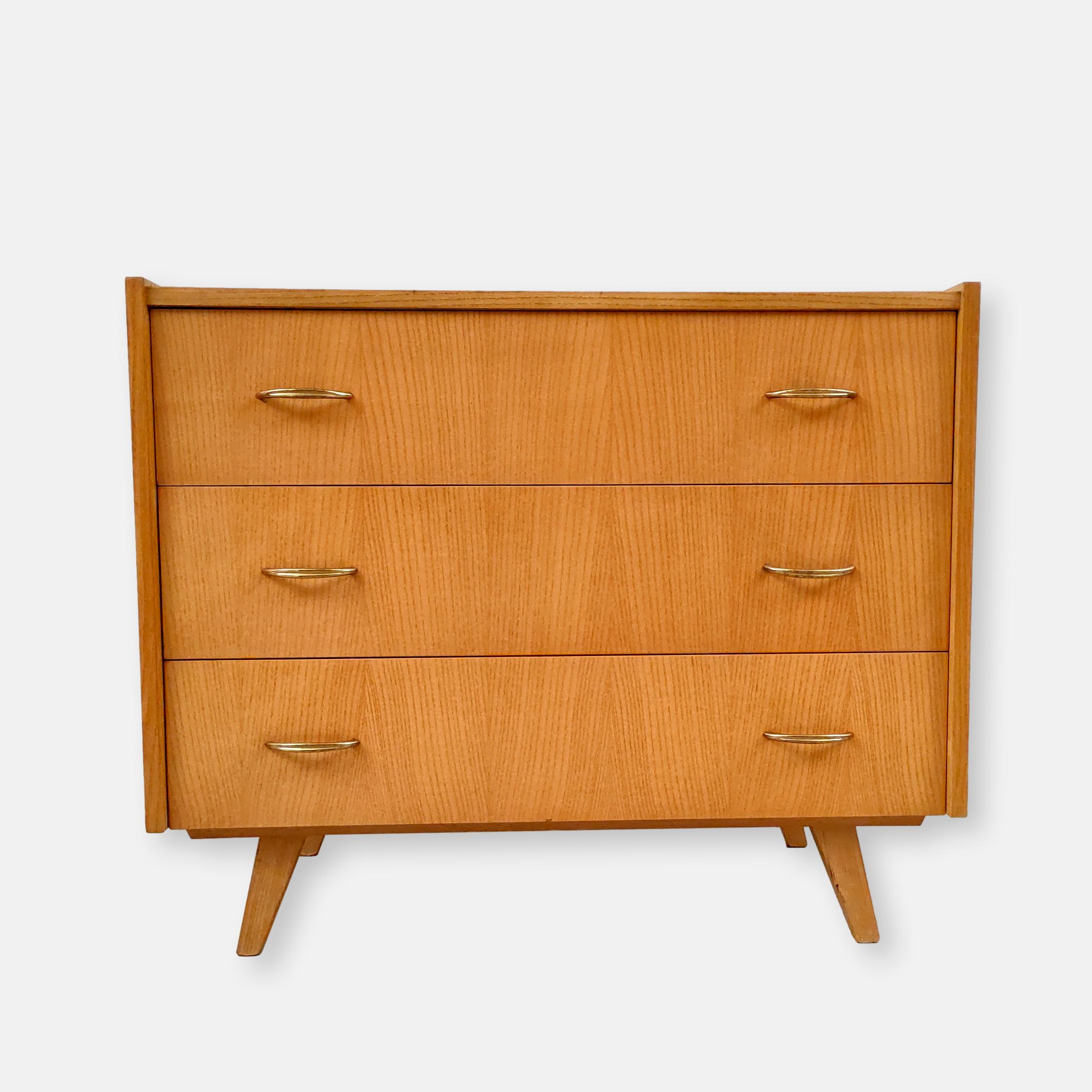 Produit venduCommode vintage en bois avec 3 tiroirs avec poignées en métal doré. Des traces d’usure sont présentes sur le bois (en particulier sur le plateau, voir photos) mais elle stable et solide et très élégante avec ses pieds compas.