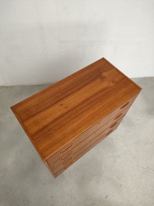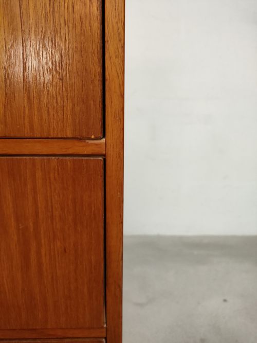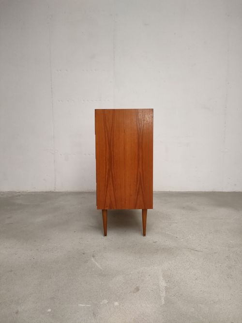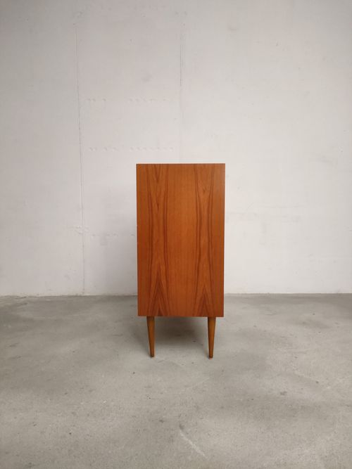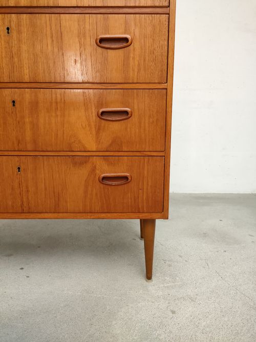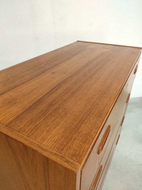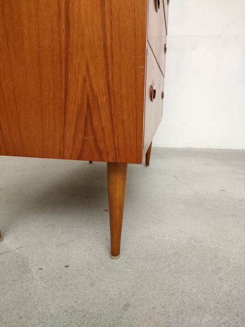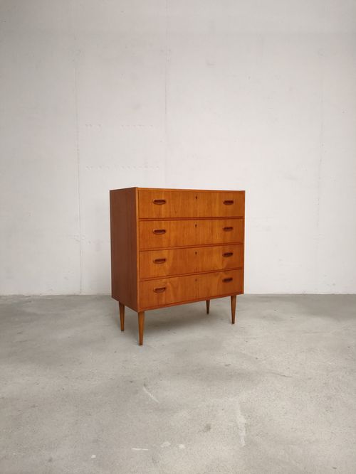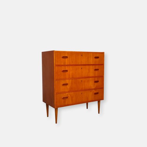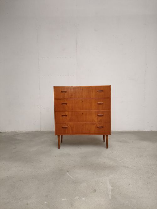 Produit venduCommode scandinave, made in Sweden, en bois de teck dotée de 4 tiroirs avec jolies poignées et de pieds fuselés.