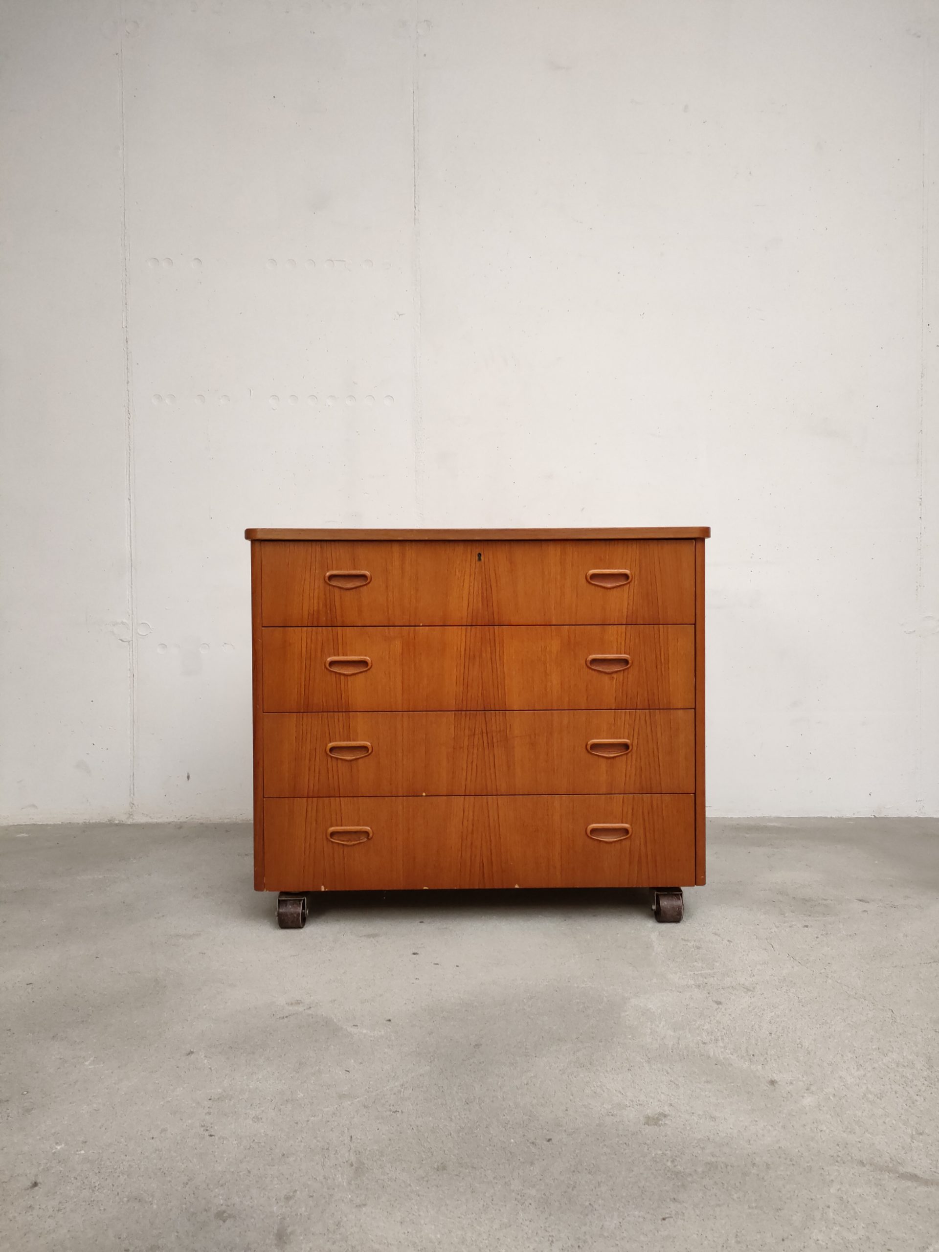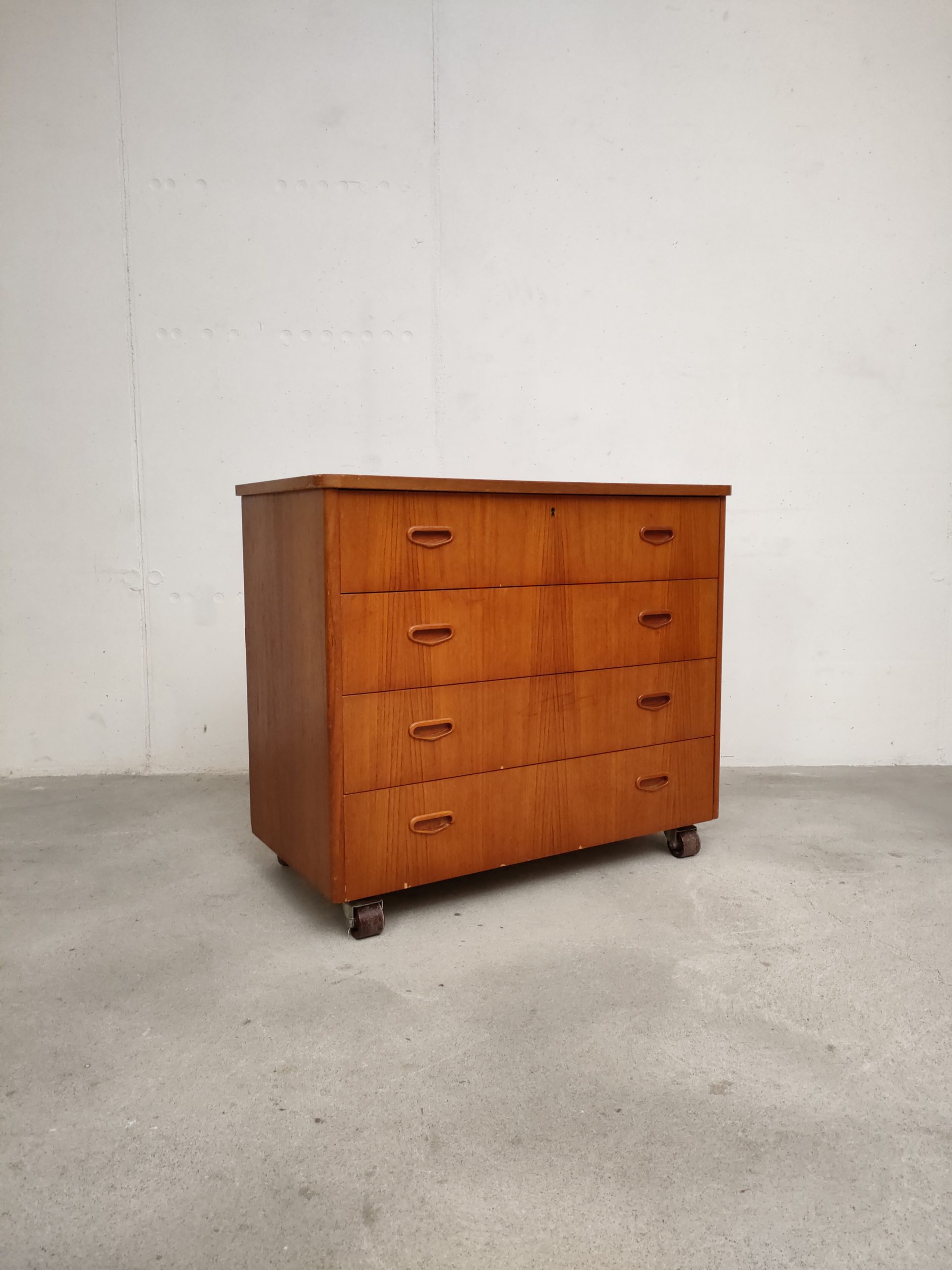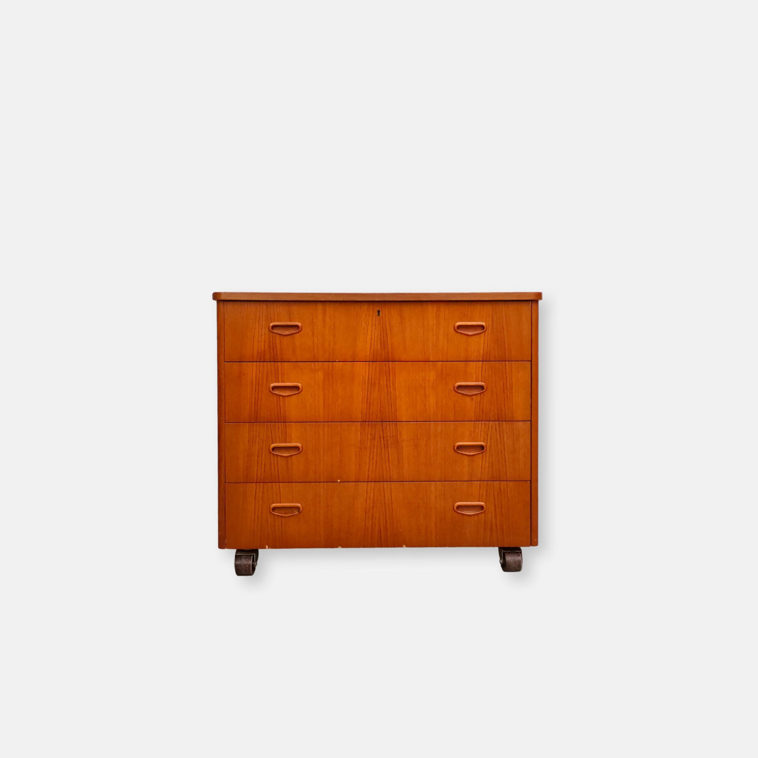 Produit venduCommode suédoise en bois dotée de 4 tiroirs avec élégantes poignées. La commode est dotée de 4 roulettes qui ont été probablement ajoutées par son ancien propriétaire. Des traces d’usure sont présentes sur le bois (voir photos) mais la commode est stable et solide. La clé du premier tiroir est manquante.