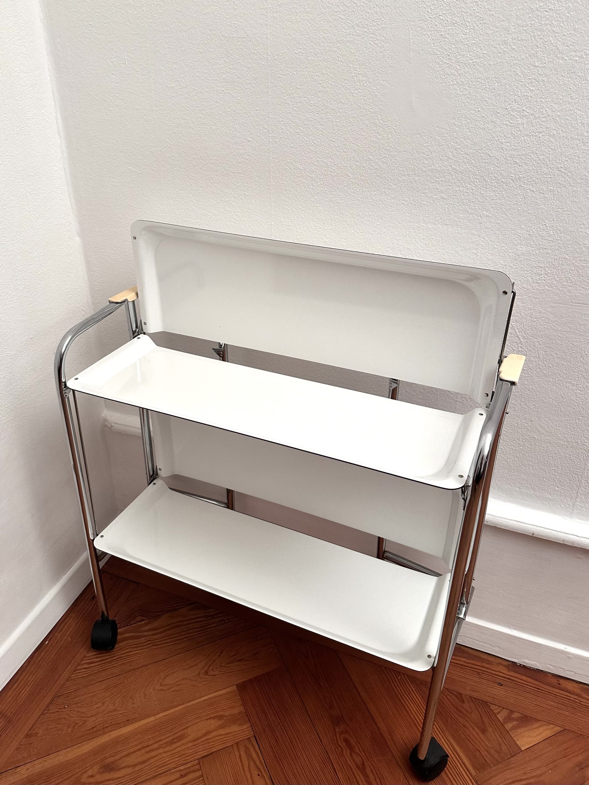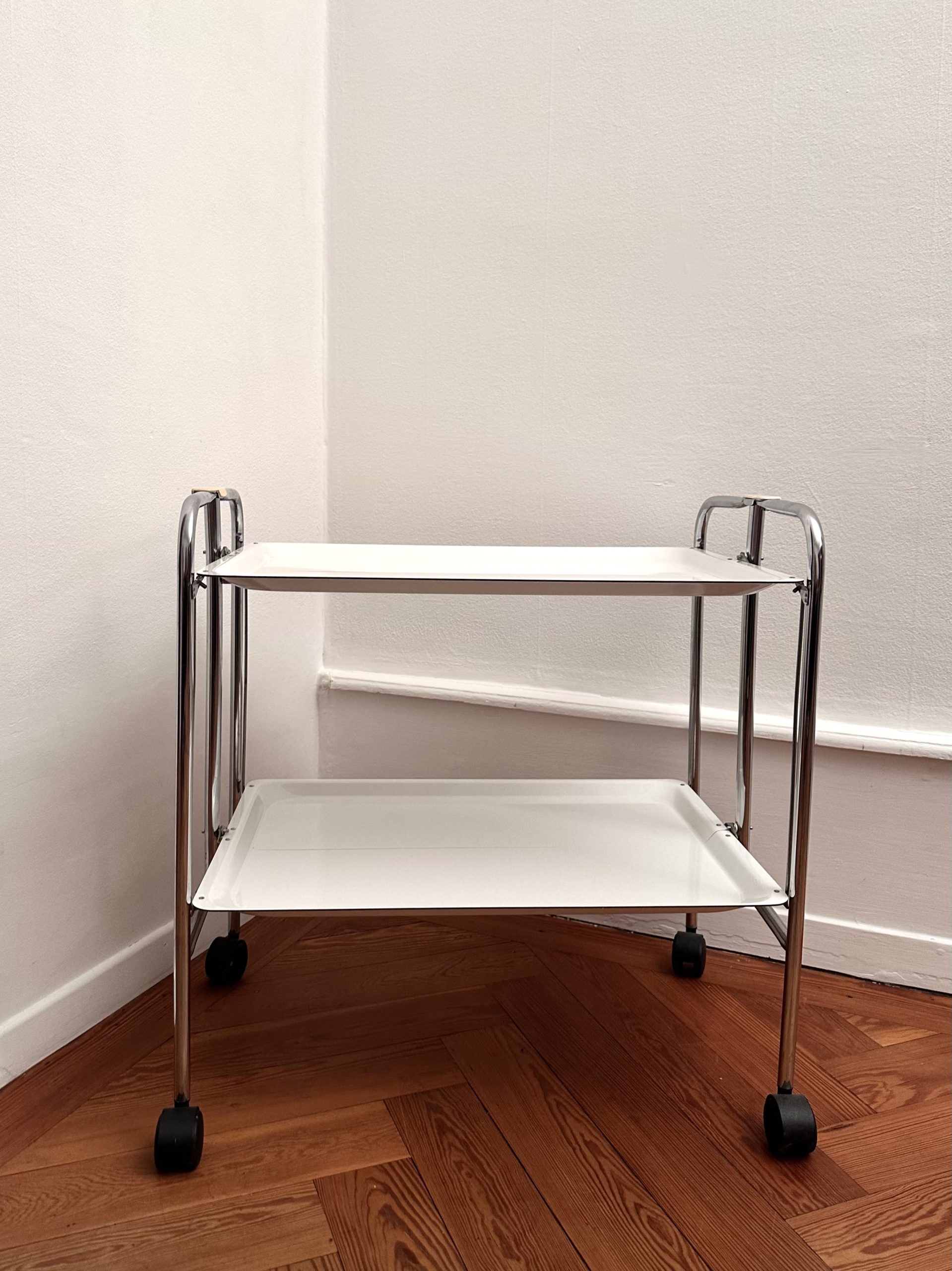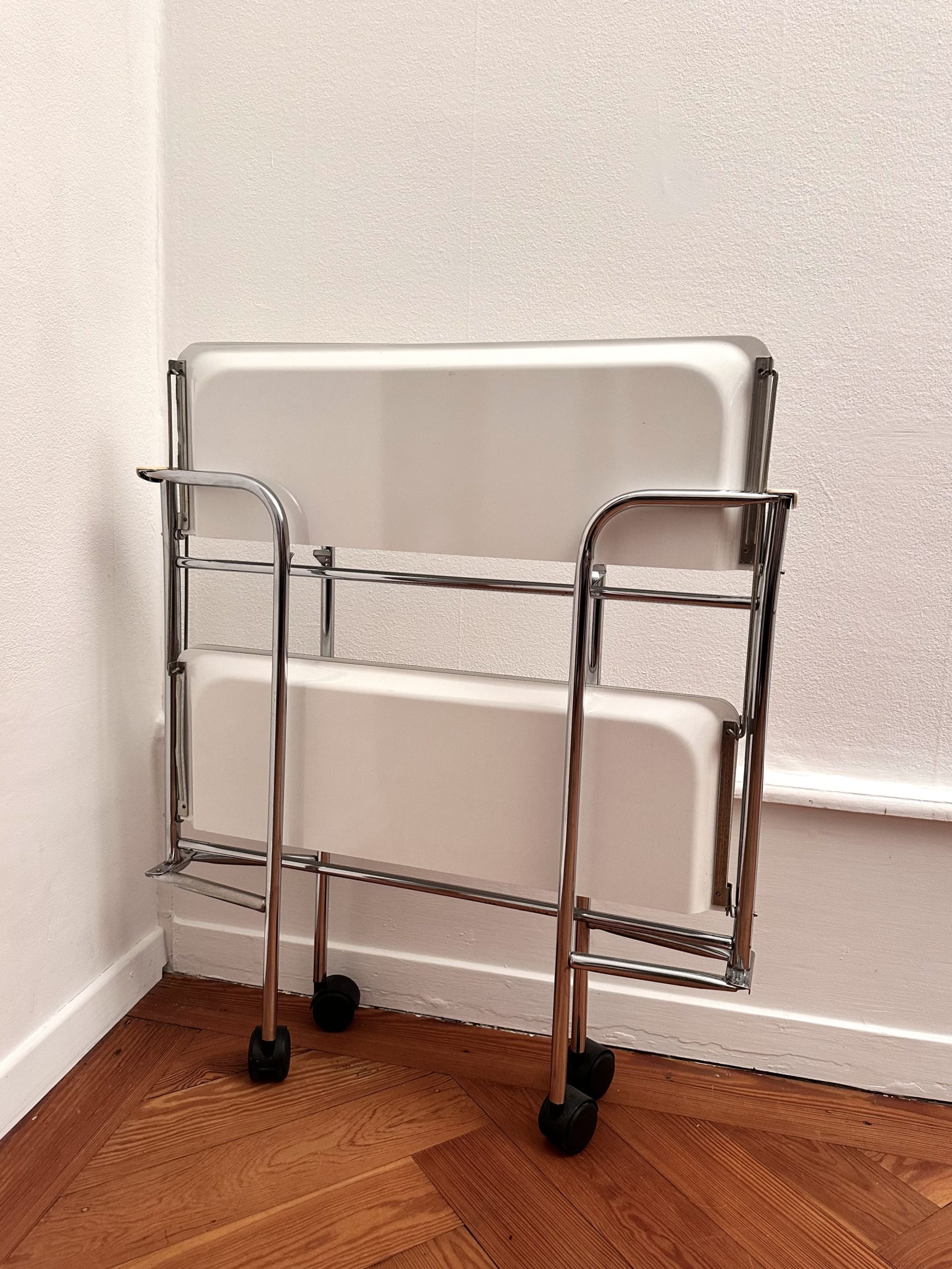 Desserte roulante vintage à deux niveaux, modèle pliant, structure en tubes métalliques chromés et deux plateaux blancs à bords relevés. Montée sur roulettes noires. Typologie caractéristique du design fonctionnel européen des années 1970, pensée pour des usages domestiques ou de bureau, avec un format mobile et pratique.