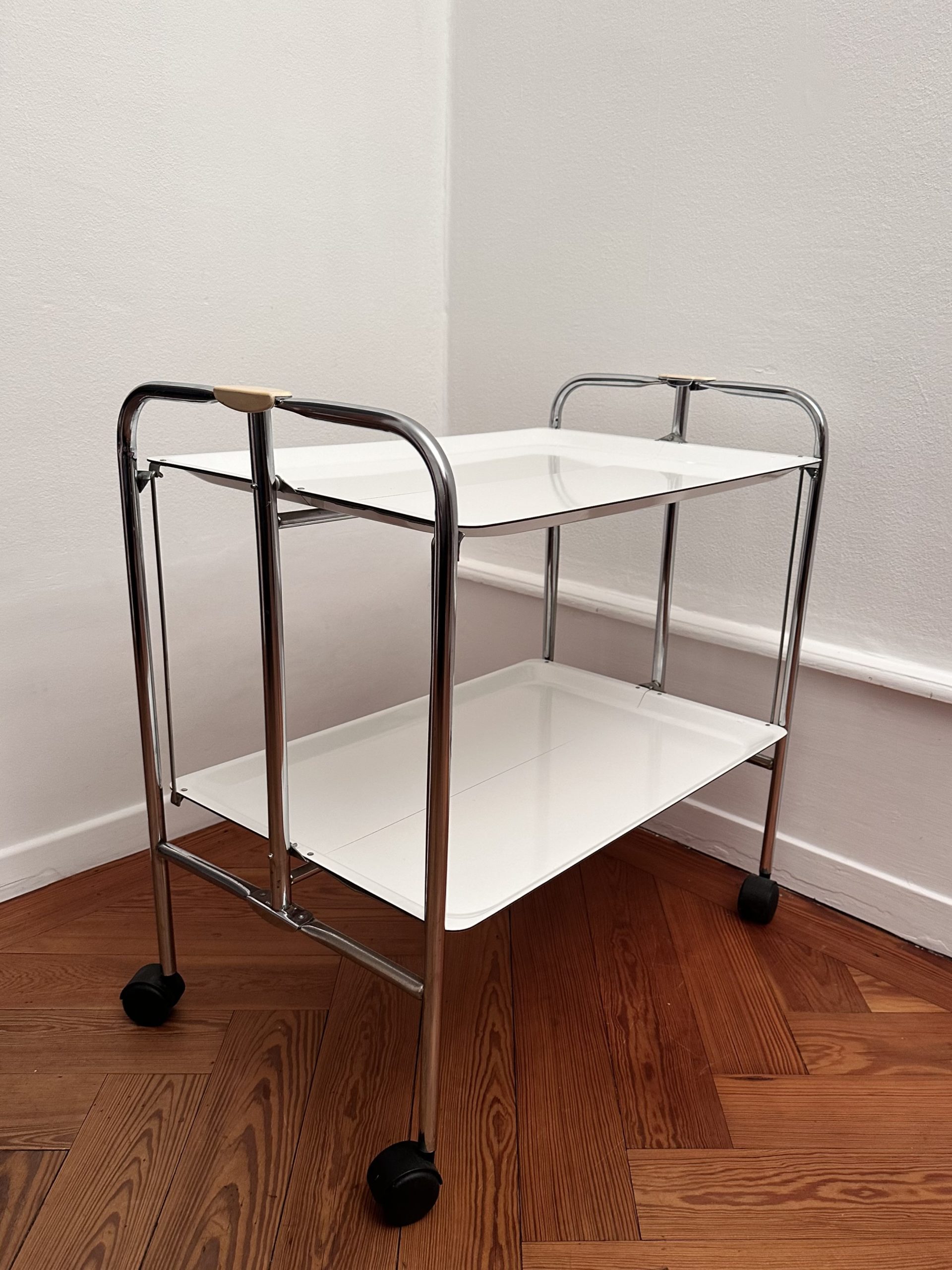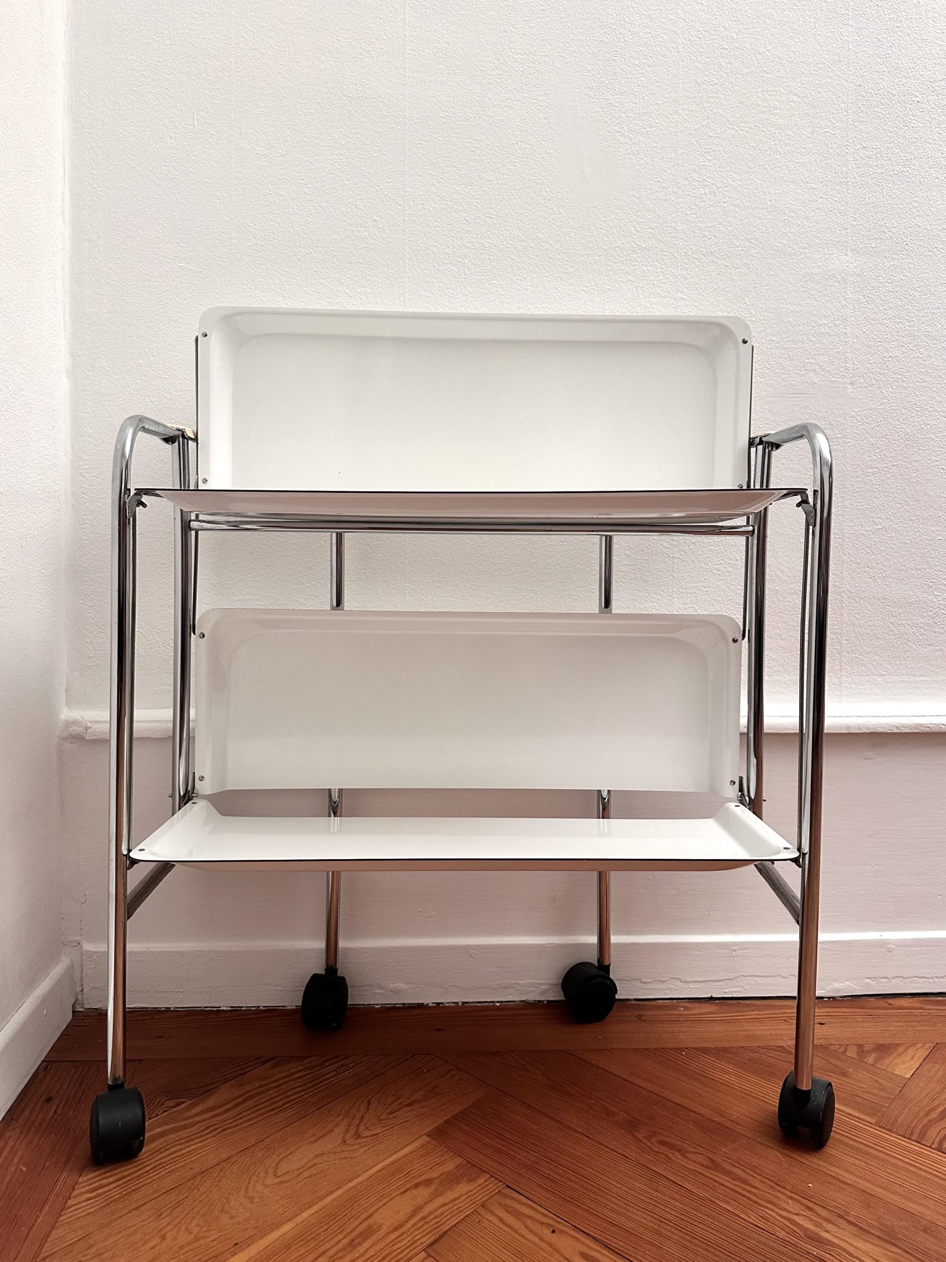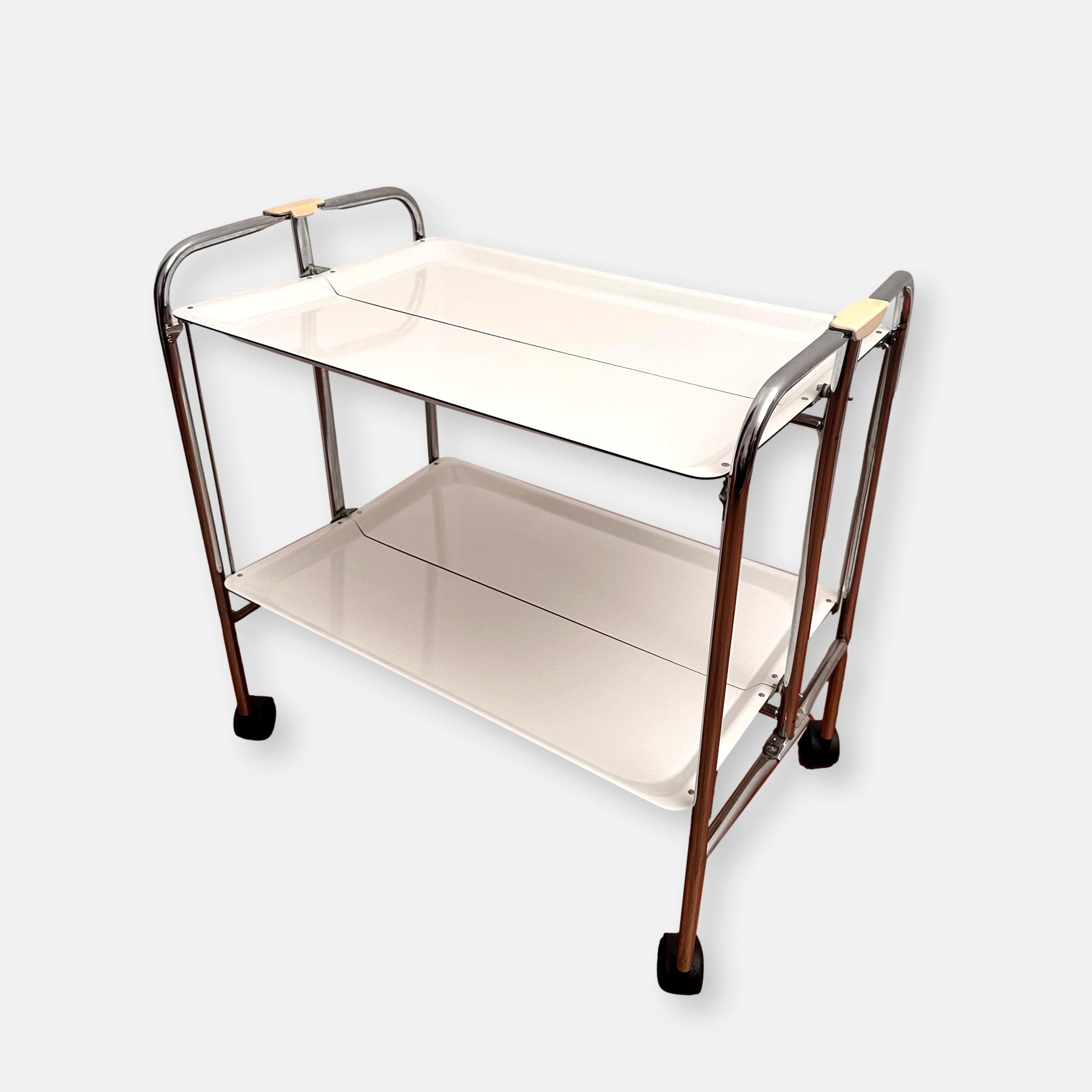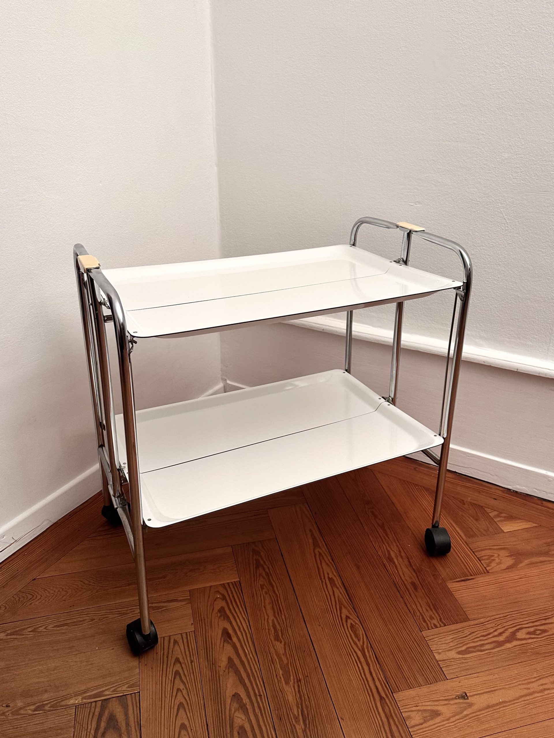 Desserte roulante vintage à deux niveaux, modèle pliant, structure en tubes métalliques chromés et deux plateaux blancs à bords relevés. Montée sur roulettes noires. Typologie caractéristique du design fonctionnel européen des années 1970, pensée pour des usages domestiques ou de bureau, avec un format mobile et pratique.