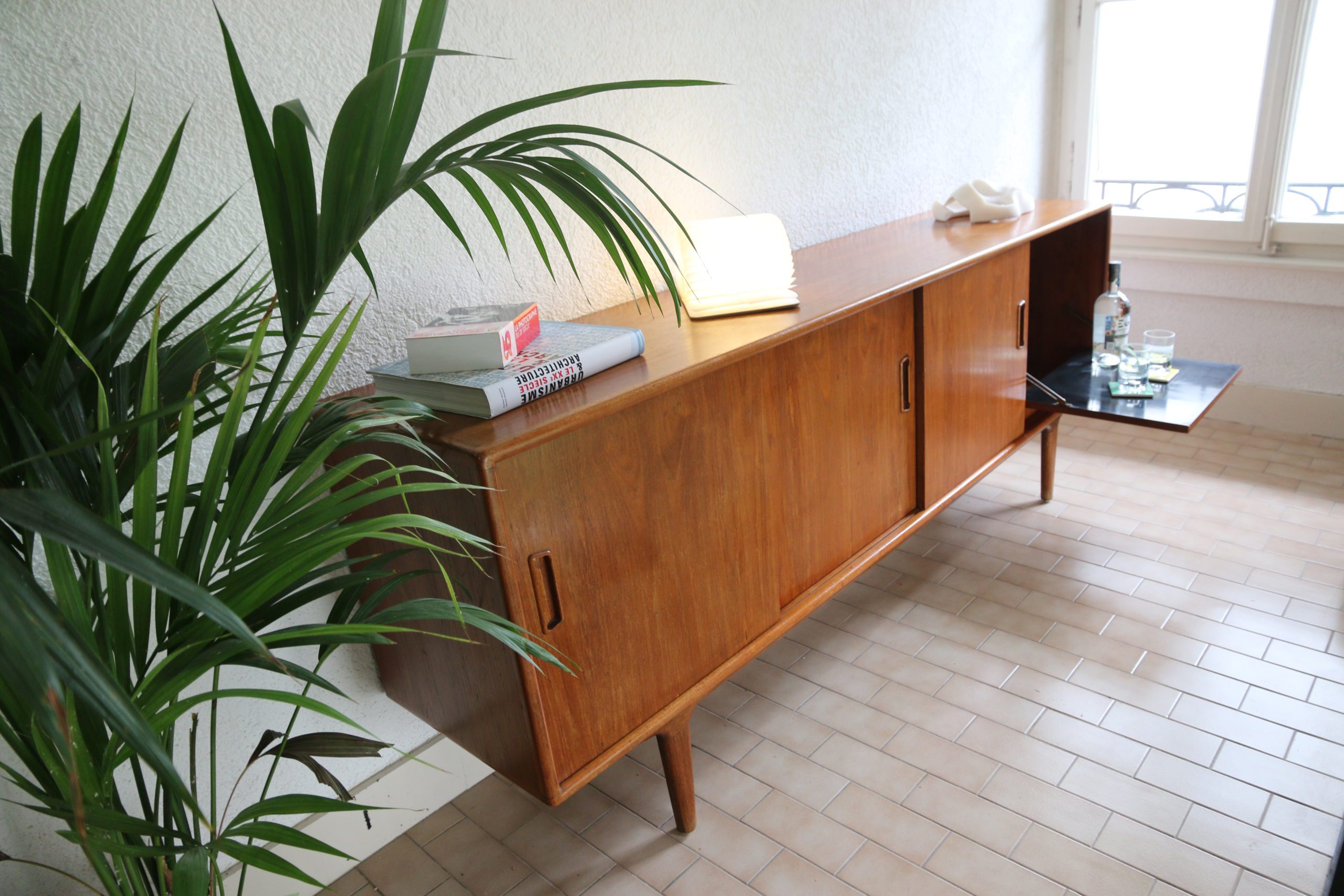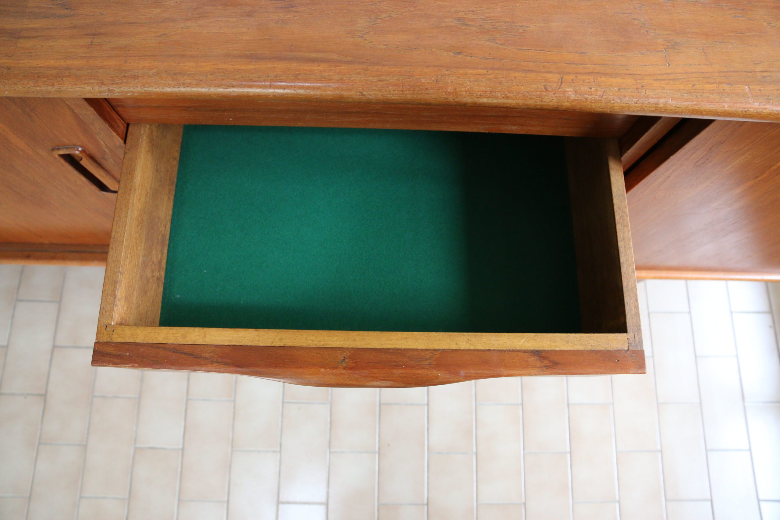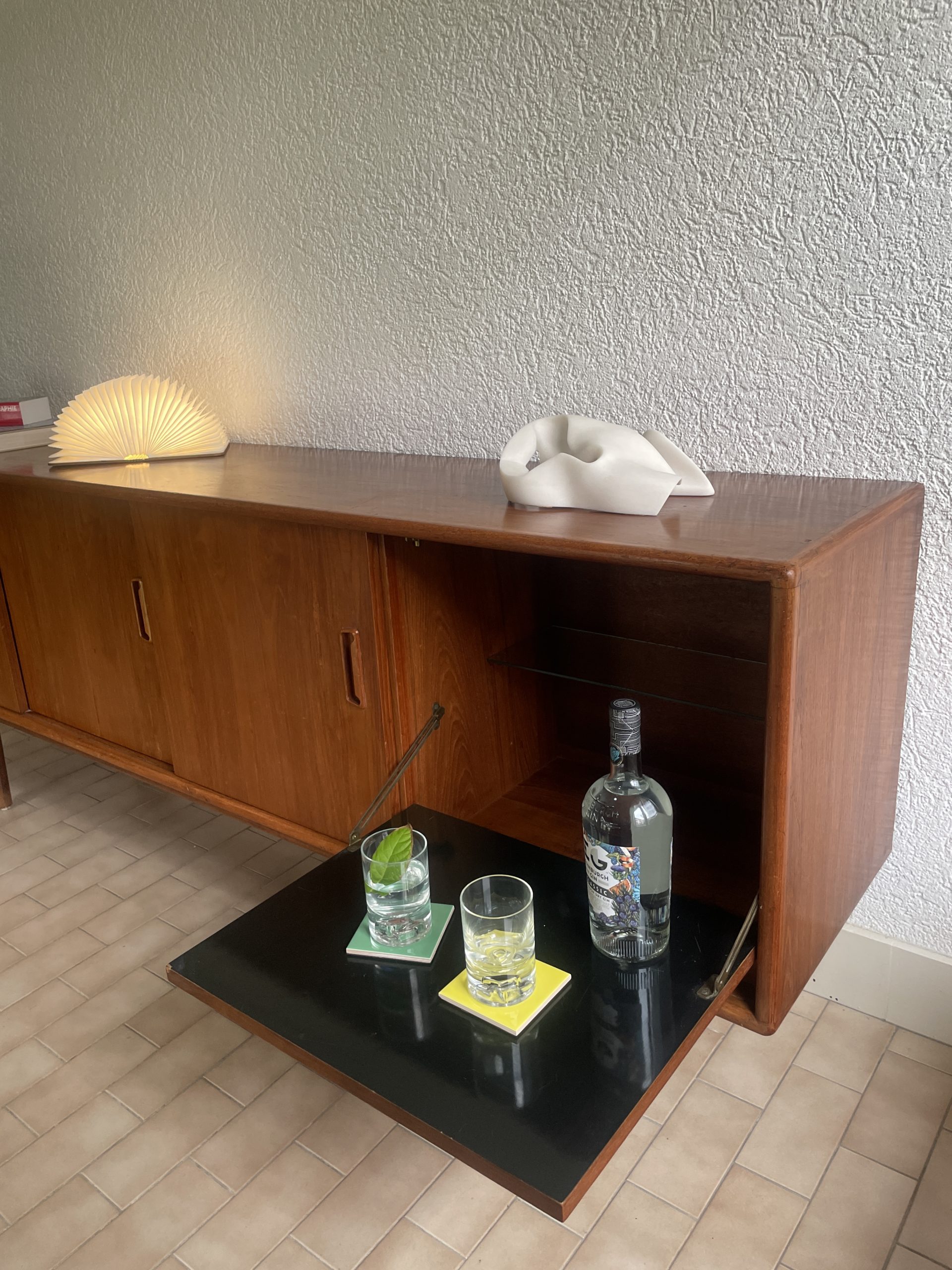 Le bois (teck) travaillé en détails fins et les angles arrondis témoignent de l’époque à laquelle elle a été créée.