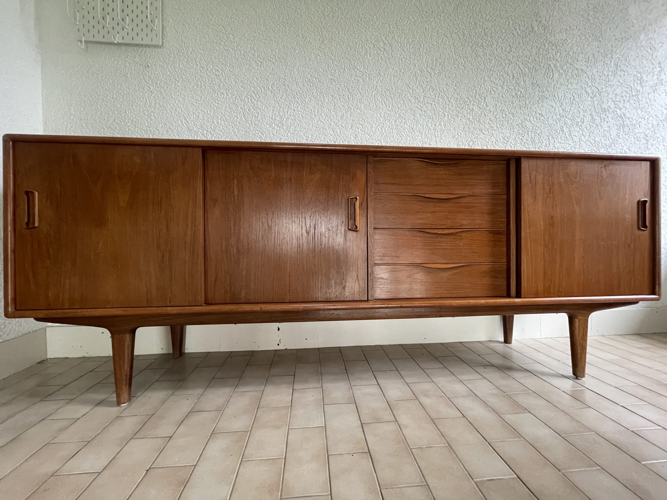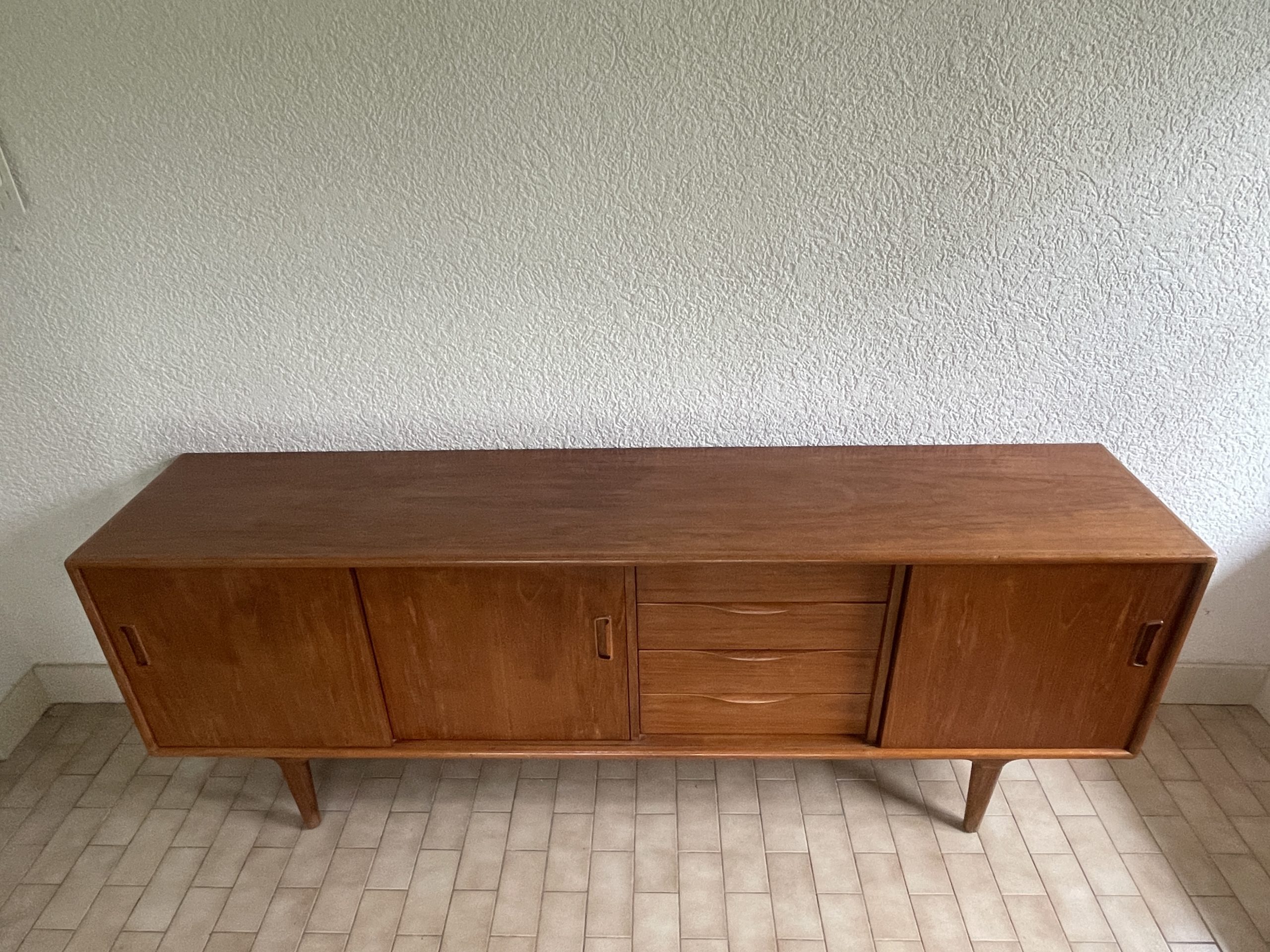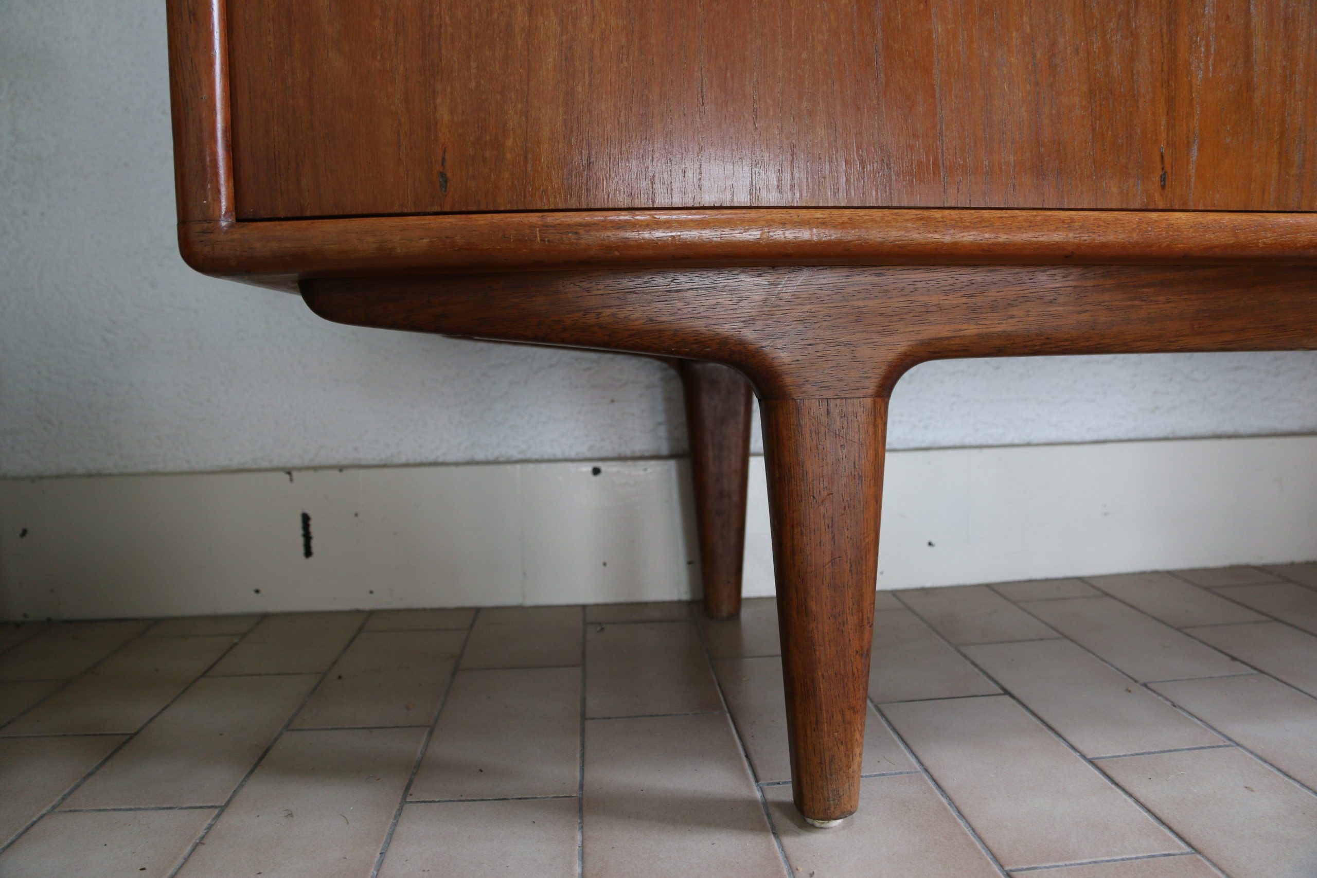Le bois (teck) travaillé en détails fins et les angles arrondis témoignent de l’époque à laquelle elle a été créée.