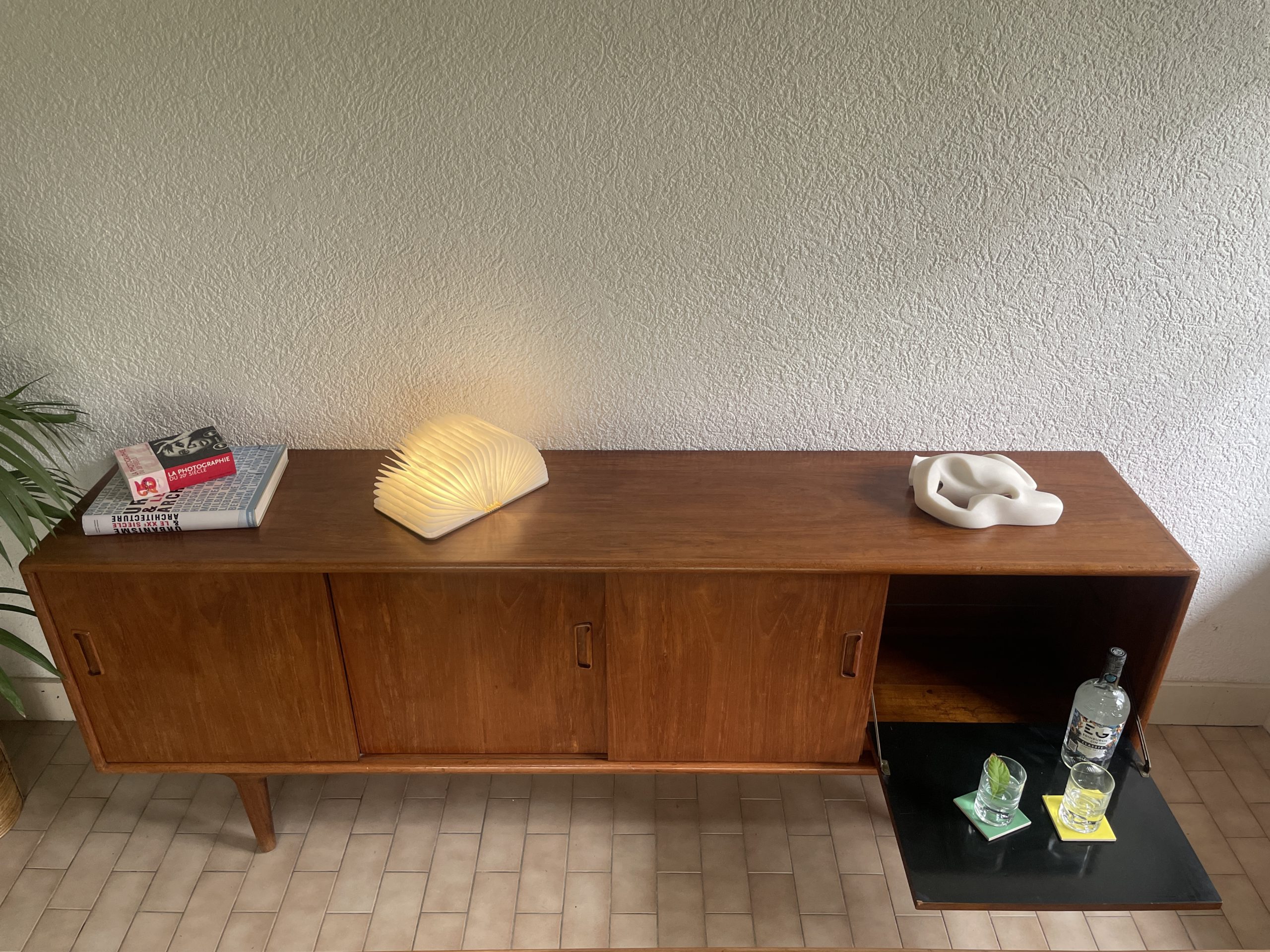 Les 3 types de rangements possibles (étagères, 4 tiroirs et bar avec étagère vitrée) ainsi que le jeu de portes coulissantes pour changer son aspect au gré des envies, la rendent unique.